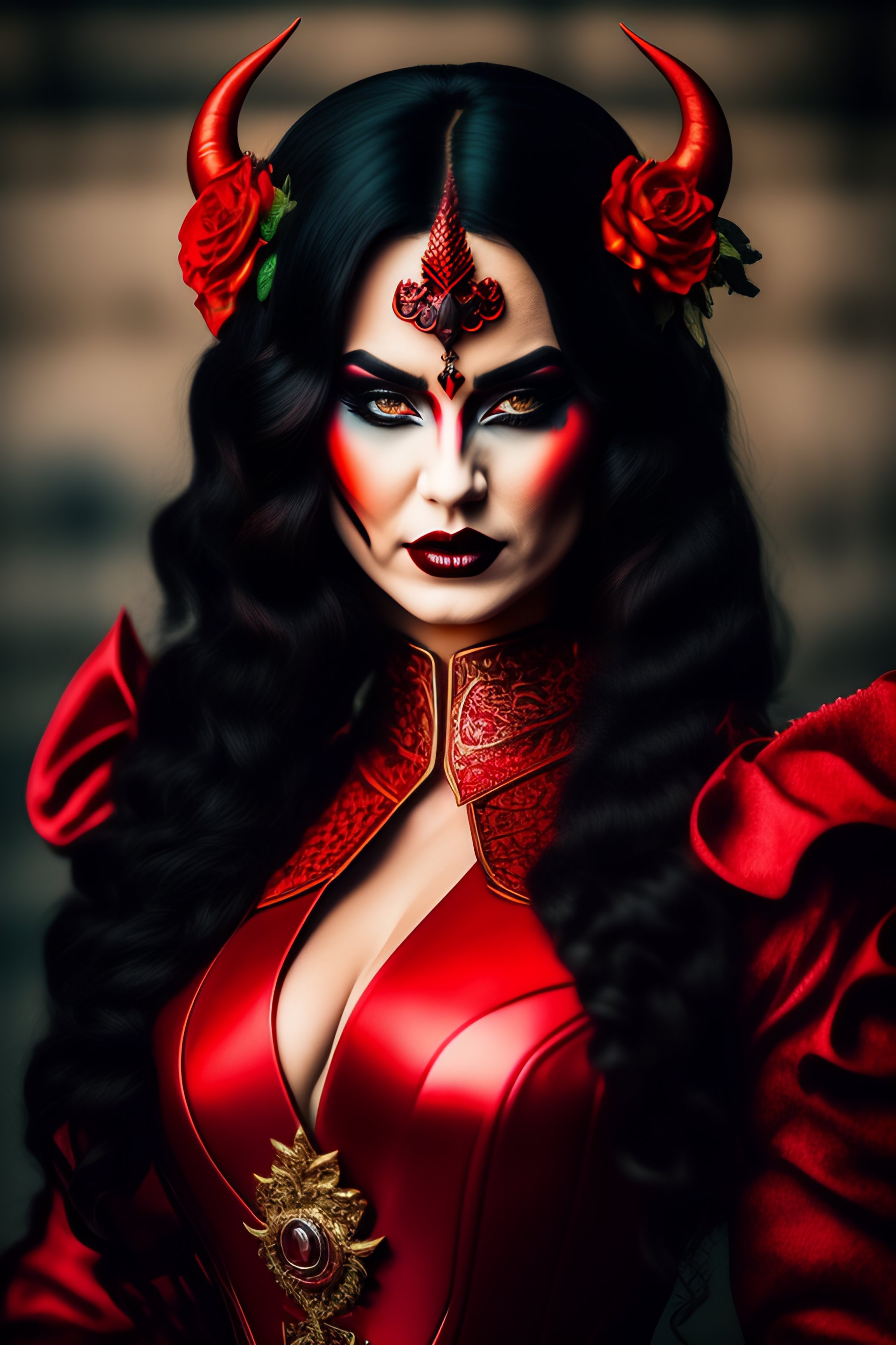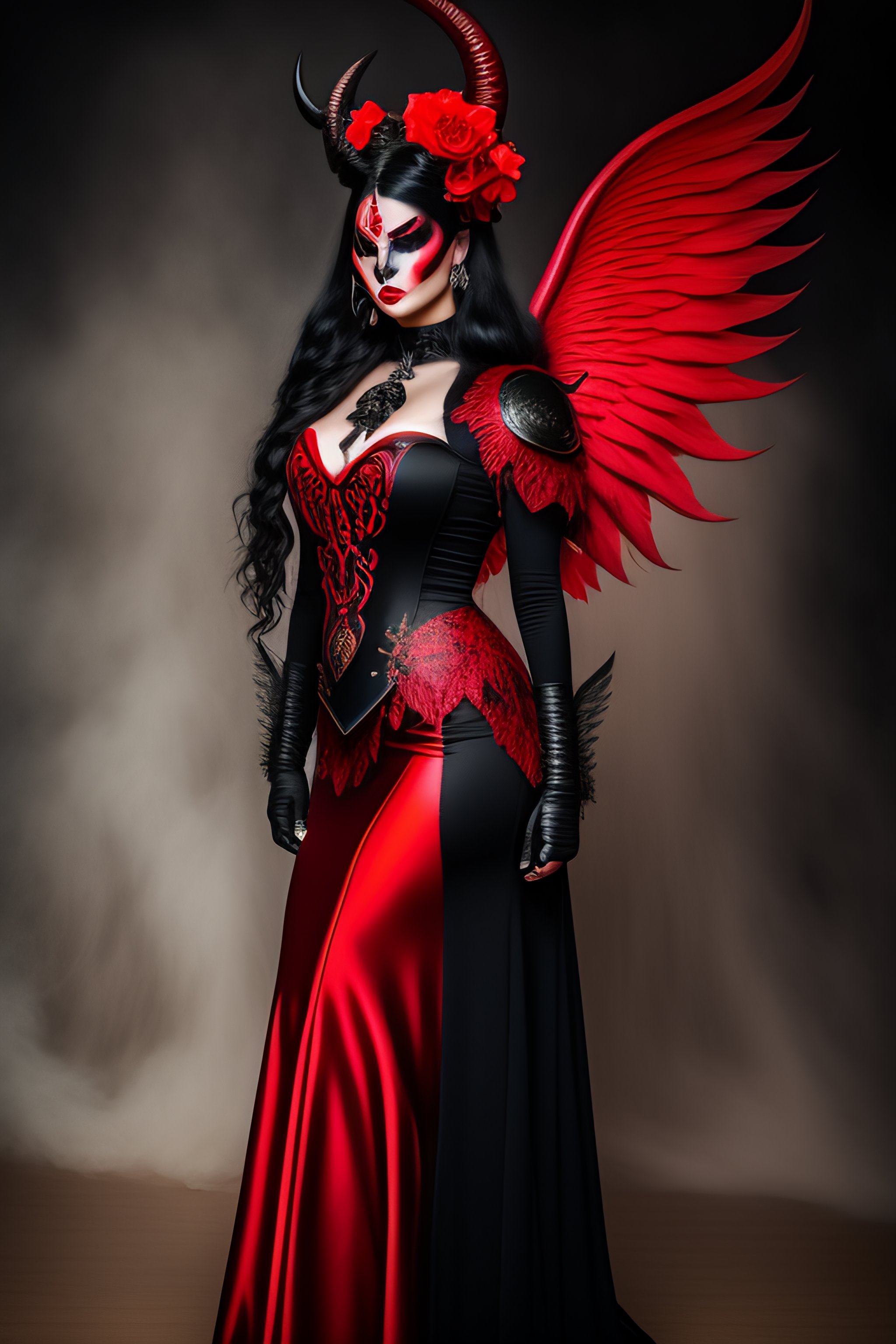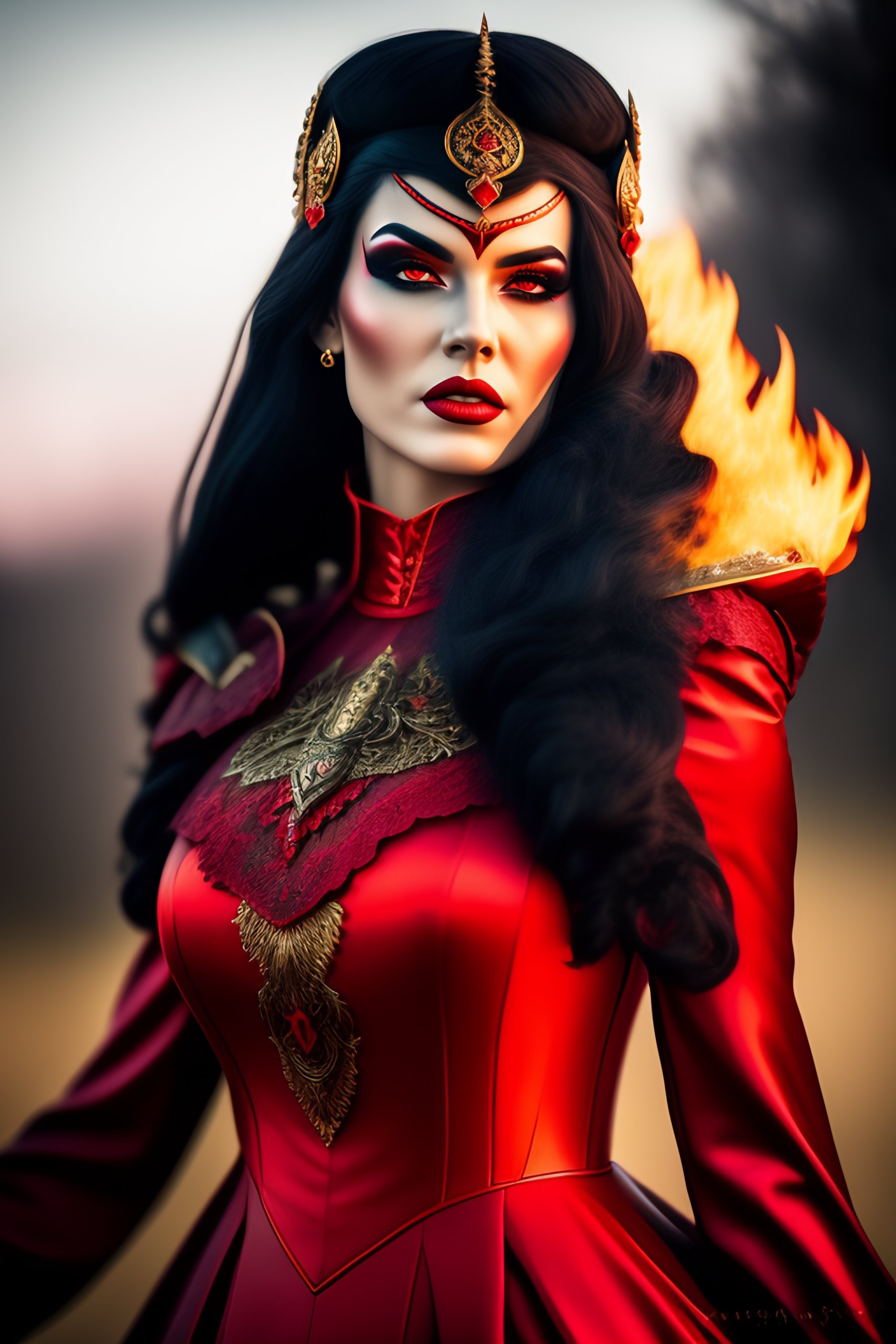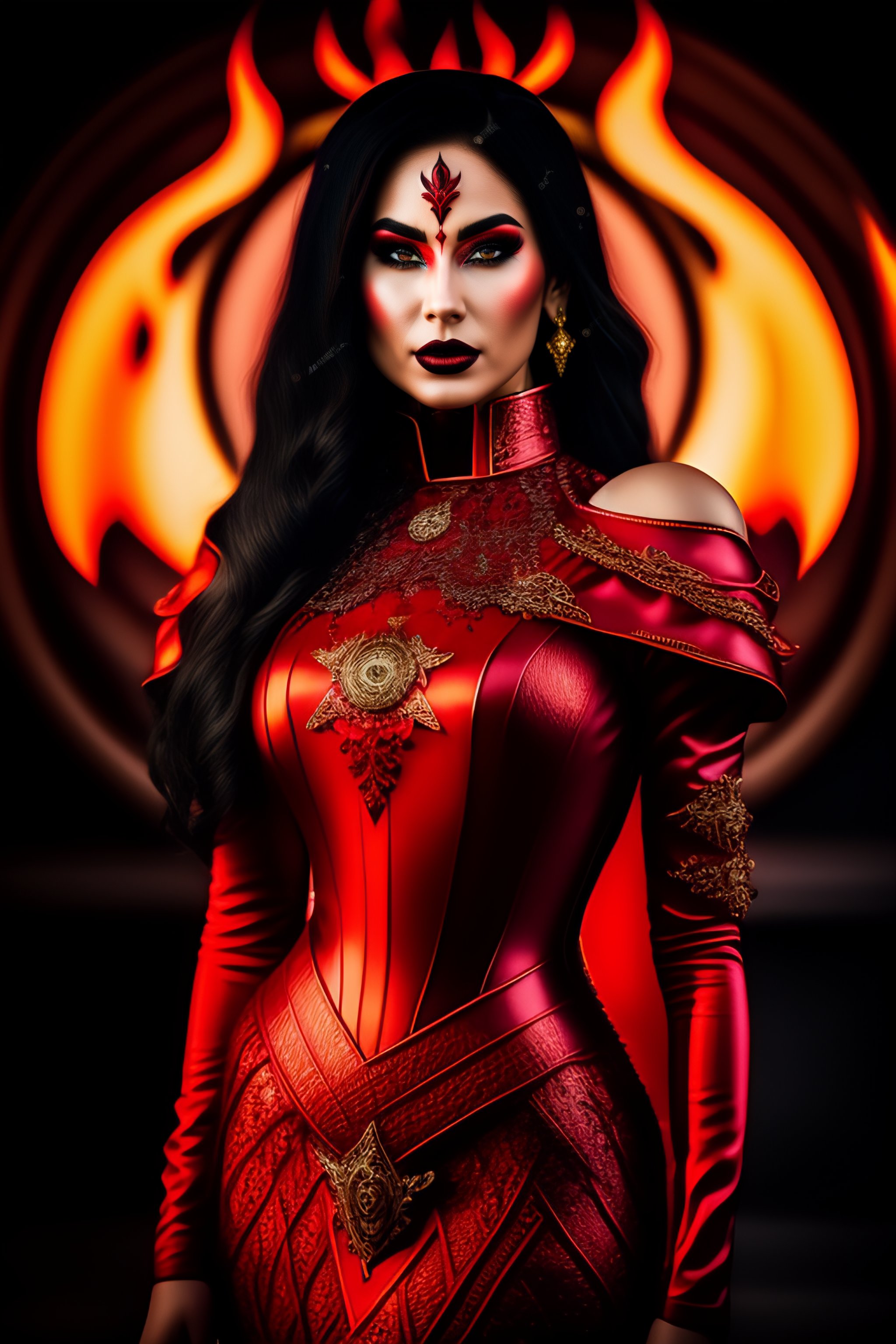 Black metal girl, devil makeup, fire power in hands, realistic detailed, beautiful gorgeous, red art nouveau dress, proportional body, nikon 70-200mm f/2.8g