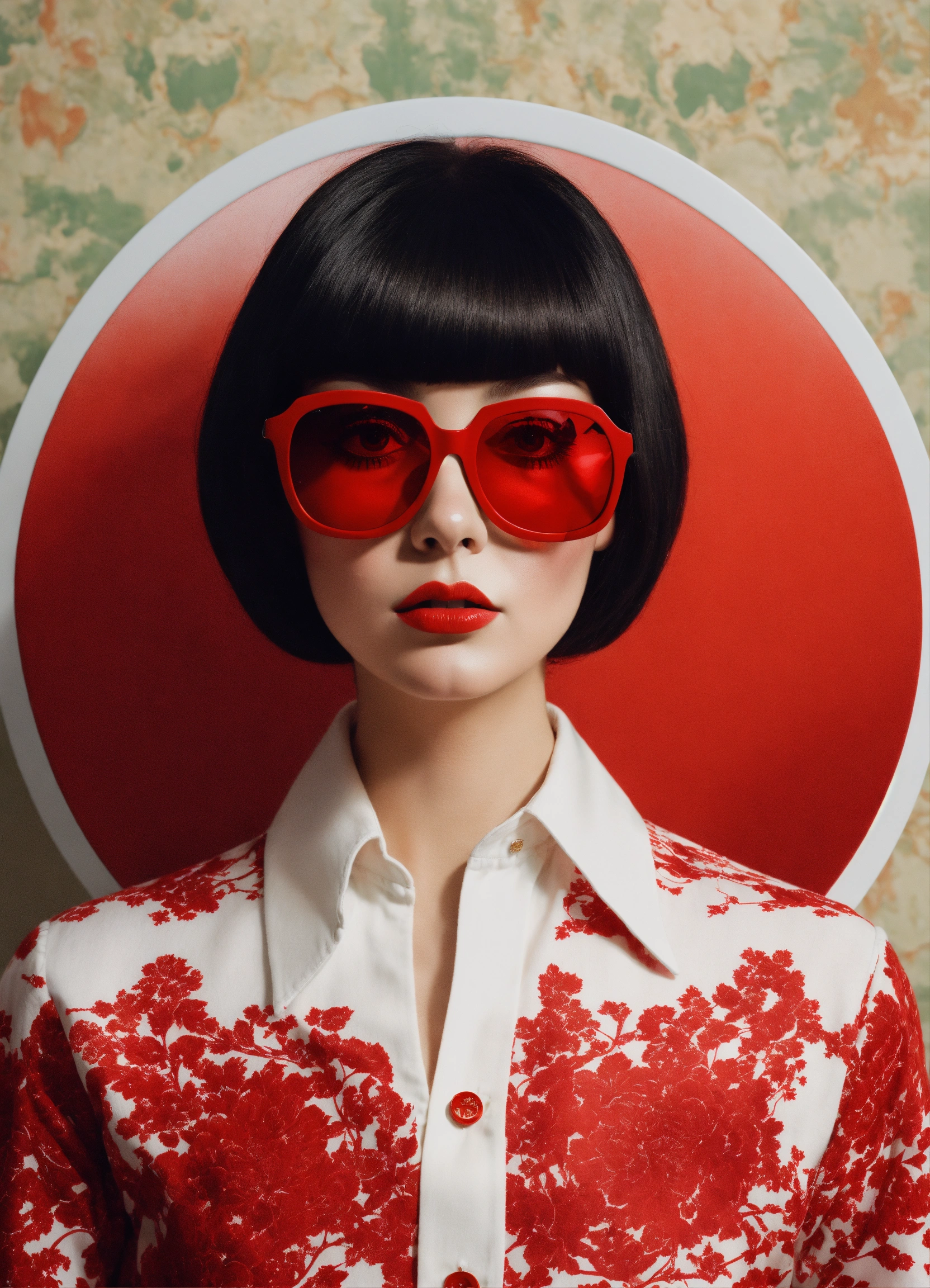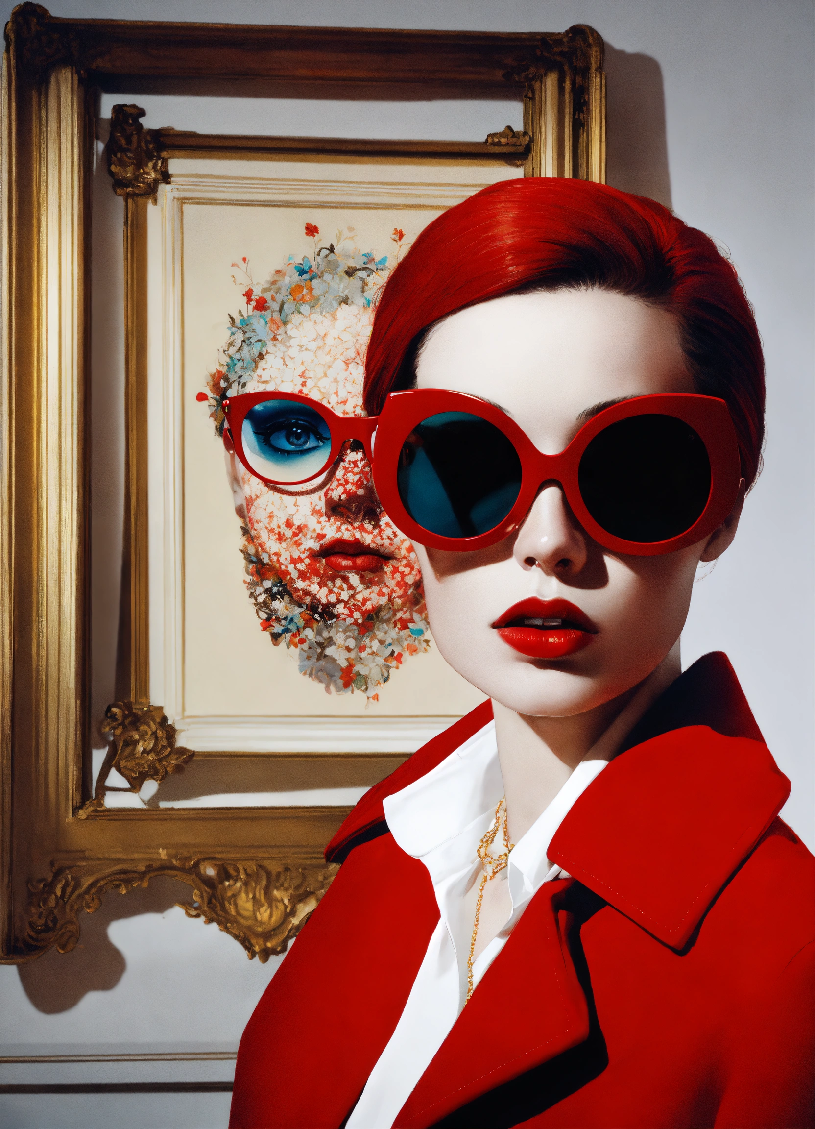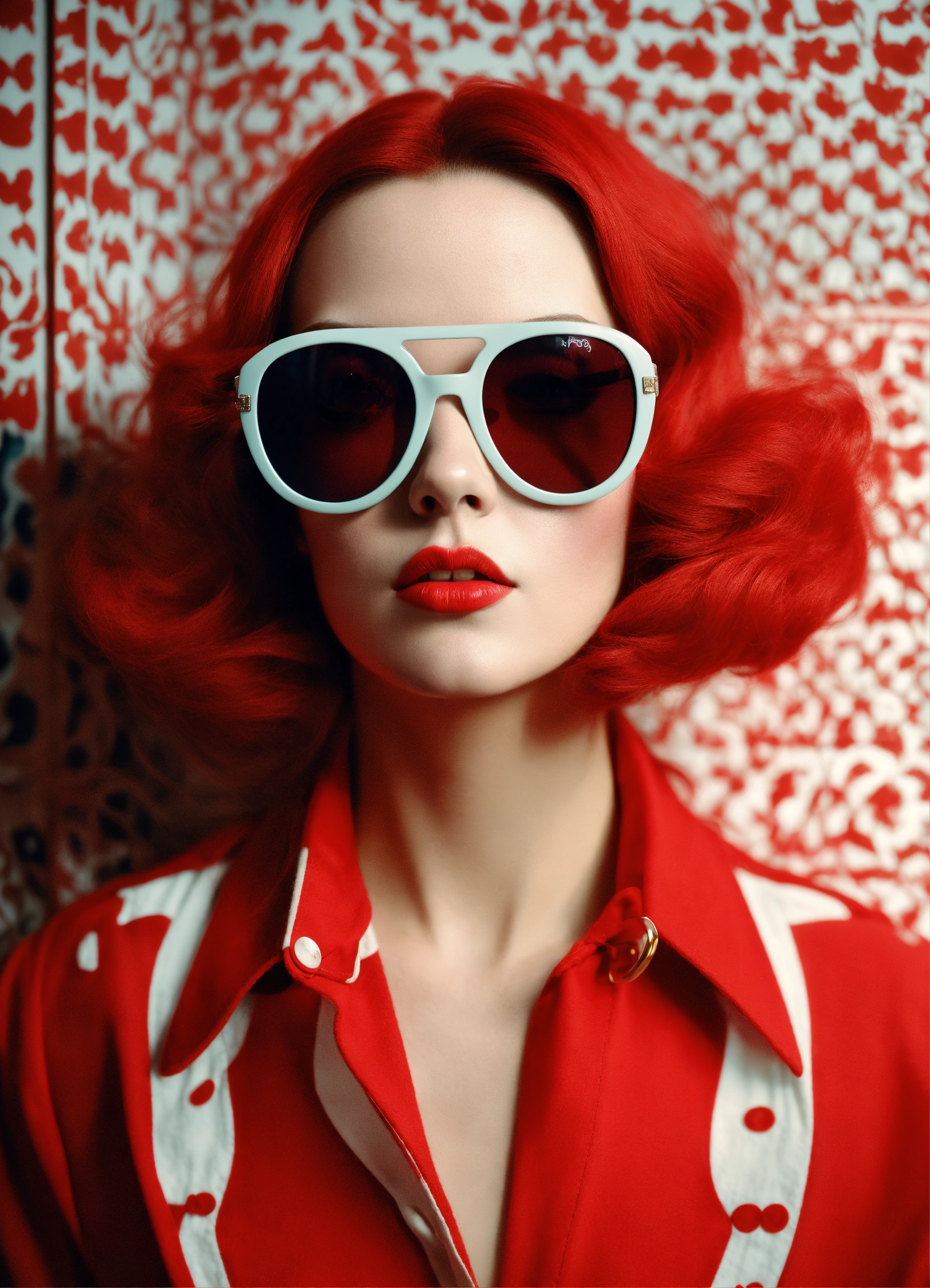 Half portrait photography, in front of a white screen, an american plan of a pop 60's famous woman in minimal shape white and red wool shirt and large sunglasses, 80 degree view, art by sergio lopez, natalie shau, james jean and salvador dali