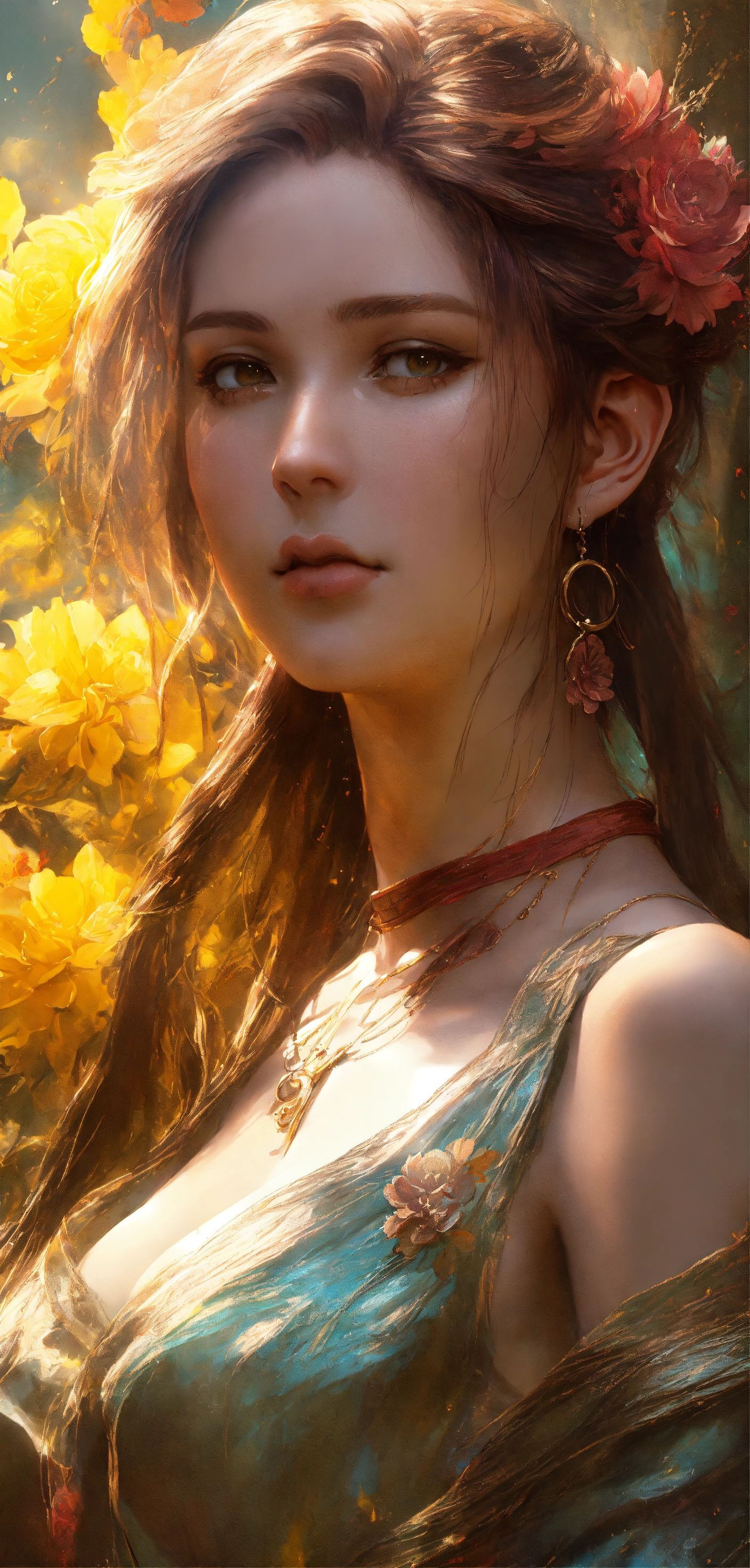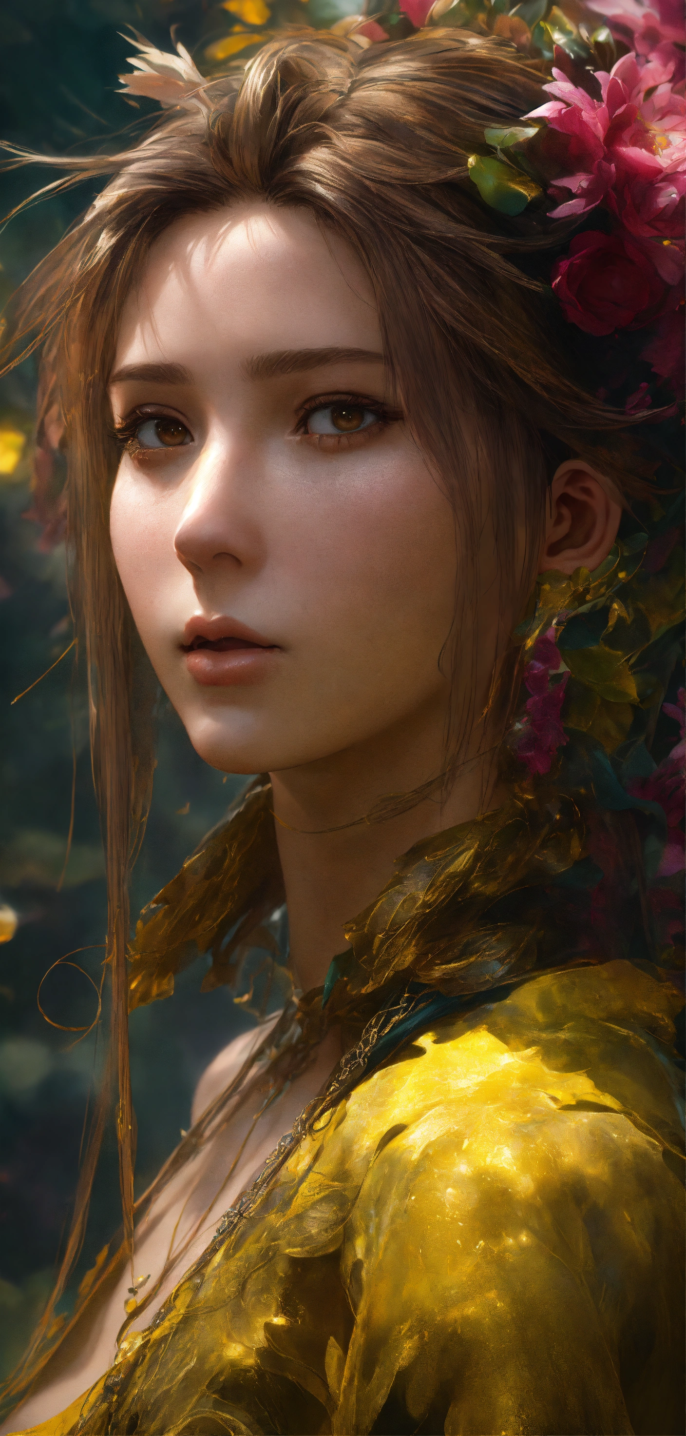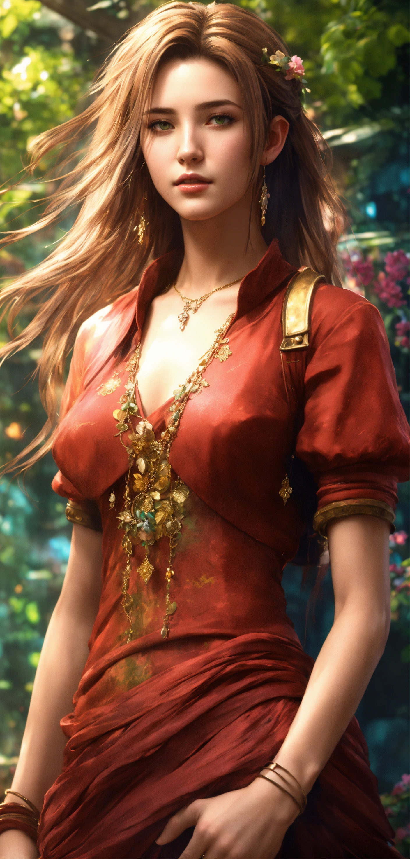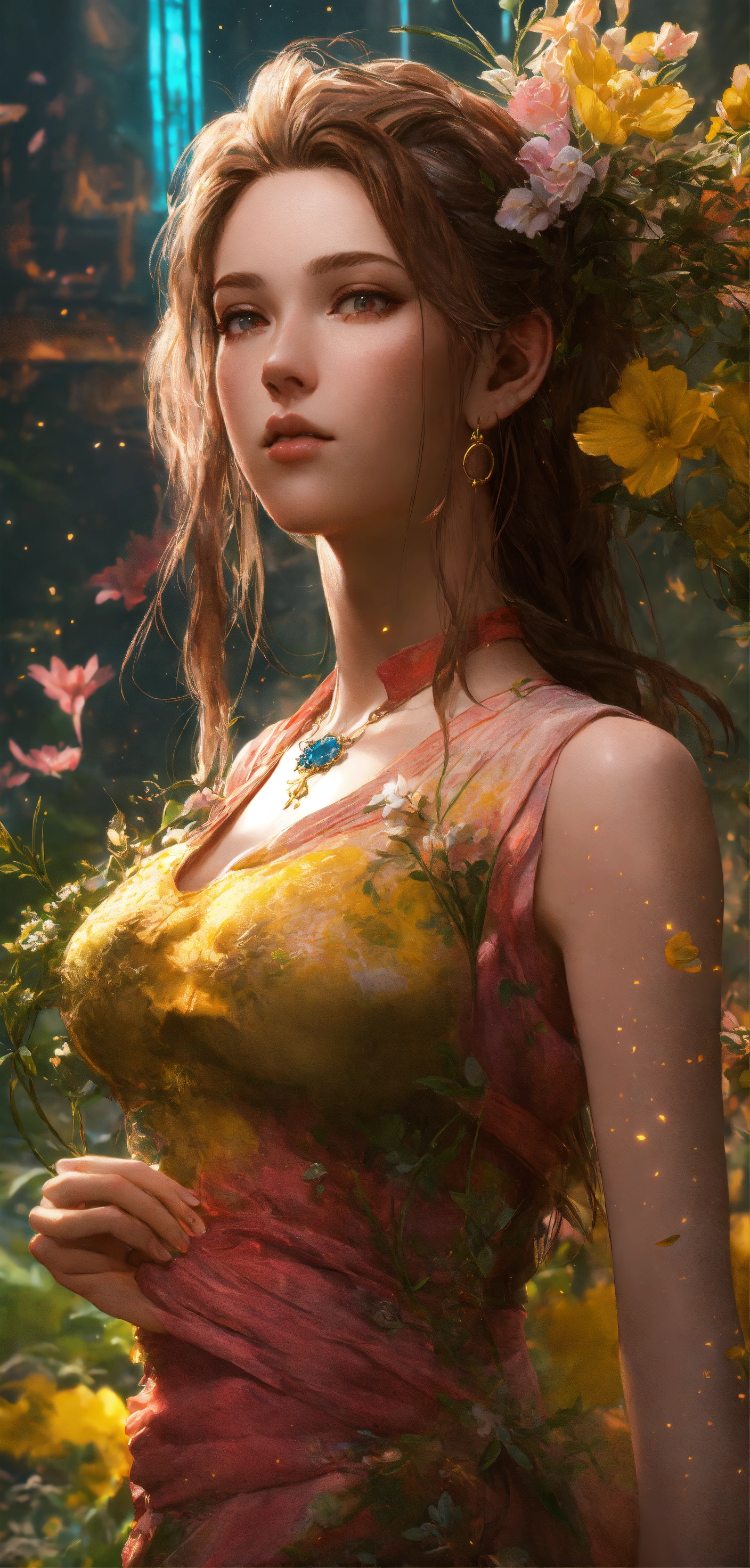 Gorgeous aerith gainsborough from final fantasy vii remake, ethereal background, abstract beauty, stand, approaching perfection, pure form, golden ratio, minimalistic, concept art, by brian froud and carne griffiths and wadim kashin and john william waterhouse, intricate details, 8k post production, high resolution, hyperdetailed, trending on artstation, sharp focus, studio photo, intricate details, highly detailed, by greg rutkowski, hands without defects, sculptural body, luxury jewerly, full body