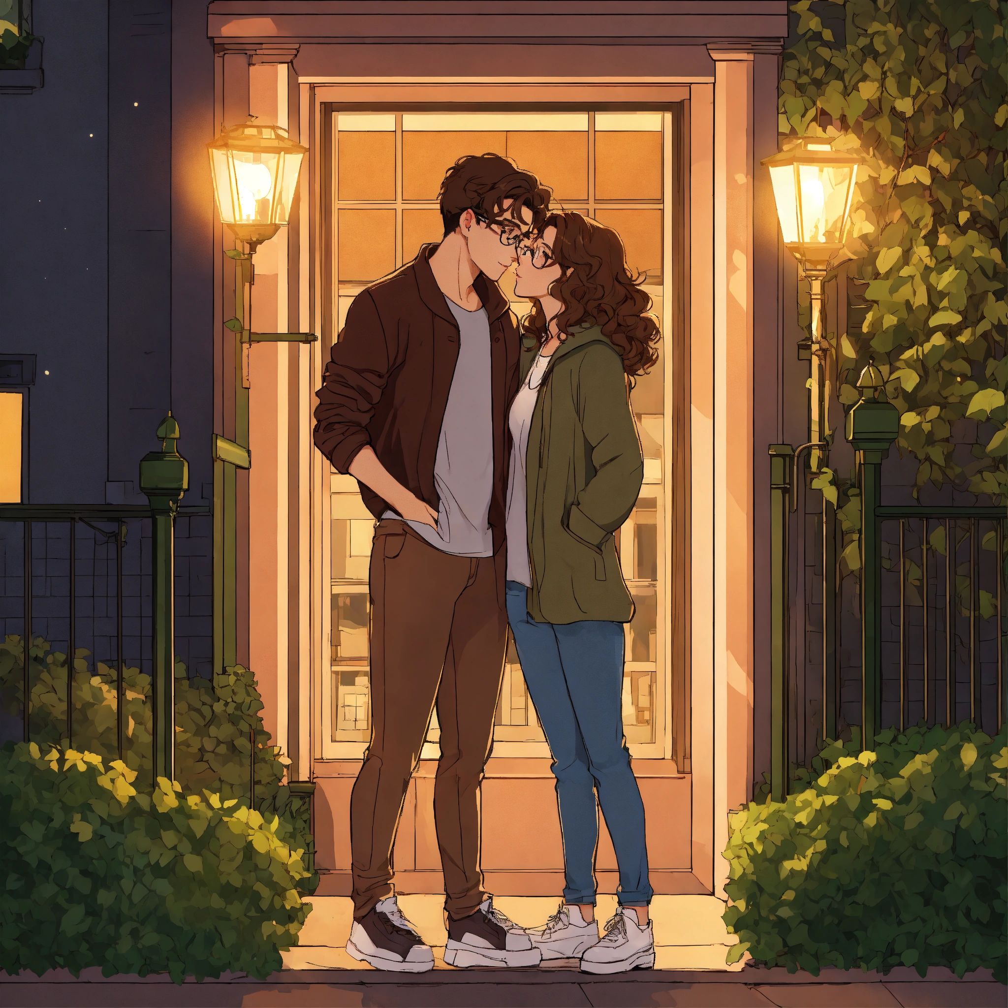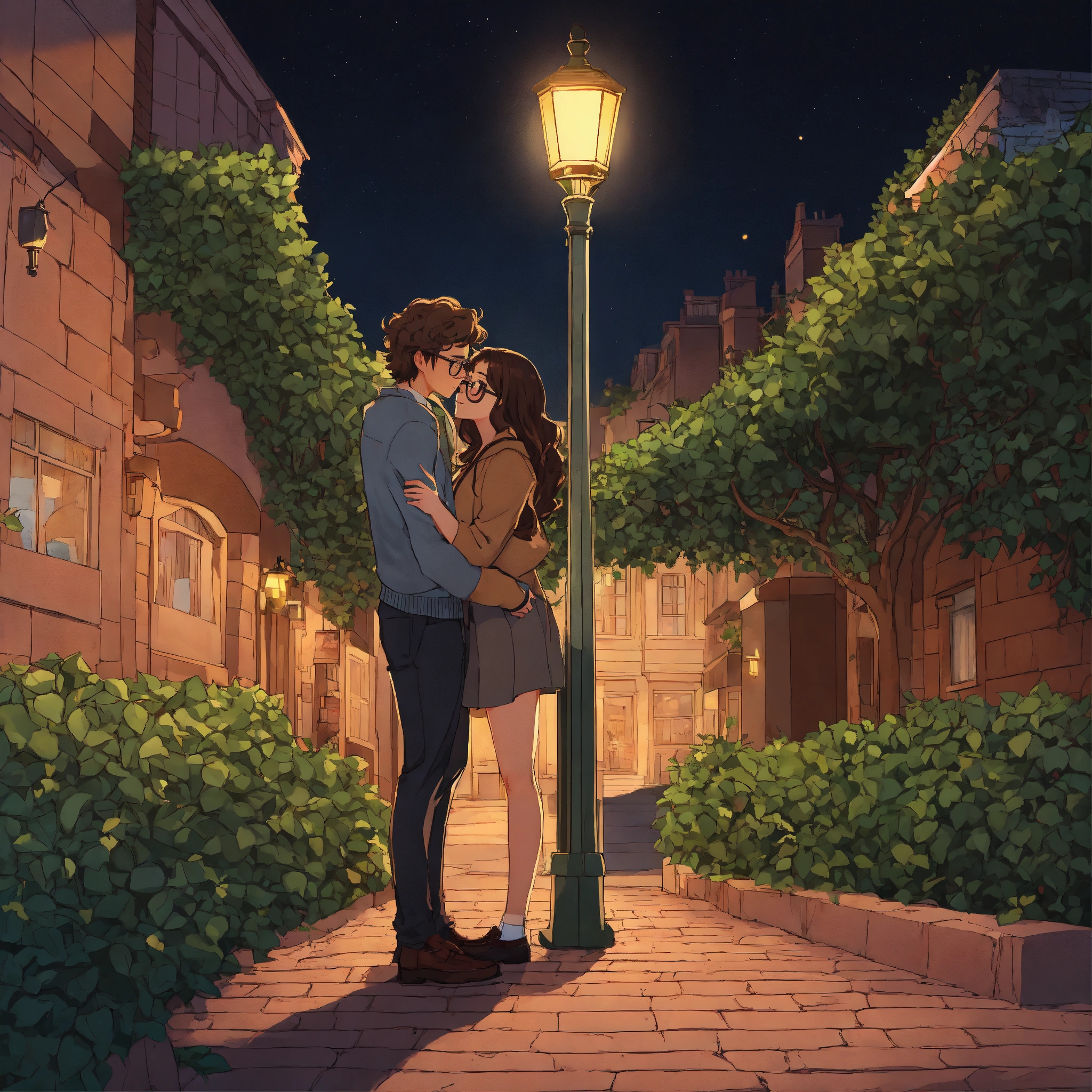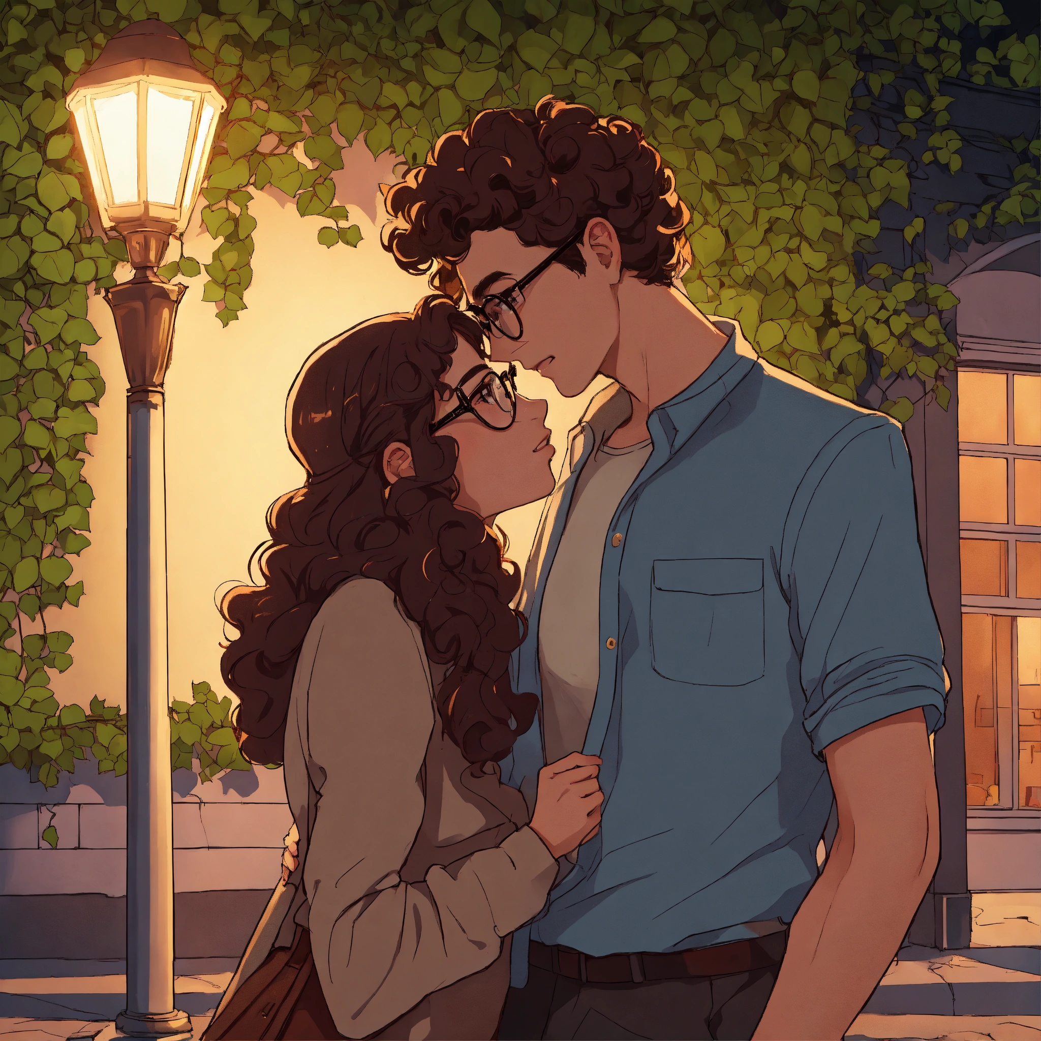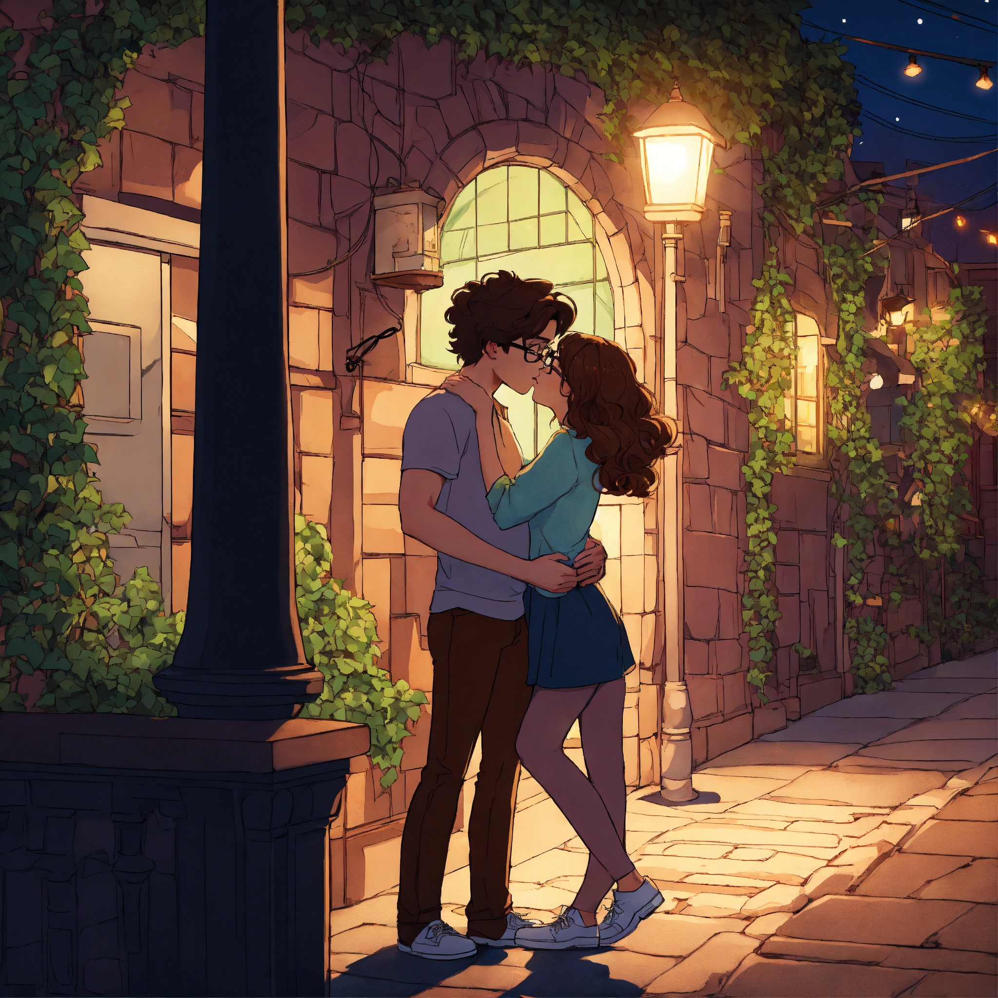 Young man with dark brown hair kissing a girl with light brown curly hair with glasses in front of a low wall with ivy under a street lamp at night in cartoon style