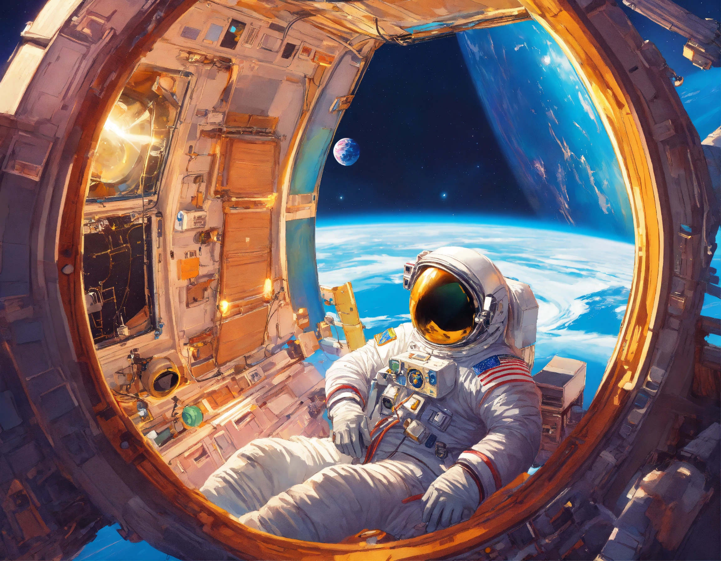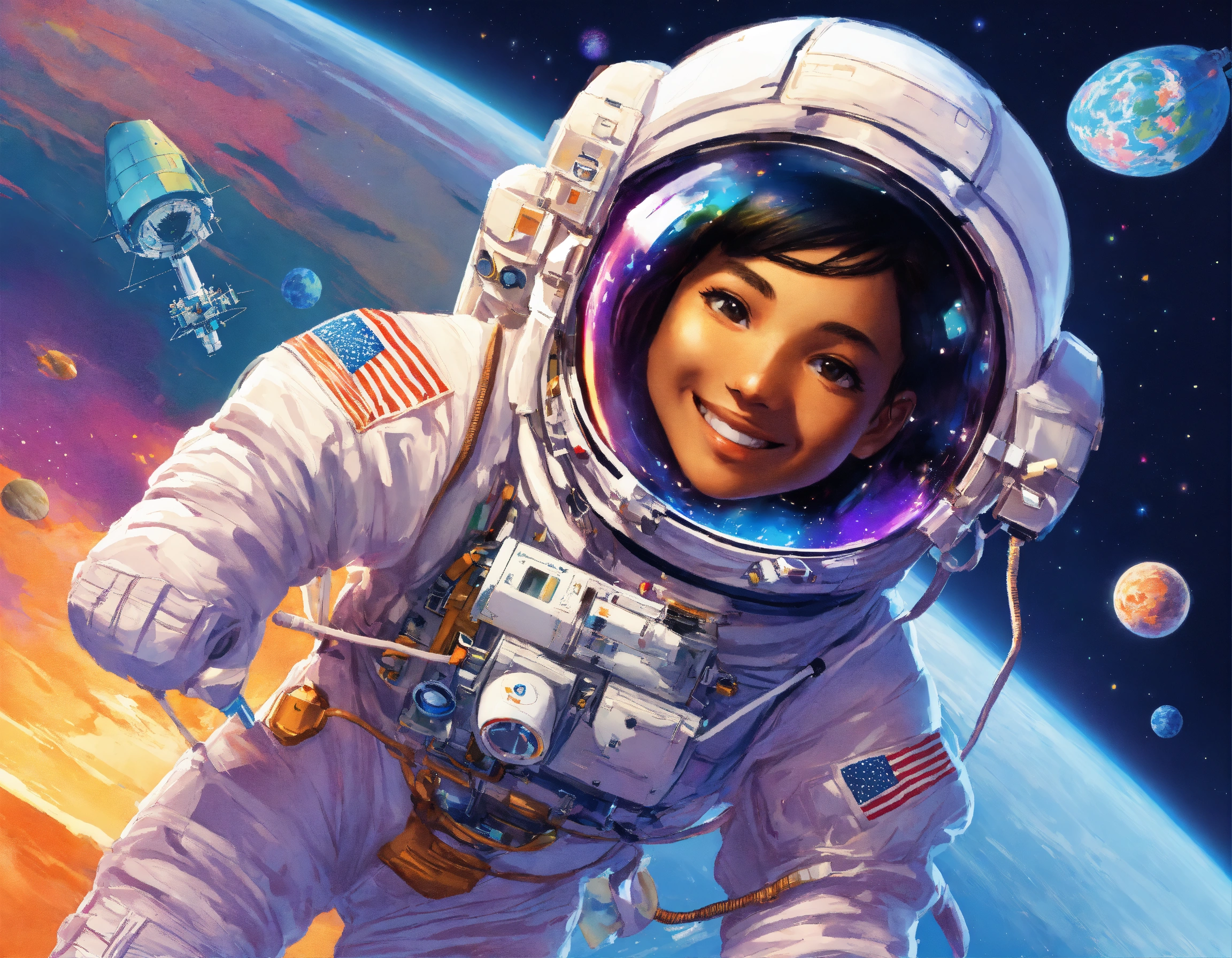 An astronaut repairing a space satellite, smiling, indonesian face, background behind the am-2 express satellite, framing, dramatic light, storybook illustration, 8k, by lisa frank