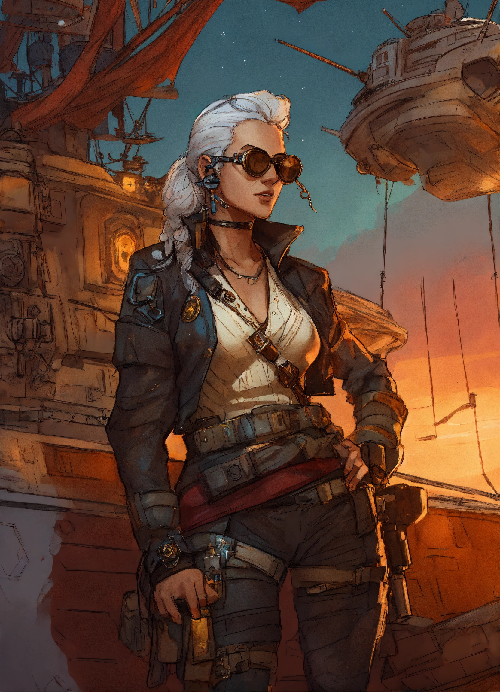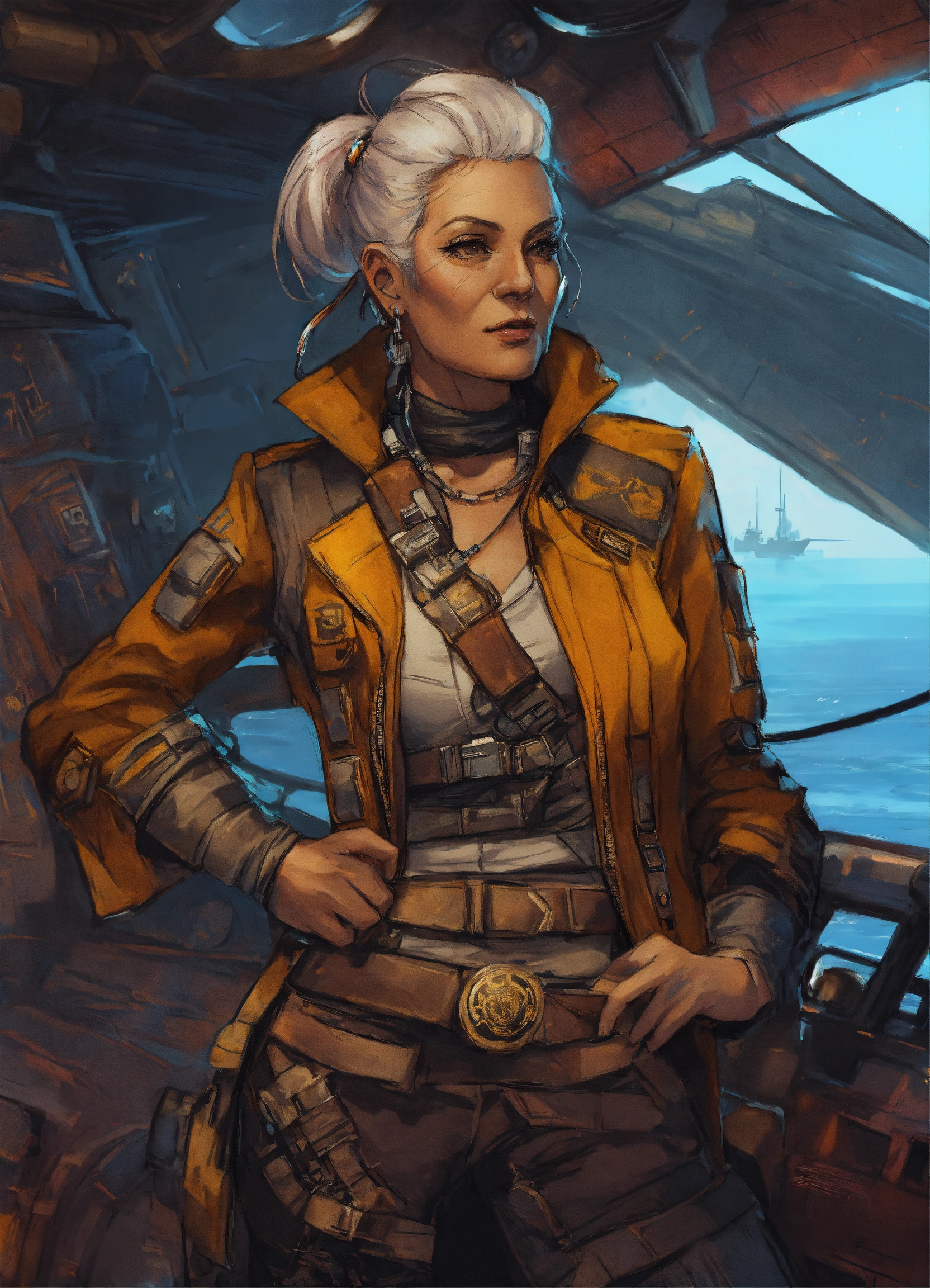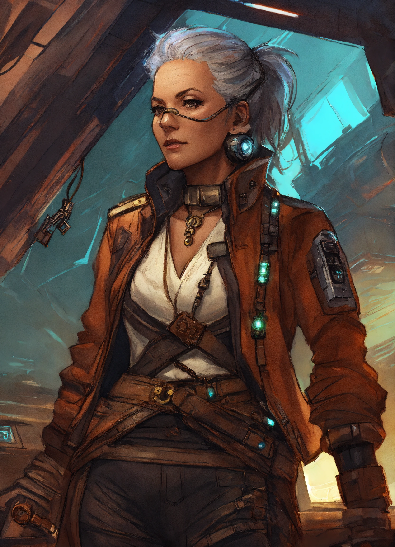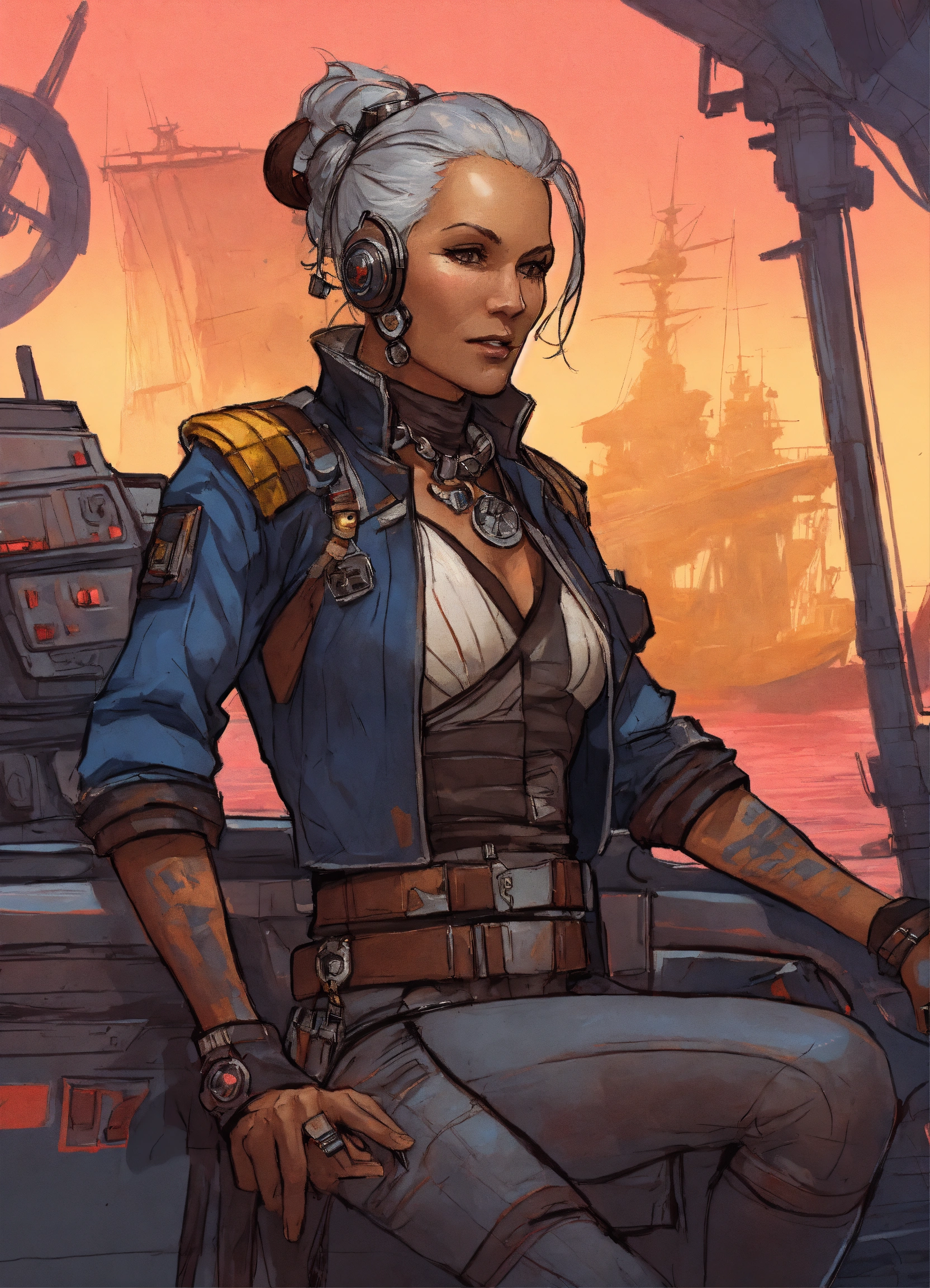 Sketched character art of a cyberpunk older female pirate on a star wars ship