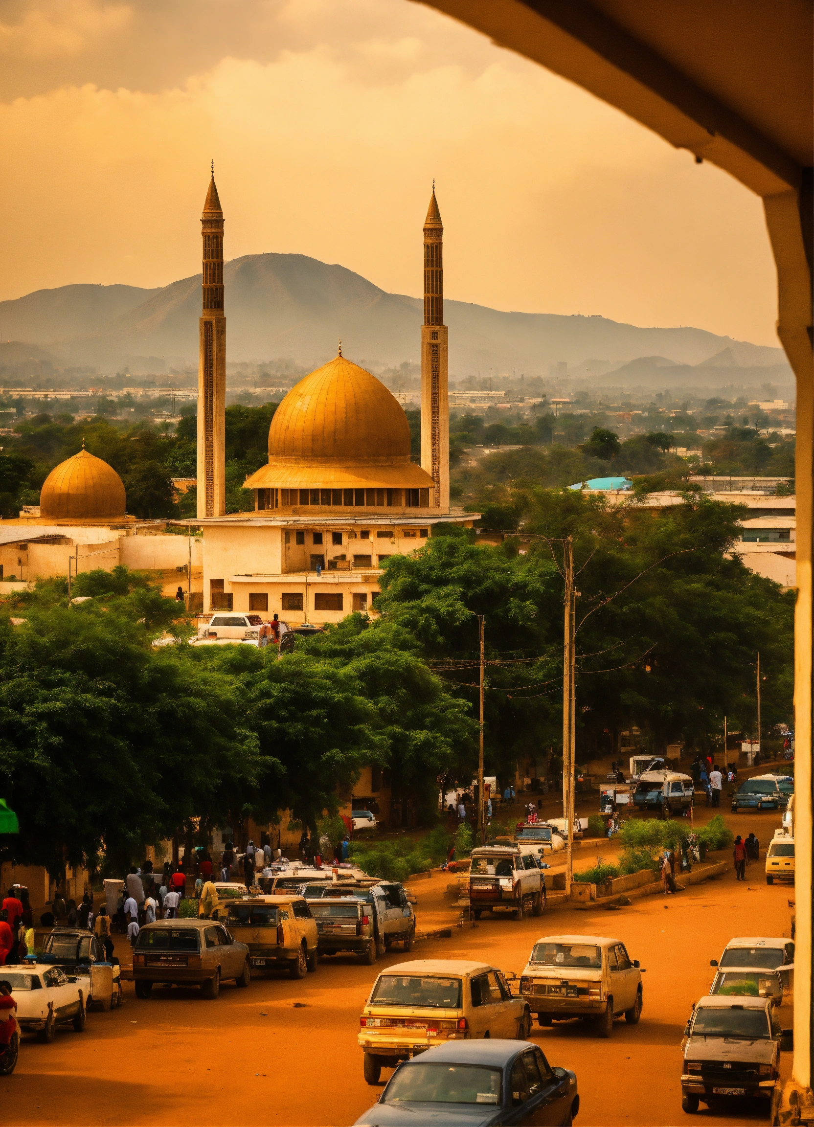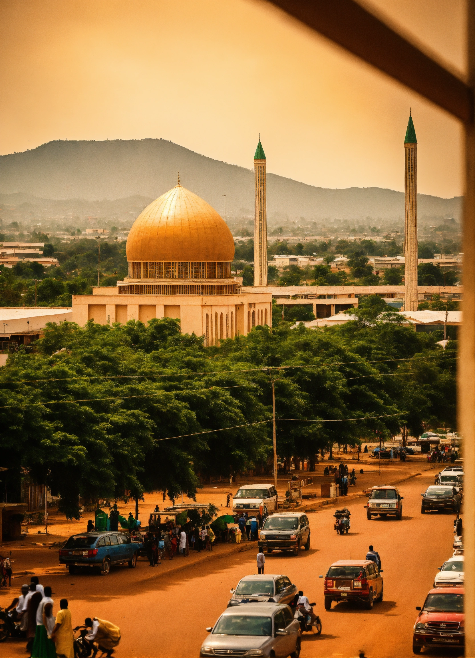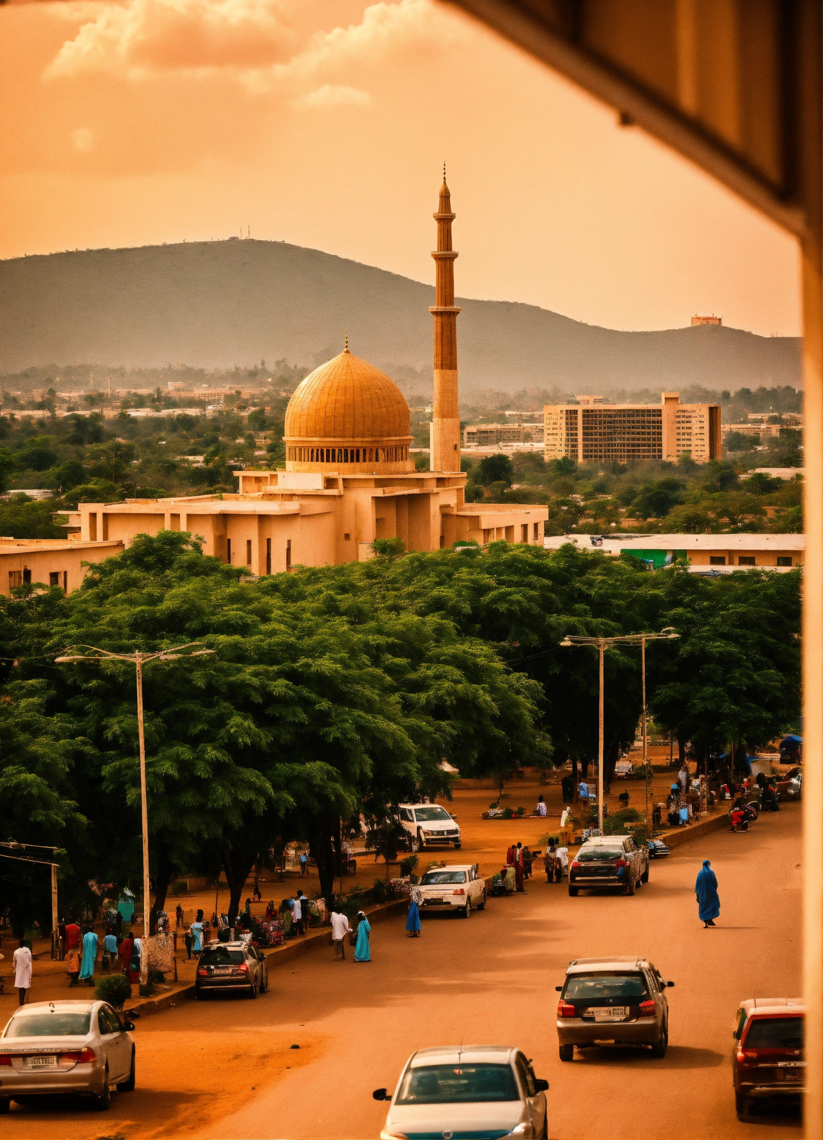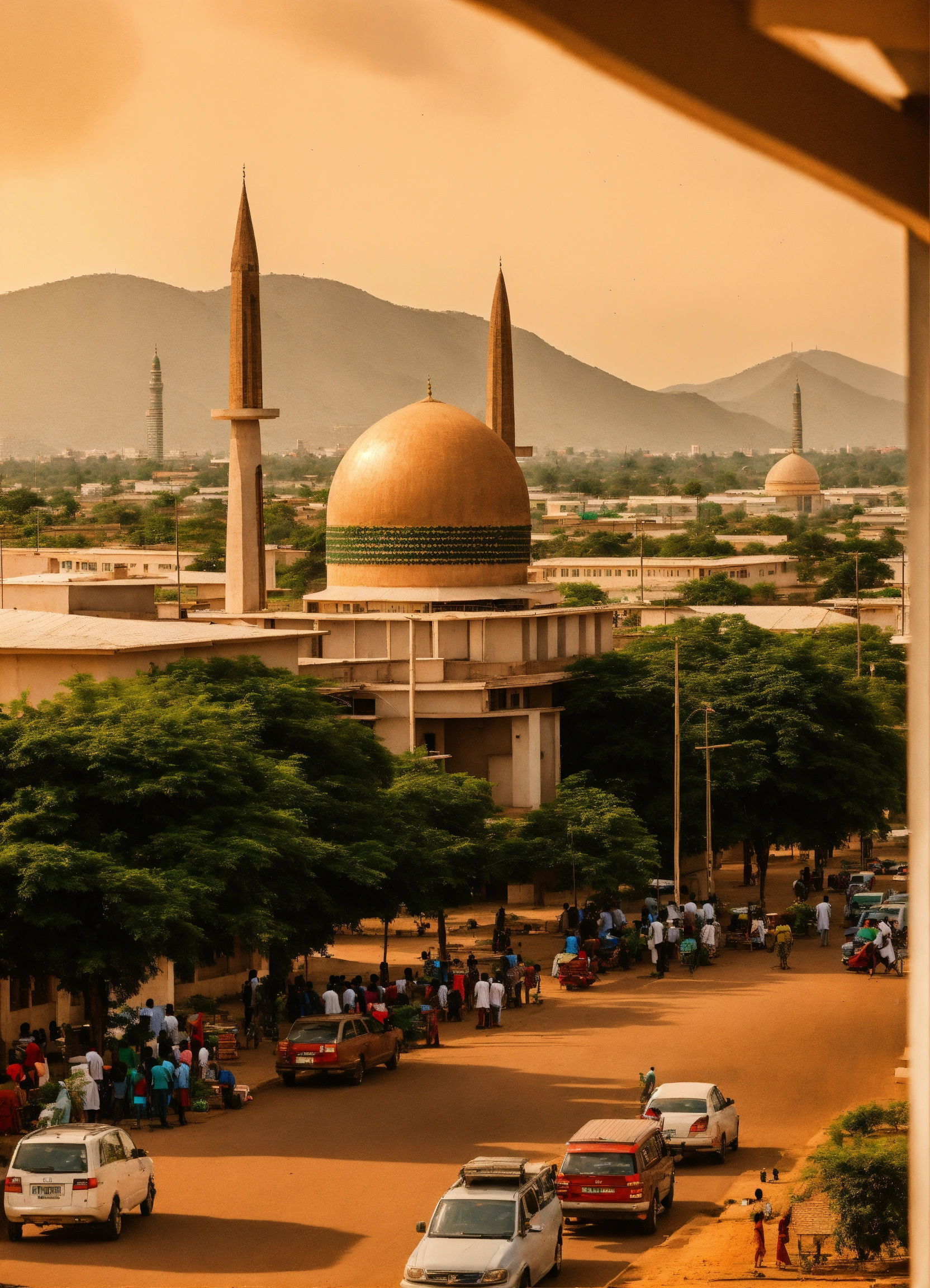 Abuja cityscape, include abuja national mosque at distance view, nigeria atmosphere, photo realistic, extremely detail building and people, daily life, city neighborhood, include abuja style cafe and stores at a near distance, cinematic, lots of people, 8k photo, maximal