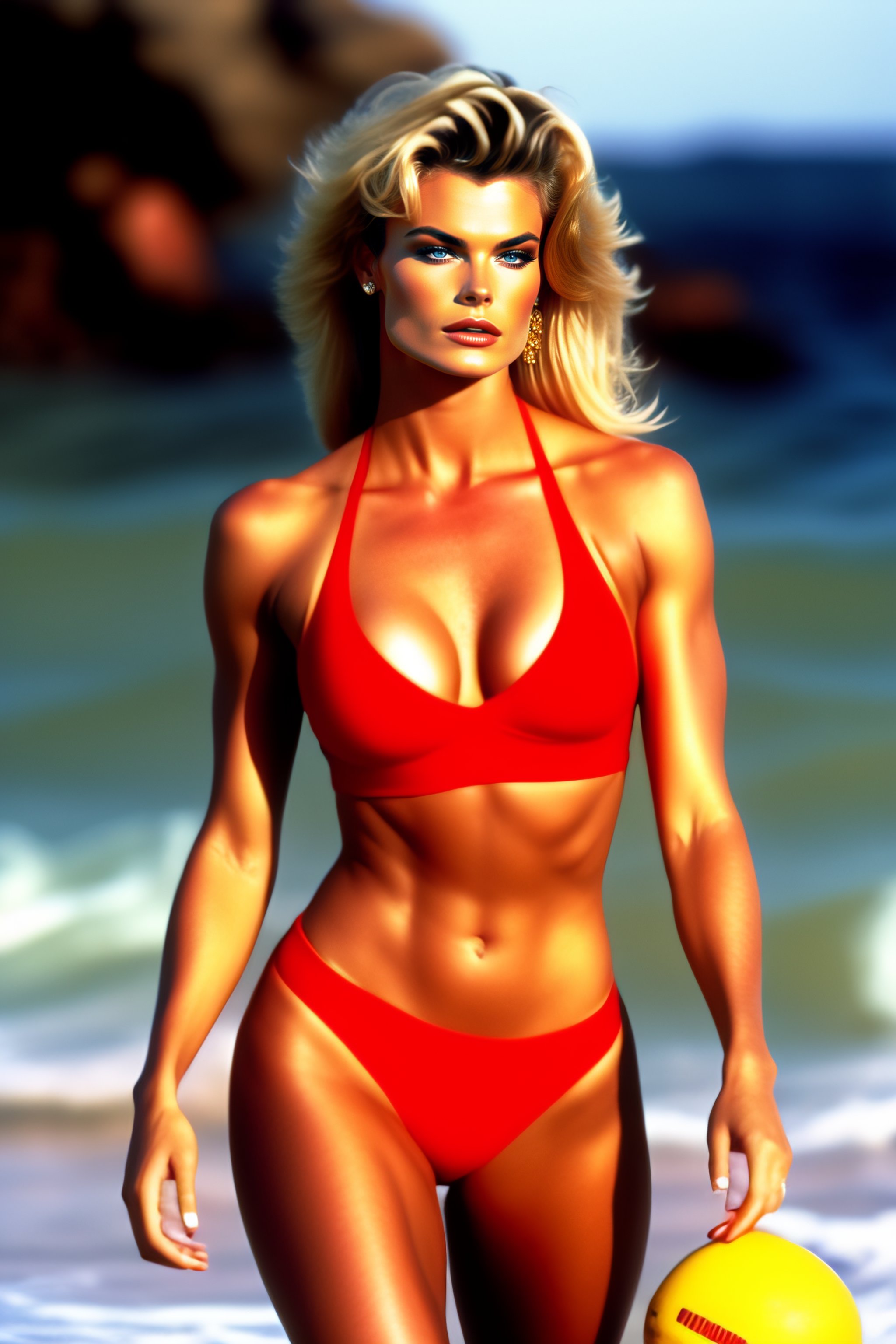 An action photo of a slender 19 year old an action photo of erika eleniak from baywatch camoflauge swimwear with an extra extra large bust