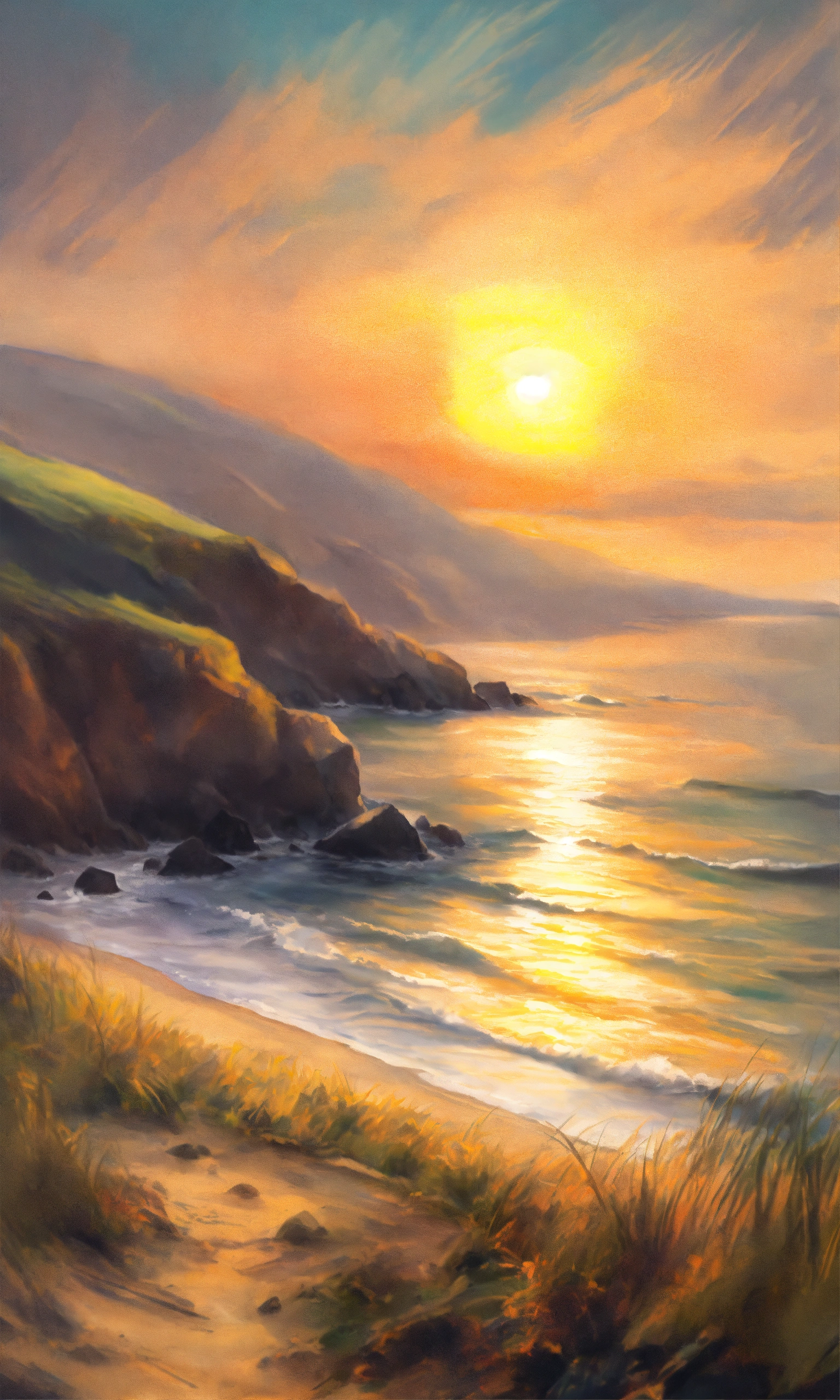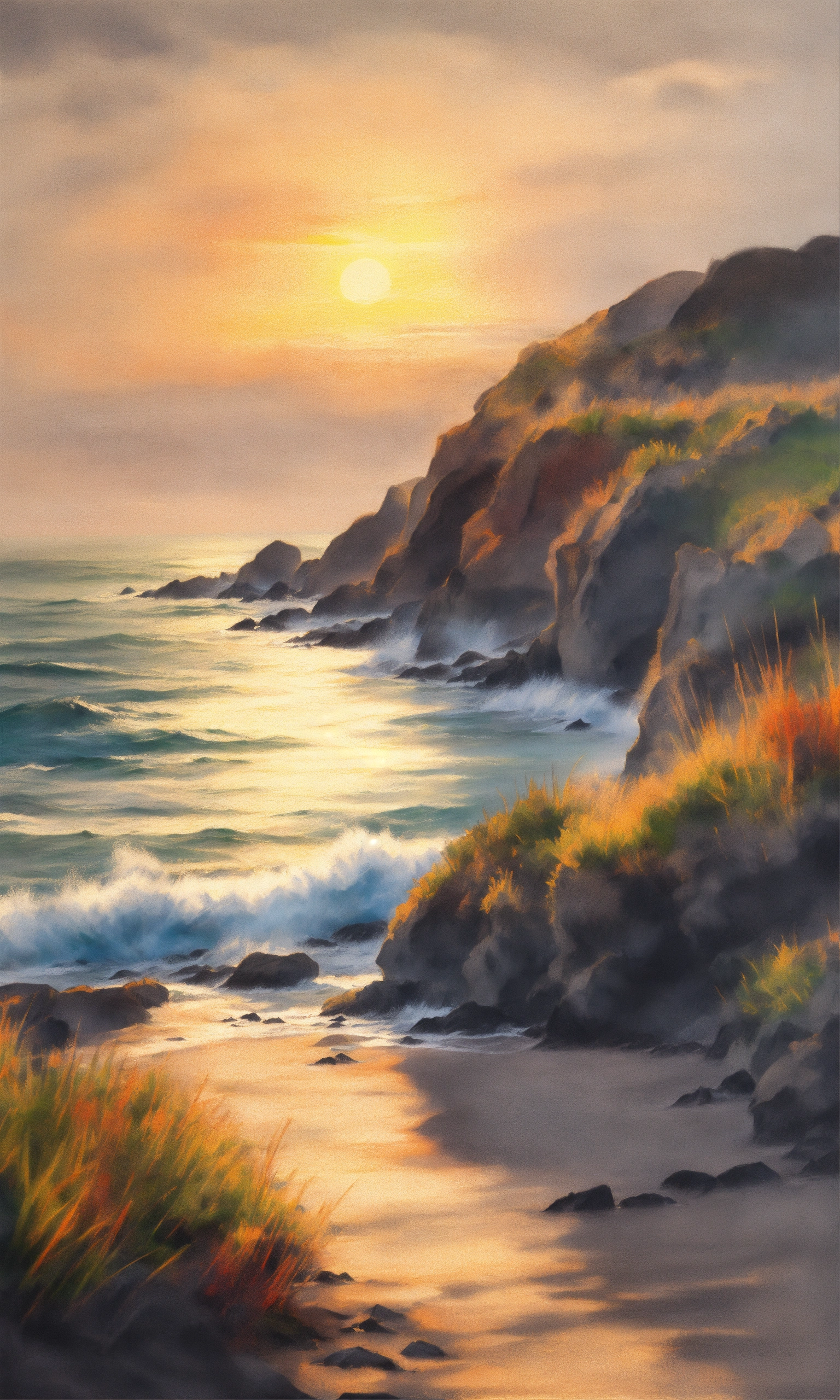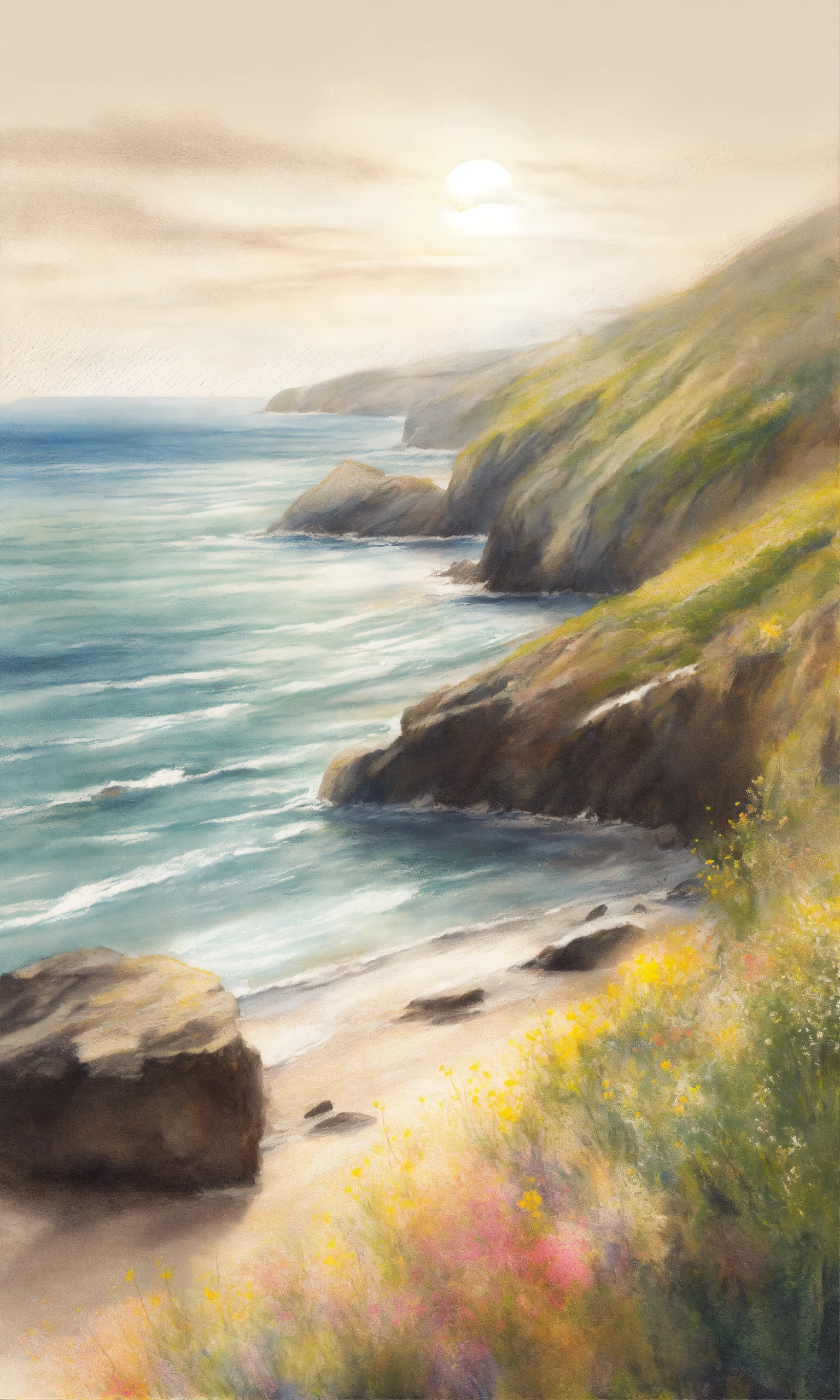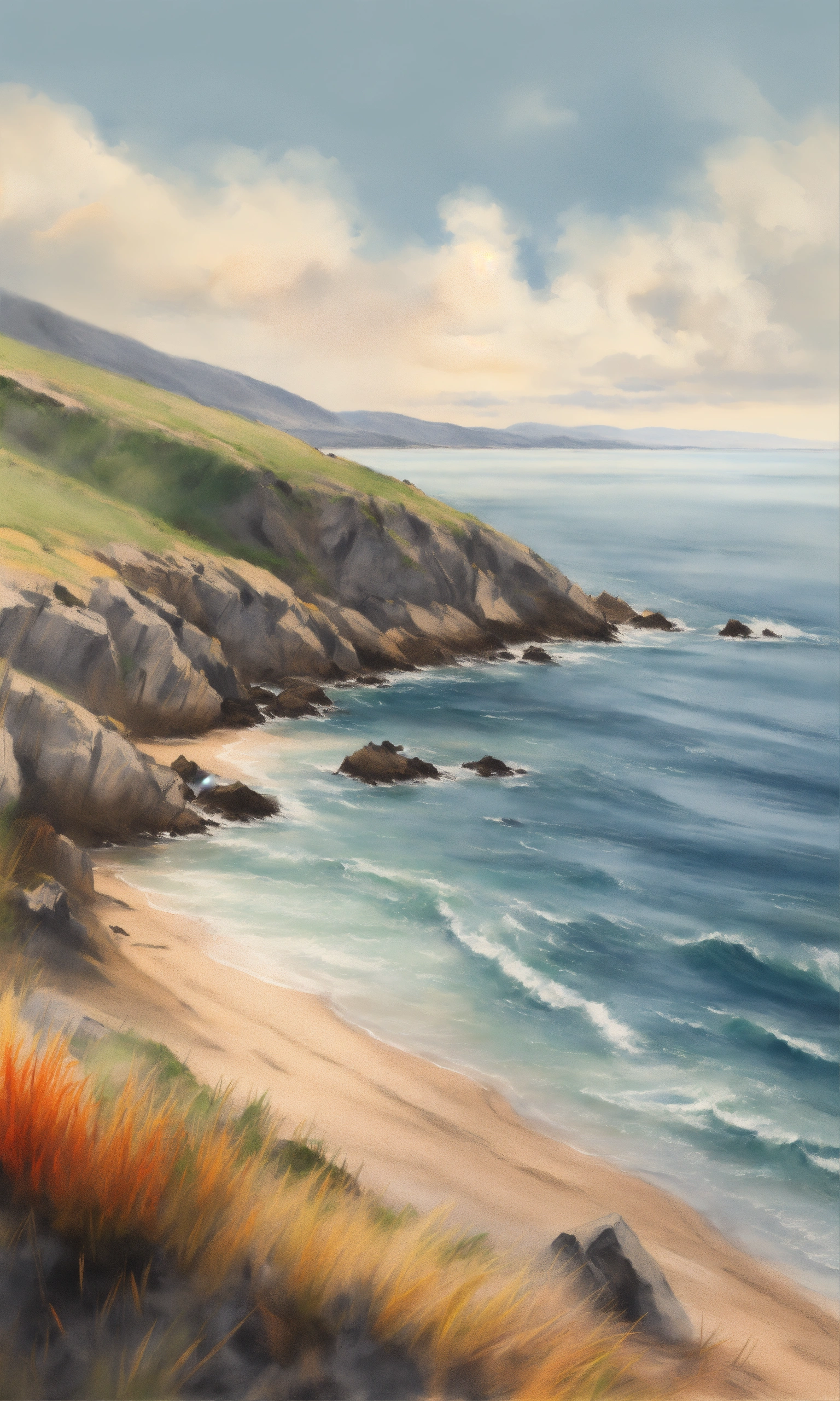 Create a vector pencil sketch of the sunny and vibrant coastal seascape using charcoal, inspired by impressionism.