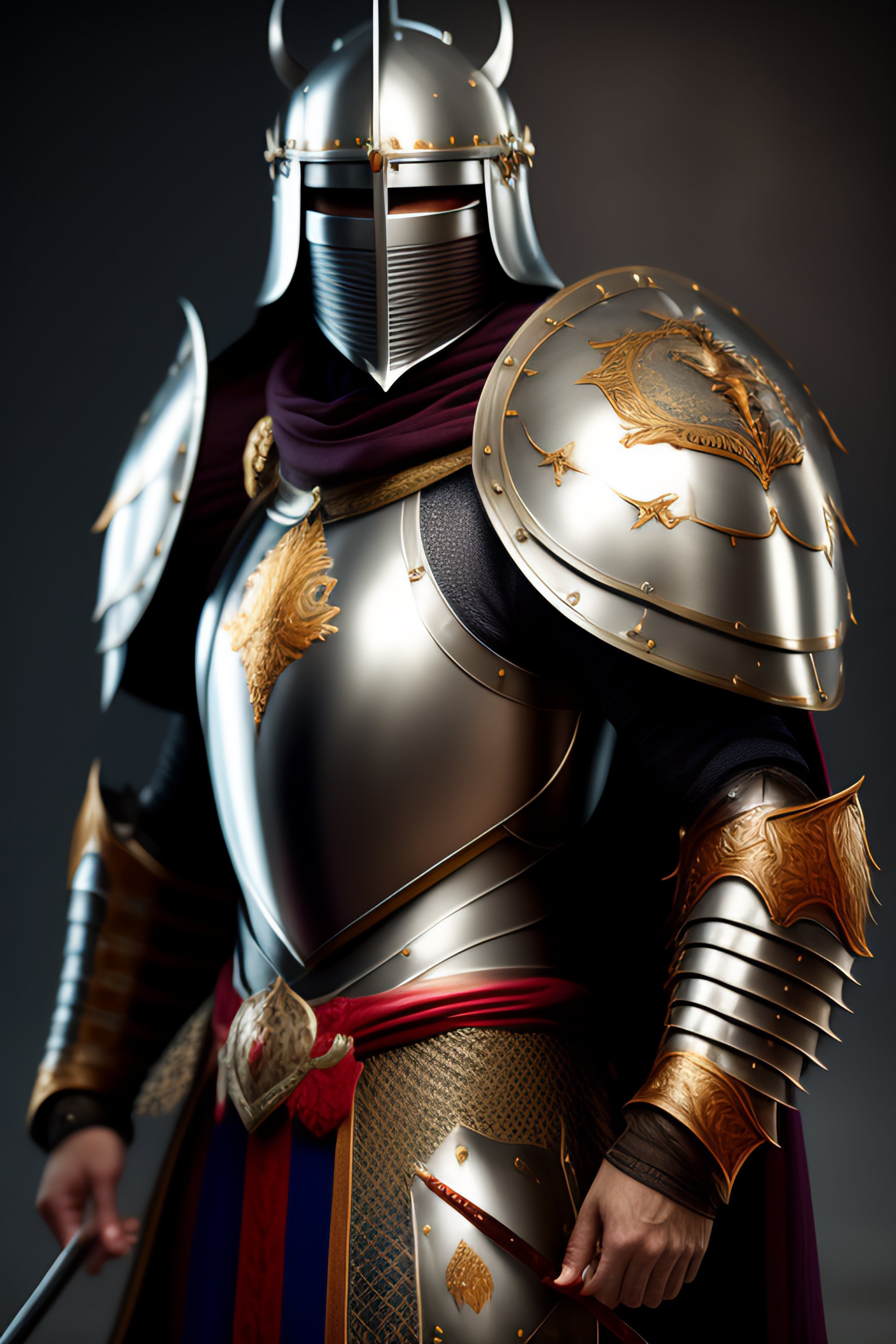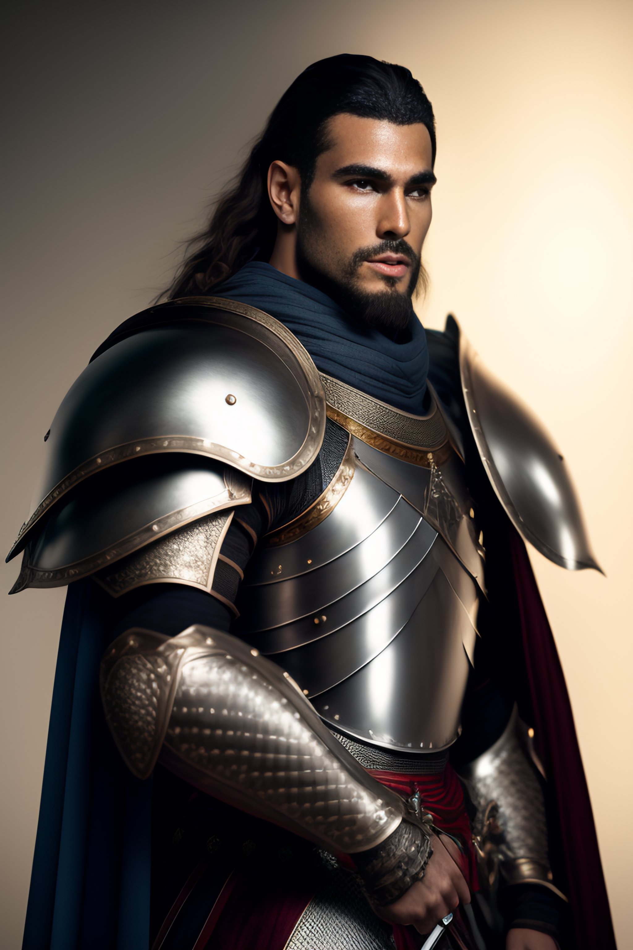 Portrait of a male knight, scars, strong, cute, metal, really nice proportions, photorealism, studio lighting, award photograph, white majestic heavy armor, lineage2, right handed shield, left hand damascus sword