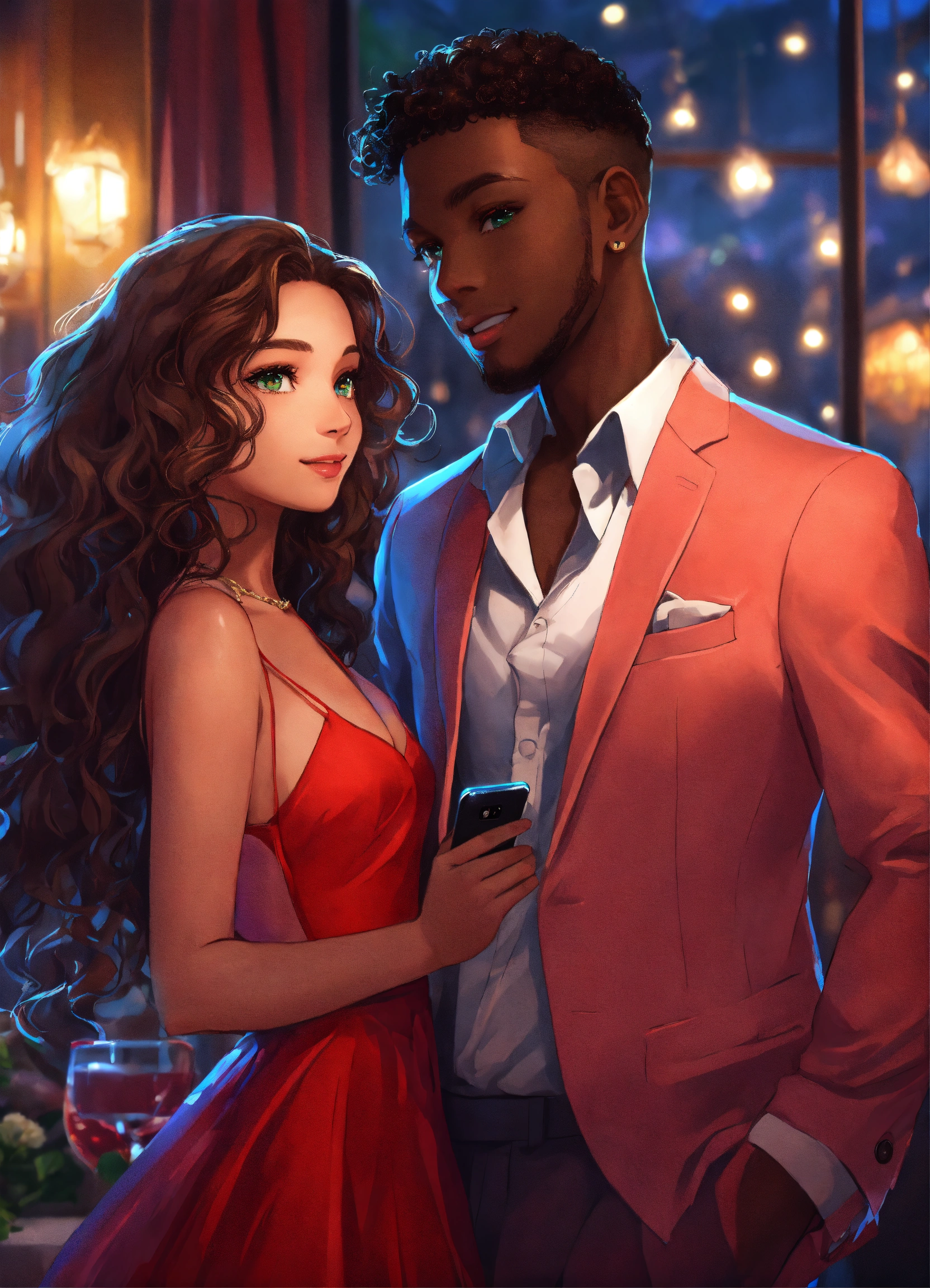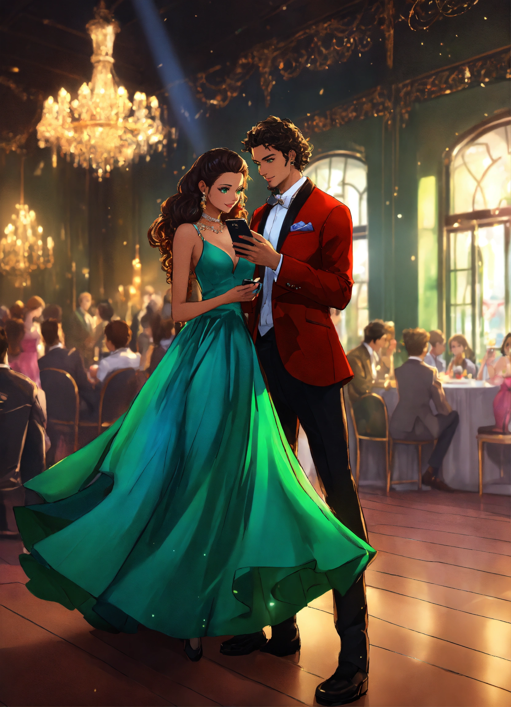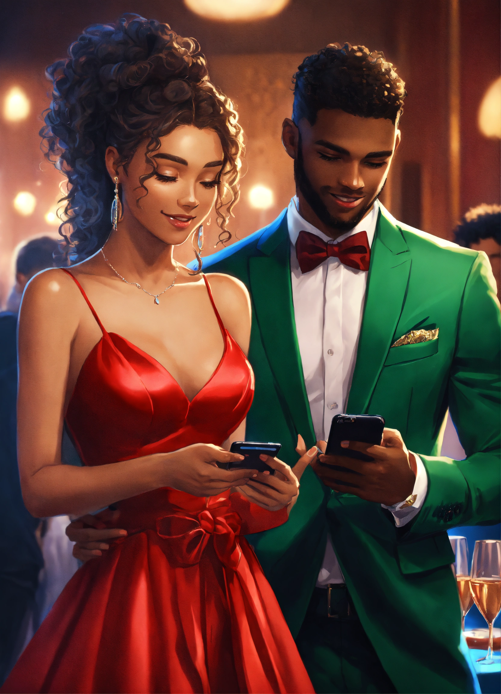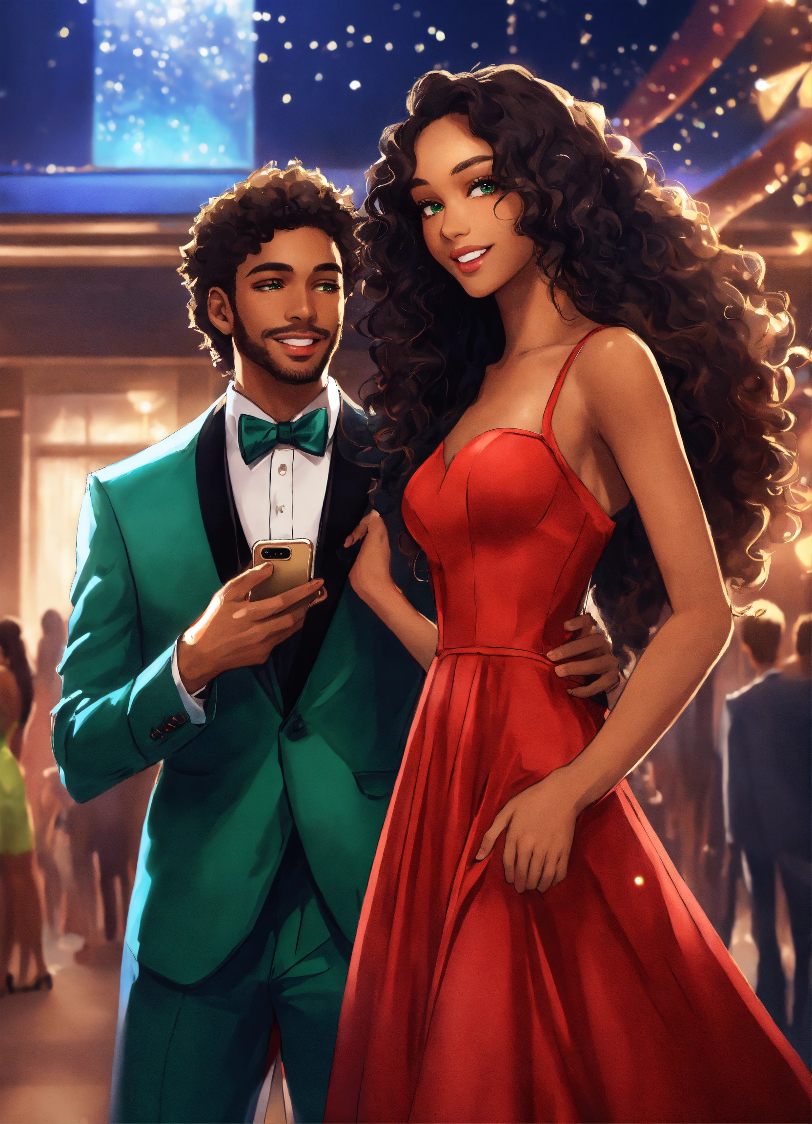 Anime; cartoon; ultra realistic; 4k, both looking at the phone, smartphone, beautiful girl, smily, wearing a beautiful prom red dress, at a very glamours luxury party, mixed race with green eyes, and long curly hair, 4k, ultra realistic, dancing, mixed race, talking with a handsome and beautiful black tall boy, hazel eyes, blue suit, both looking at the phone
