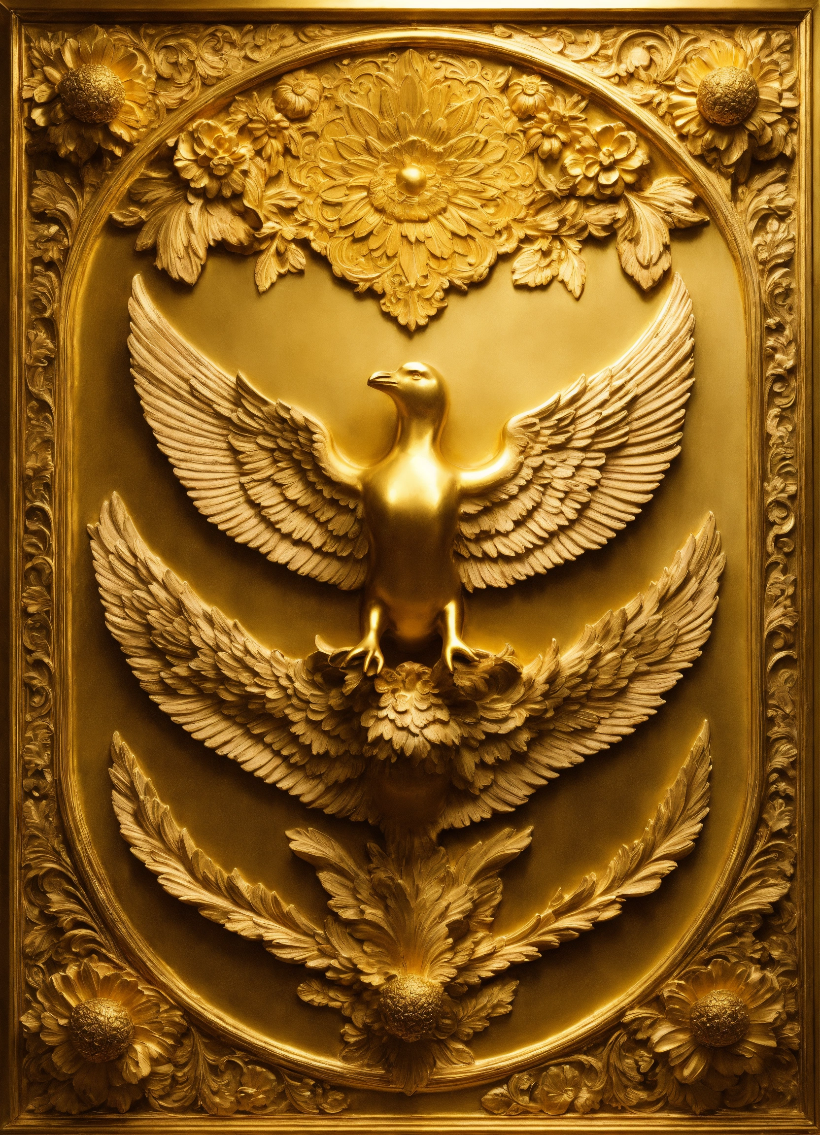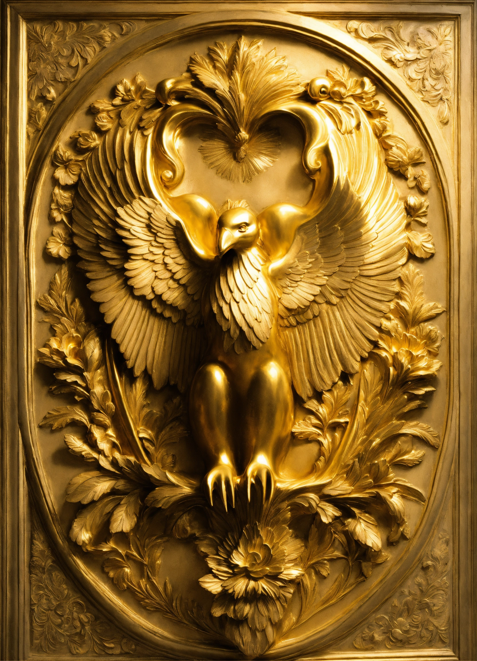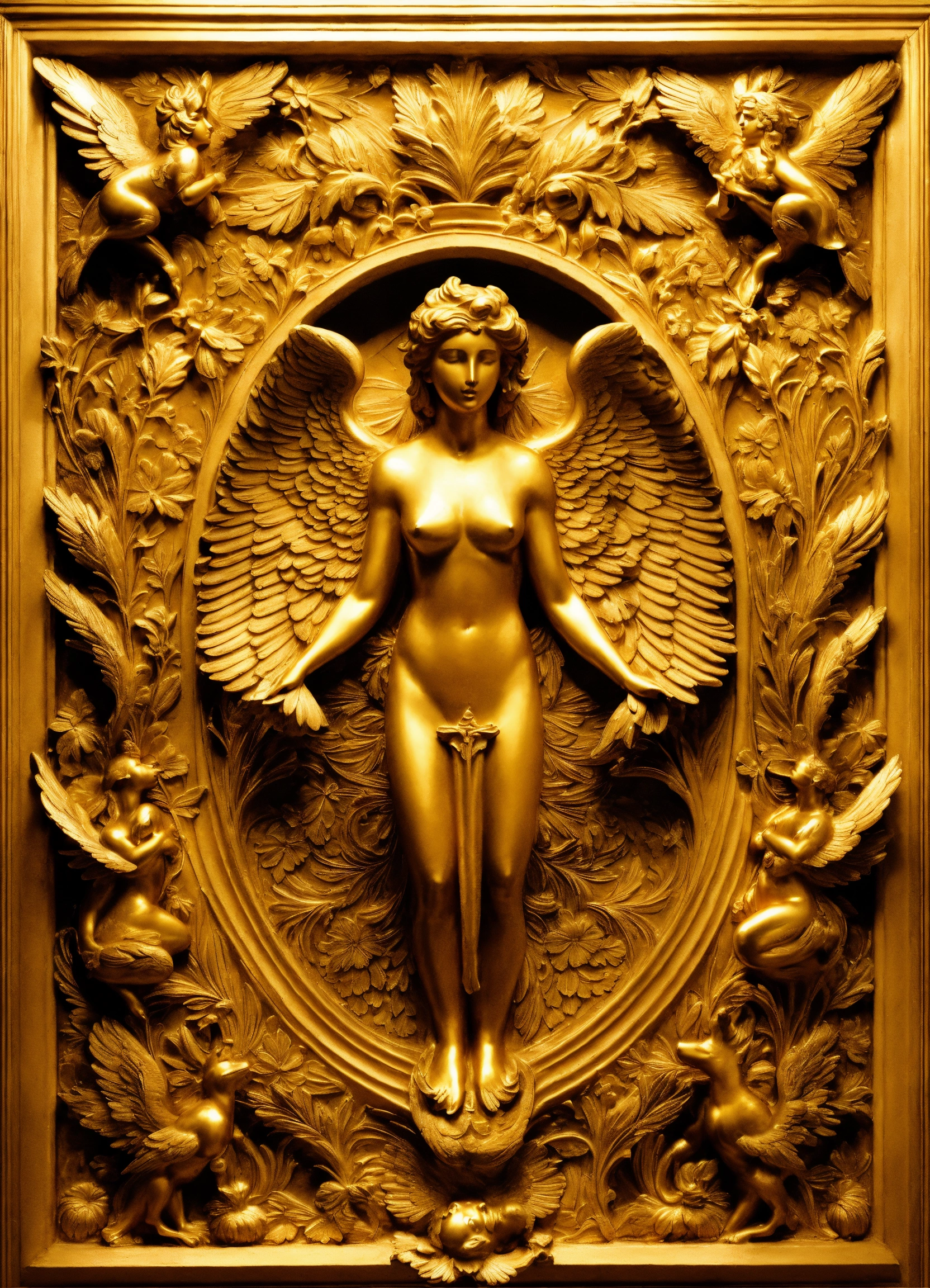 Male and famale, love, couple, wings spread eagle, paint-relief, plaster, symmetry ornament, 4k, volume, high detail, sculpture, plants, the background is golden, smooth, gypsum, center, decorative pattern, motif, highly detailed volumetric plaster work, bas-relief, painting, beautiful composition, the golden ratio, the big picture, the composition is beautiful, color golden potal, https//ru.pinterest.com/pin/700239442076096517/
