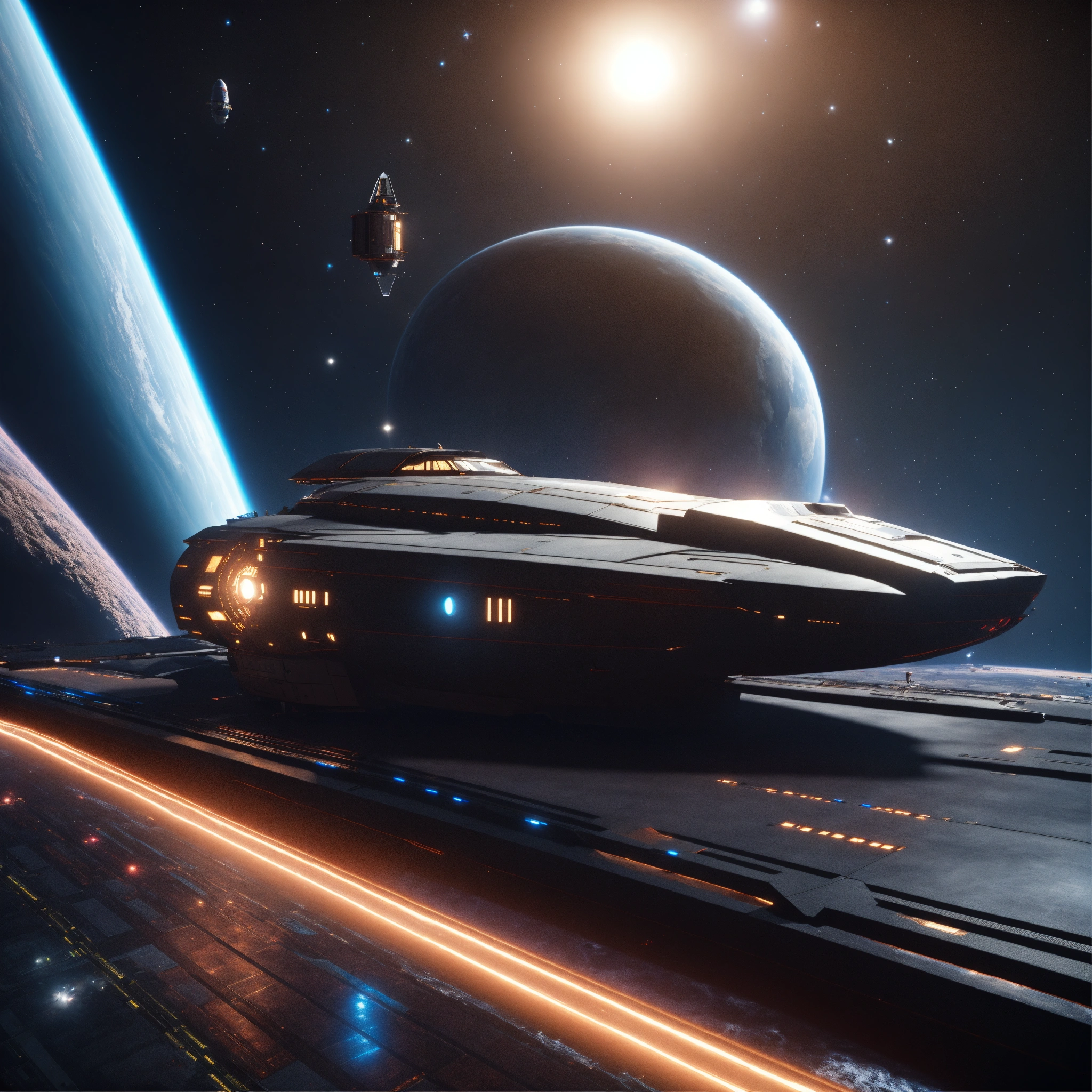 Small dark alien speeder docked in space on a space port star dock