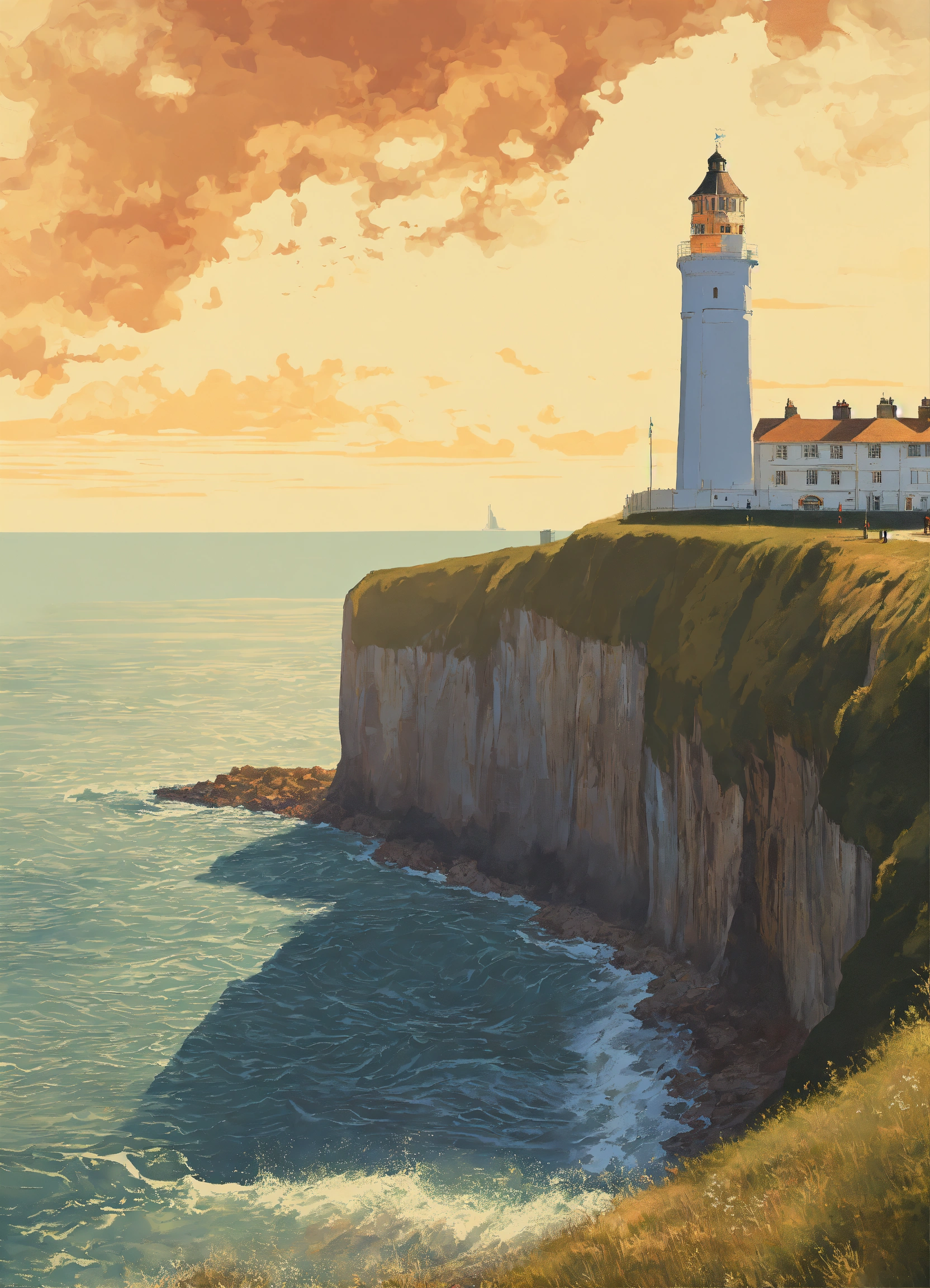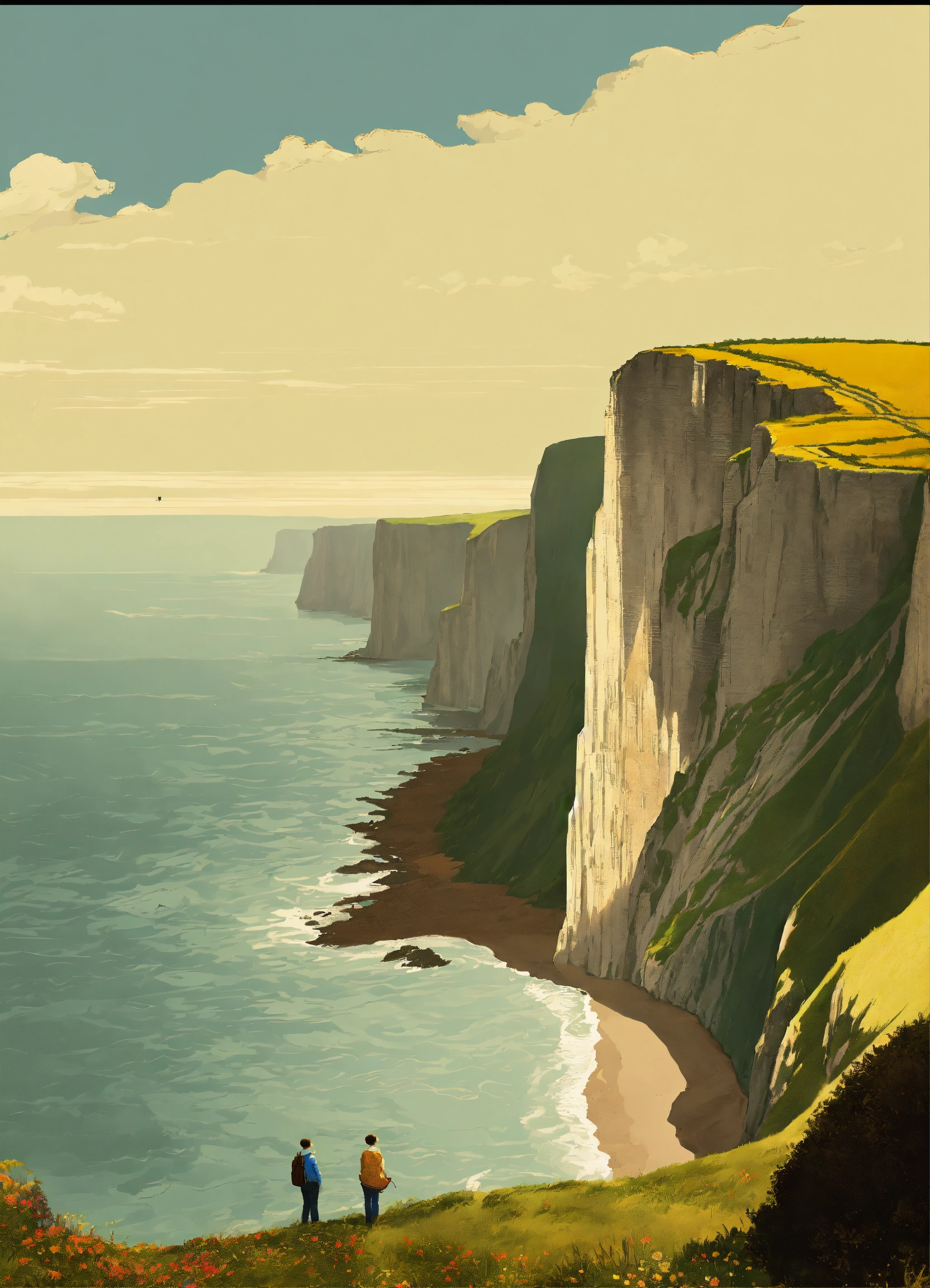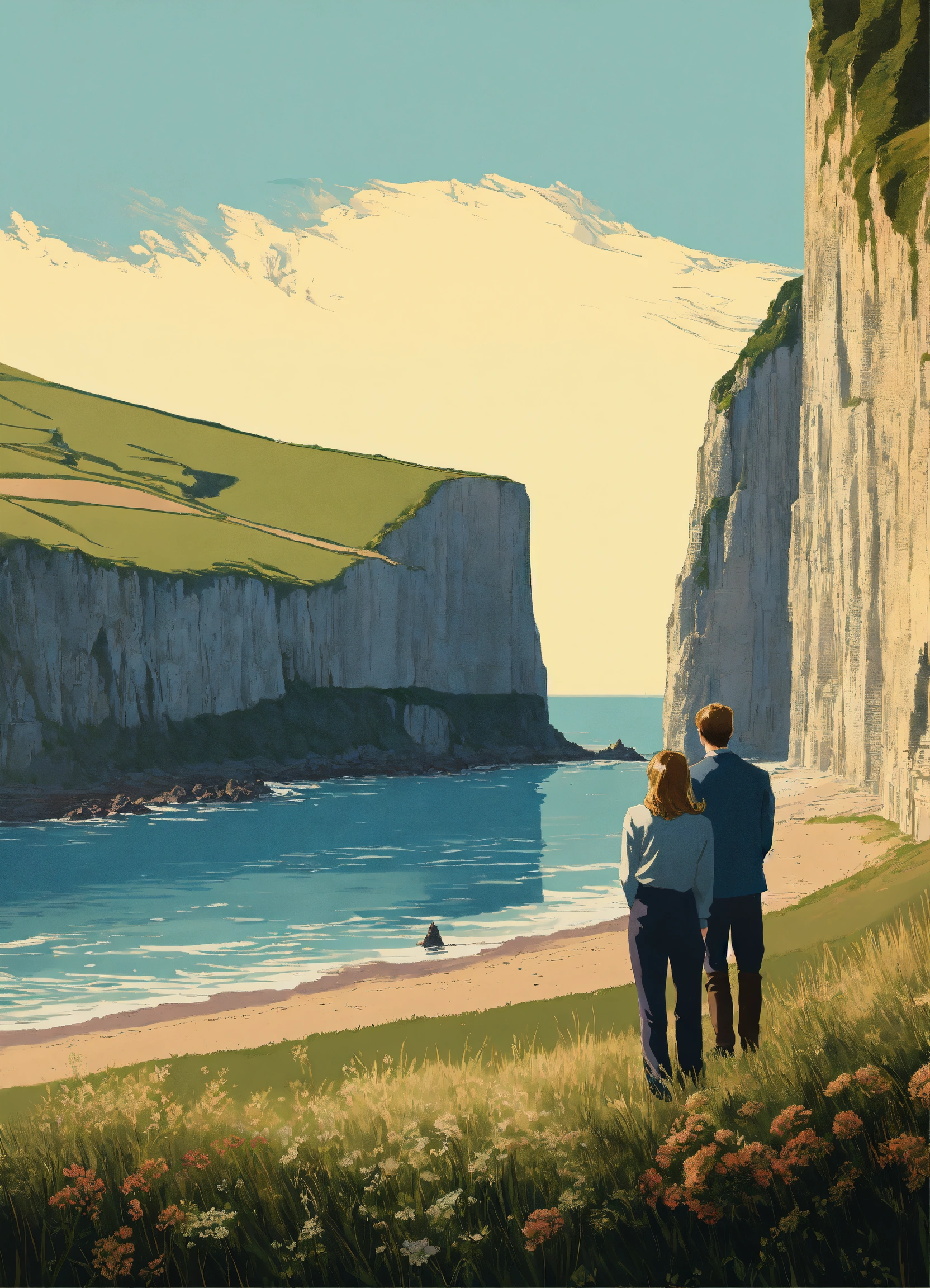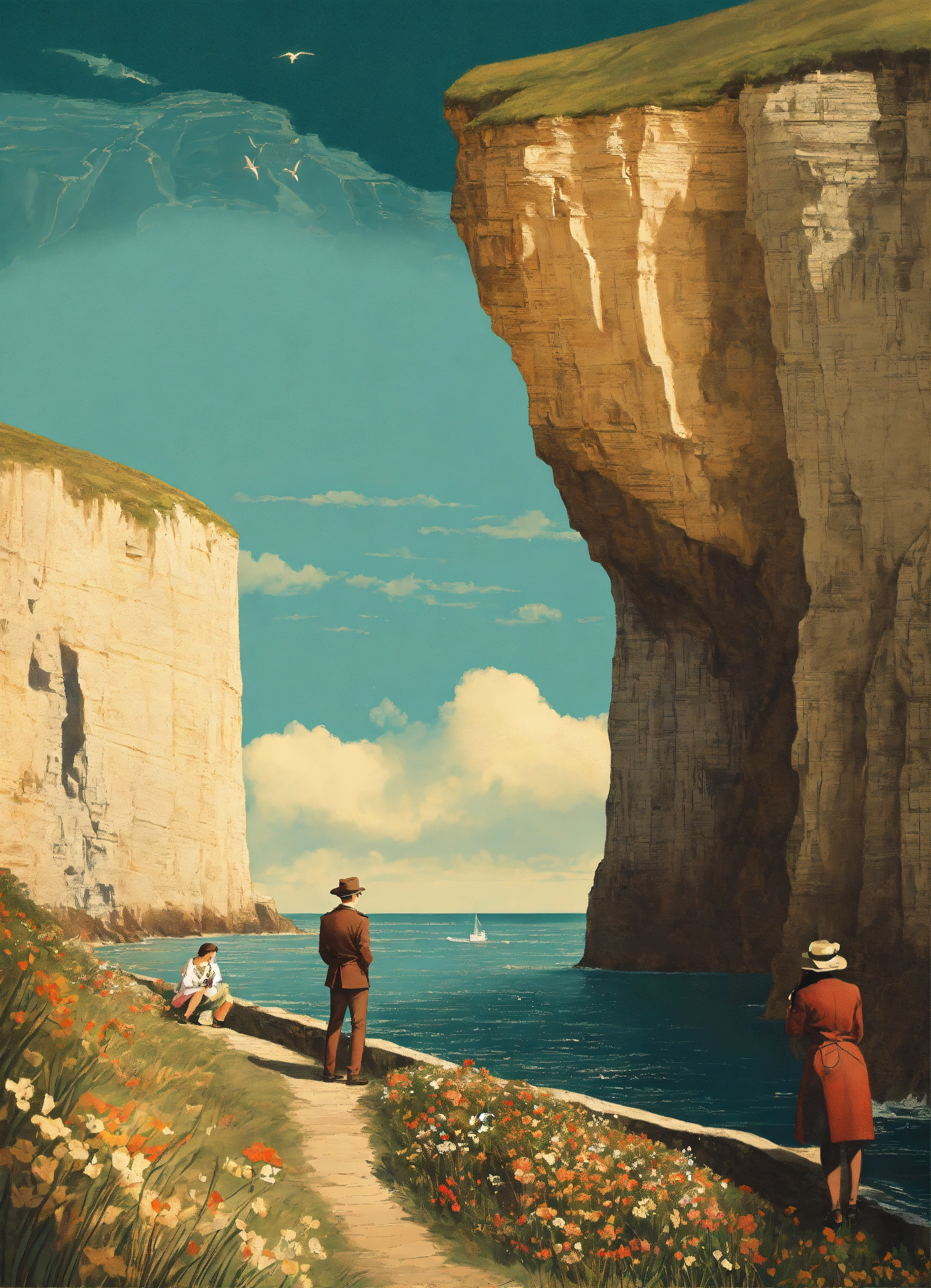 Create a captivating background, cliffs of dover in the background. vintage poster paint book cover style design, with shadows and effect that gives the design captivating, super detailed, extremely detailed, detailed hands, whole body, with the cliffs of dover in their background