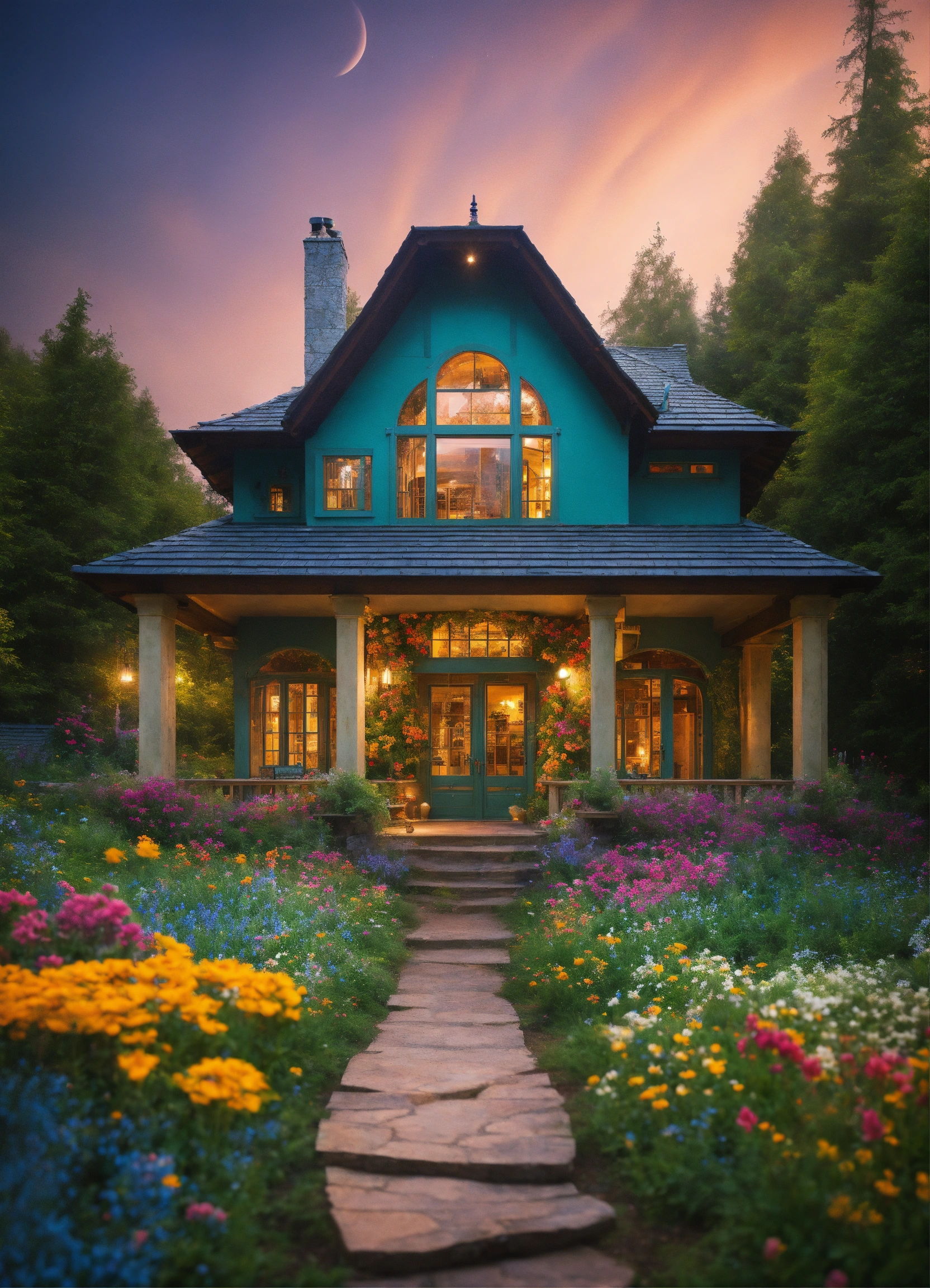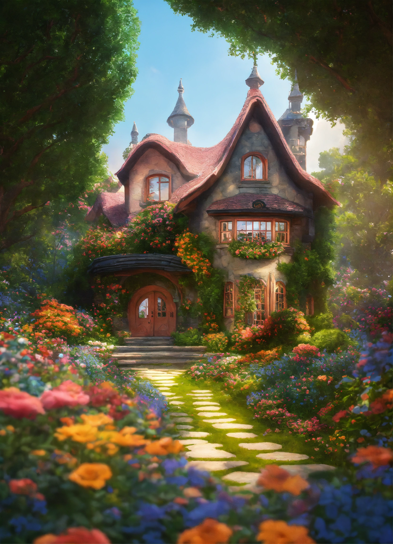 in enchanted forest. colorful flowers