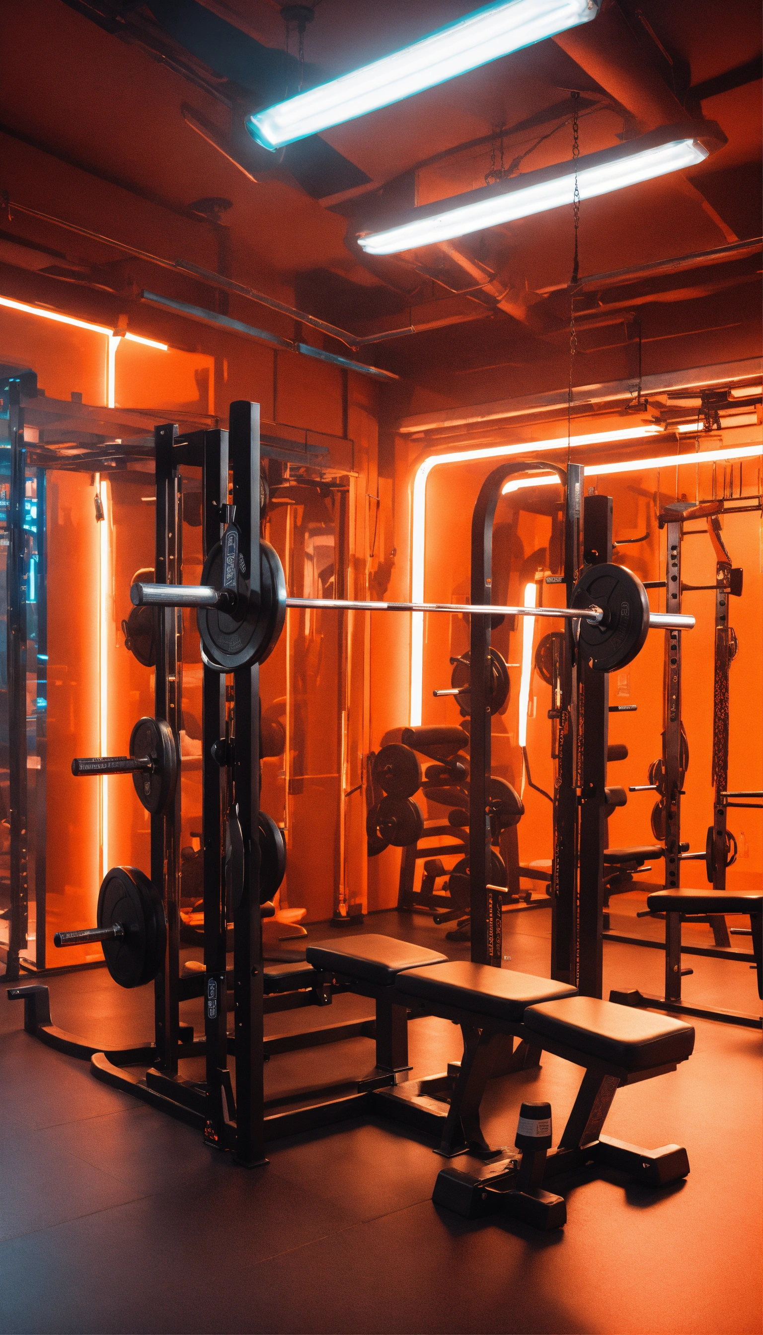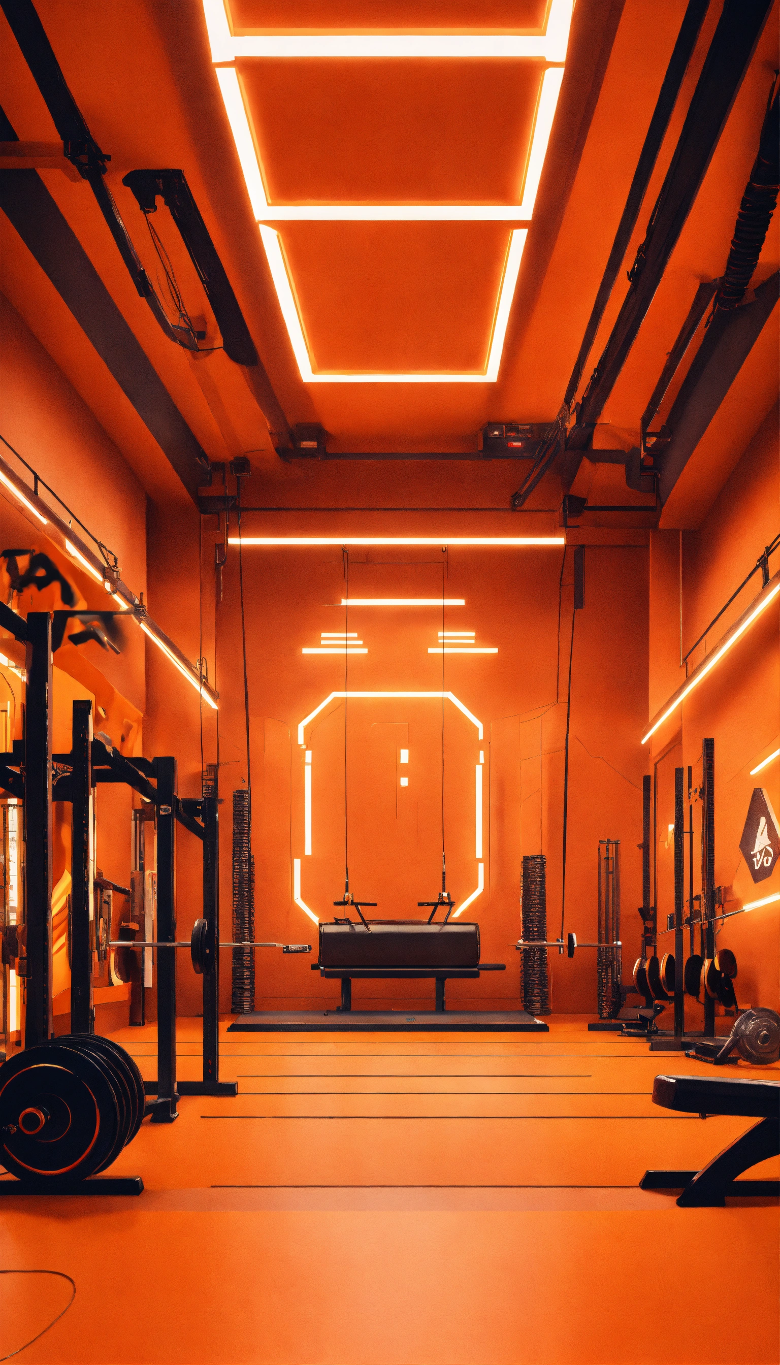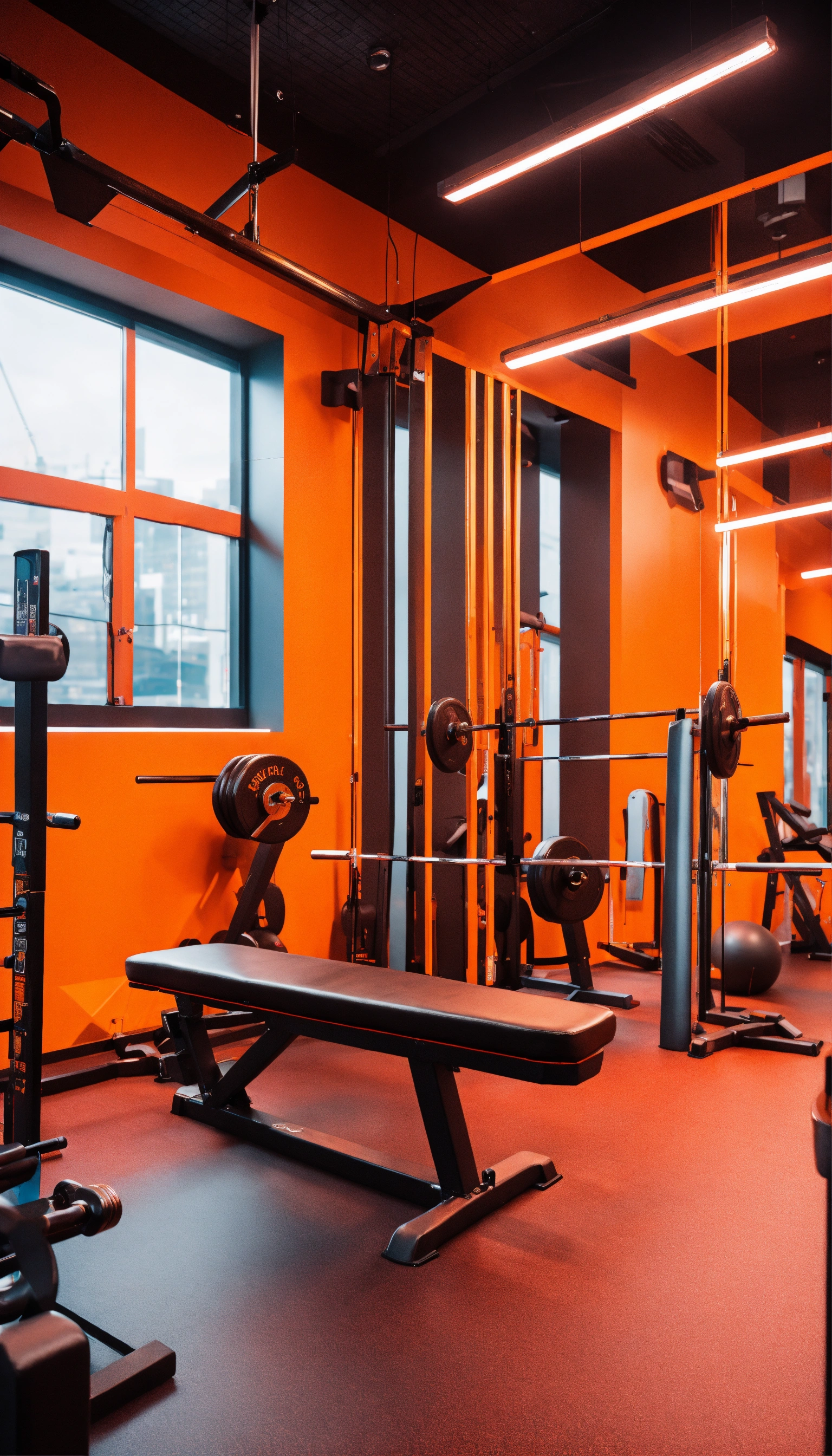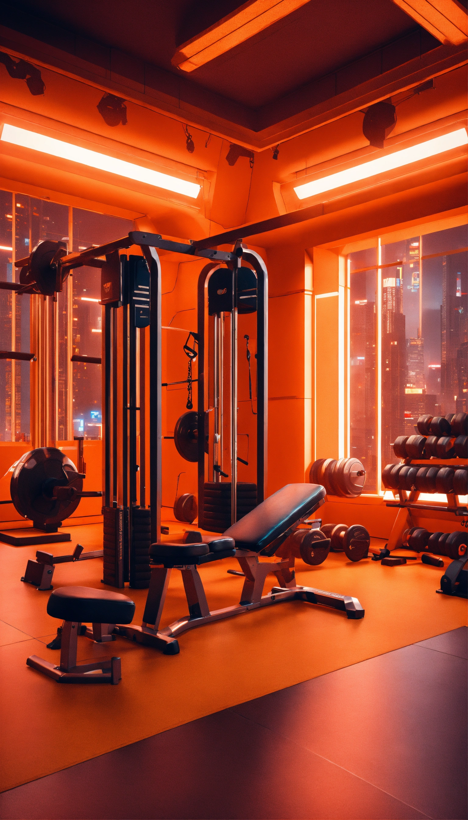 Gym interior with bench press in a cyberpunk futuristic orange setting