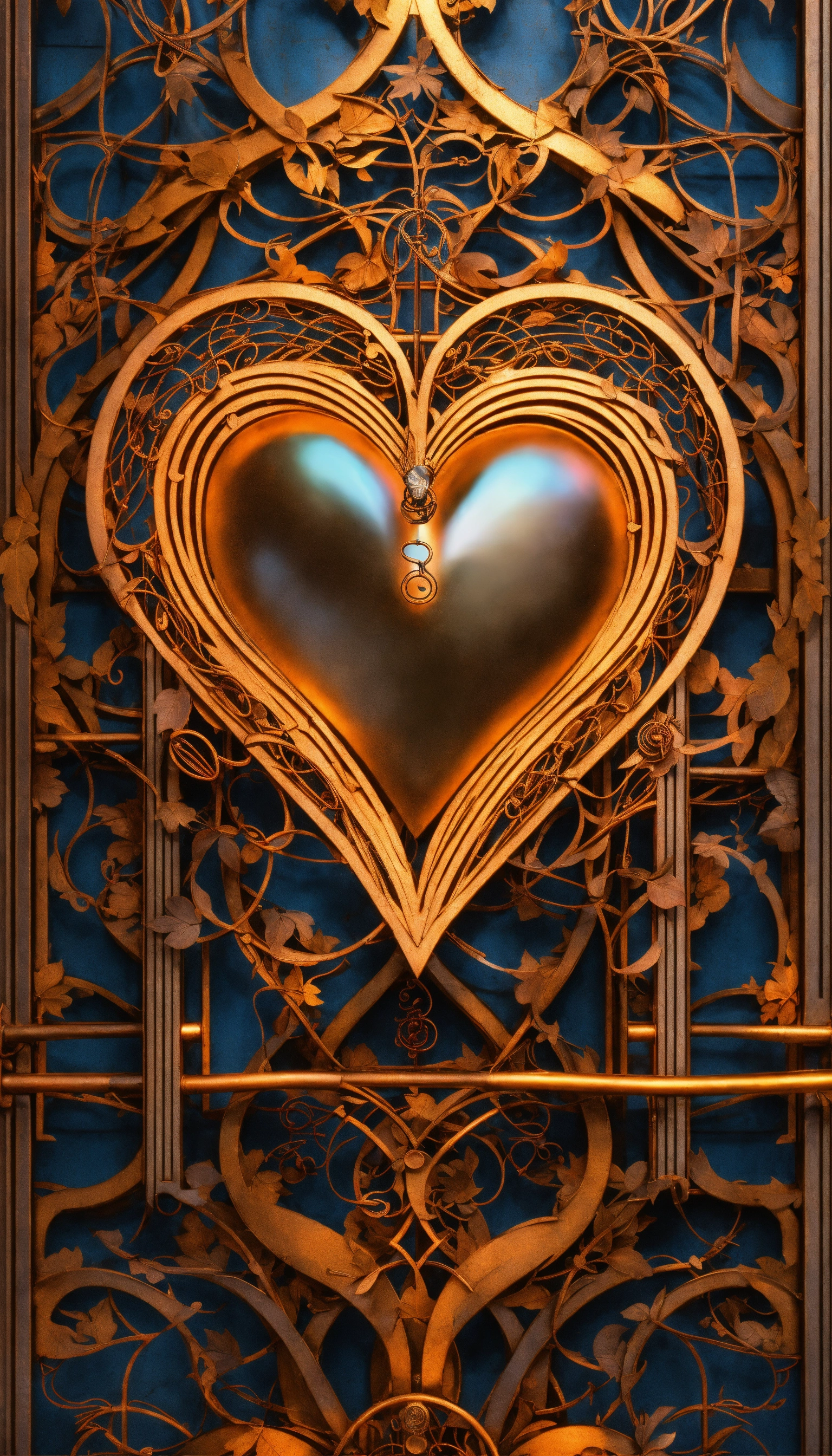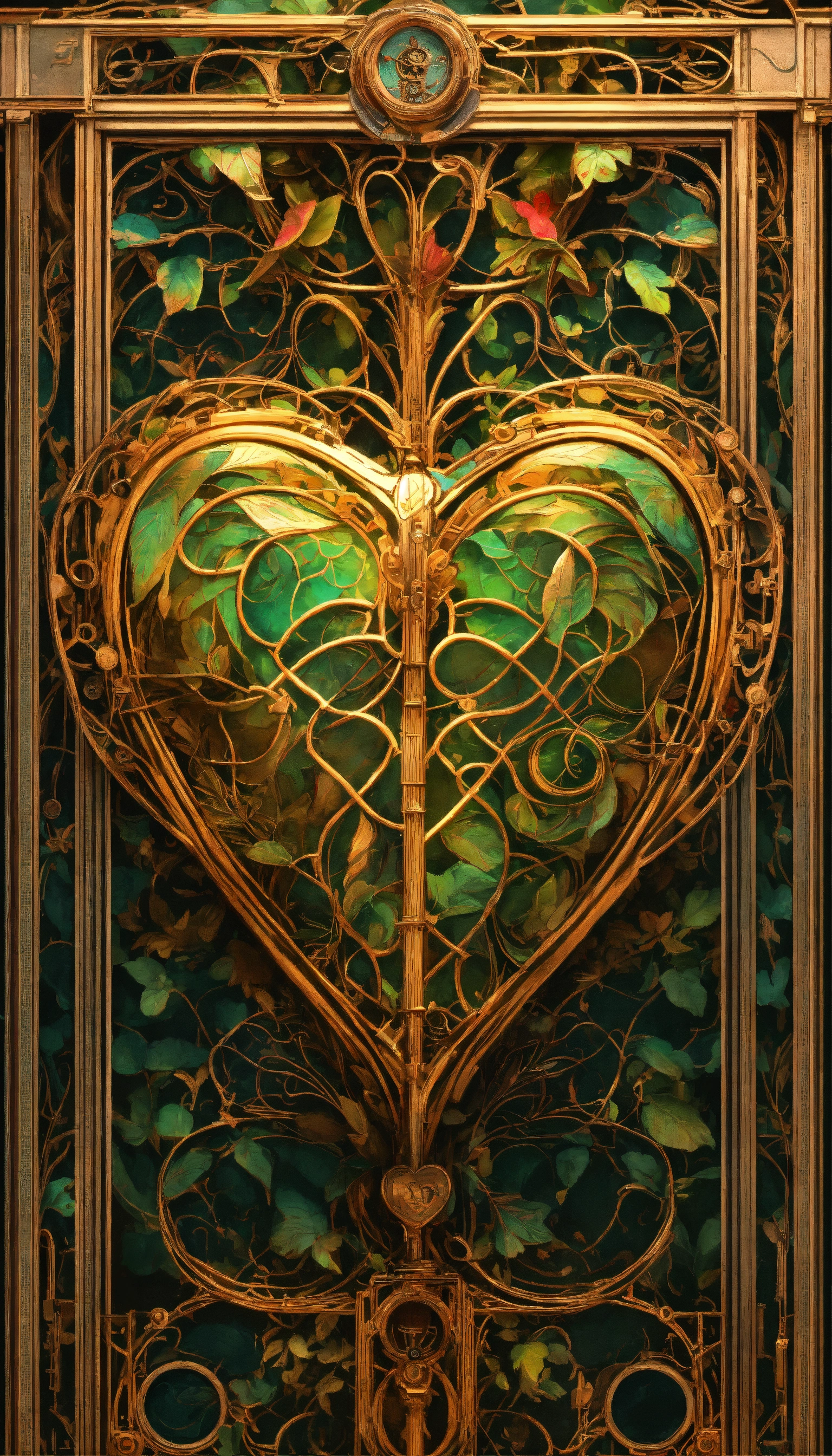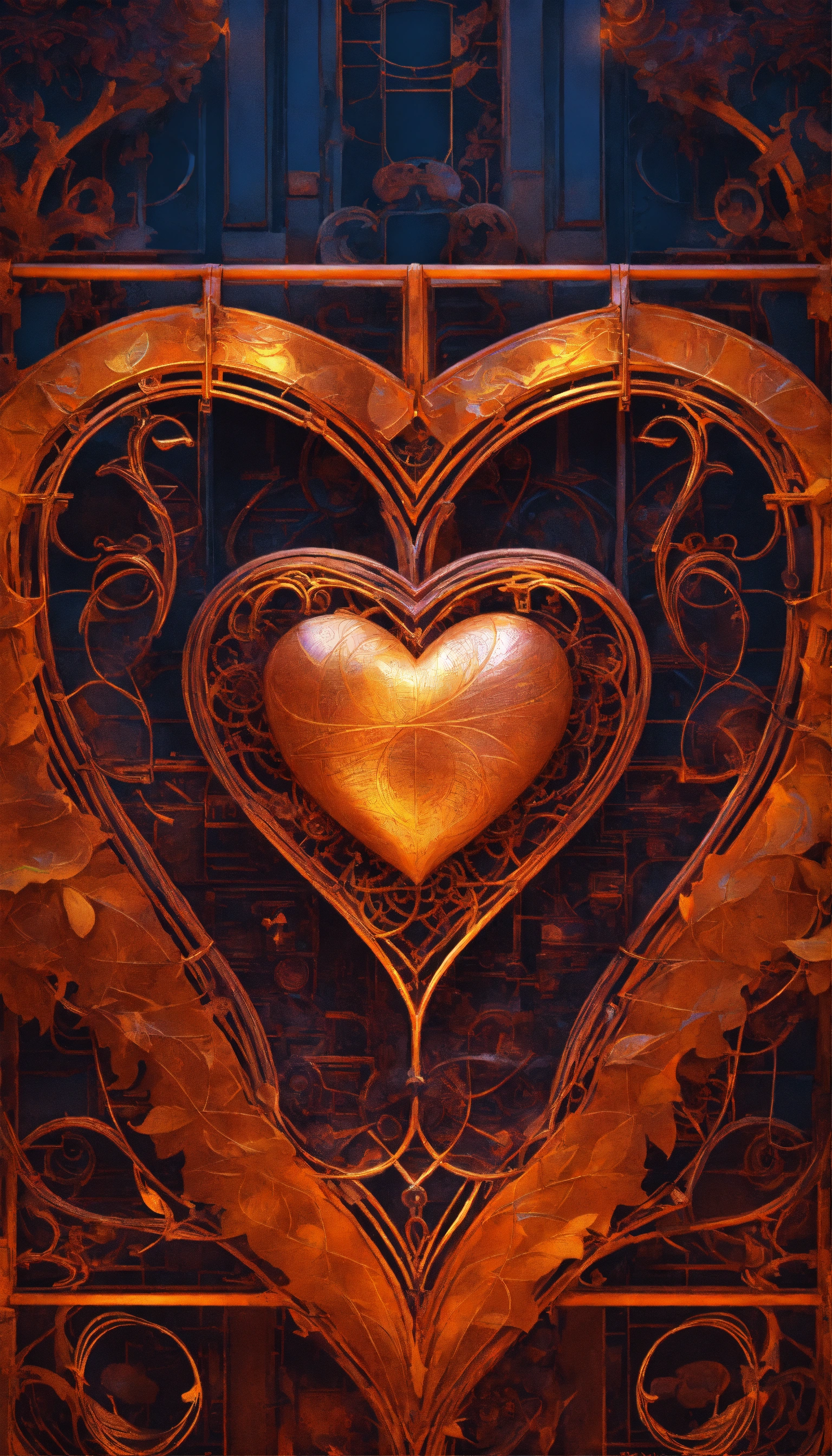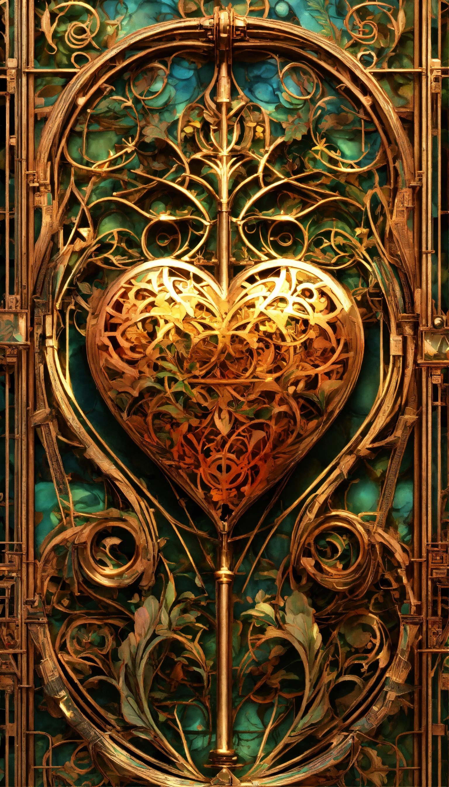 Front, realistc metal, heart, wire, realist ornamental, realist music symbol, g clef upright by the gates of heaven, grid, steampunk by walter crane and william morris, closeup, twisting leaves, realistc tiny fine realist flowing lines, abstract psychedelic, 8 k, artstation, neon, front