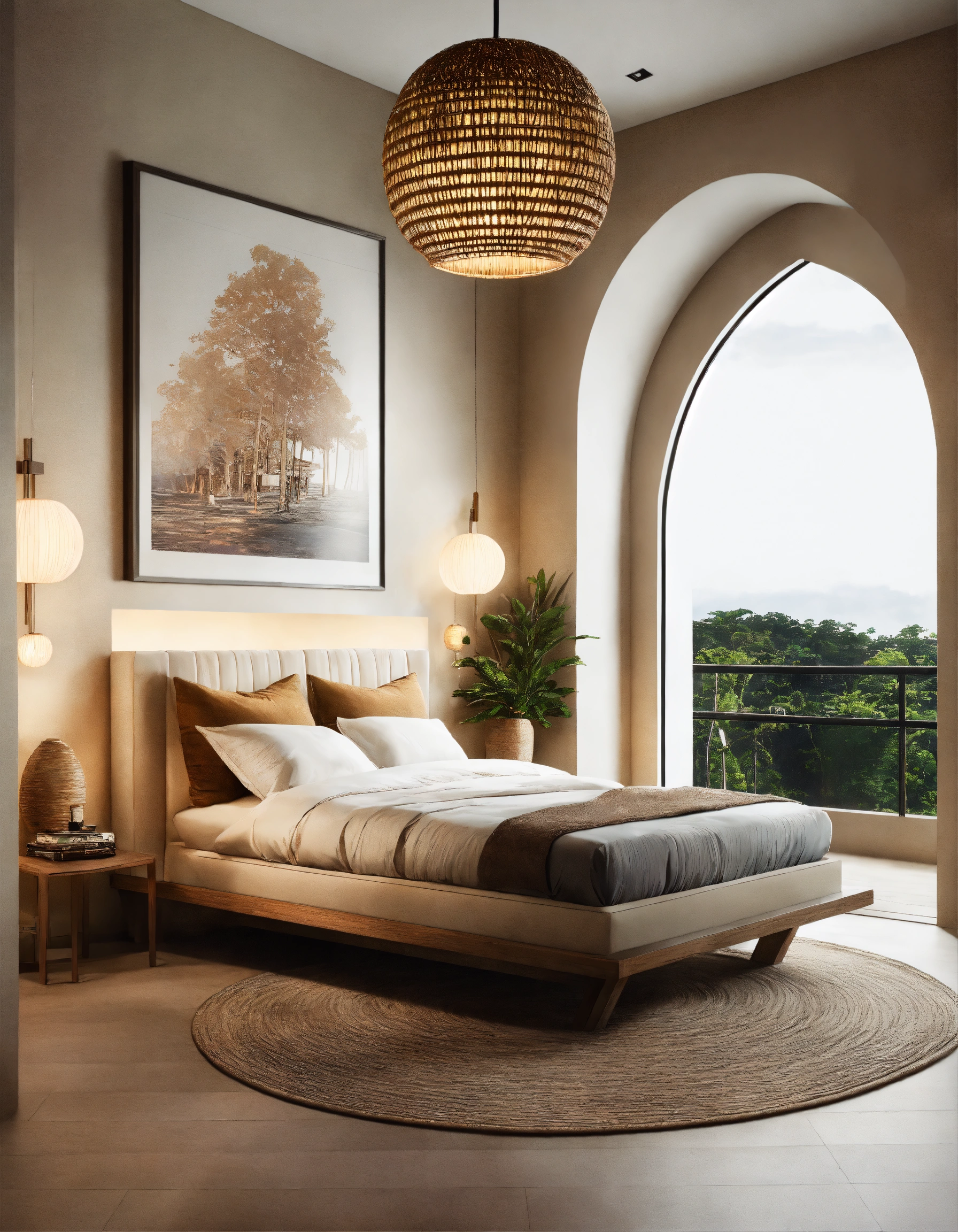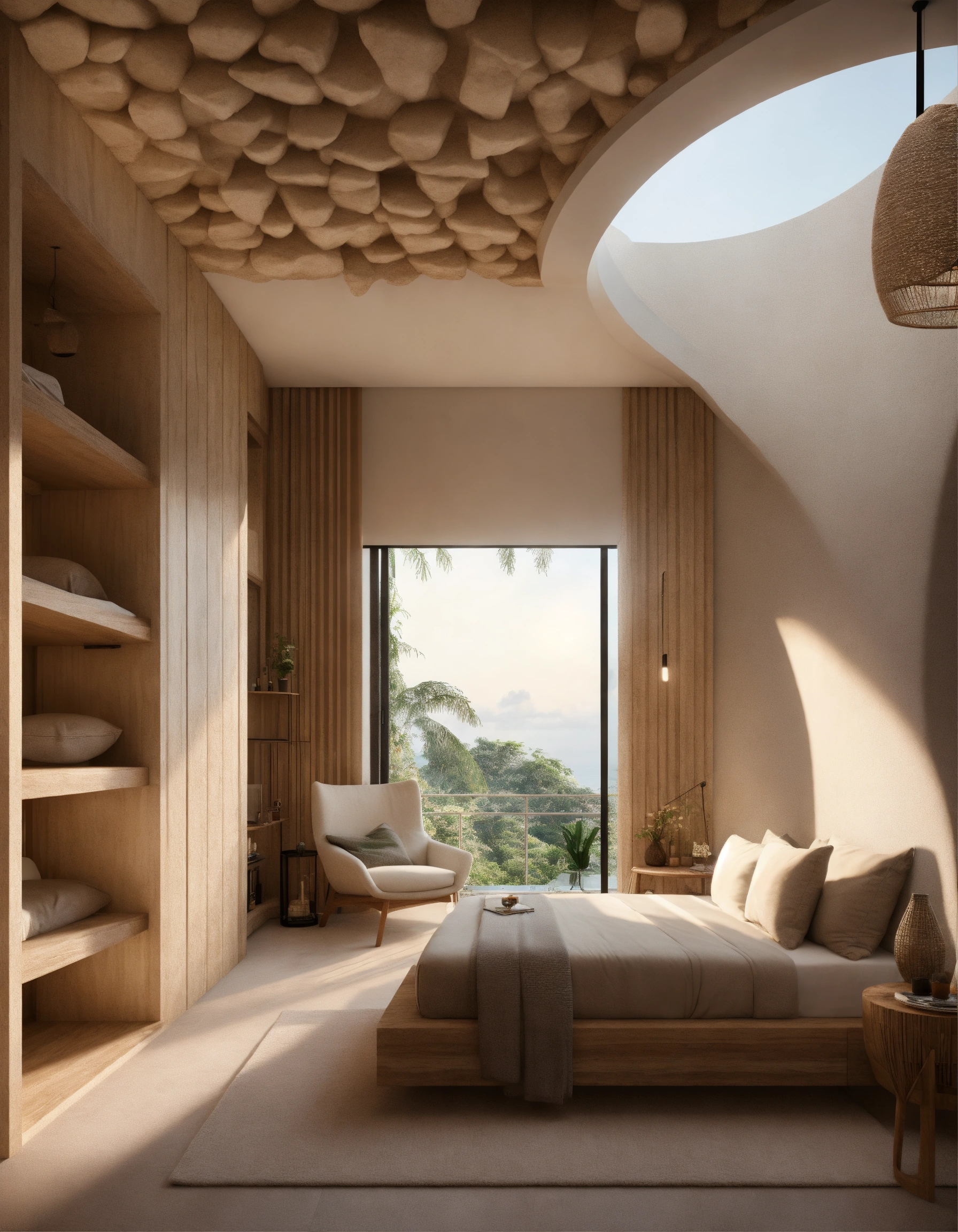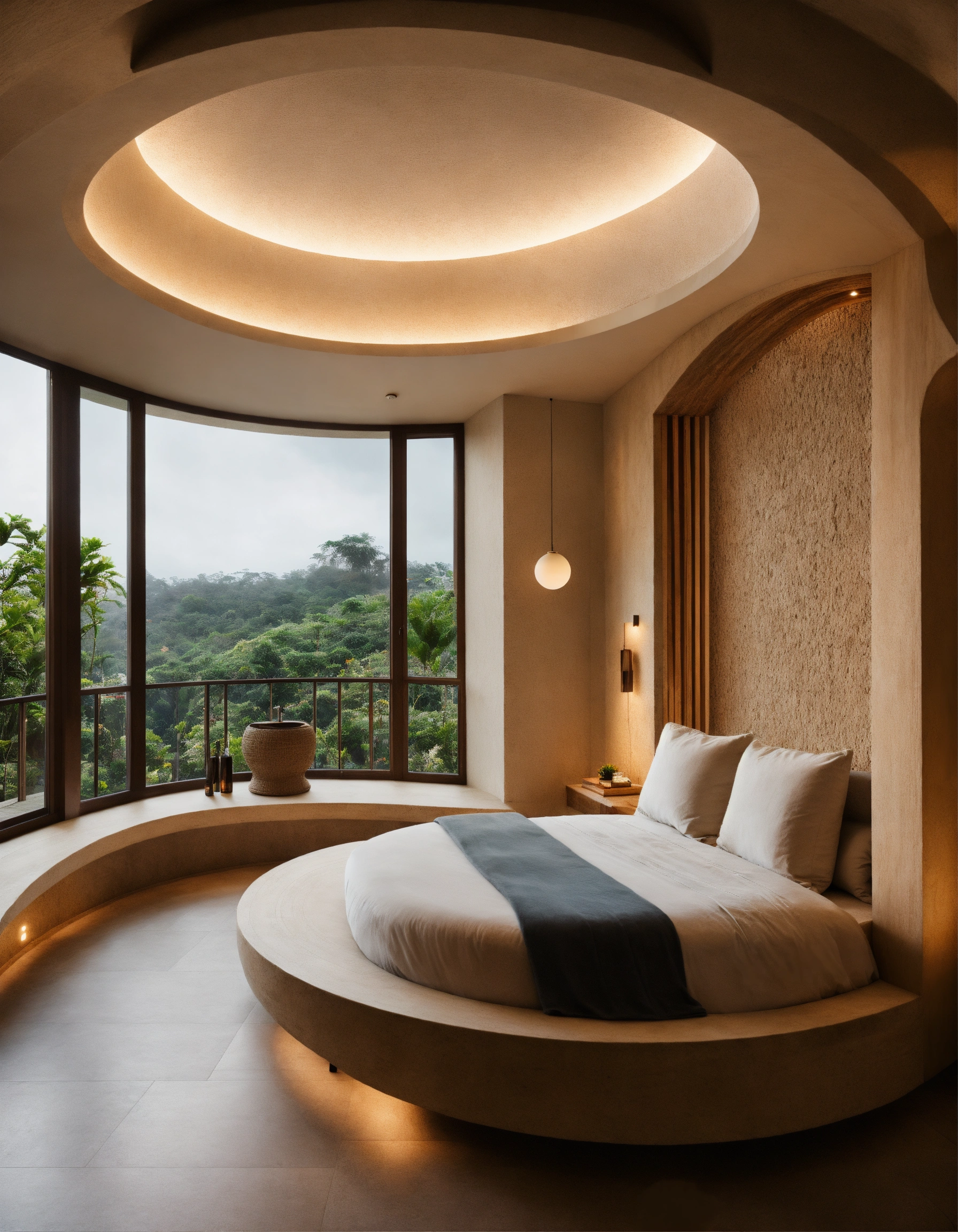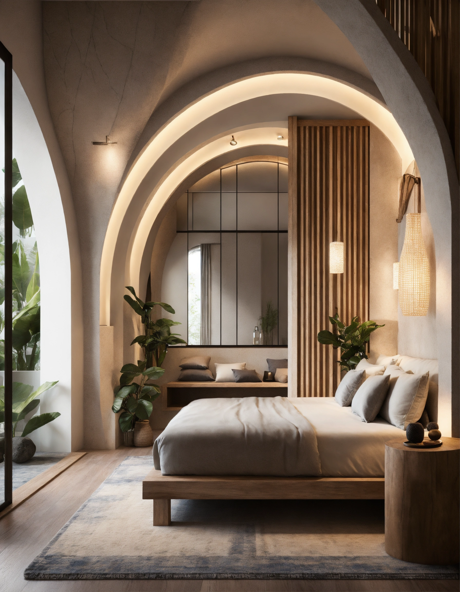 Ultra realistic photo of modern take on bali inspired small condo white cream stone, light wood round arches interor view of dark bedroom
