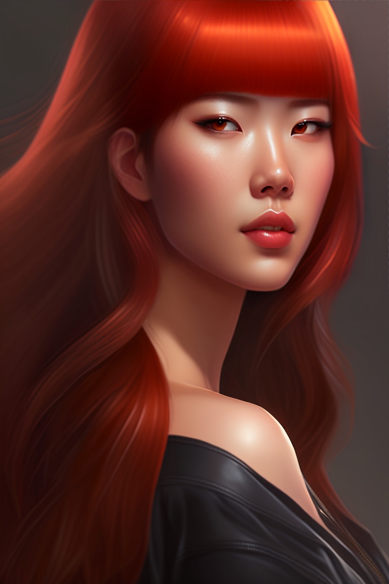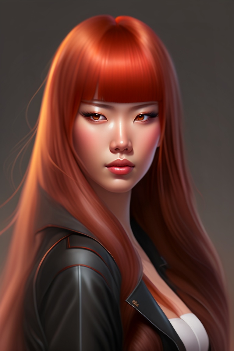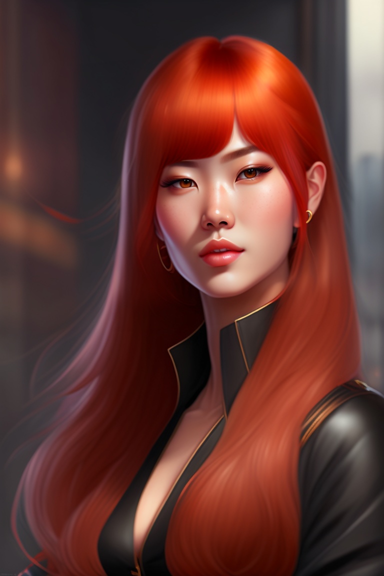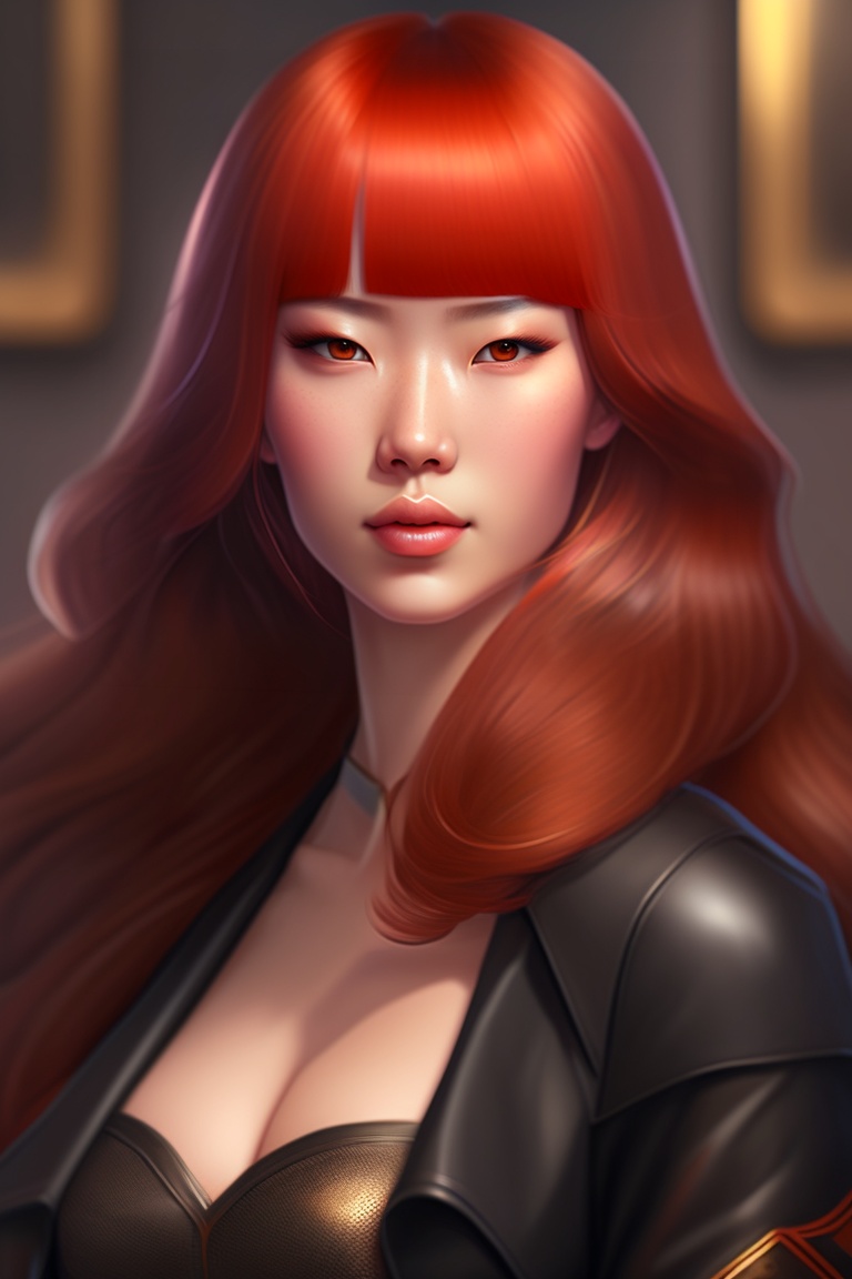 Realistic art, beautiful woman, red hair, ginger hair, asian eyes, monolids eyes, bangs, oval face, straight hair, brow eyes, black clothes, toys