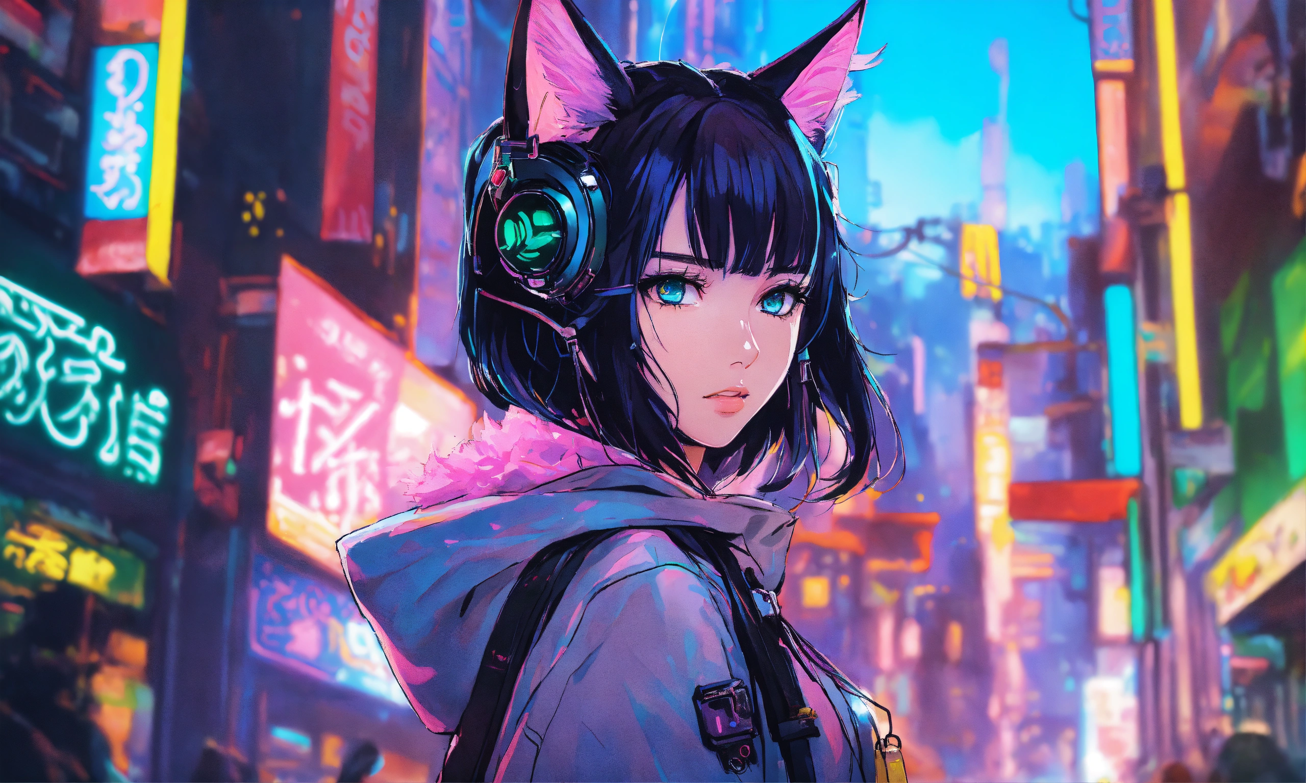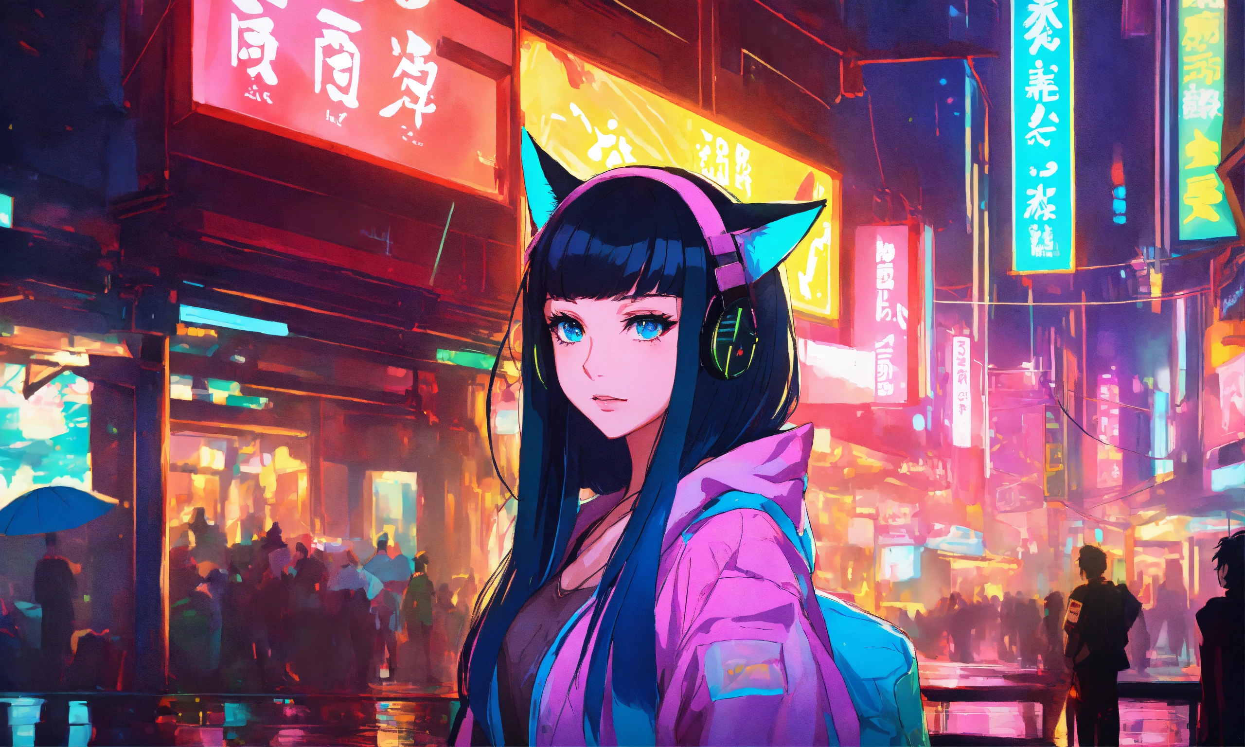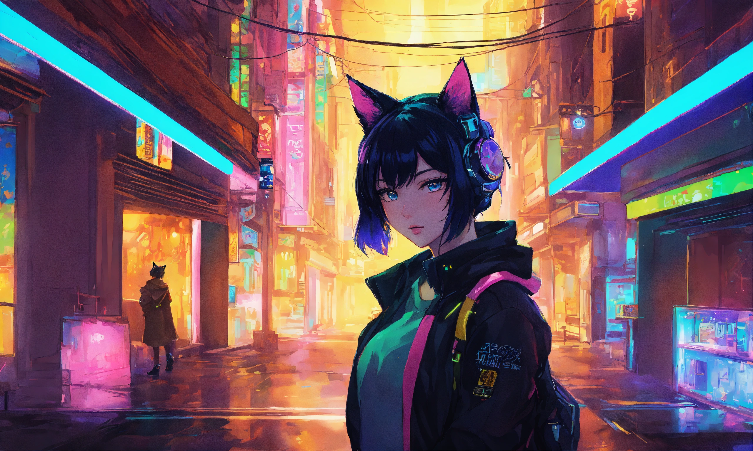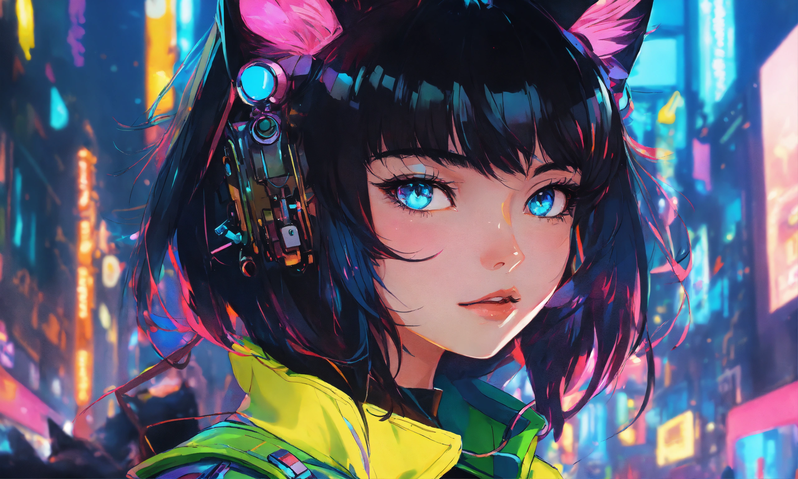 In a detailed anime style with beautiful, exquisite artwork, illuminate a scene featuring a cat-eared girl with black hair and blue eyes. use dazzling shadows, bold colors, and candy cotton pastel tones. the background should encompass a cyberpunk theme, lit with yellow and green lights.
