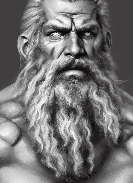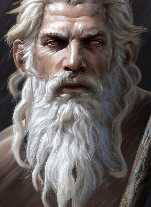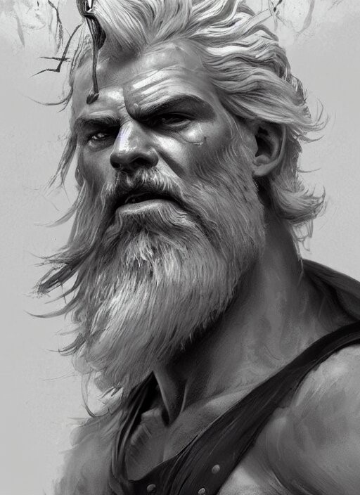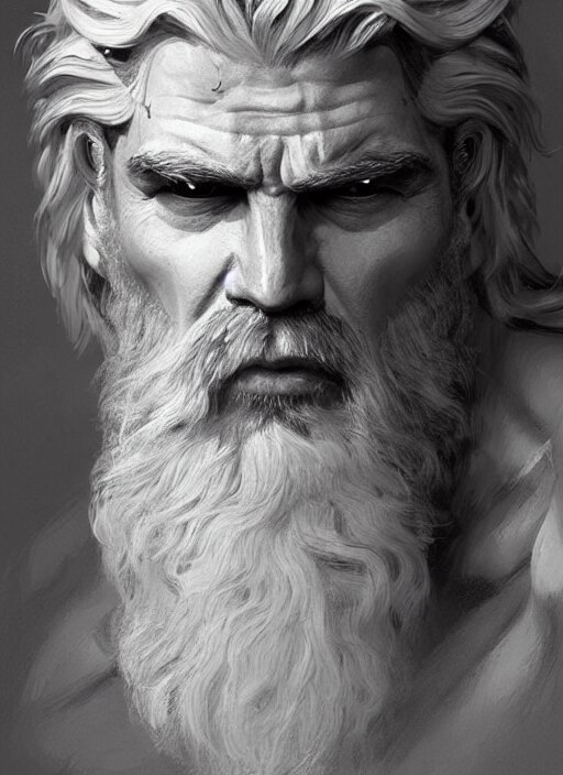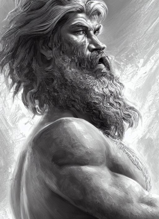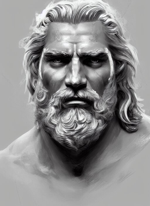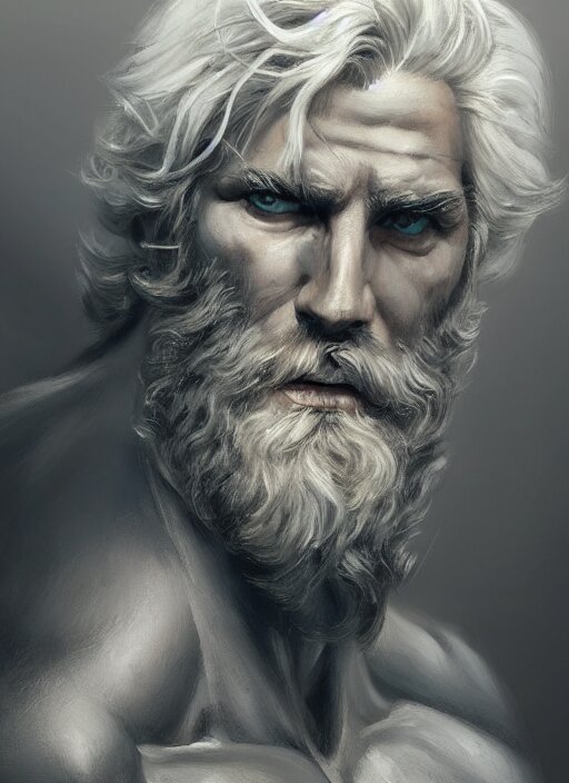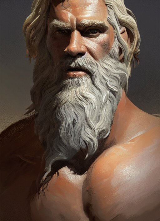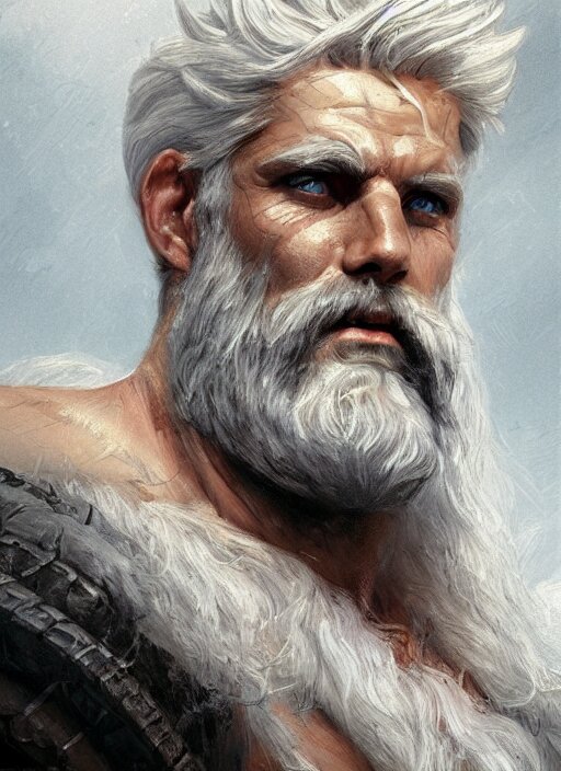 Painted portrait of rugged zeus, god of thunder, greek god, white hair, masculine, mature, handsome, upper body, muscular, hairy torso, fantasy, intricate, elegant, highly detailed, digital painting, artstation, concept art, smooth, sharp focus, illustration, art by gaston bussiere and craig mullins