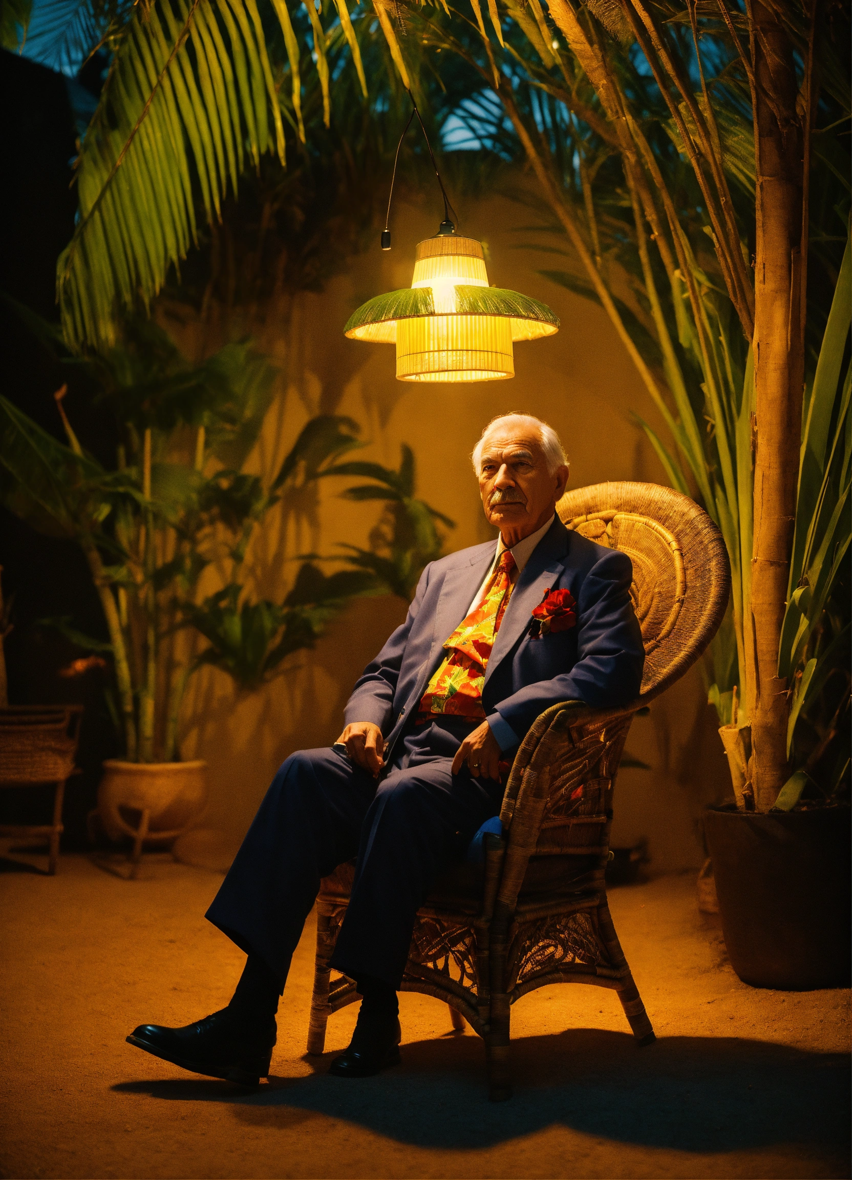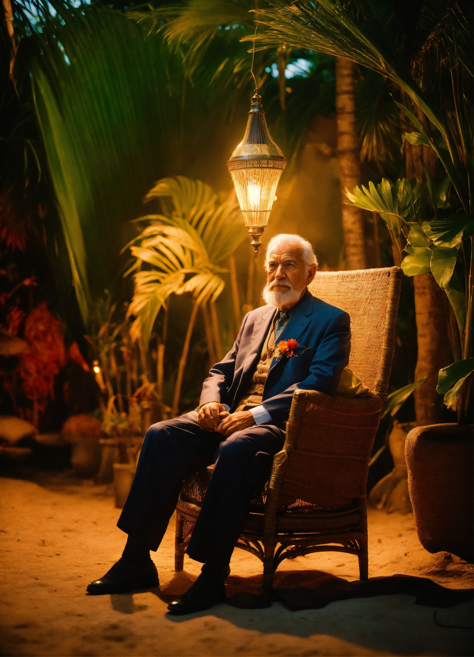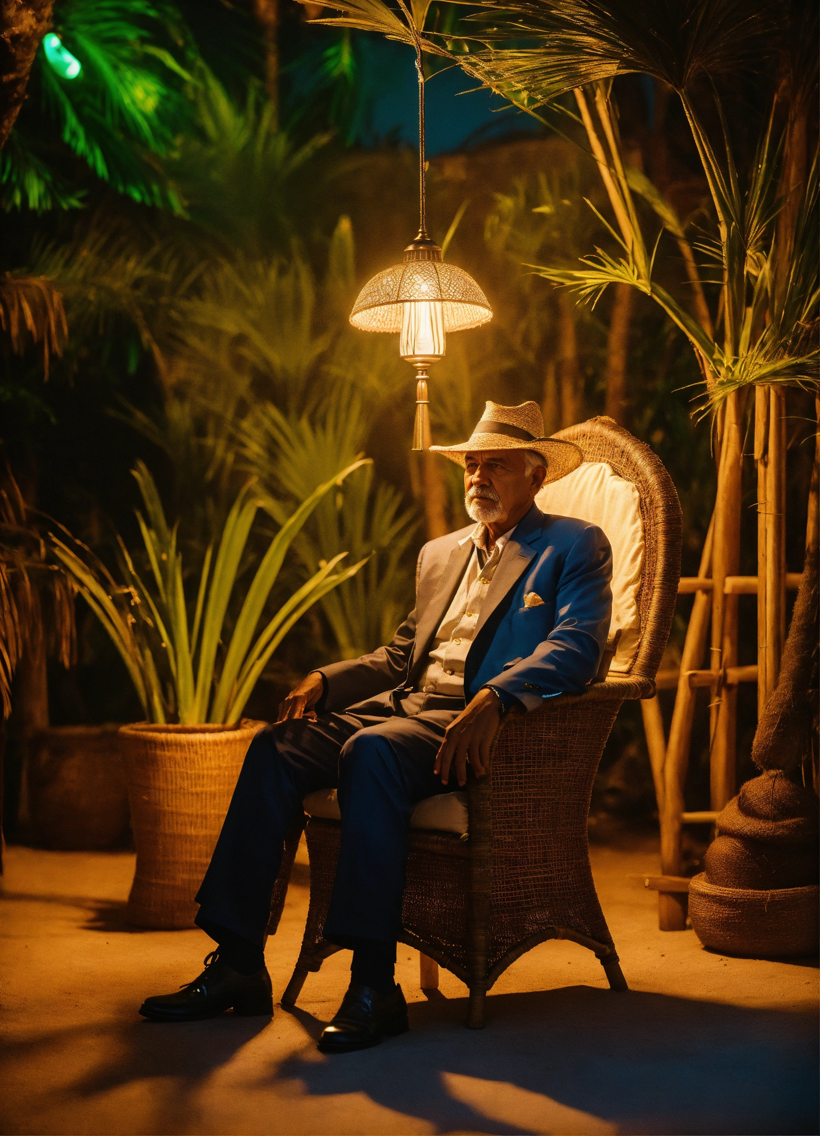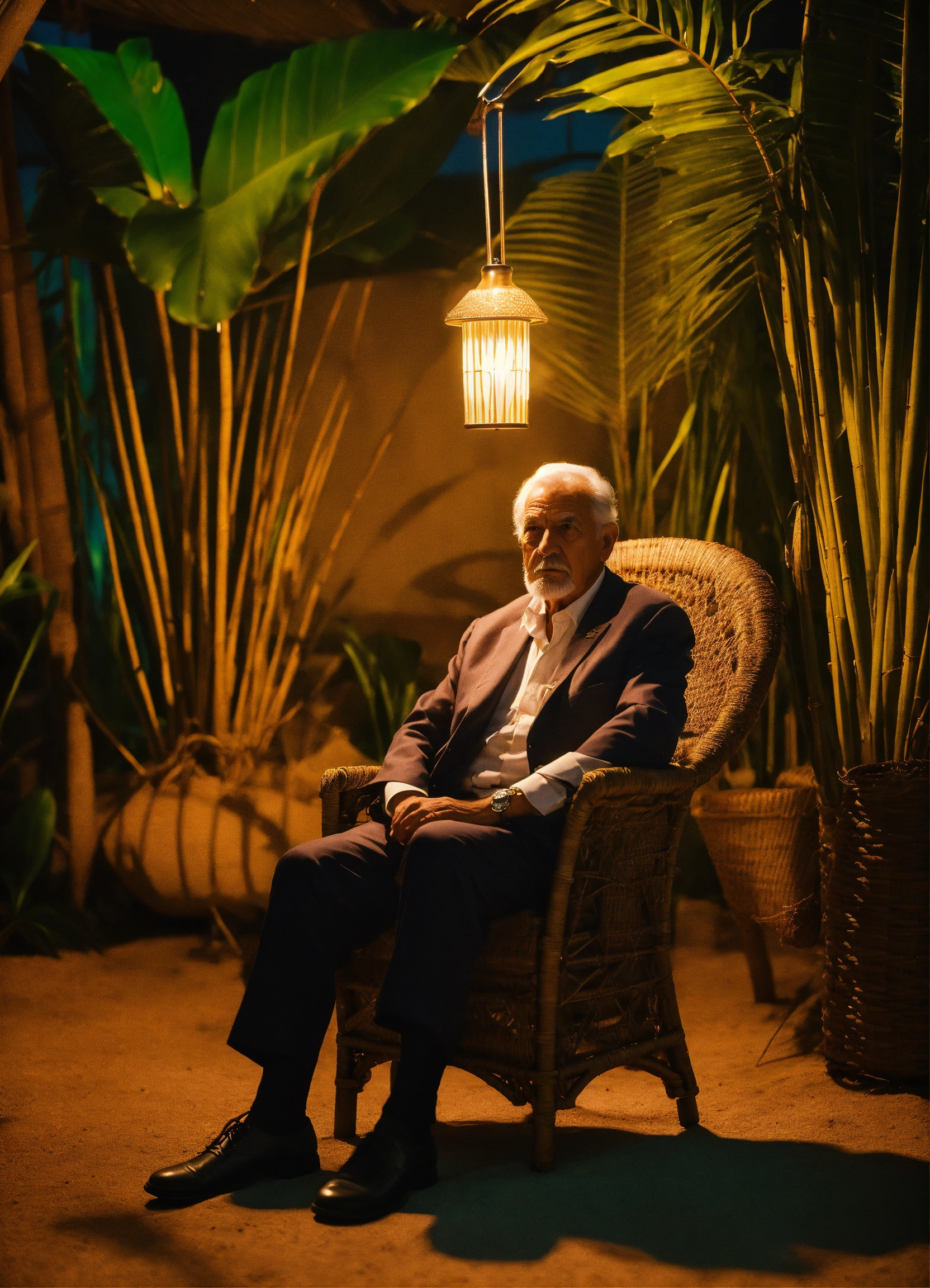 A wise man with an élégant costume and in a tropical setting with a beautyfull lamp in hand, sitting on a straw chair, shot on hasselblad, shadowplay, medium shot, élégant, look empathy, looking camera