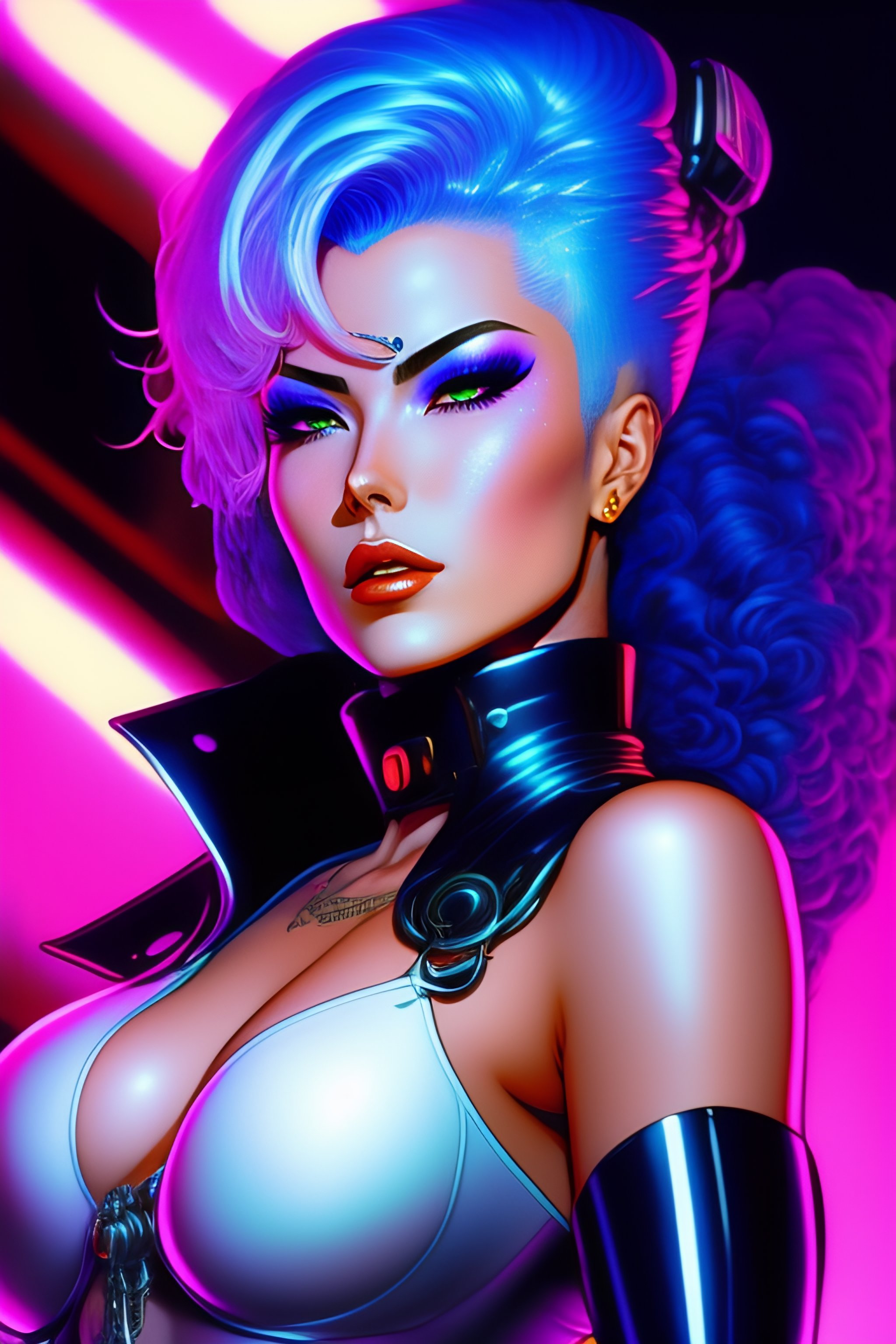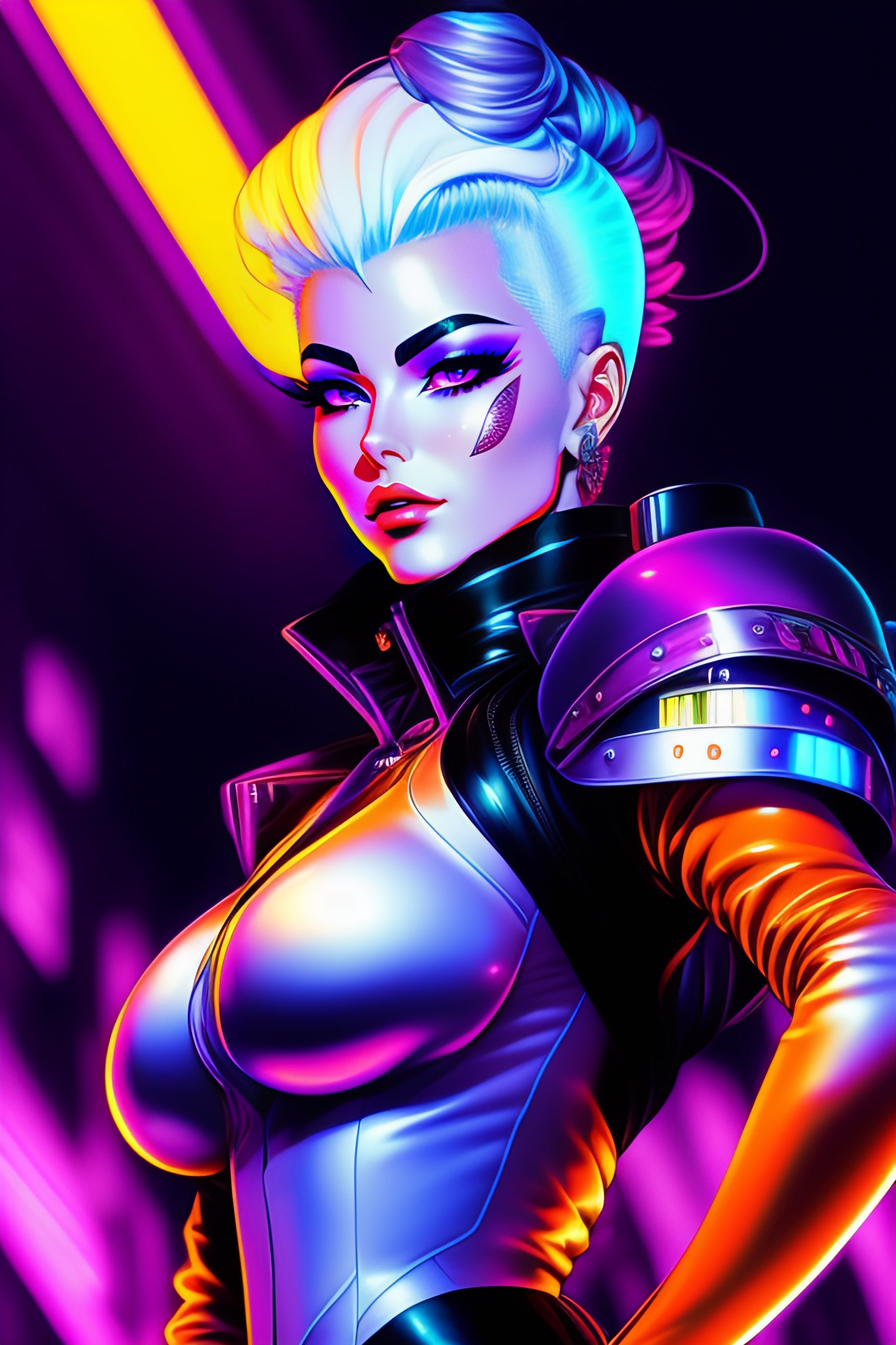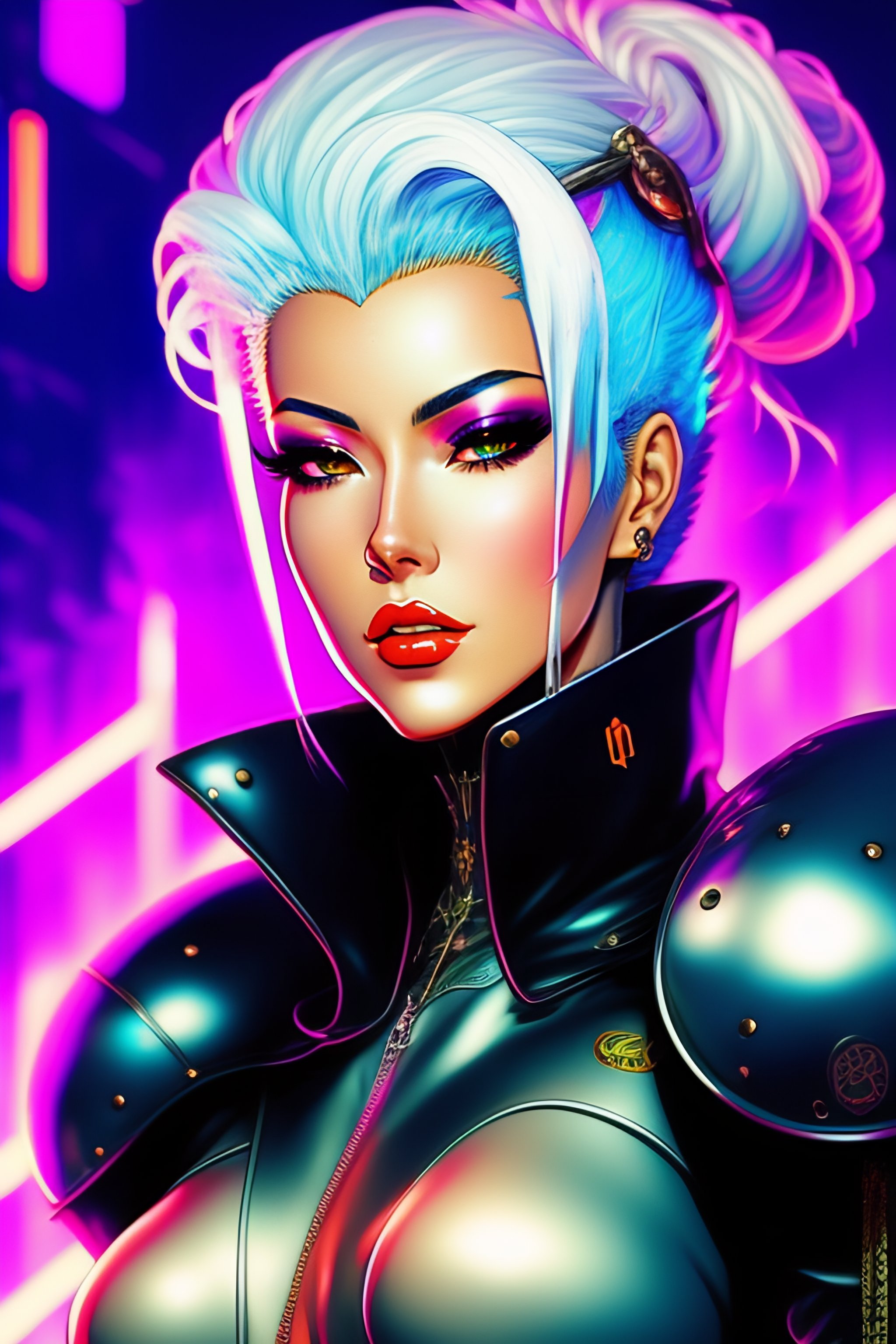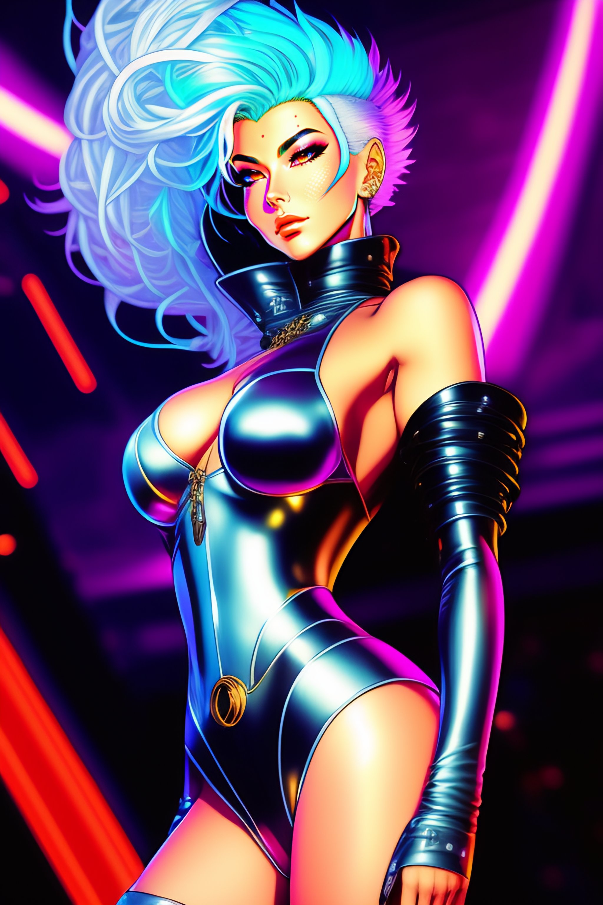 Vintage 90's anime style. woman wearing latex in cyberpunk with white hair; by hajime sorayama, greg tocchini, virgil finlay, sci-fi, colors, neon lights