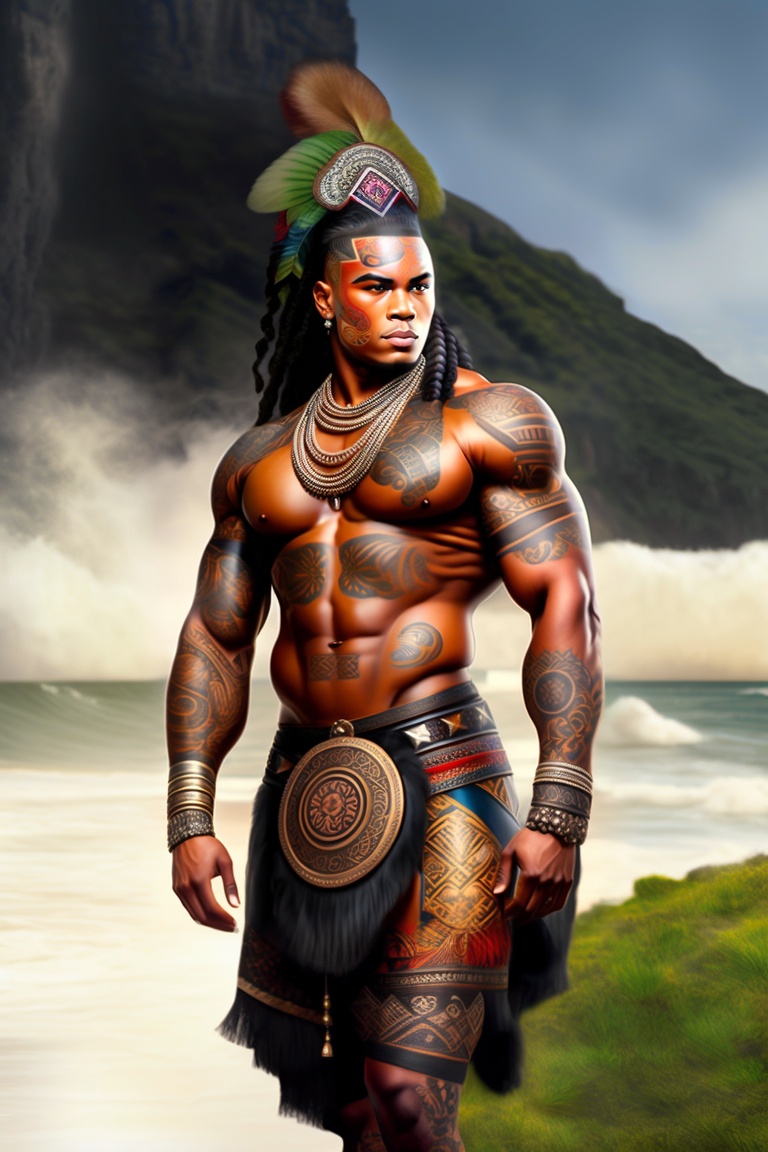 Tarot card detailed maori polynesian hawaiian papuan themed deco ornated. full body portrait maori, new zealand, haka, paupuan hawaiian, polynesian king emperor. heavily tattooed. face has heavy tattoos over eyes. full body view ornated background. face covered in maori tattoos otngue out