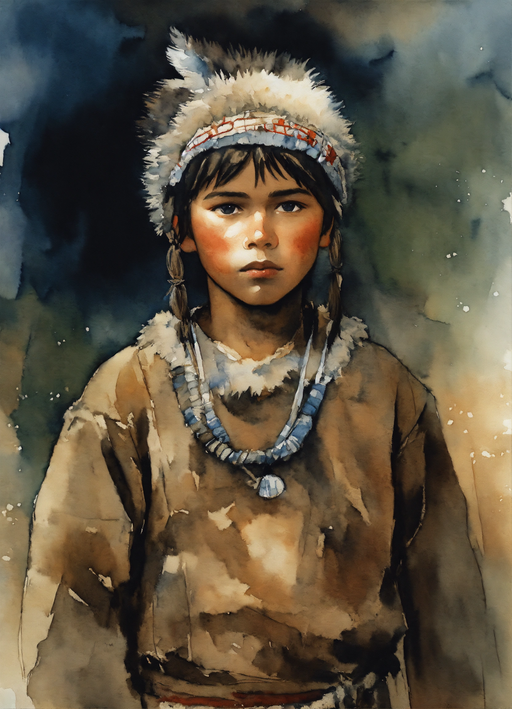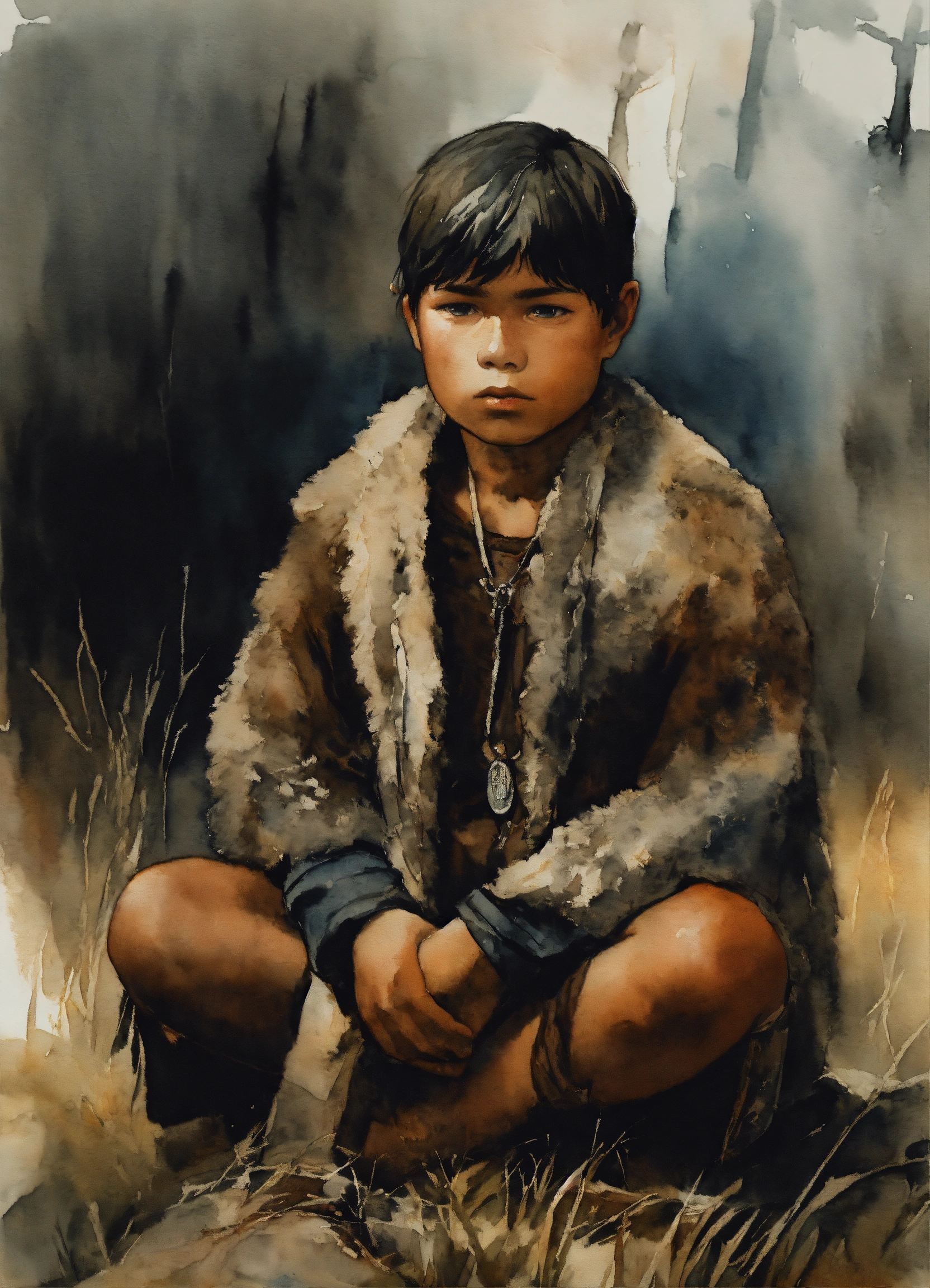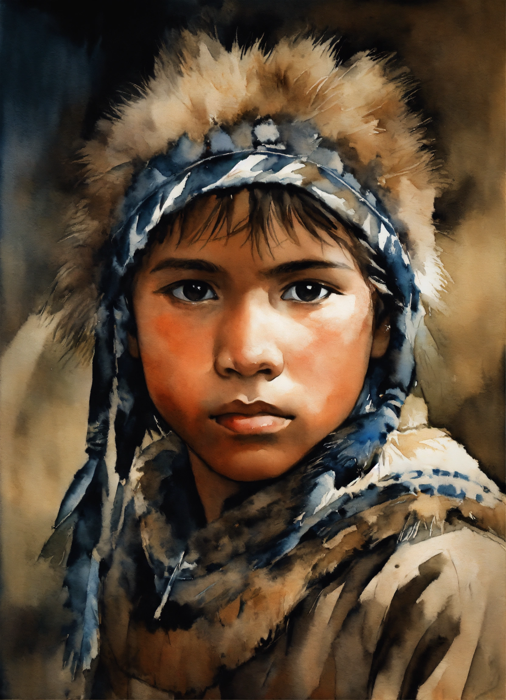 Illustration by tom björklund of a siberian "aboriginal" youth boy wearing arctic paleolithic clothing. watercolor painting by tom björklund, dark hues, gloomy and depressing, masterpiece.