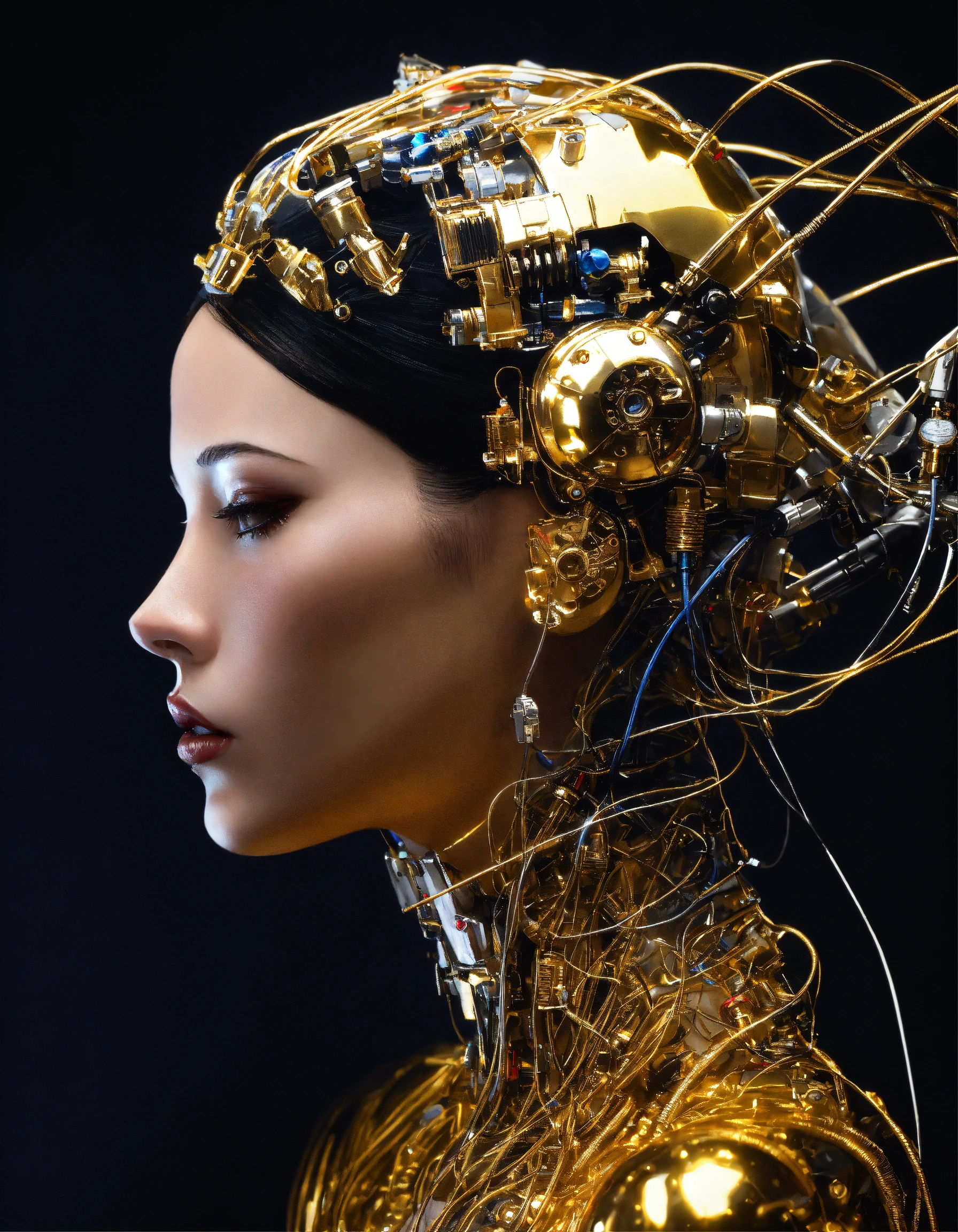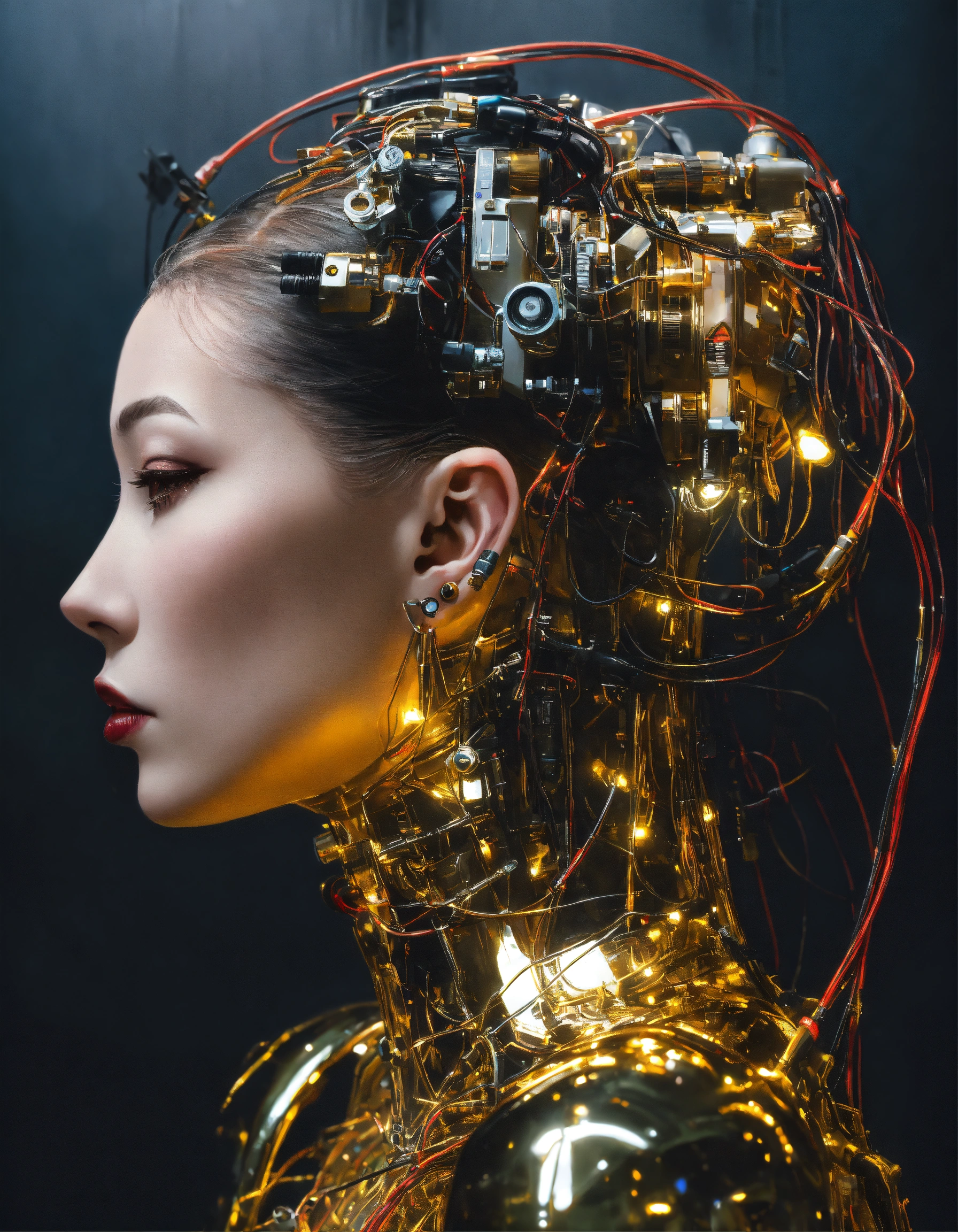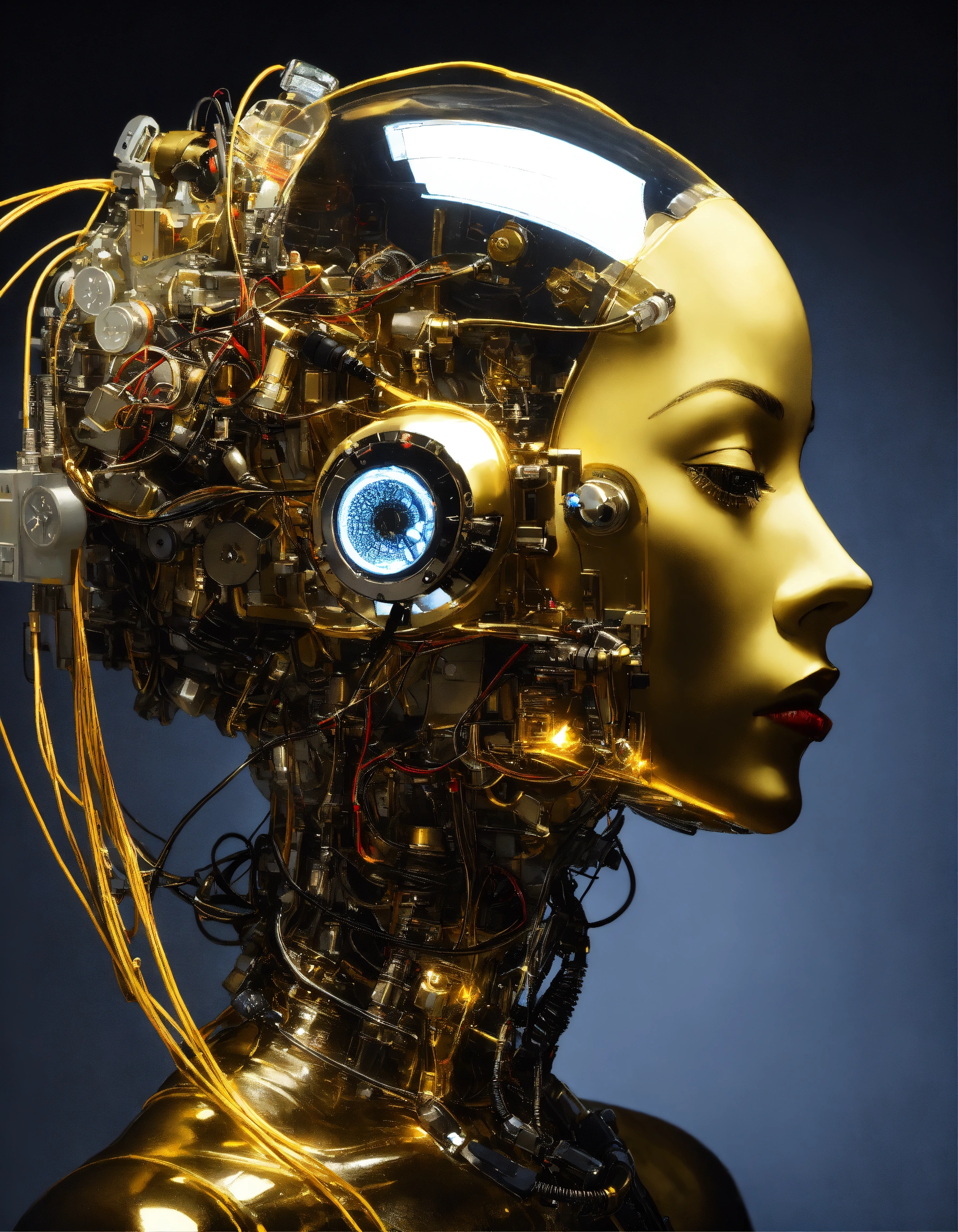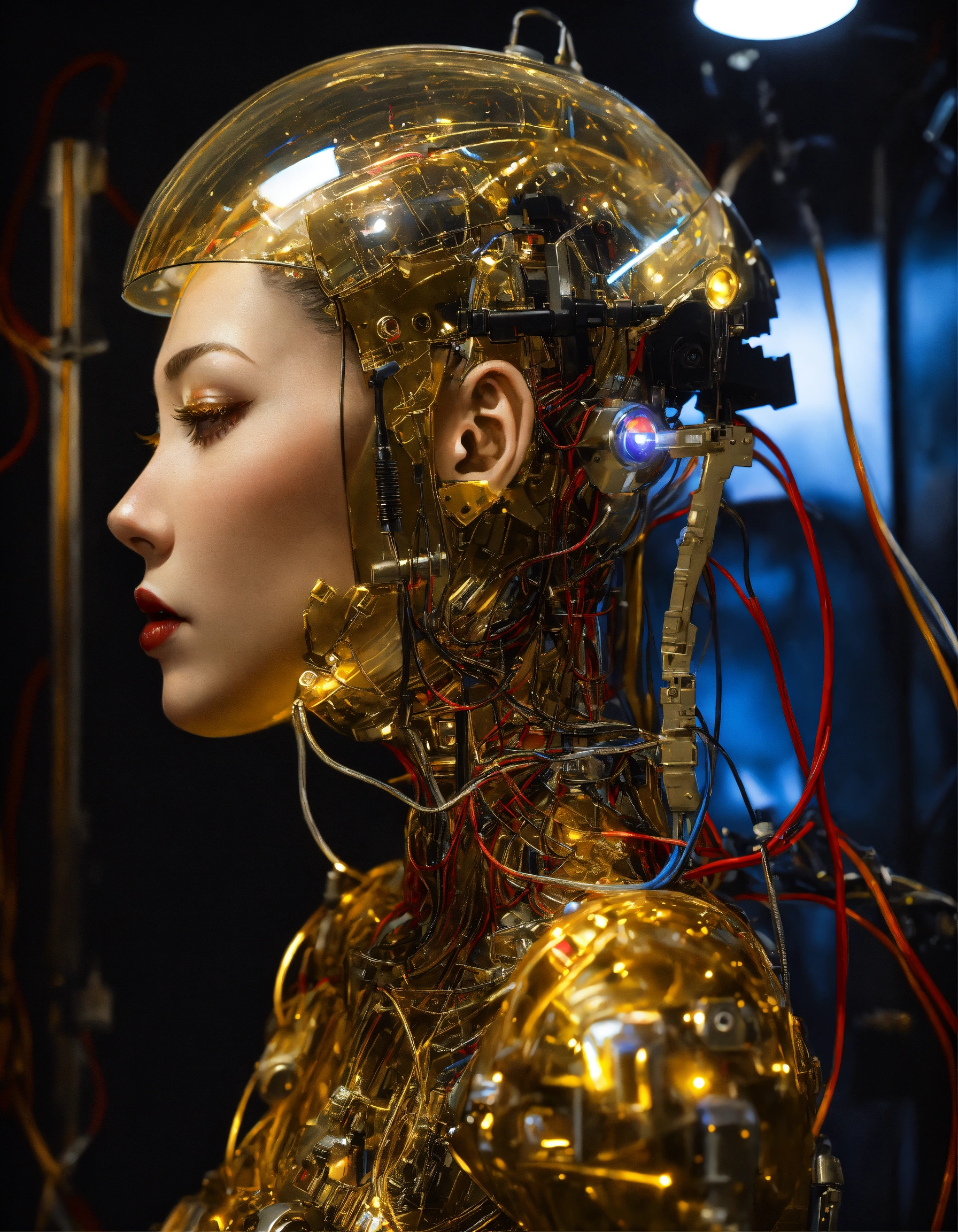 Profile photography, in front of a black wall, a cyborg woman head without body, connected by cables and wires and led, an attractive transparent gold plexiglass body punk plc robots with silver motor head, with ray guns, 80 degree view, art by sergio lopez, natalie shau, james jean and salvador dali