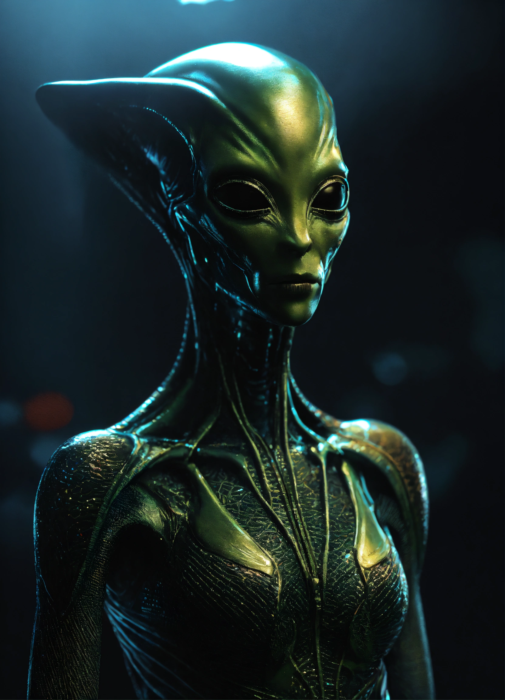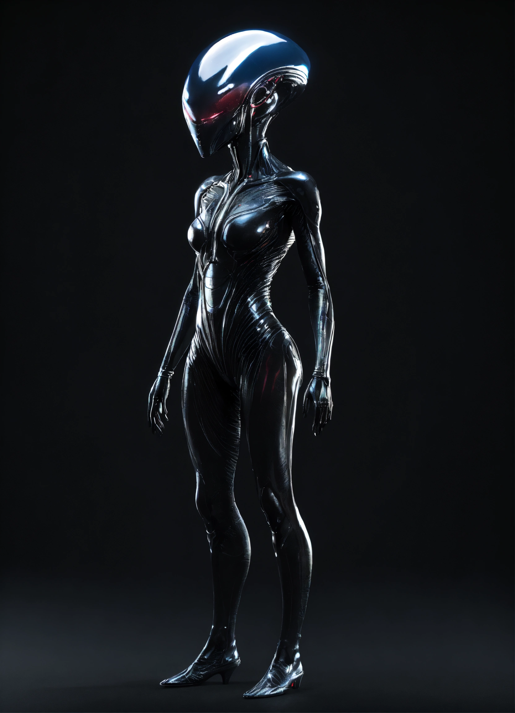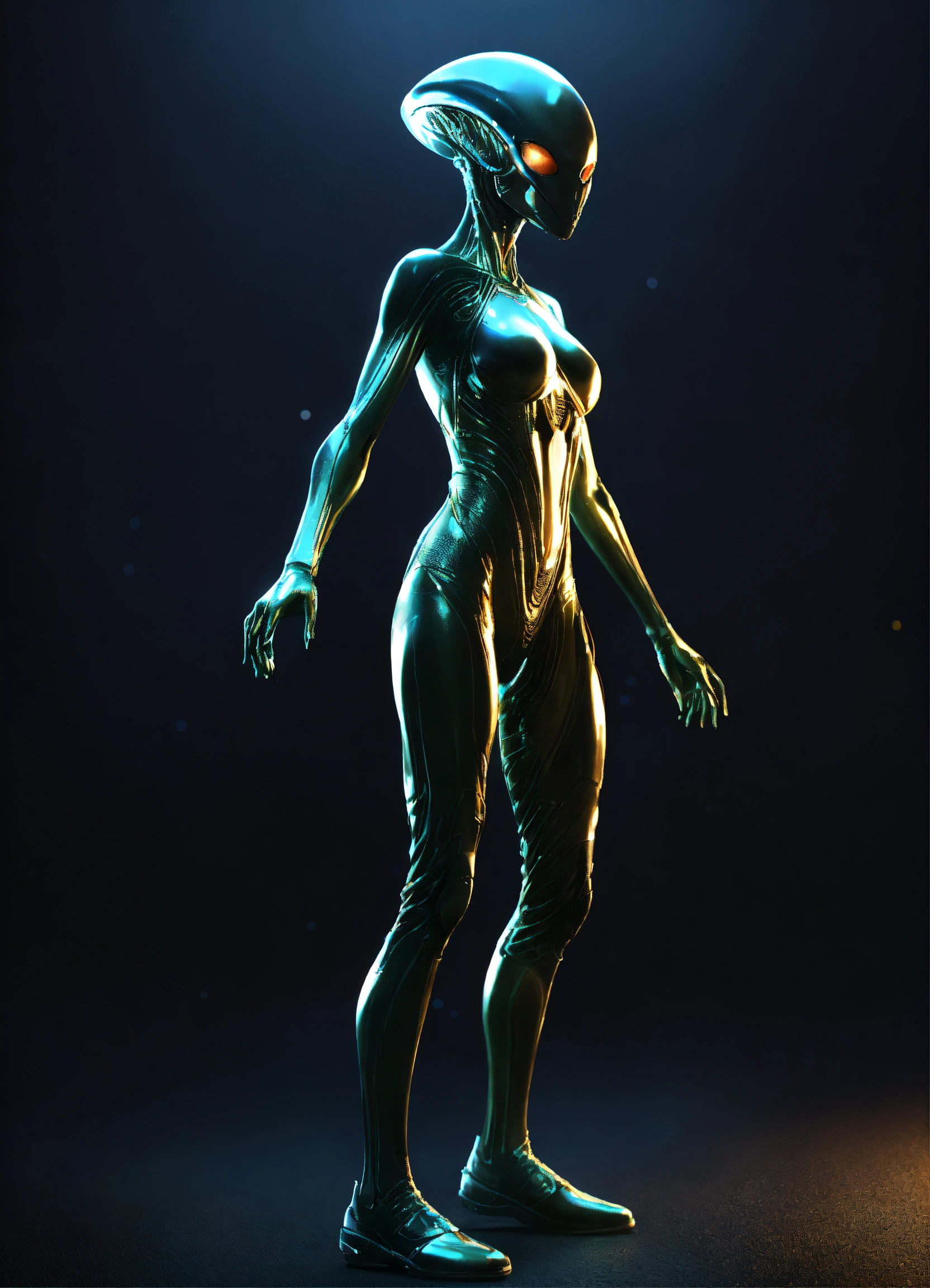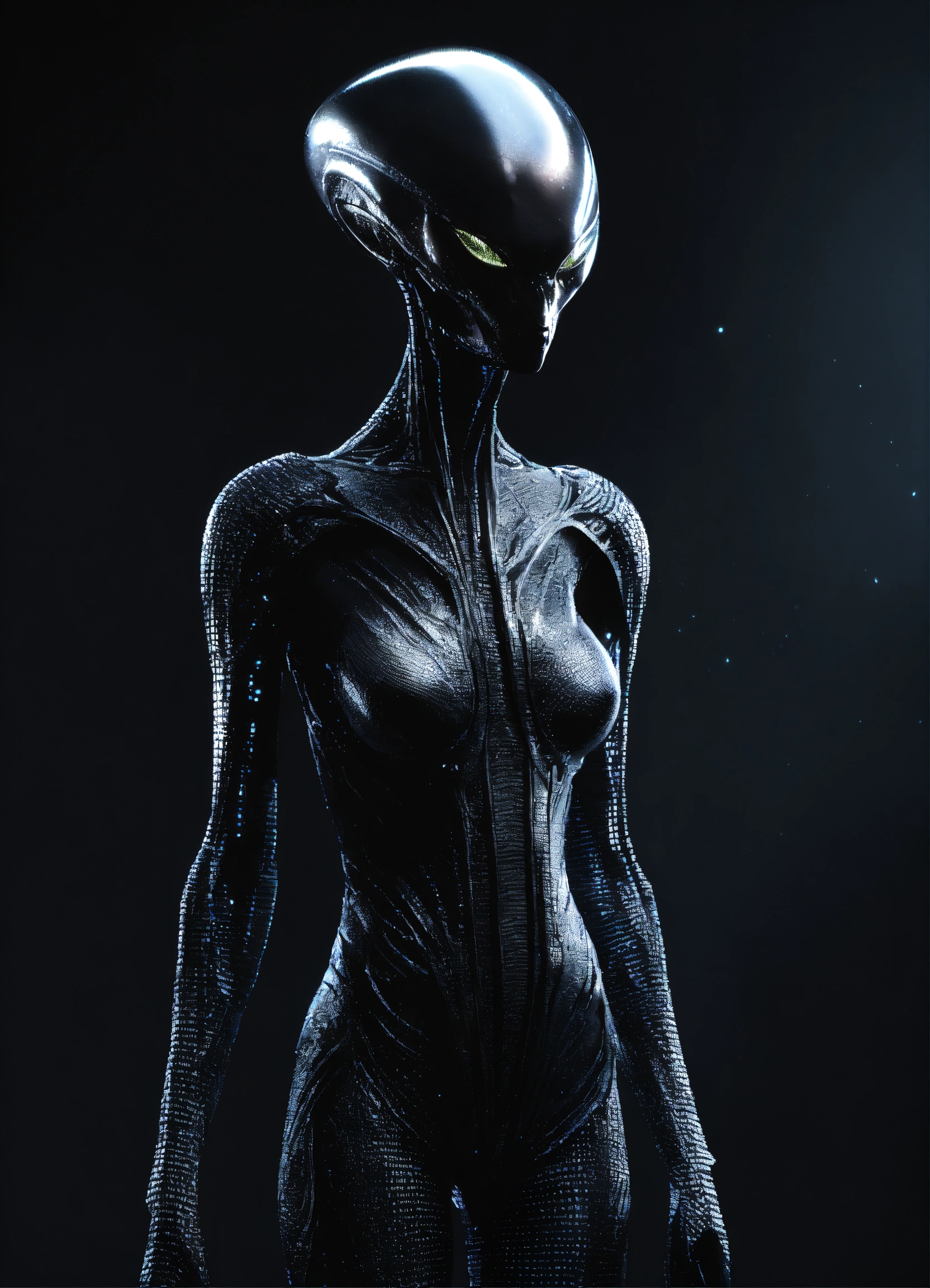 Image of a female alien being, non-threathing, full body, standing, solid black background, 4k render, hyperrealistic