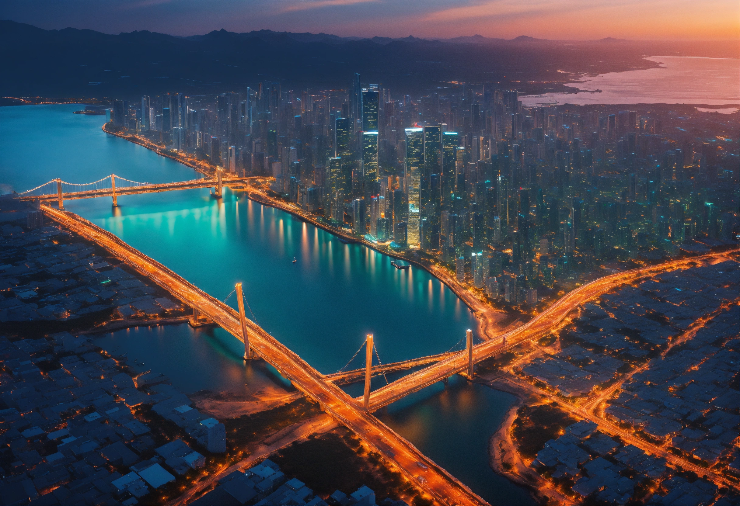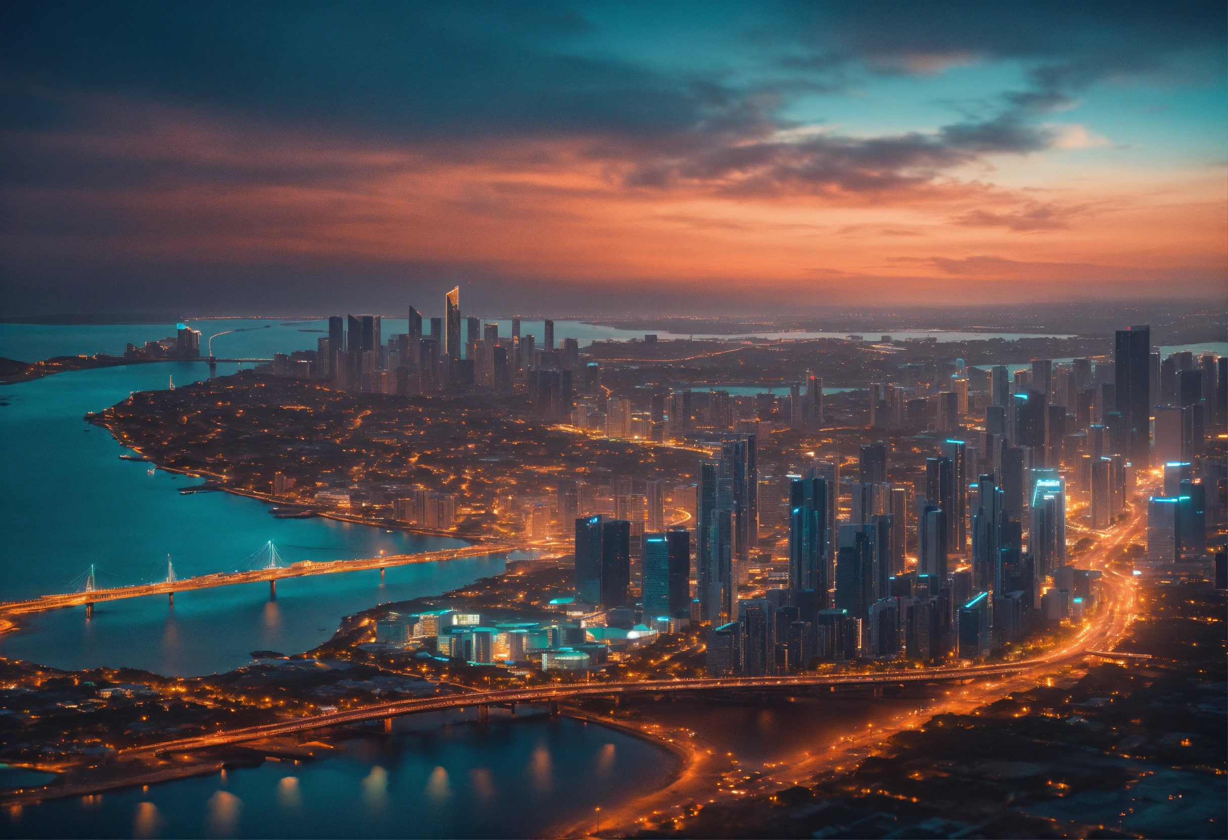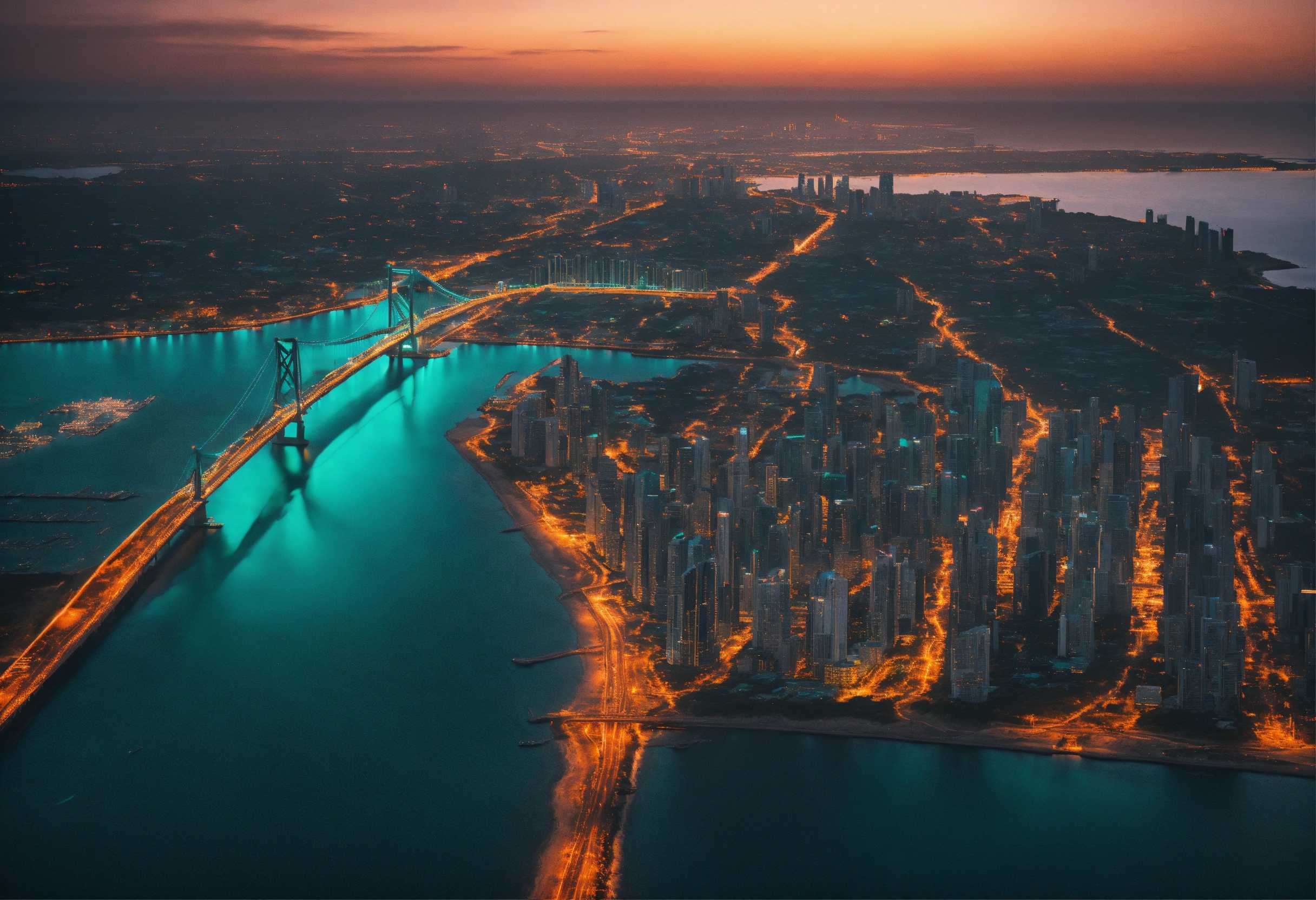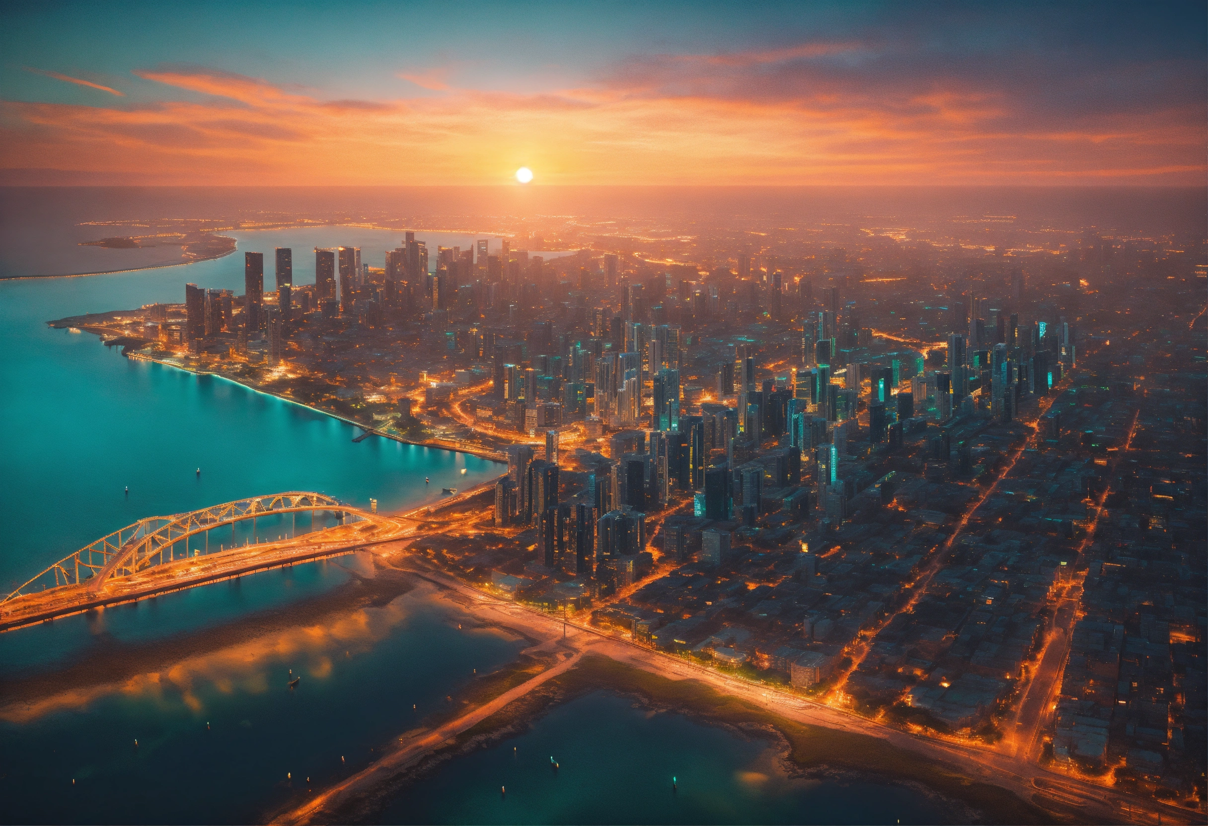 Ultra realistic aerial view of a sunset lit teal colored megapolis downtown near ocean with bridge, streets lit with orange street light, the shot is peaceful and graceful