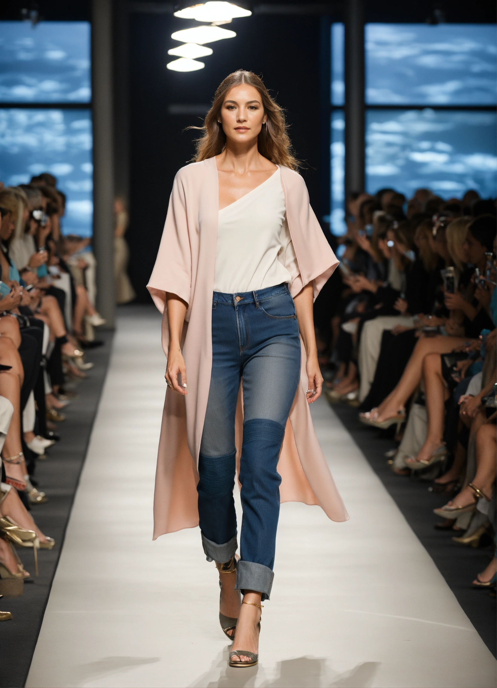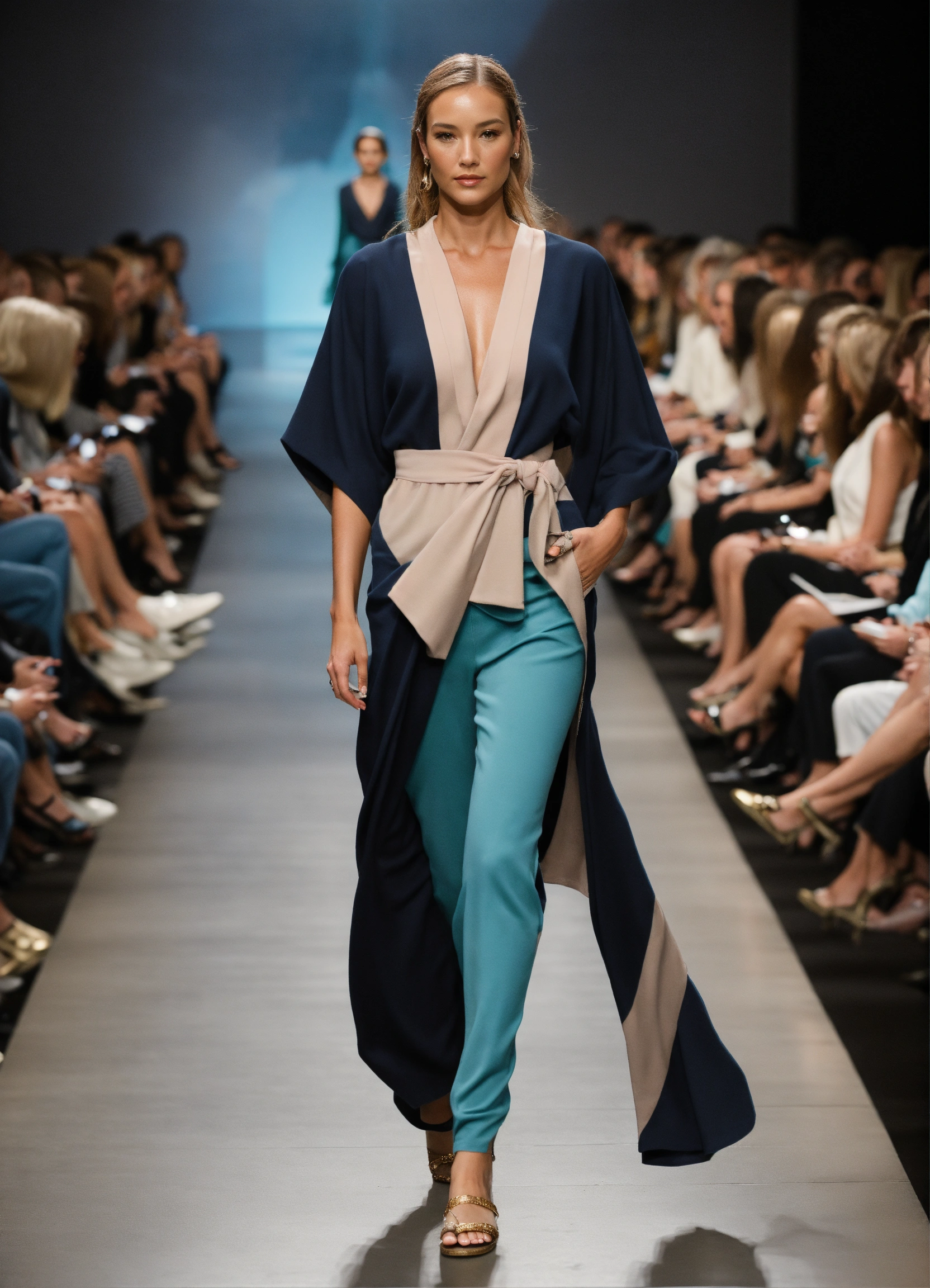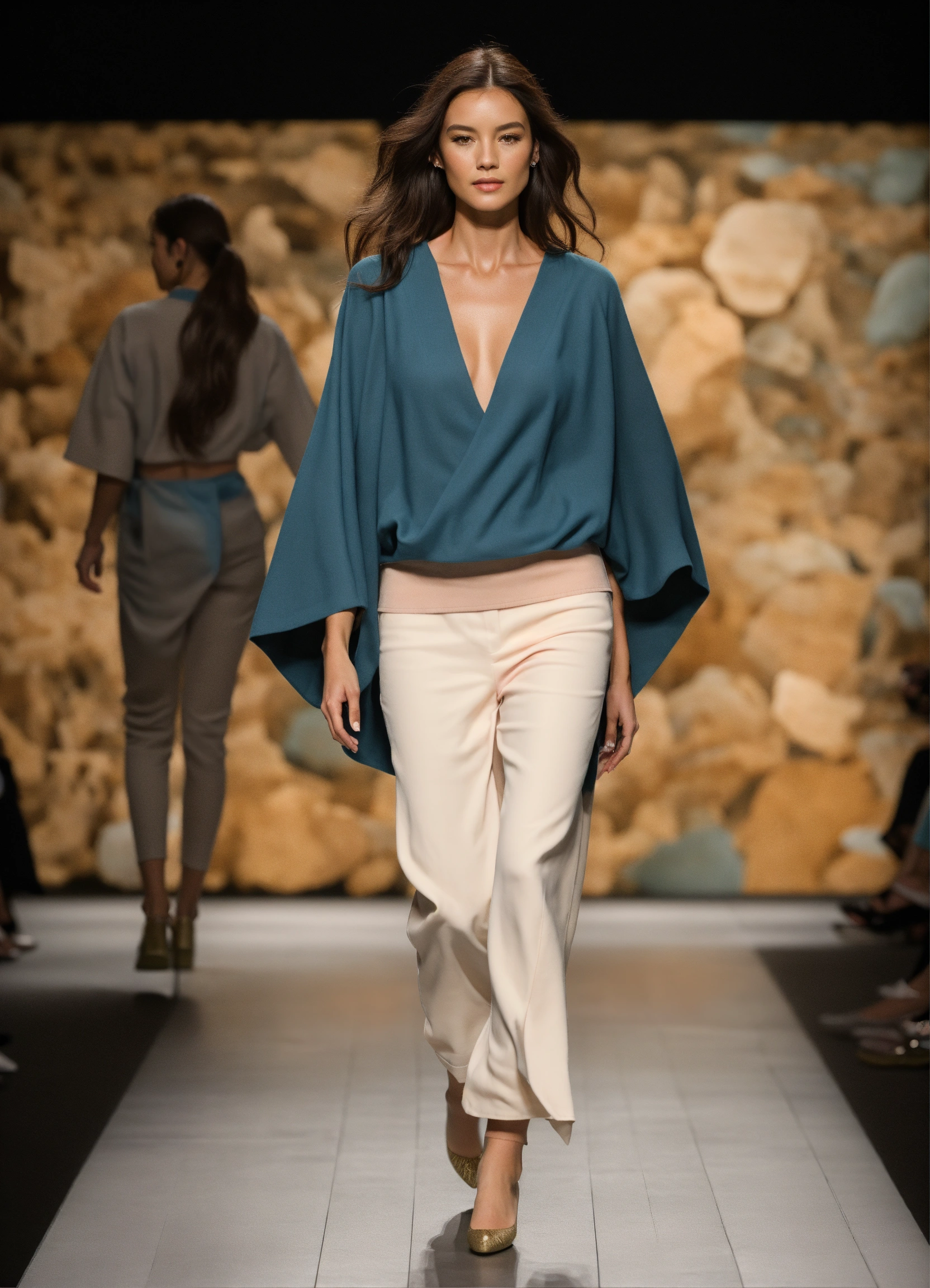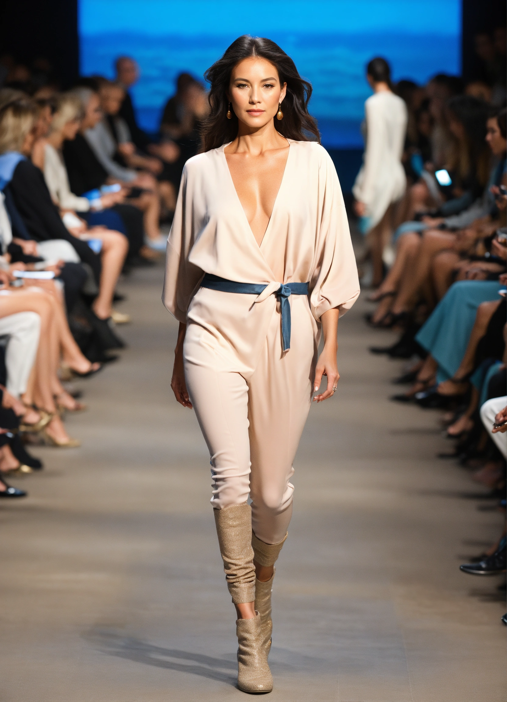 3d realistic photo of female oceanographer walking runway during marine fashion week wearing dolman sleeve donna karan oceanographers fashion in black, white, blush, grey, beige, stone, gold, denim, blue, teal walking a runway in a marine lab