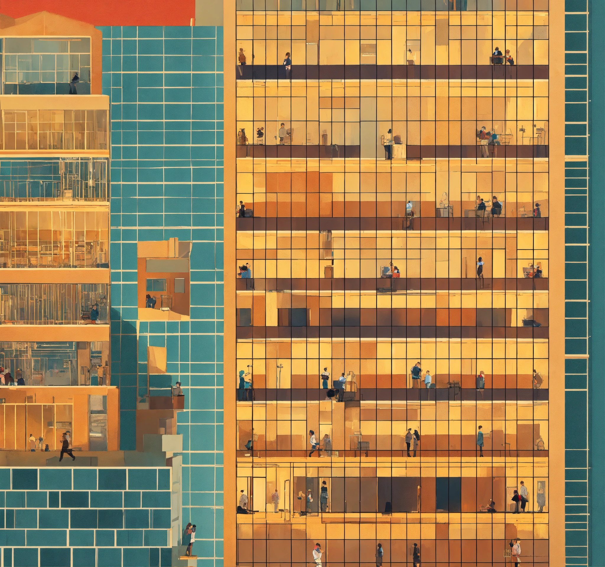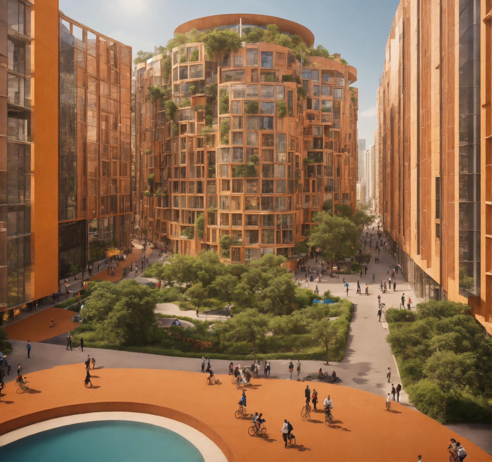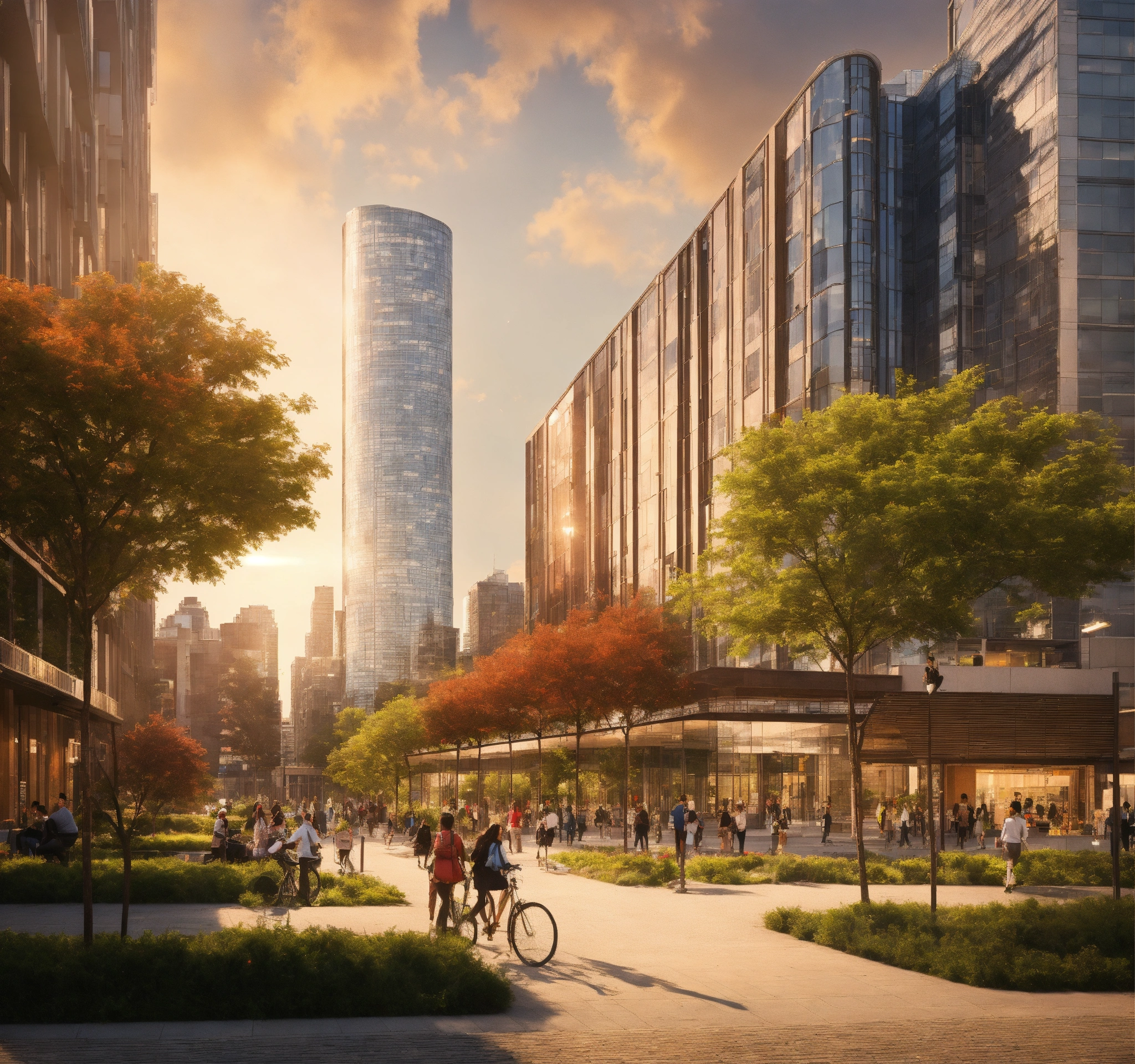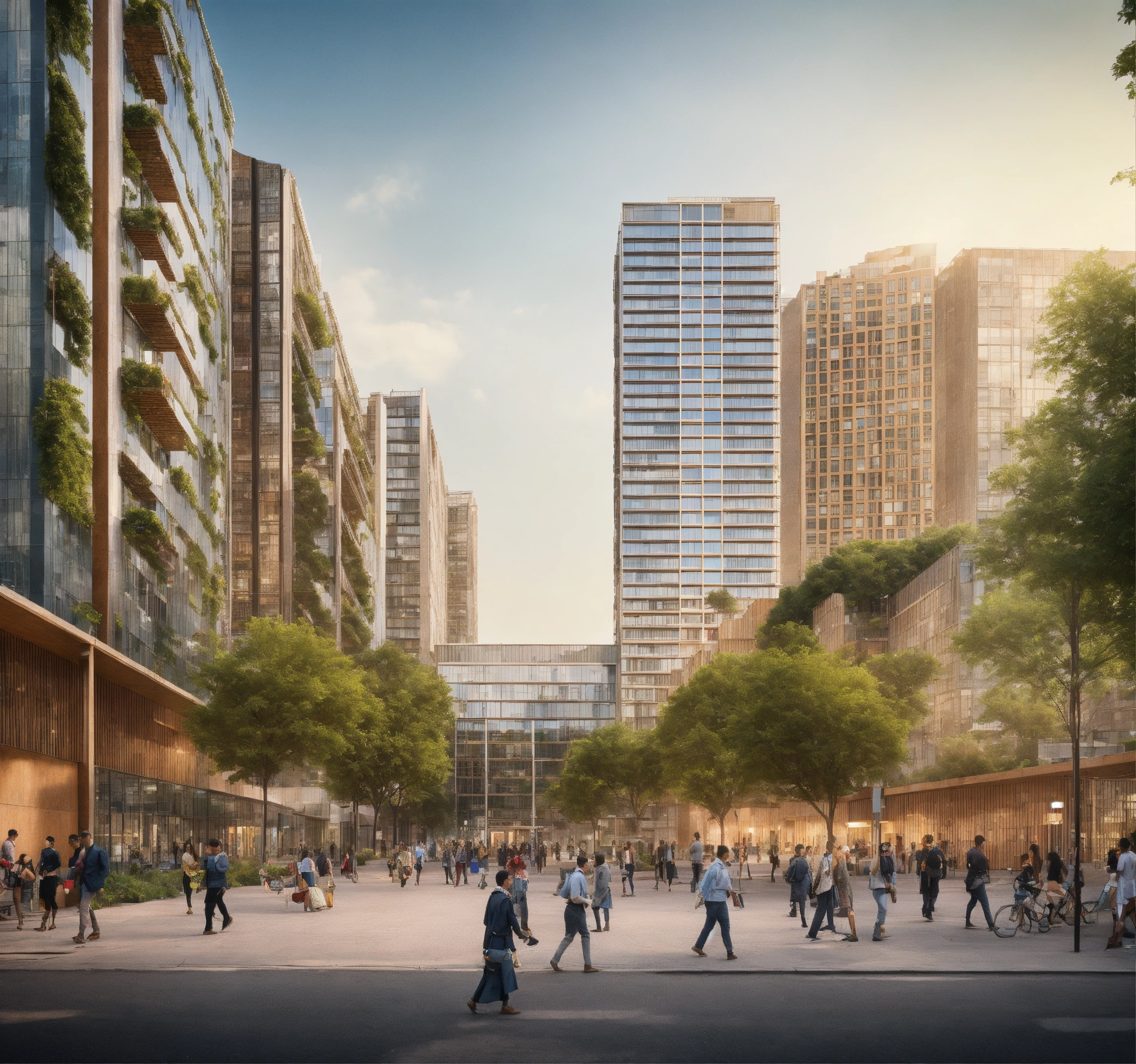 City scenes with people where the skyline is dominated by buildings designed for social well-being and resource efficiency. educational institutions and workplaces prioritize social responsibility, and financial systems are geared towards sustainable investments. communities are vibrant with engagement, and equitable access to resources and opportunities is visible in every aspect of urban life. the built environment, no longer a symbol of social division, is now a testament to a world that values equality, sustainability, and collective well-being.