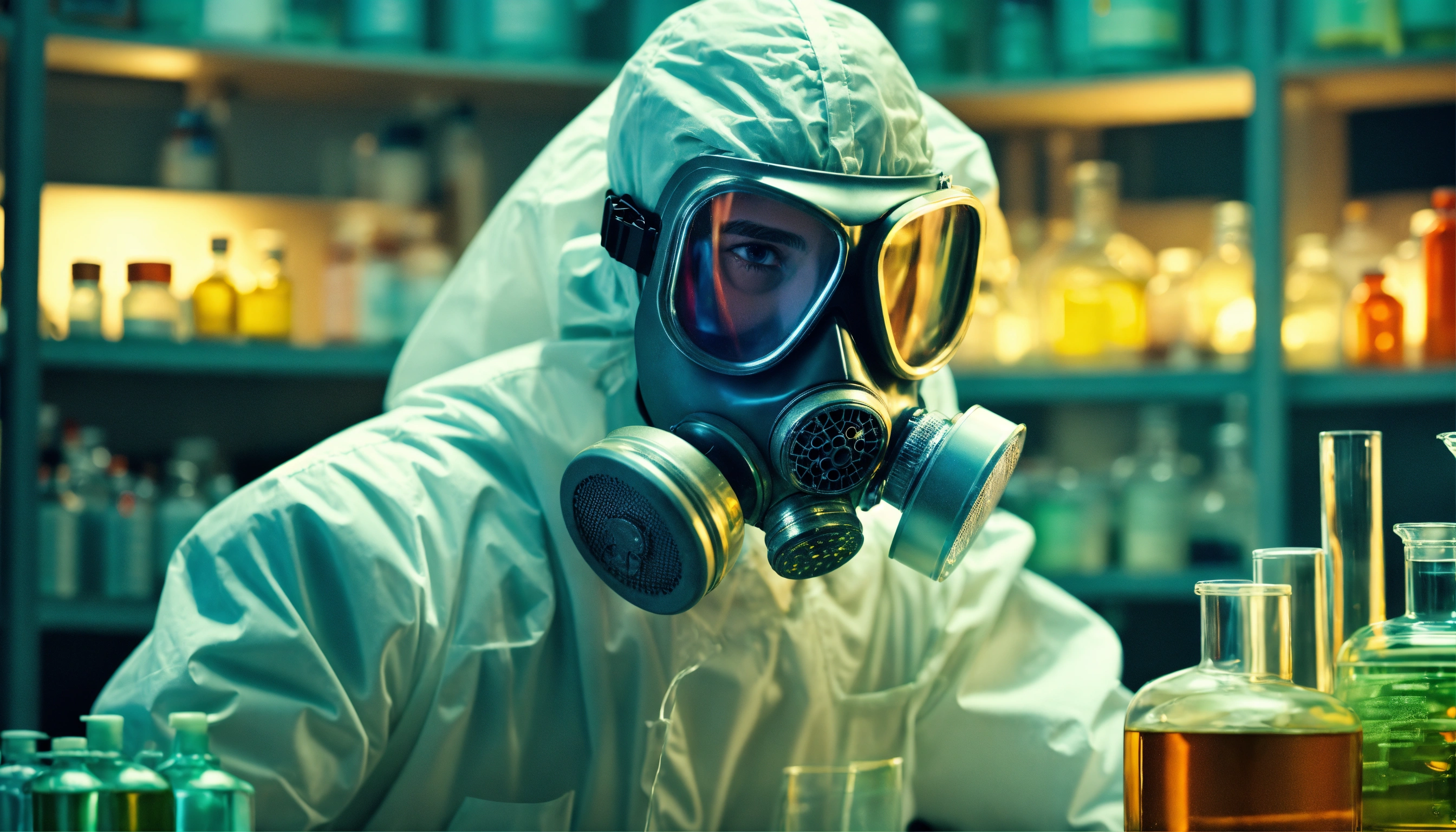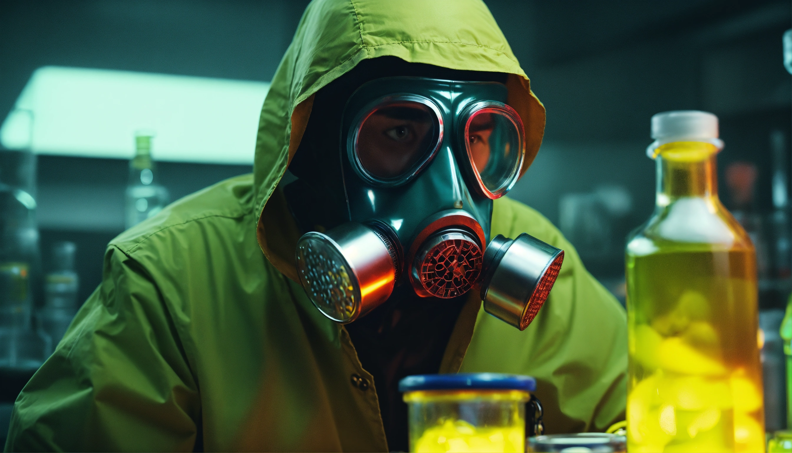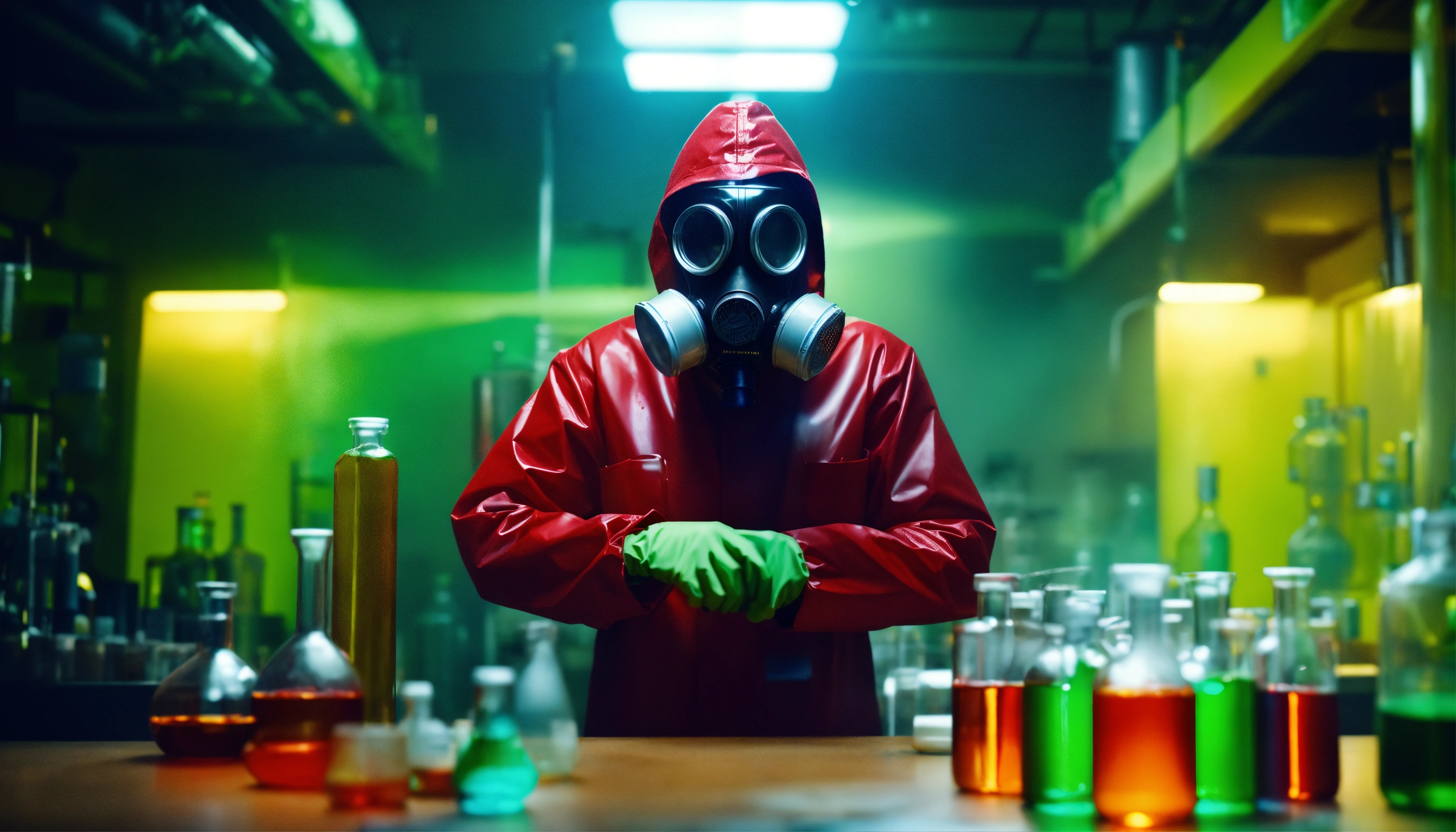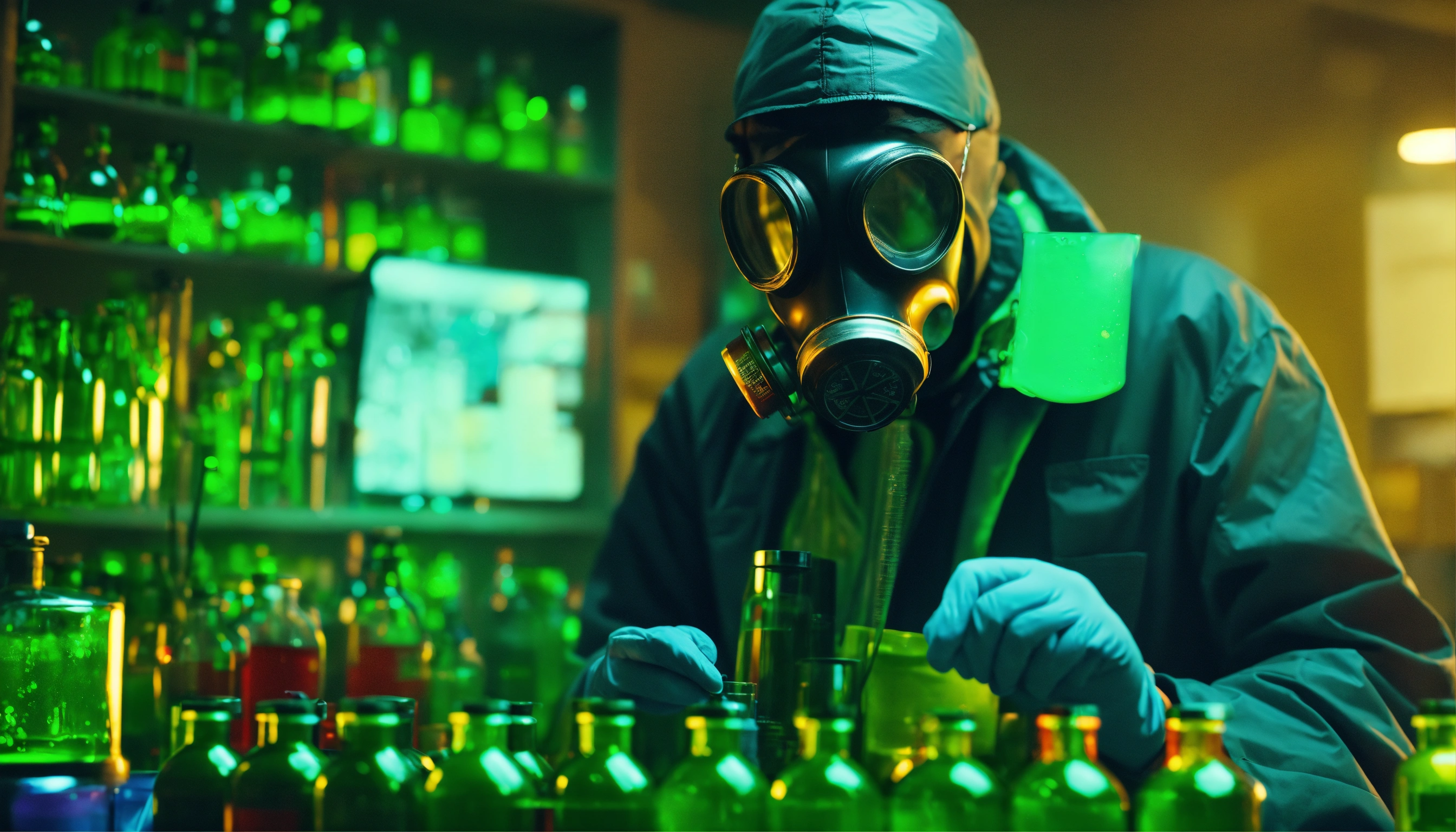 Toxic. crazy man chemist wearing gas mask. working in a modern clandestine laboratory with flasks and colored pouring liquids and reagents. production of synthetic designer drugs - pills. octane render, highly detailed, lighting, professional, realistic, sharp focus, 4k, 8k, high resolution, candid, personal, bright lighting, ultra-detailed, bright lighting, photo, photography