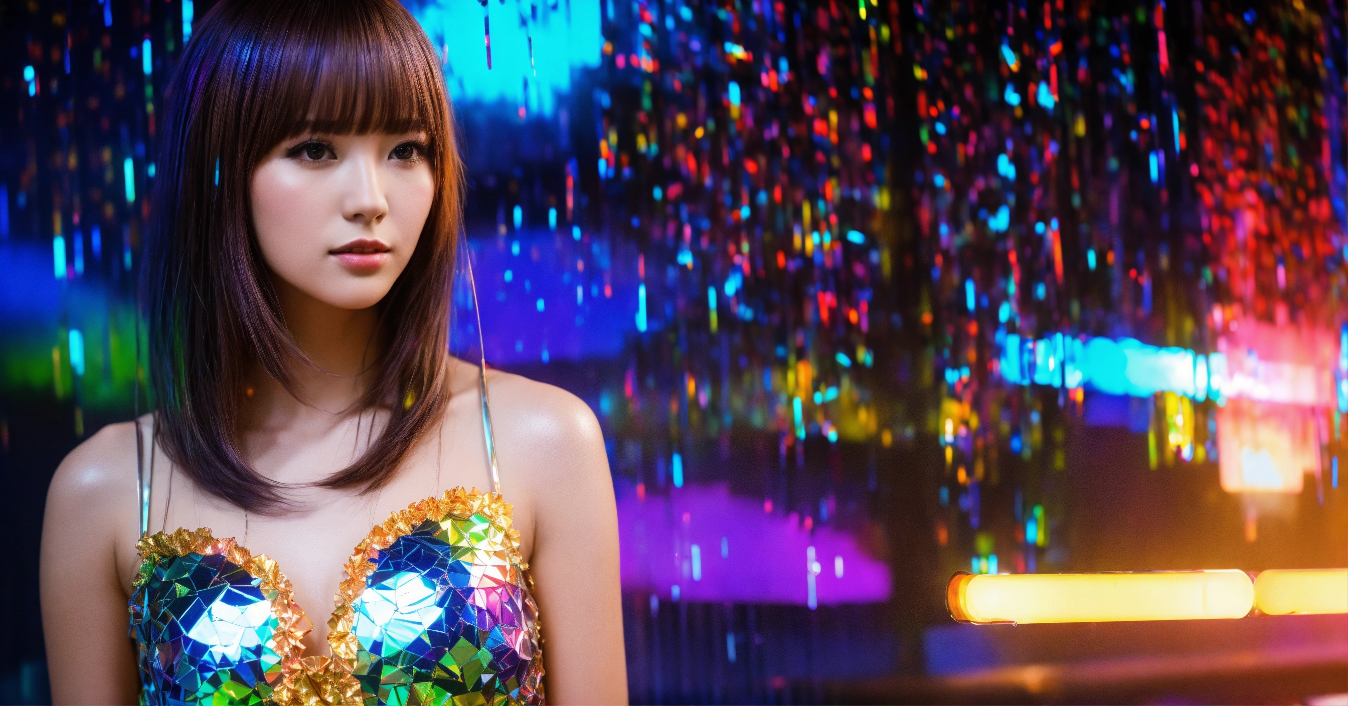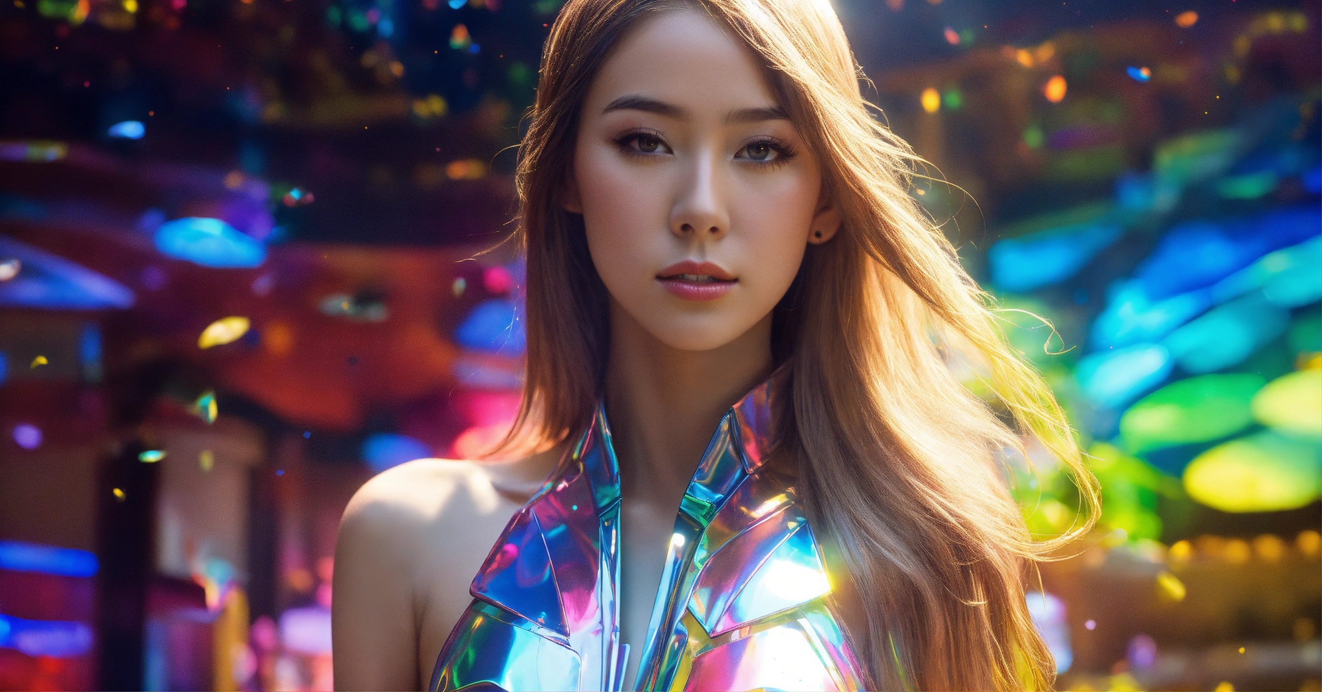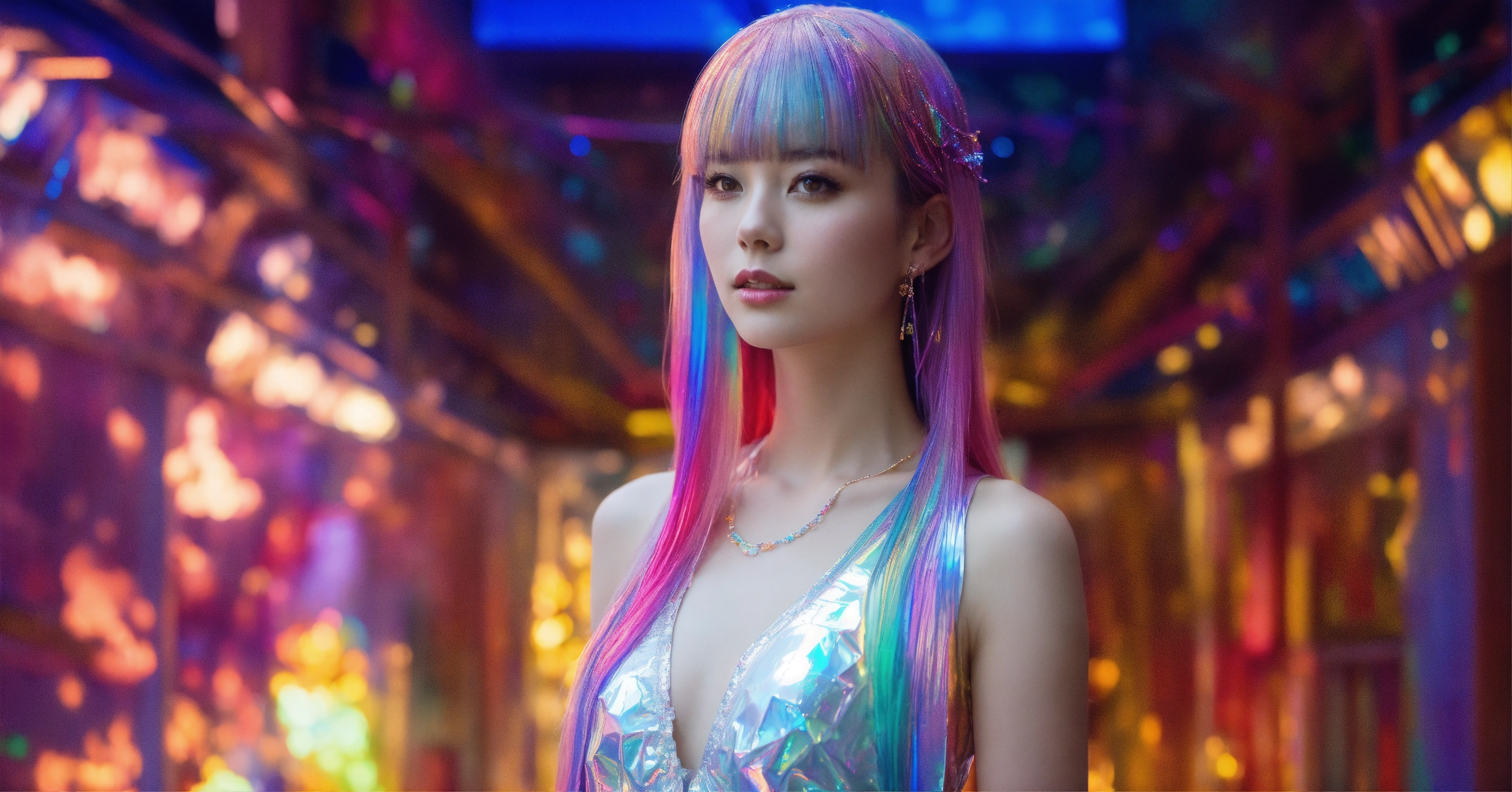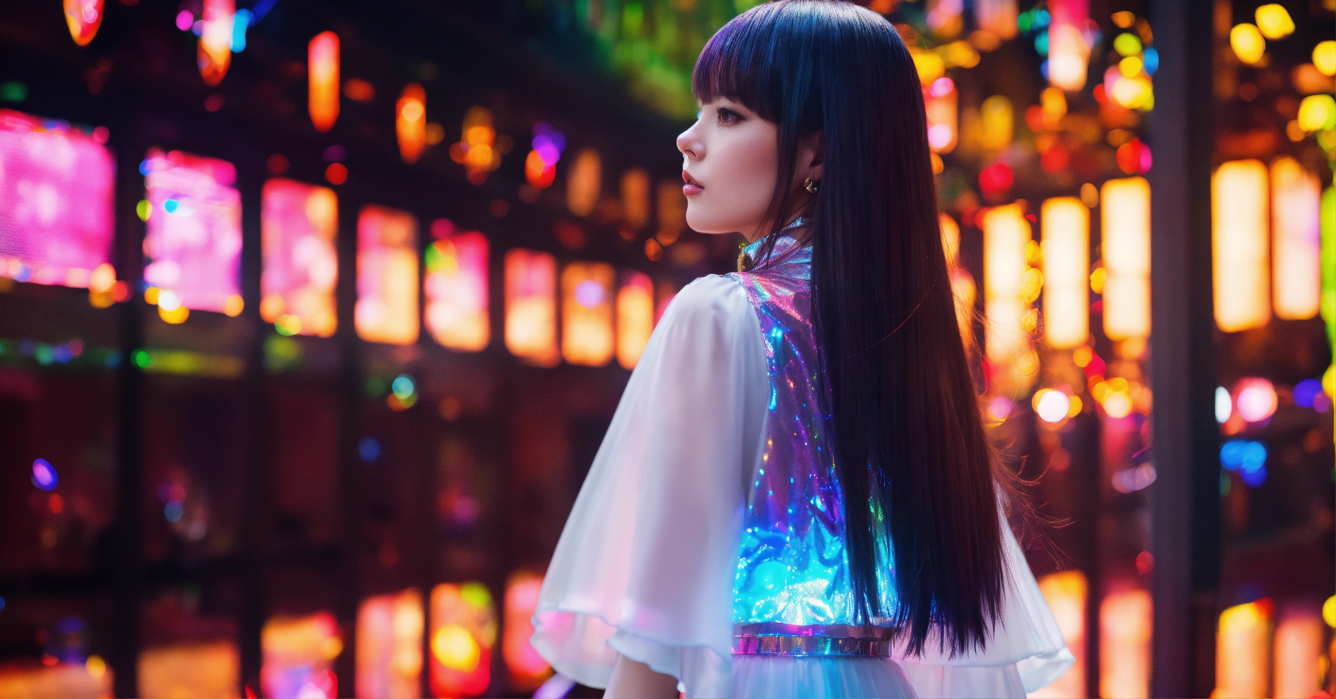 Masterpiece, best quality, highres, 1girl, liuli2, tall, long straight hair, perfect stature, white dress, fashion pose, bangs, look_at_viewer, chromatic dispersion, metallic_lustre, see_through, (tansparent_plastic1.3), coloured glaze, polychromatic prism effect, rainbowcore, iridescence/opalescence, glowing colors, aluminum foil, glowing ambiance, building background, (portrait1.5), look back, <loraliuli20.7>, tyndall effect