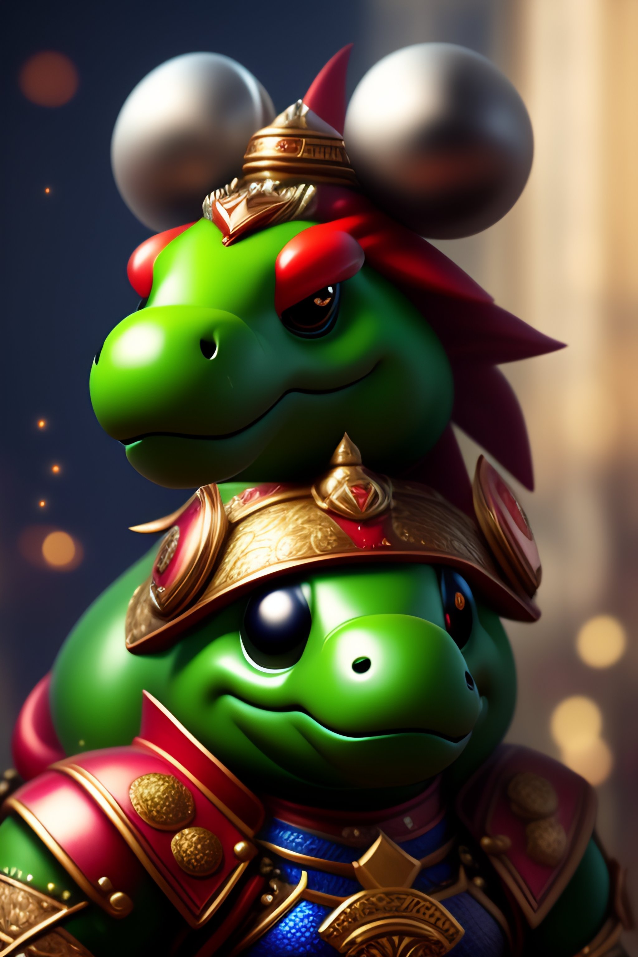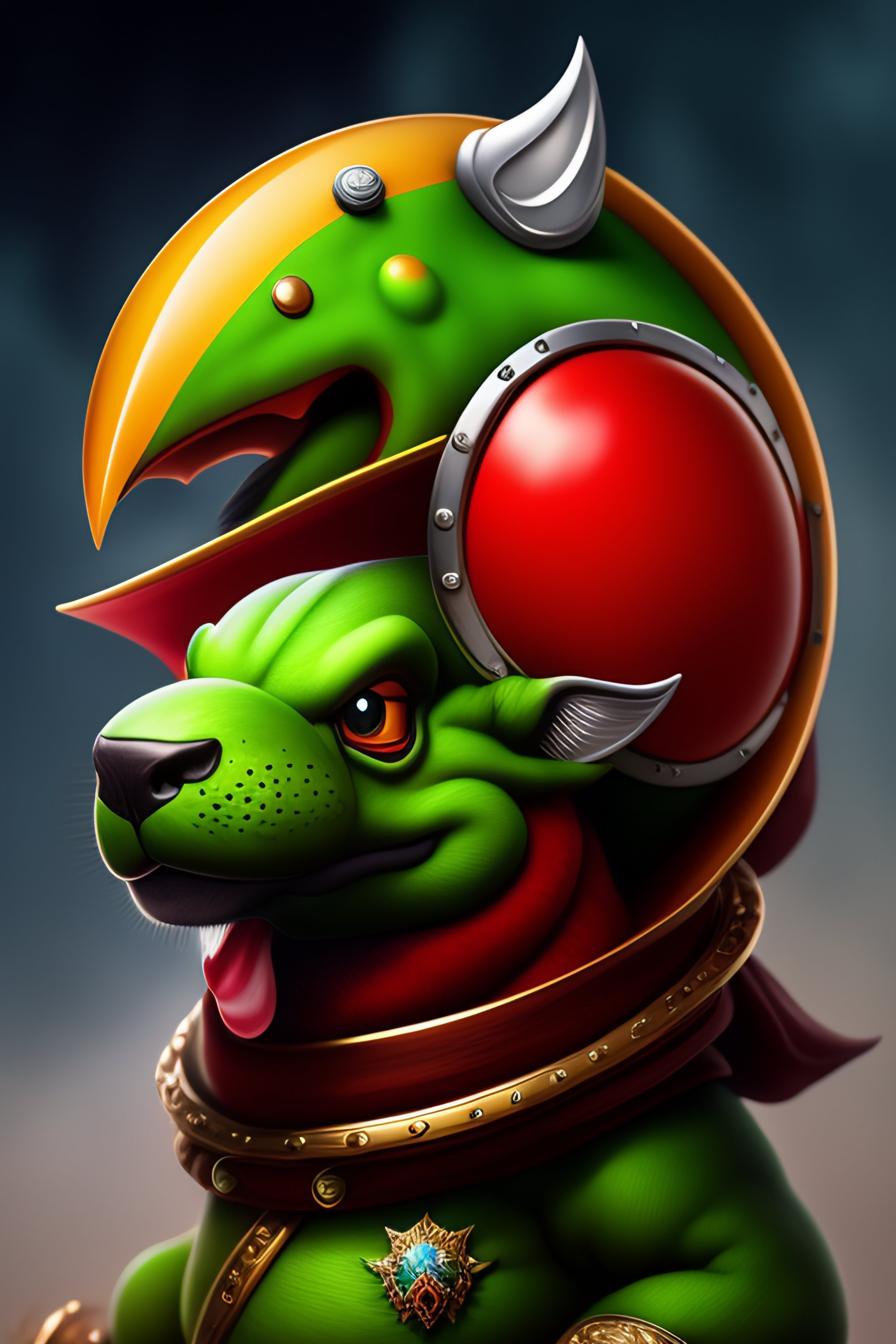 Portrait of warhammer yoshi with a big shields and sharp tooht