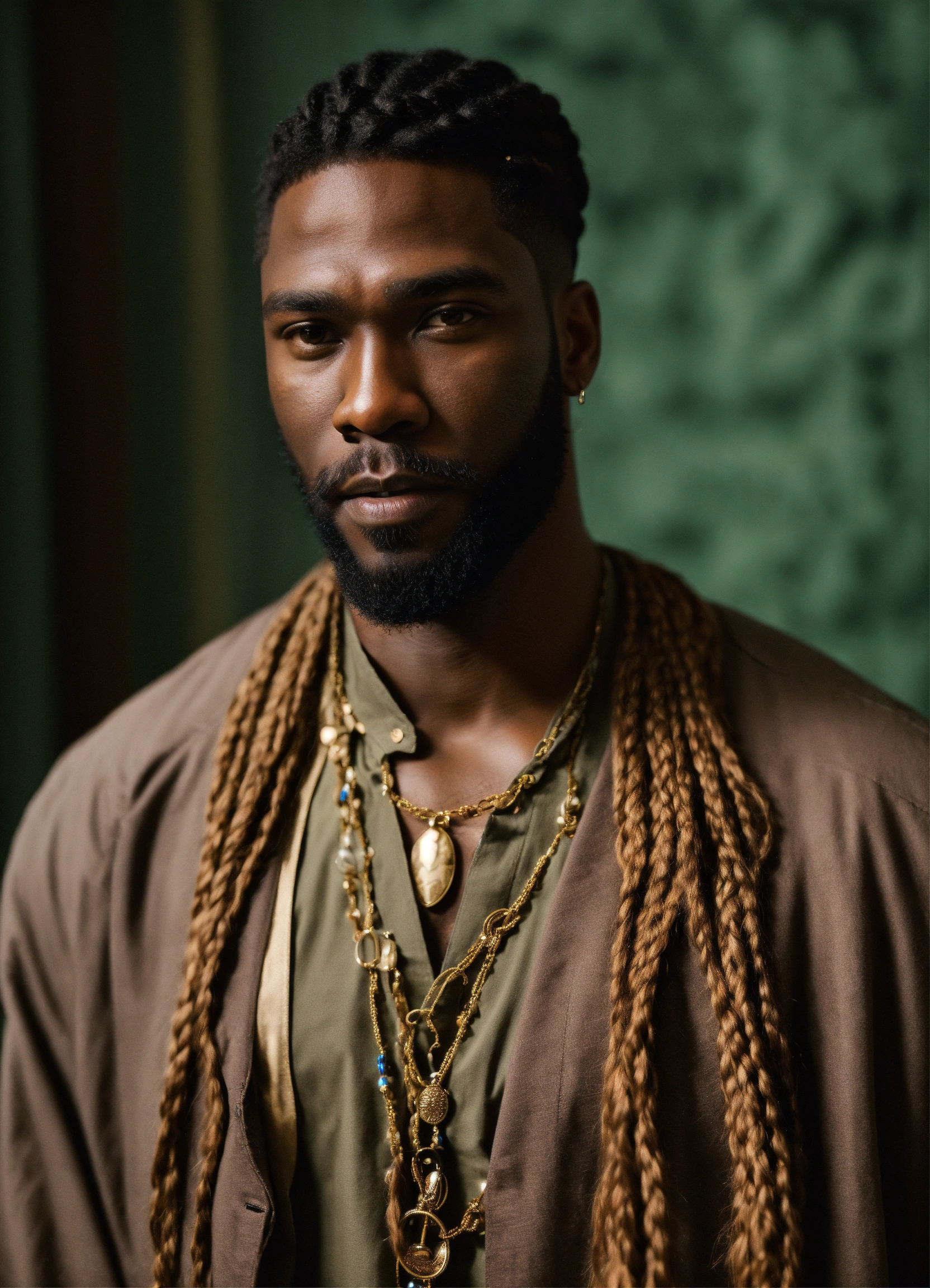 Dark-skin black man in his late 30s broad muscular build well dressed short trimmed beard braids over 6 feet tall
