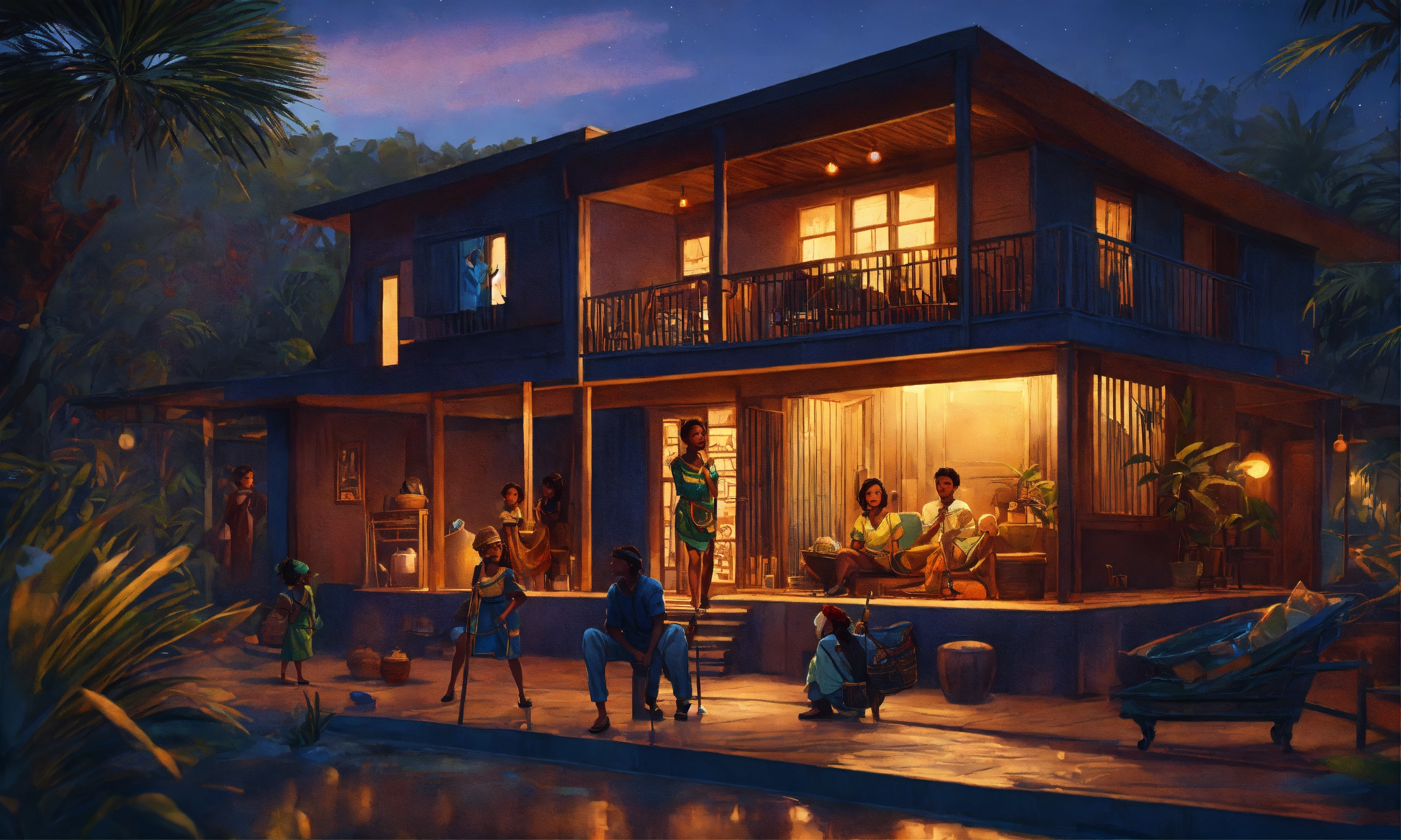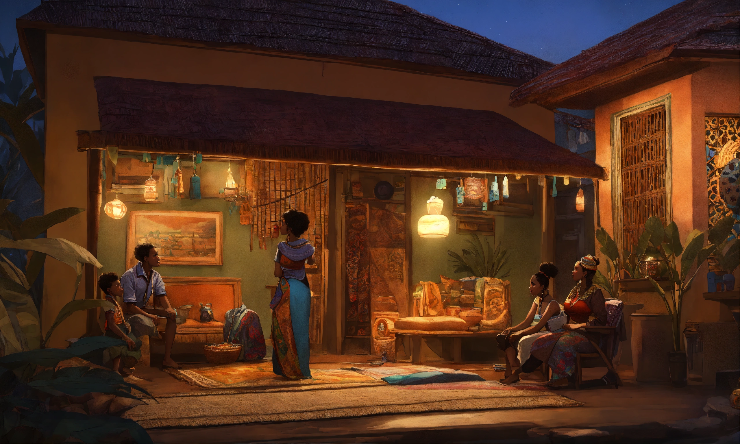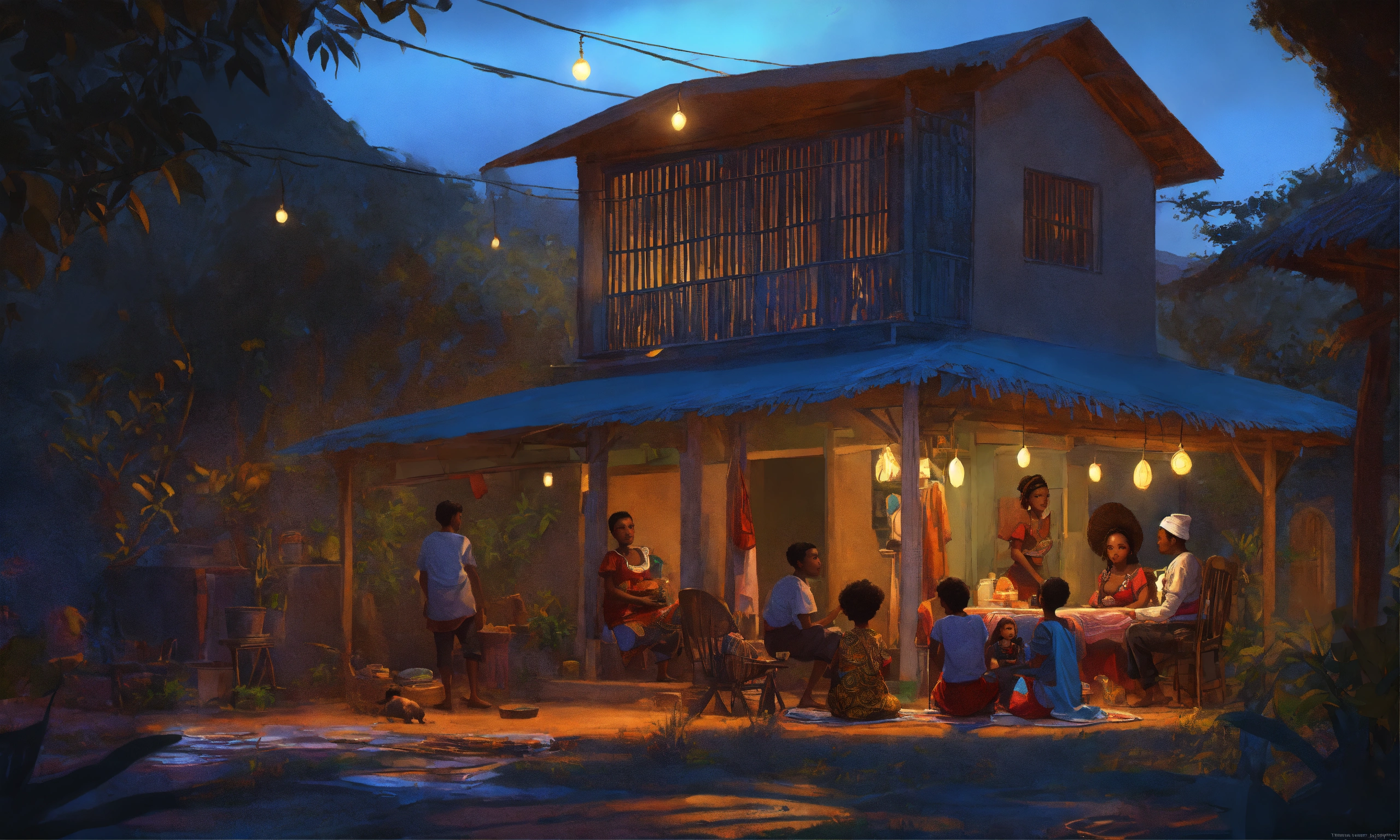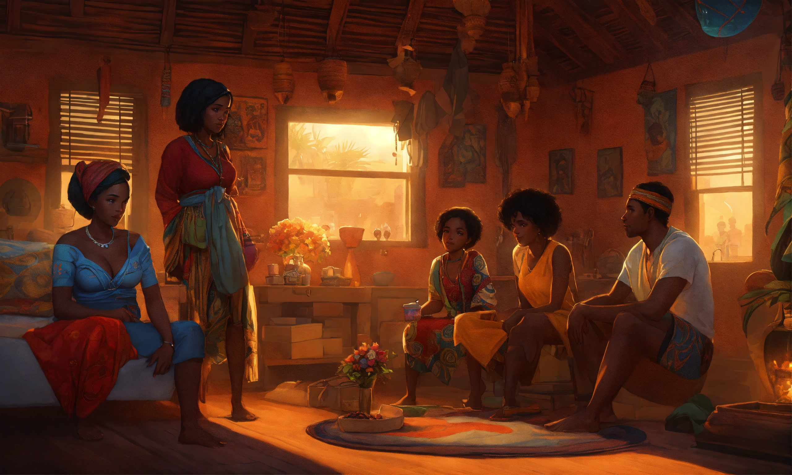 African village family inside house, at nights, highly detailed, smooth, pixar style by tristan eaton stanley artgerm and tom bagshaw, 8k