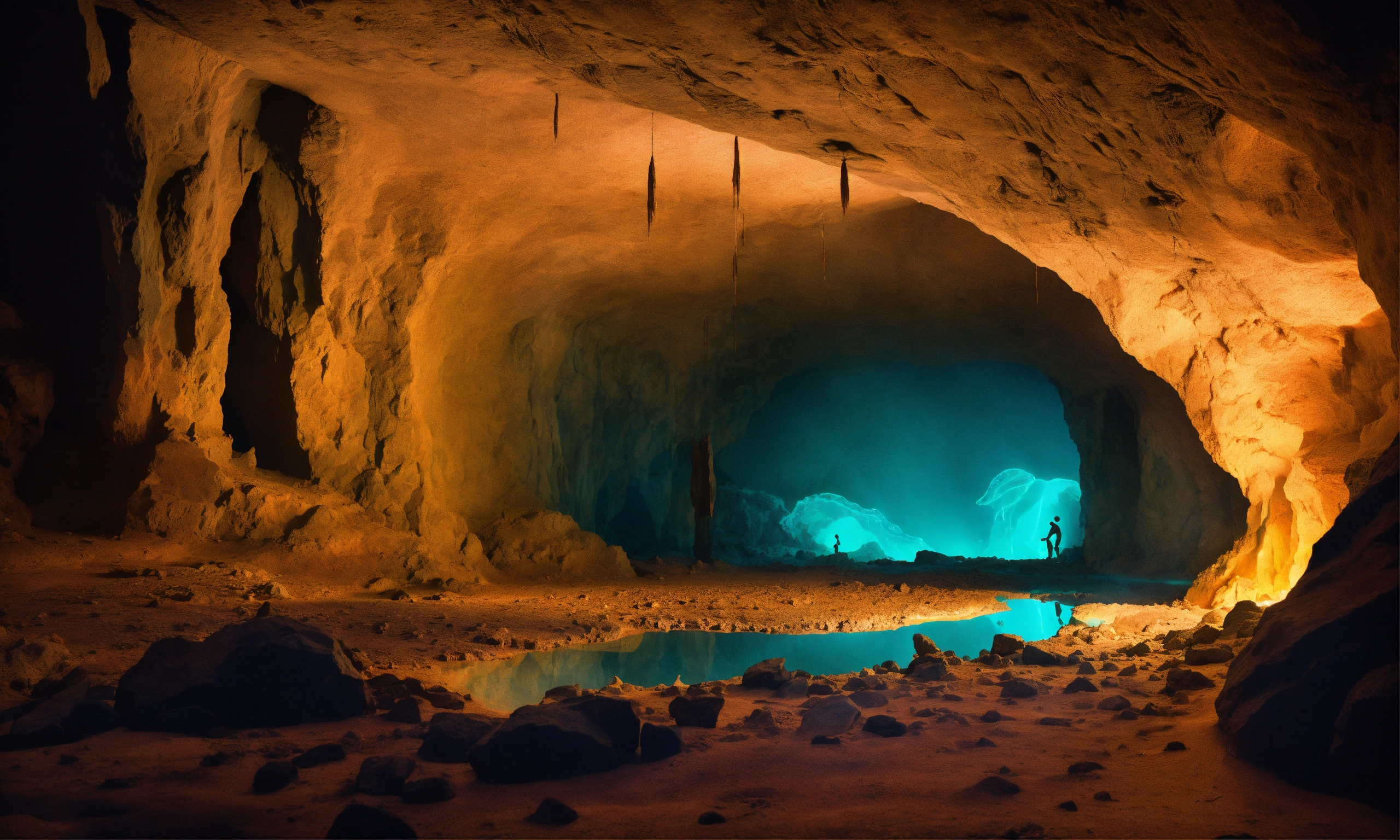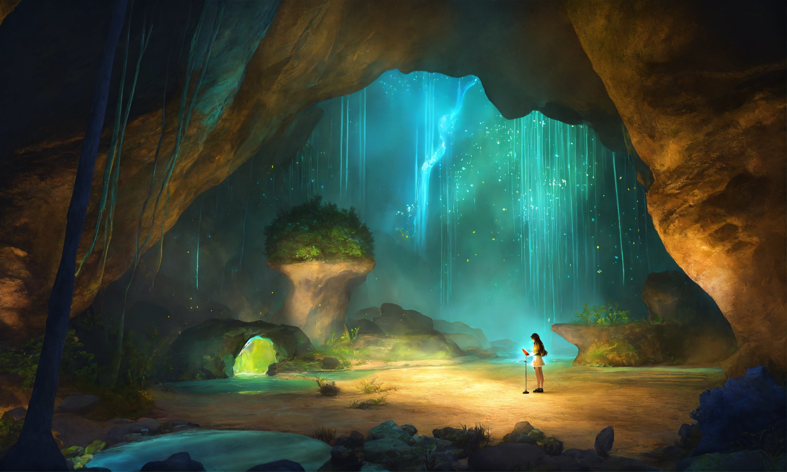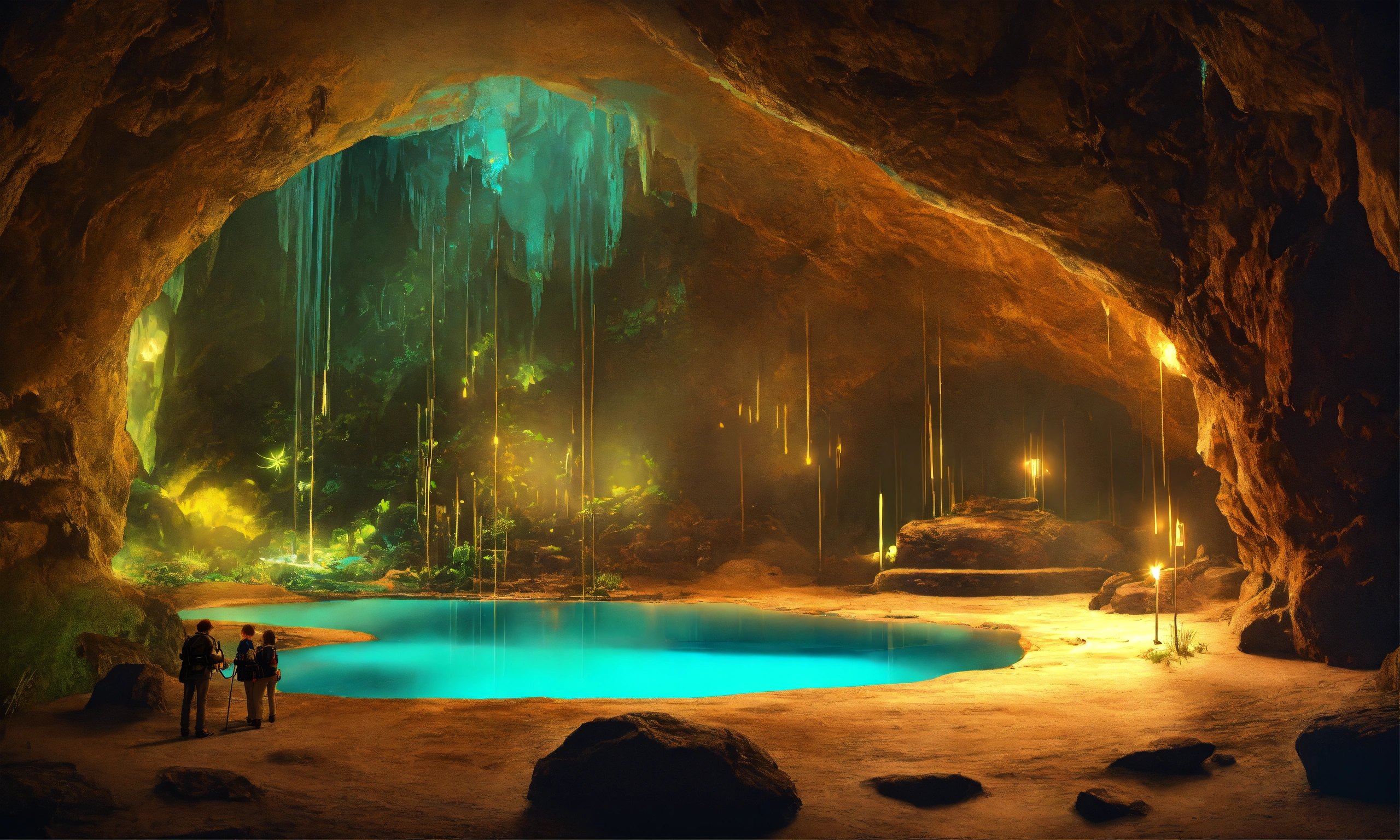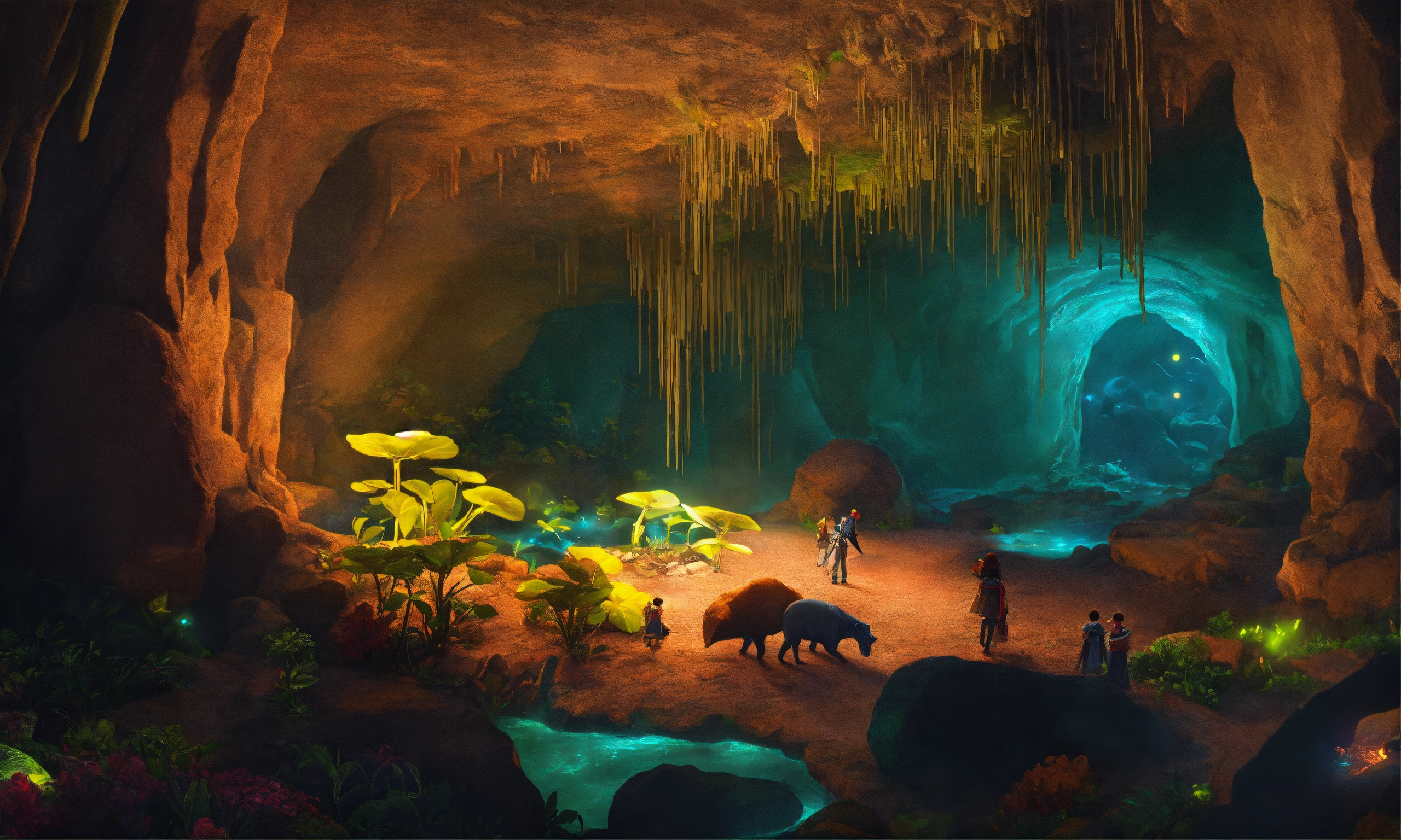 Compose a digital fresco of a subterranean cave, where bioluminescent creatures read to each other in a language of light.