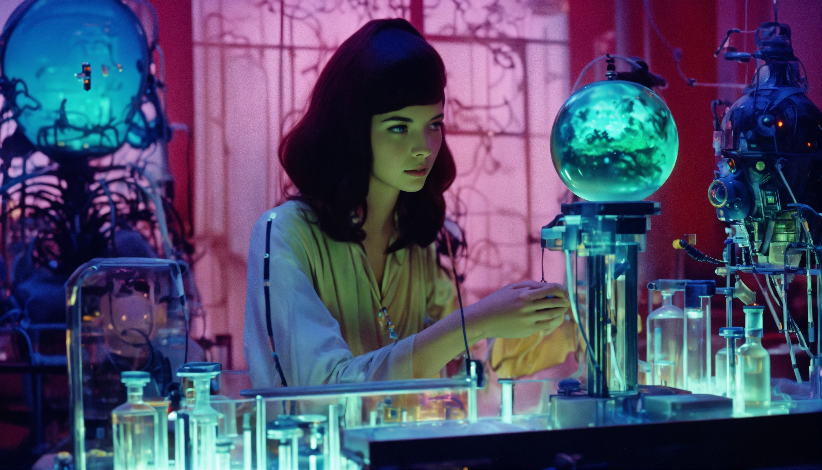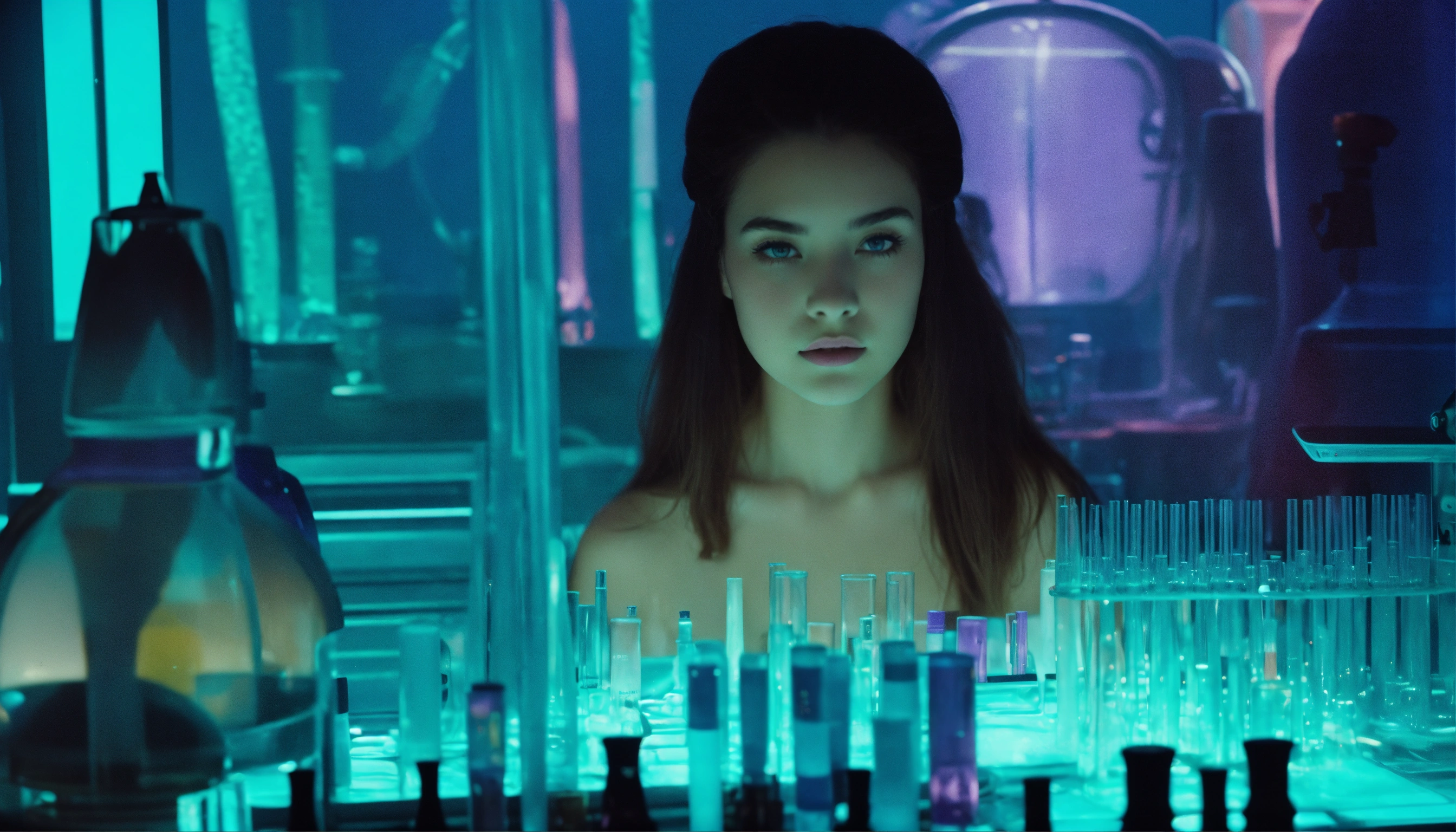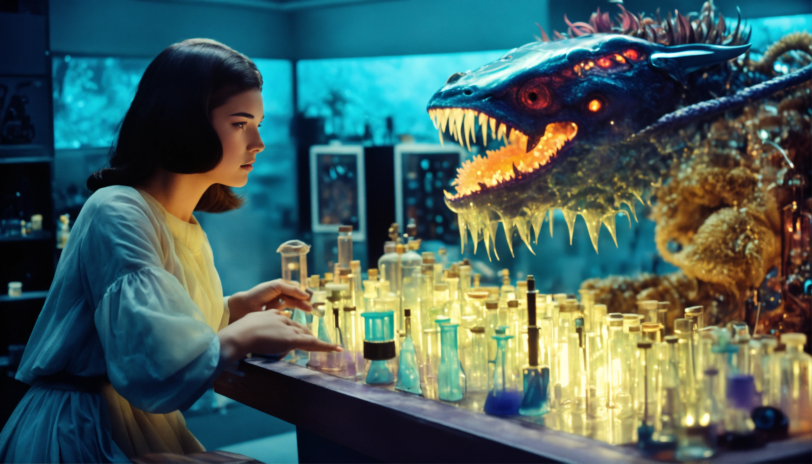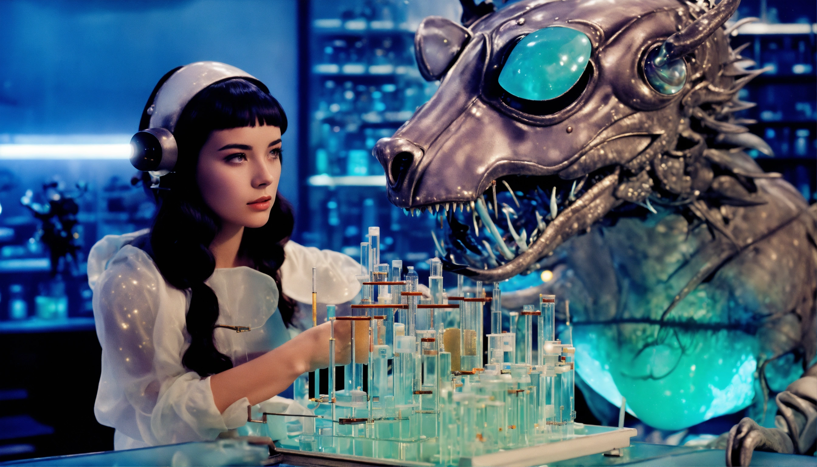 1964, old photography, kodak film colour, surreal sci fi, old film, unknown beautiful 16 years old futuristic fortune teller girl with a big unknown fantasy beast monster, futuristic glass lab with myriad of research instruments, a myriad of futuristic test tubes, pale cyan blue and pale purple, regenerative plants and ai and big unknown magic beast