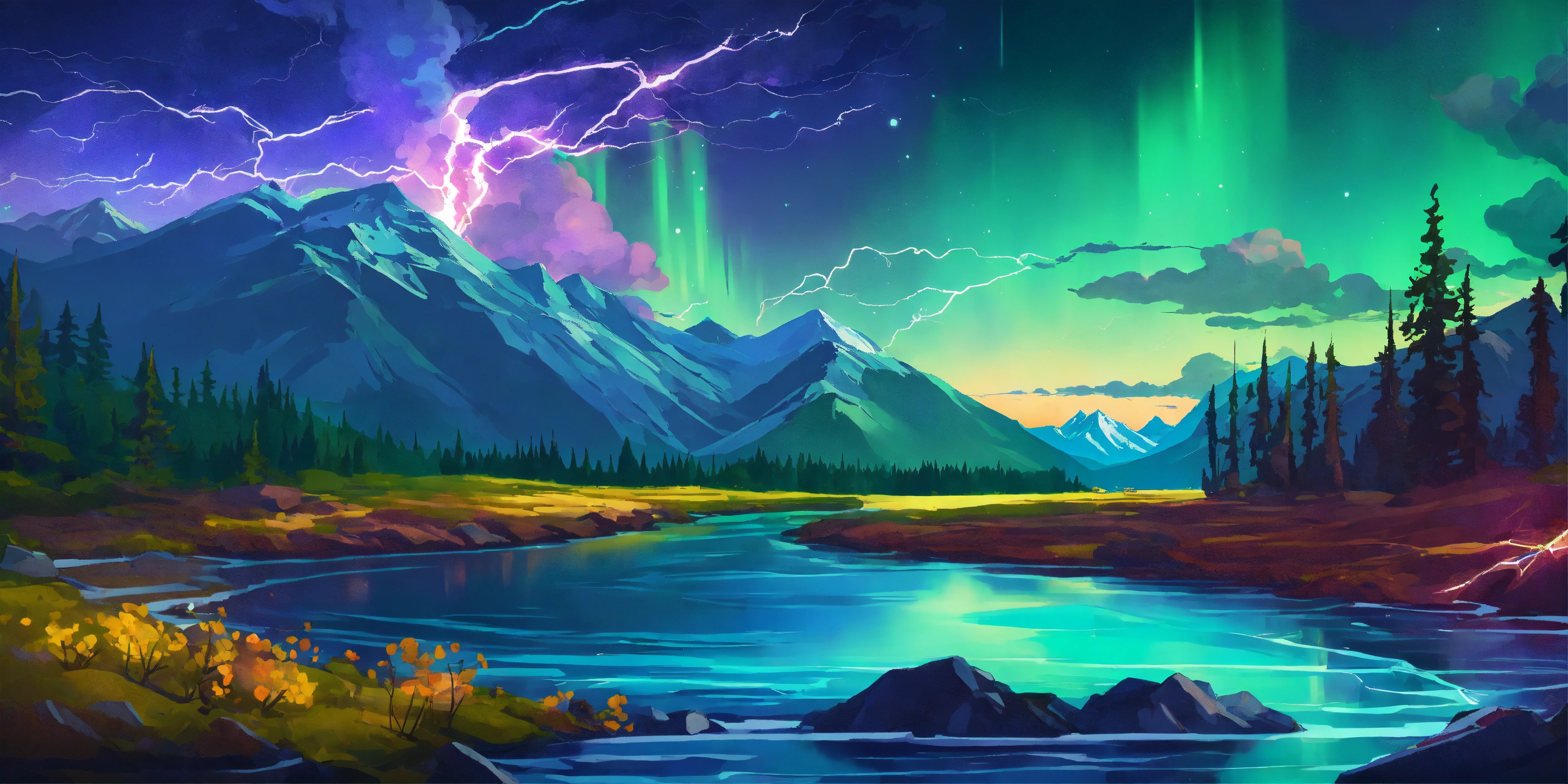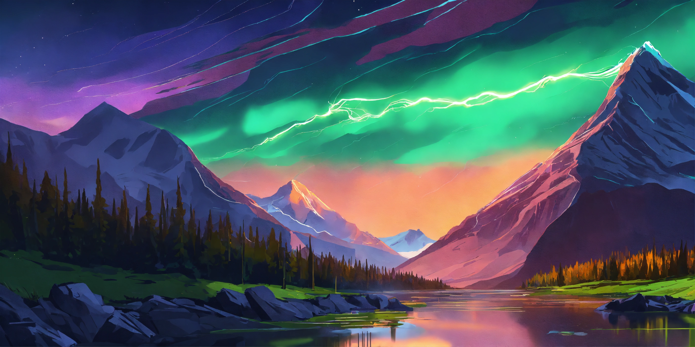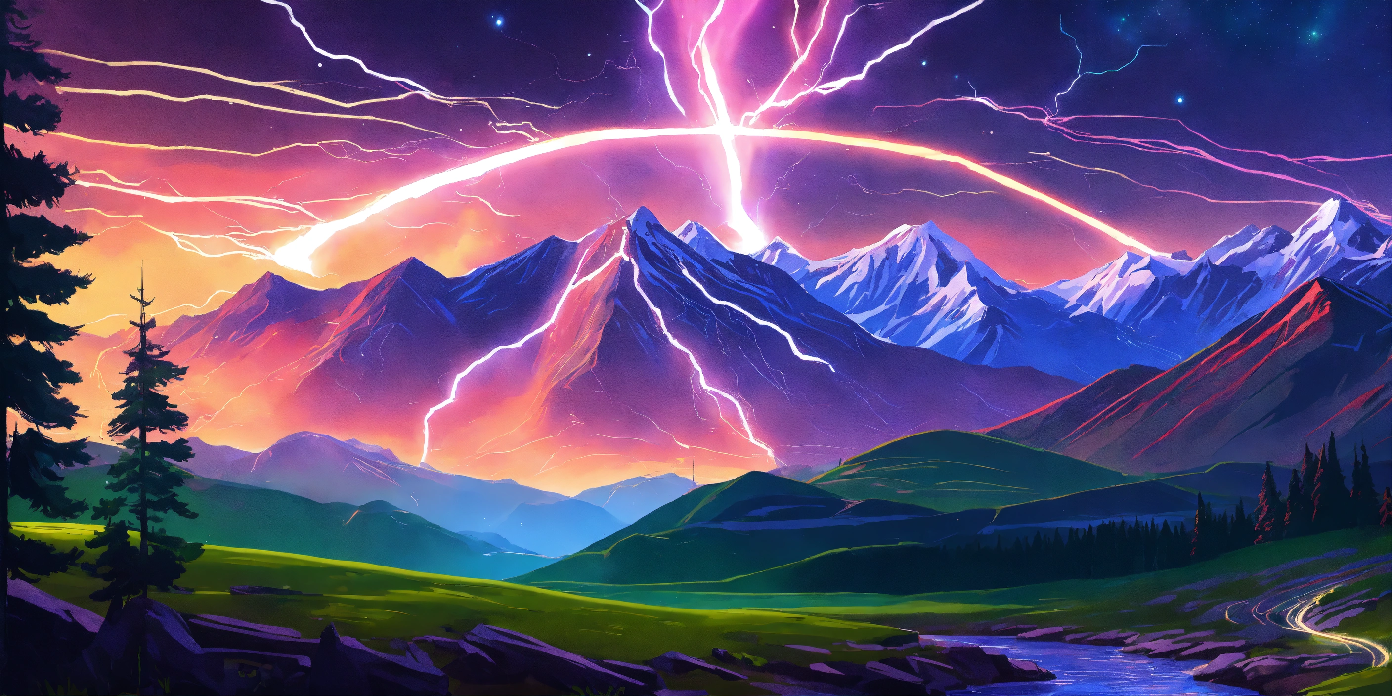 Flat 2d illustration, mountains, sunset, river, electricity, energy, movement, pine trees. van gogh and roerich style, engine render cosmos, power, futuristic, energy transfer, power of mountains, power of nature, lightning, electric, magic, electrical discharges coming from the mountains to the foreground. green purple, engine render cosmos, power, futuristic, energy transfer, power of mountains, power of nature, light in, magic power, cosmos, space, northern lights