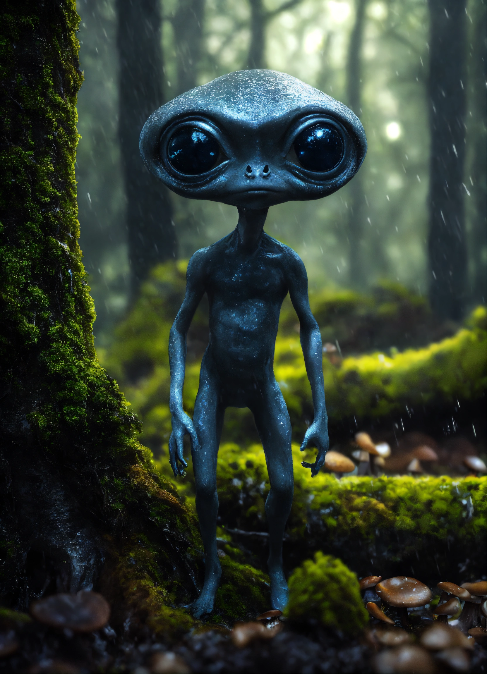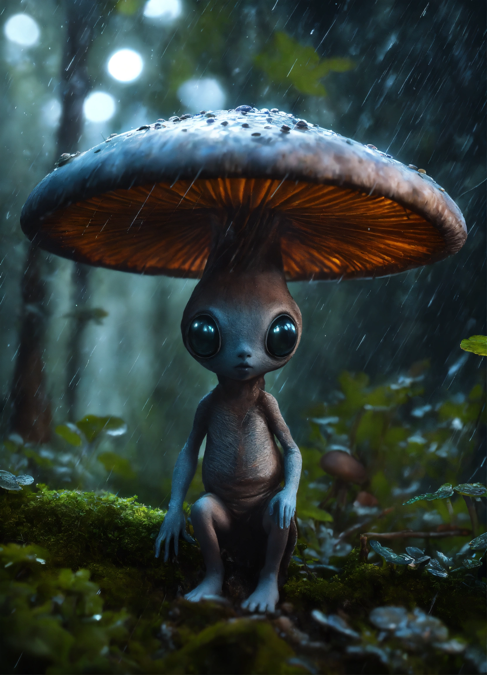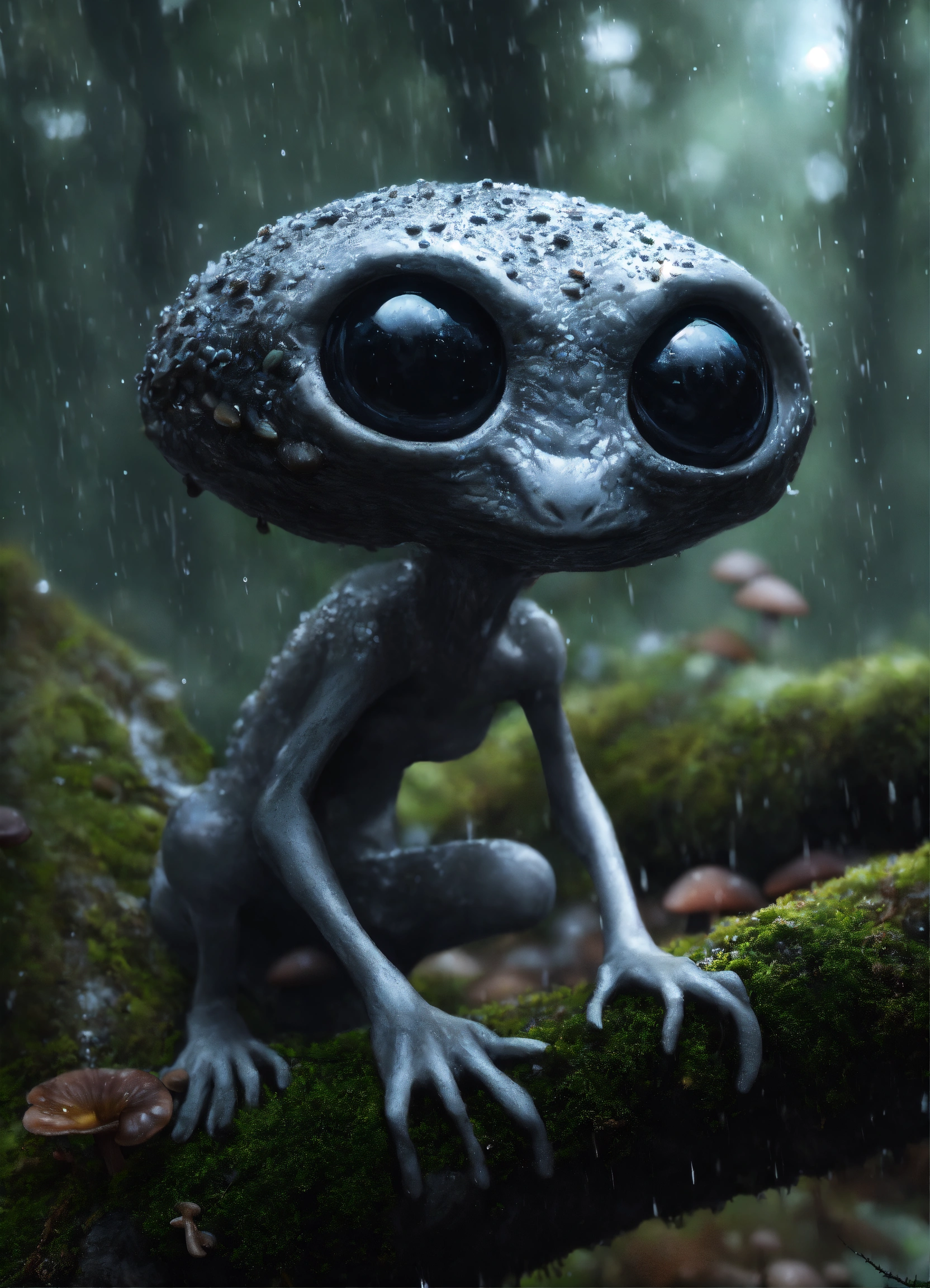 A realiste grey alien, big eyes blacks, mushrooms in trees, nigth, forest rain, hyperrealist, detailed, digital photo 4k --s 50
