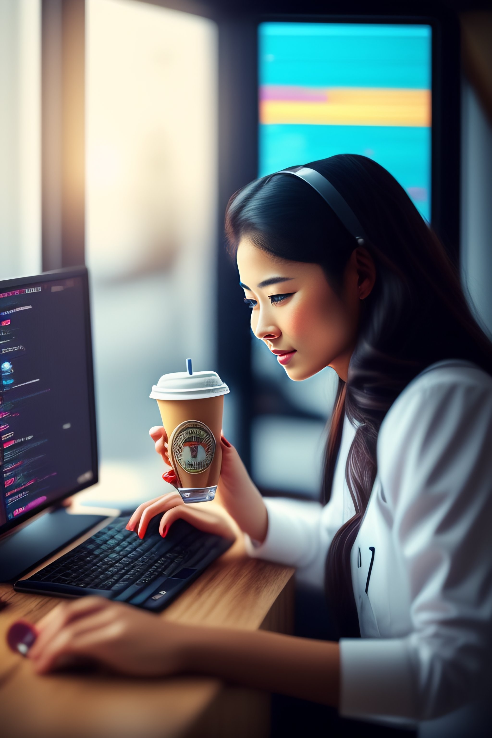 Girl coding with a coffe