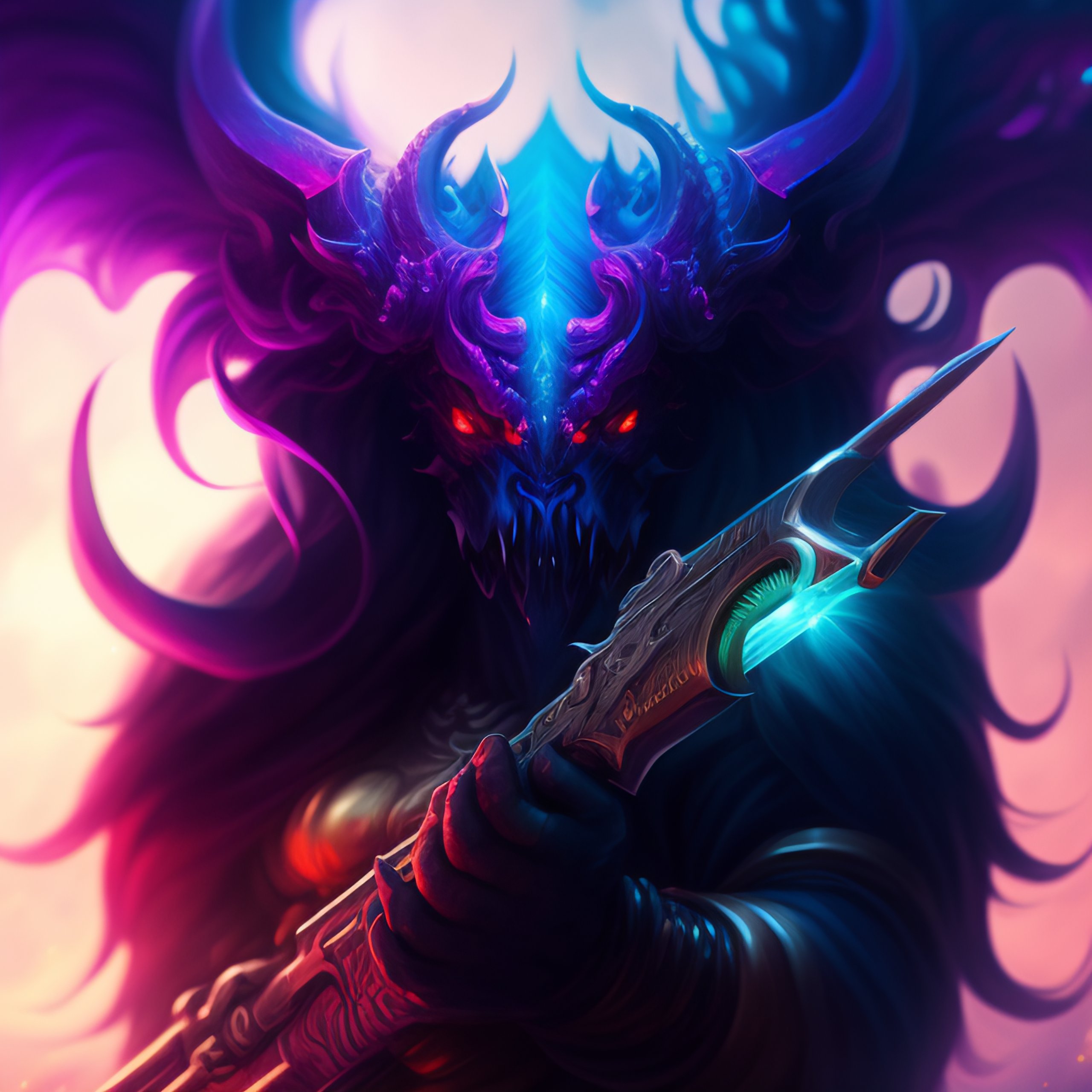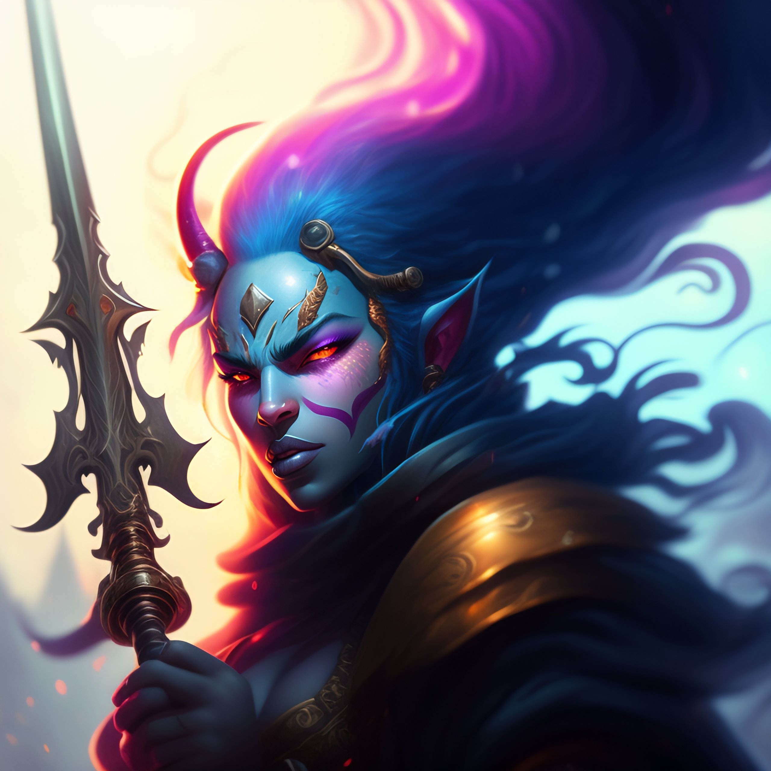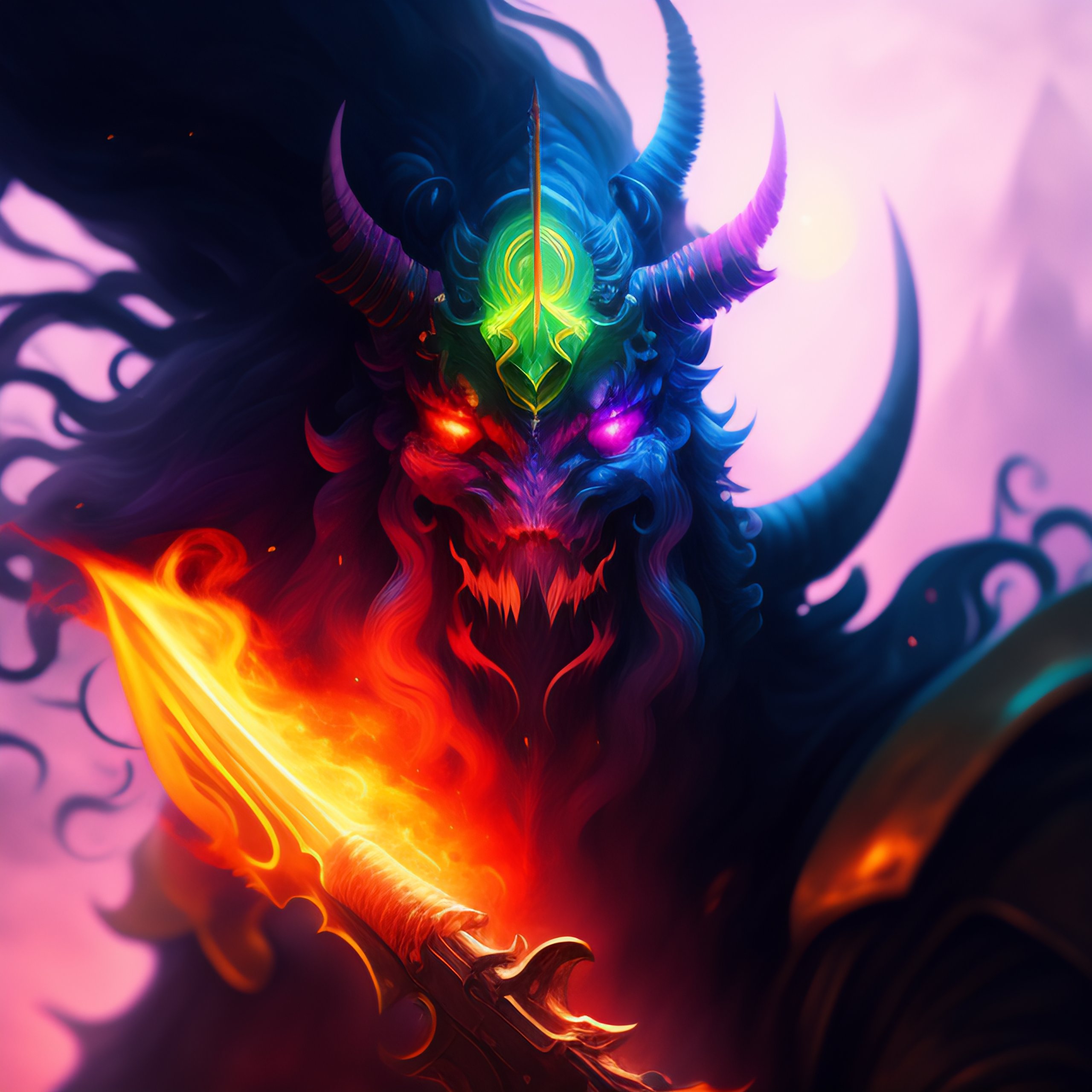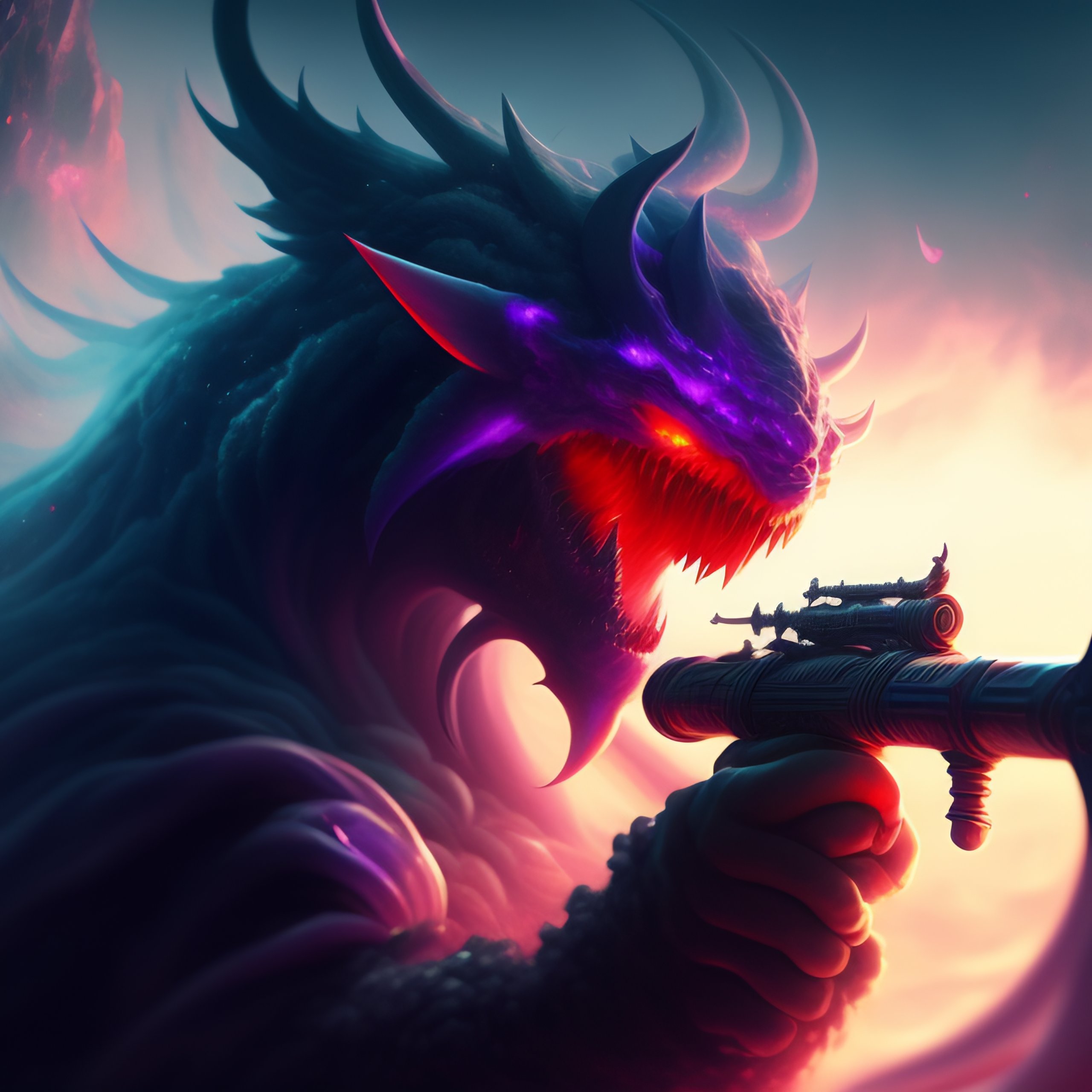 Closeup portrait dnd art for a a rainbow demon, a gigantic abyssal demon, holding a revolver, surrounded by the mists of morning and prismatic magic