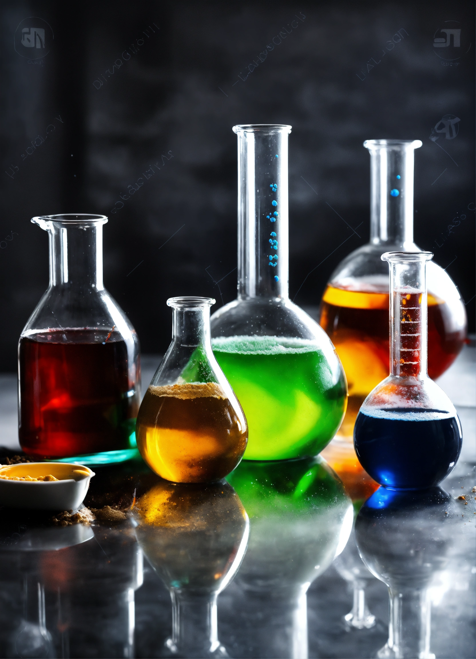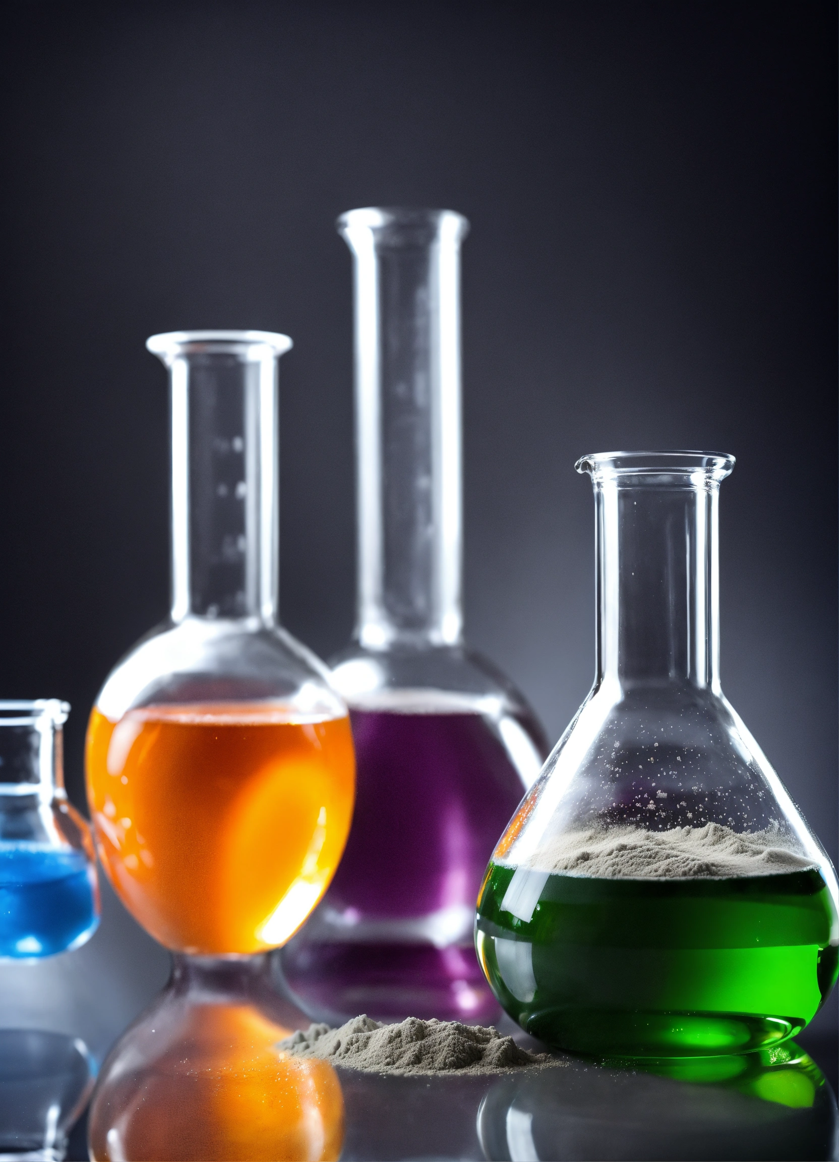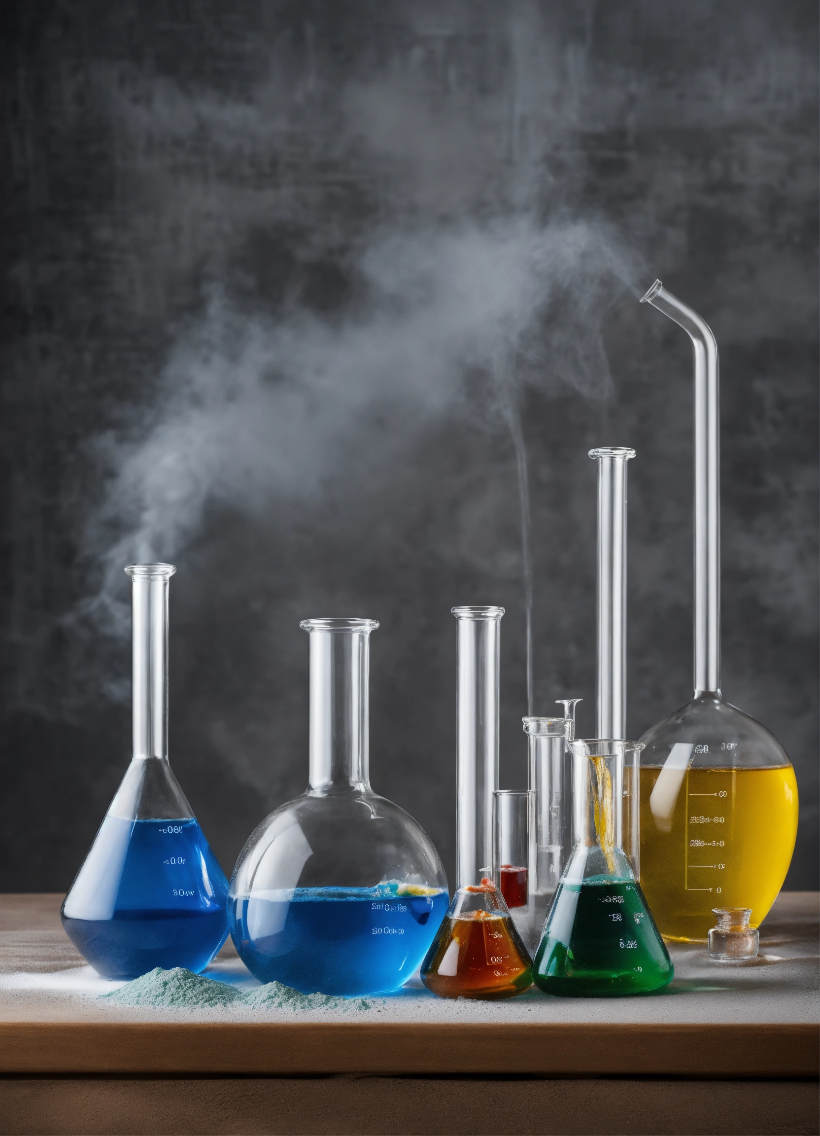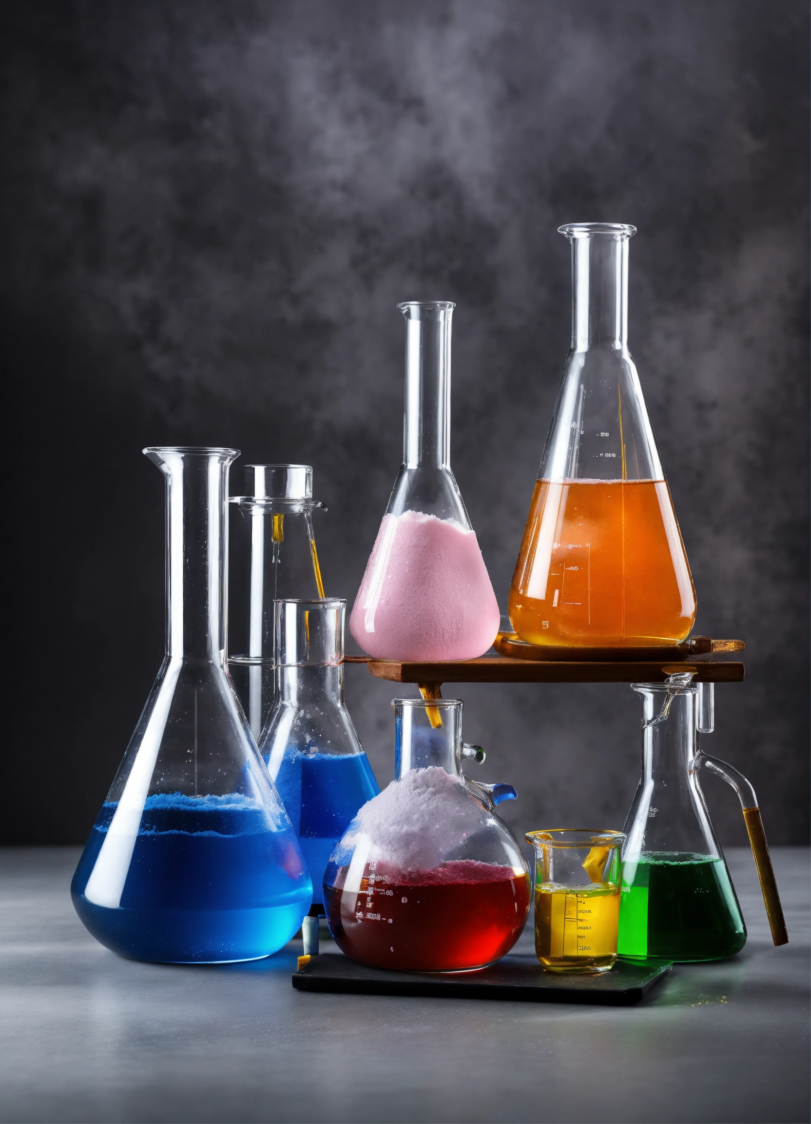 Different chemicals with powders and liquids in glassware in a laboratory environment, grey background