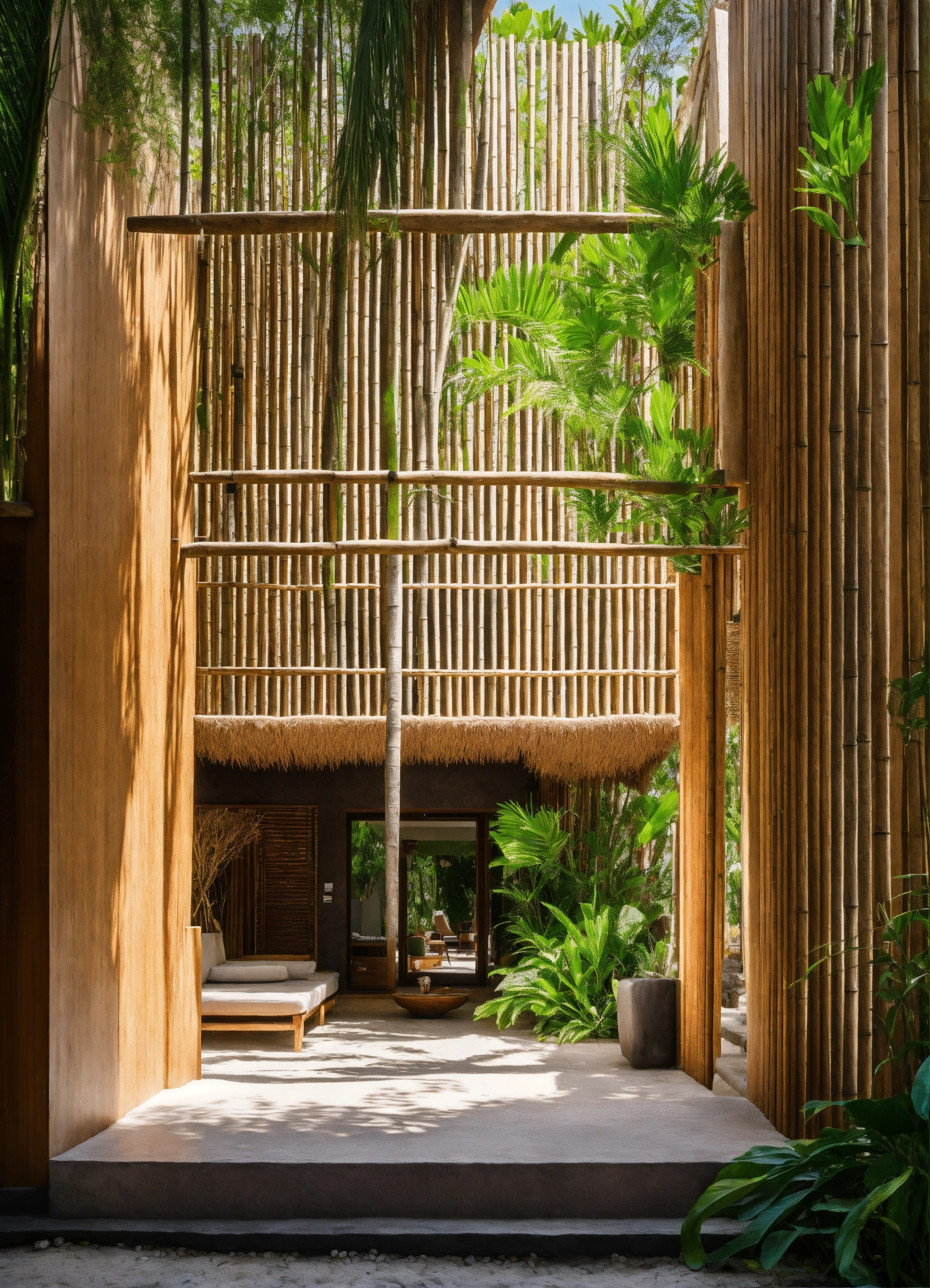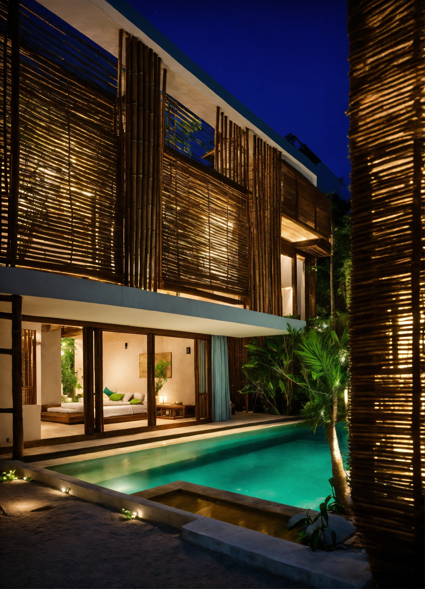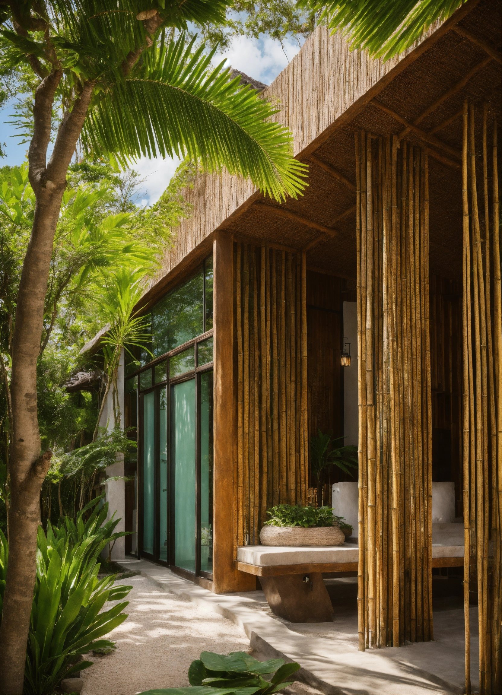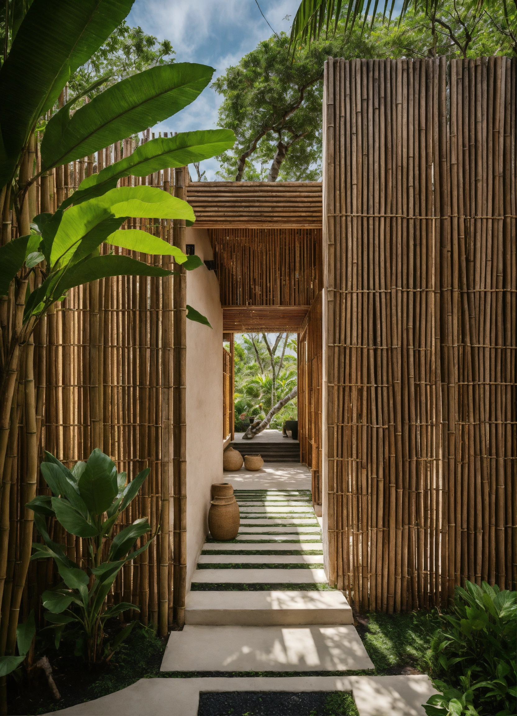 Environmentally-conscious villa, bali styled, nestled within the bustling modern architecture of tulum, quintana roo. as you approach from the entrance, the street view reveals a facade adorned with an discreet vertical bamboo lattice, gracefully contrasting with the chukum finish menta color. large overhangs hint at the interior's coolness, and the surrounding trees whisper tales of nature's embrace.
