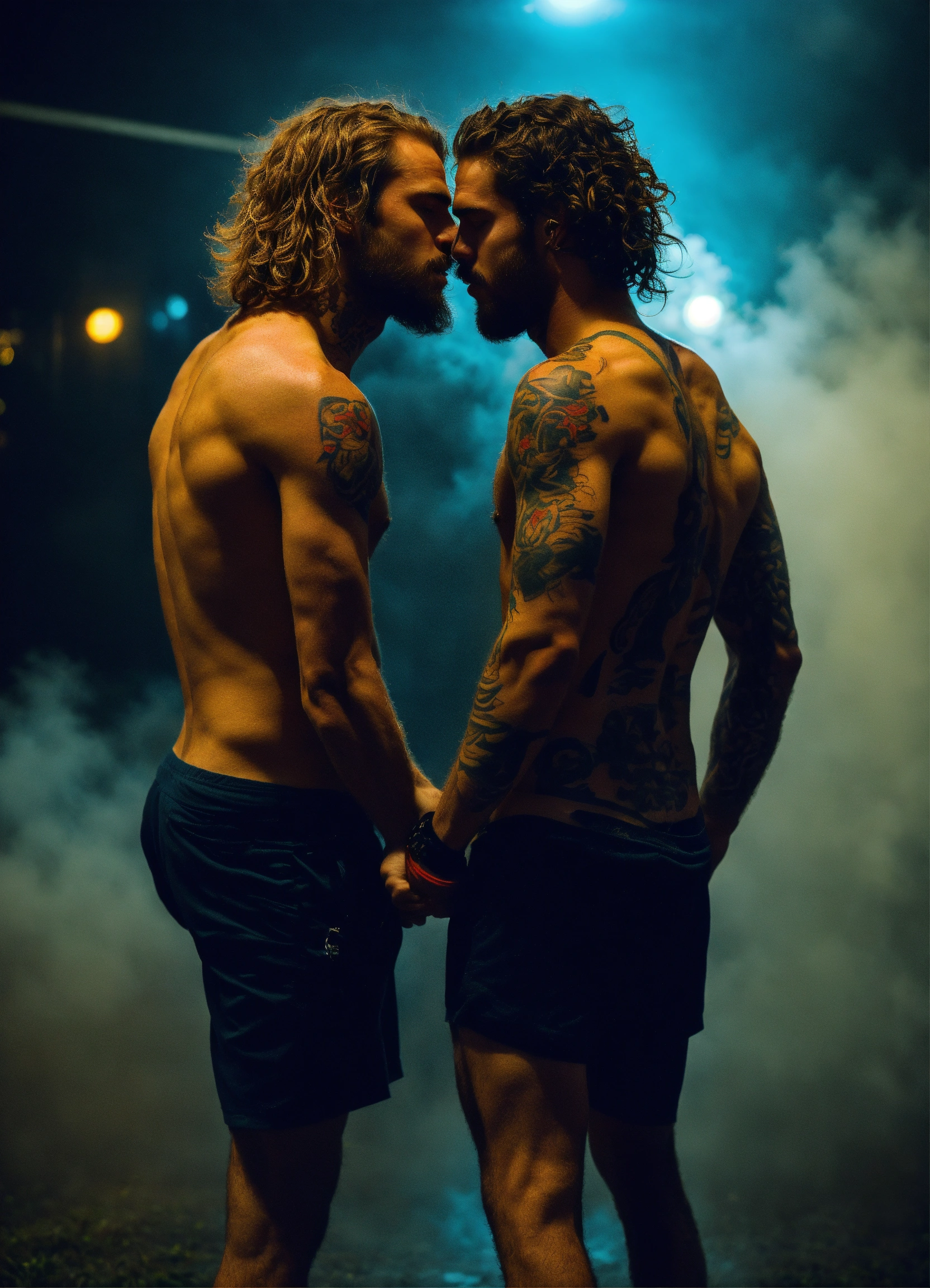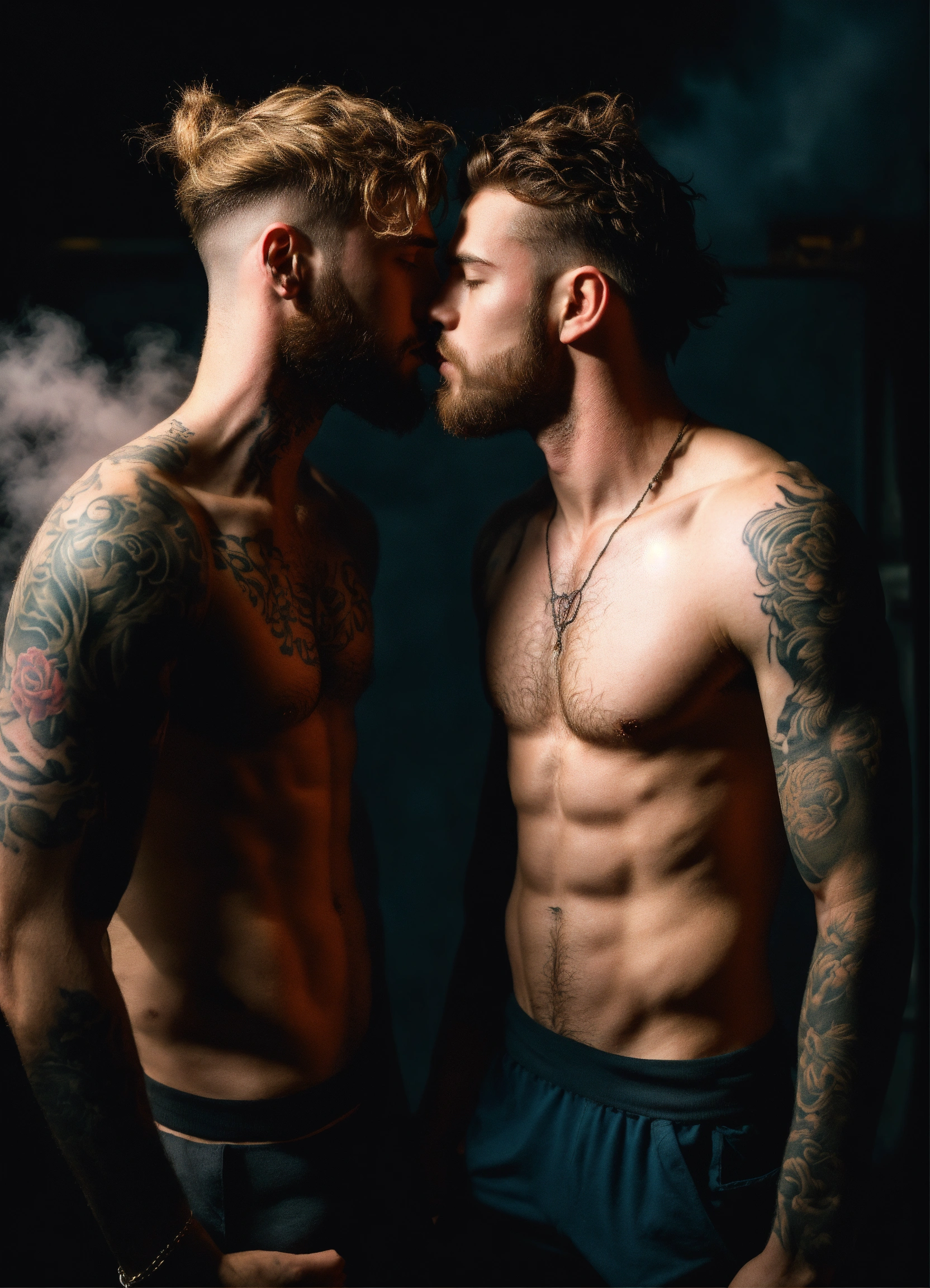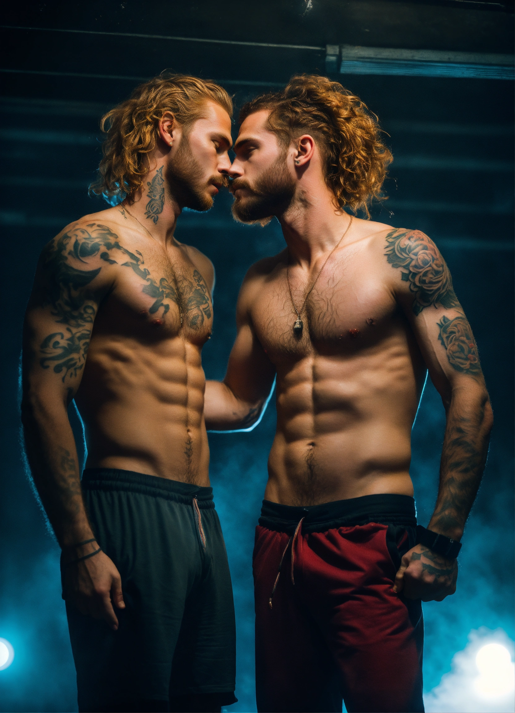 Two male long distance runners are holding their hands in their pockets and kissing in a dark room, both have lithe elegant gaunt features, thin wiry arms, very hairy chest, one has very long wavy blond hair, the other has short curly red hair, 30 year old, lots of tattoos, it is night time surrounded by fog