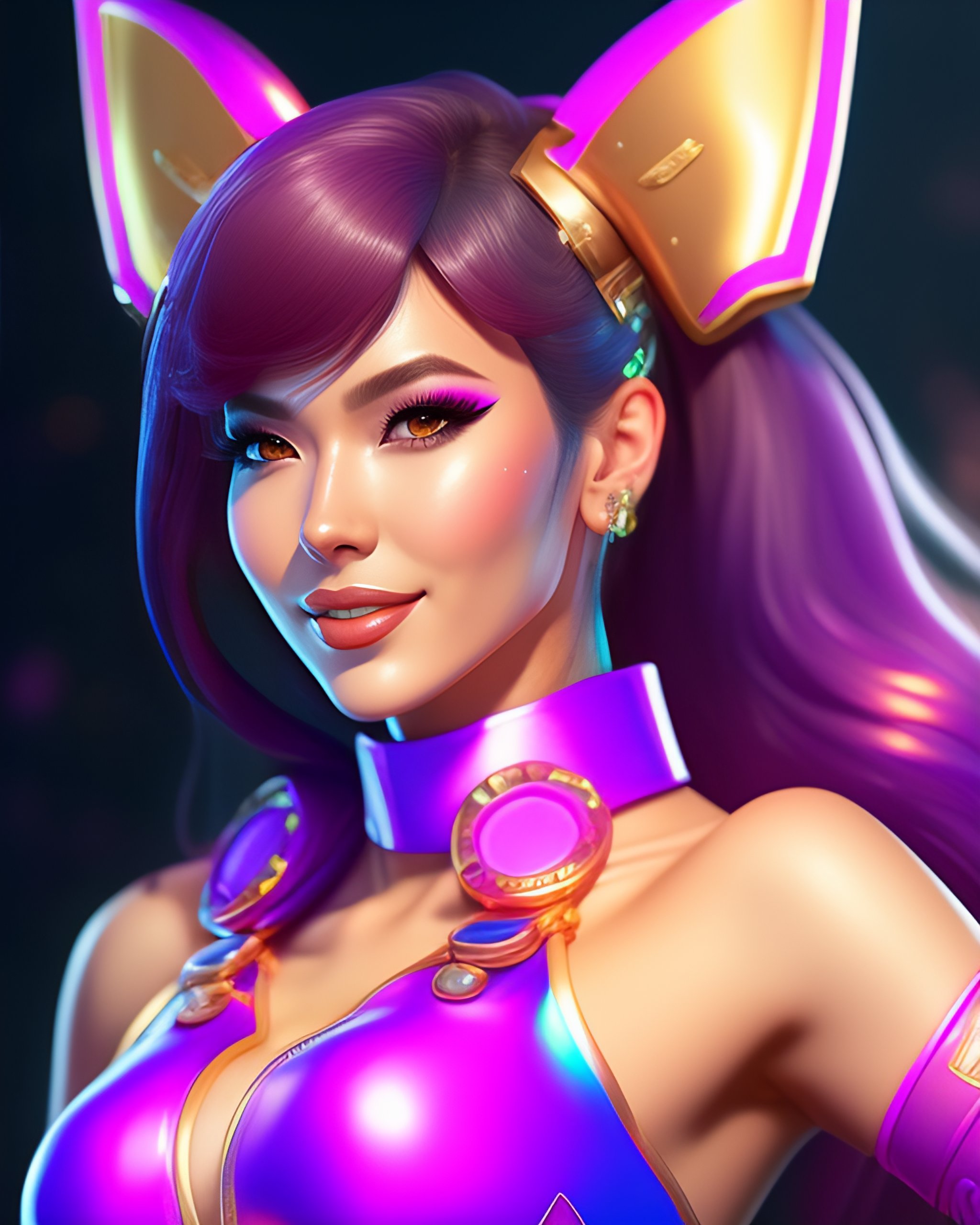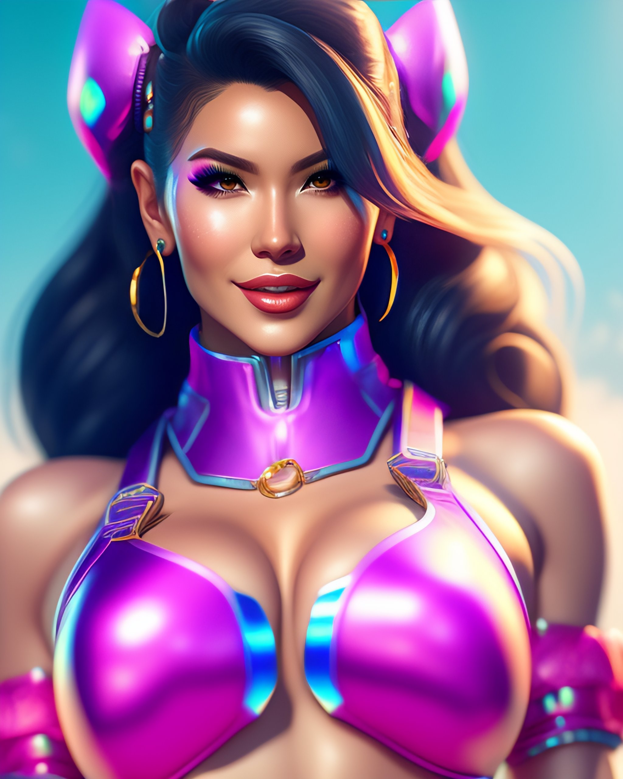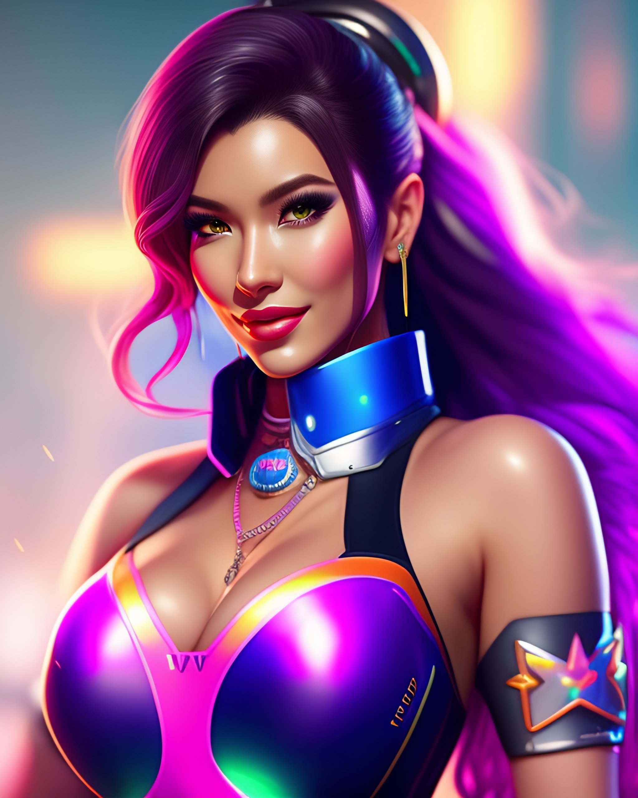 Full body digital artwork of dva overwatch, wearing iridescent rainbow swimwear, 4k, expressive happy smug expression, makeup, in style of mark arian, wearing detailed pink leather collar, wearing chains, detailed face and eyes