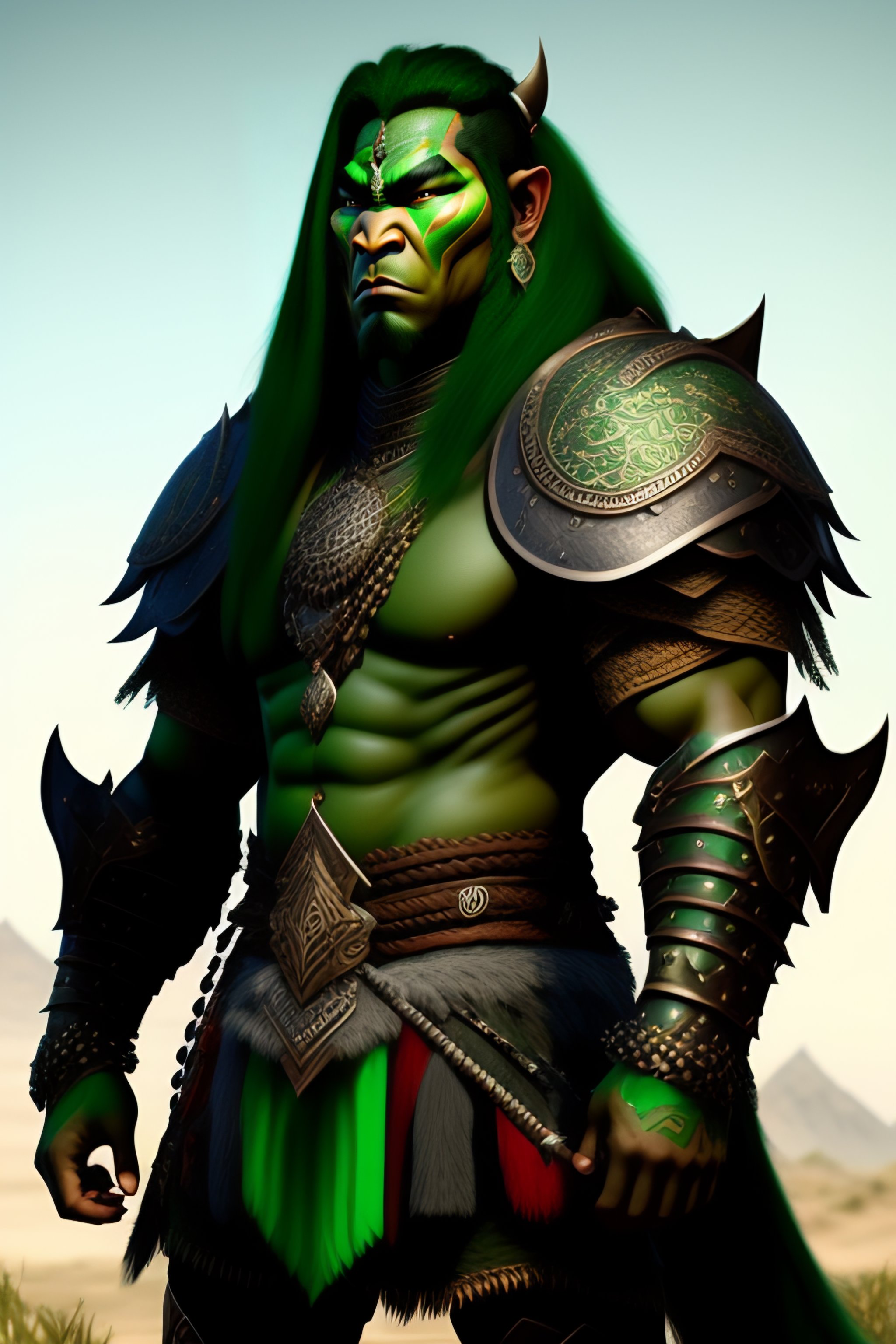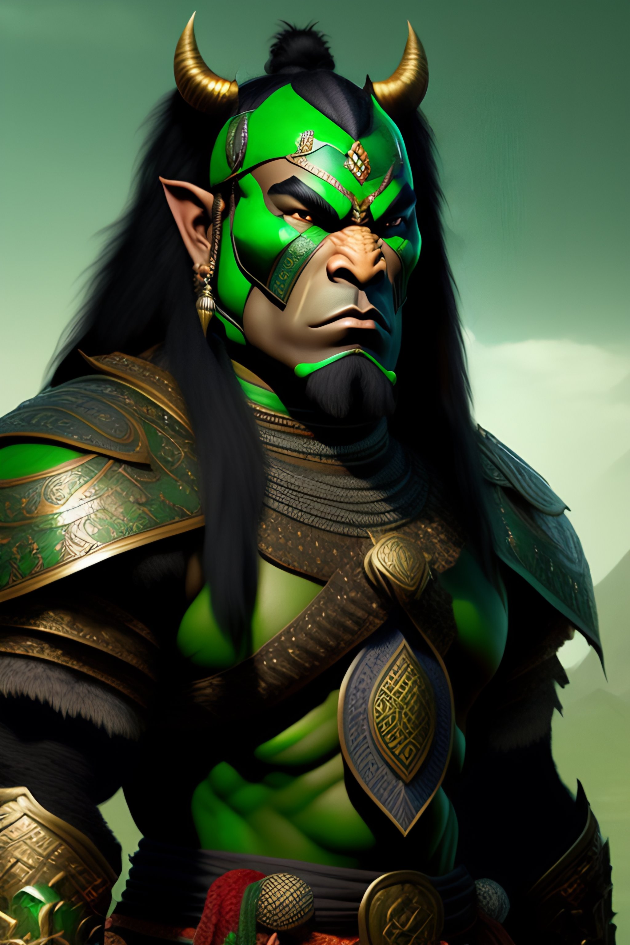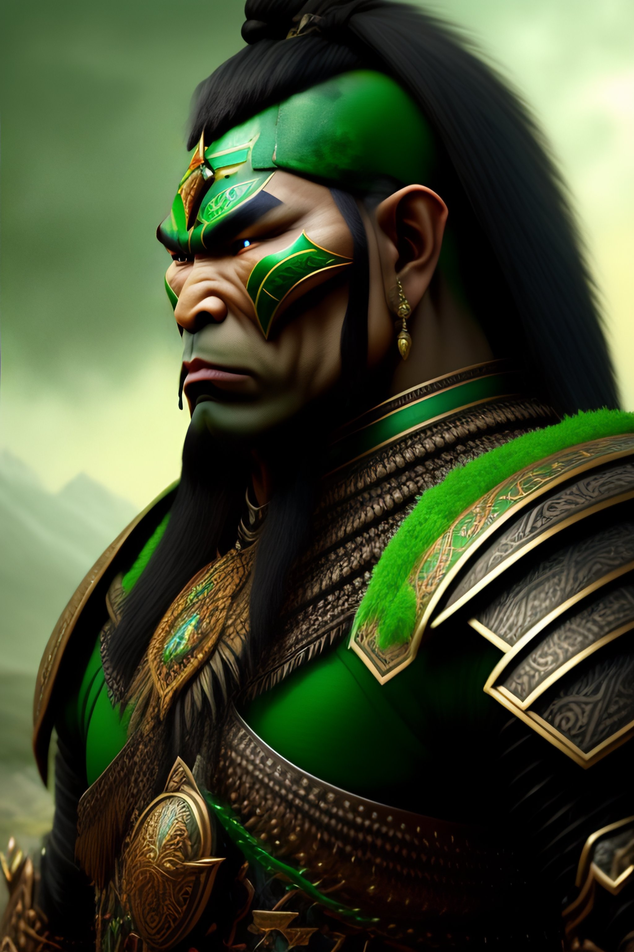 A well-drawn extremely intricate extremely detailed sensible and kind phthalo-green mongolian orc warrior with mongolian armor, dark green, dark-green face