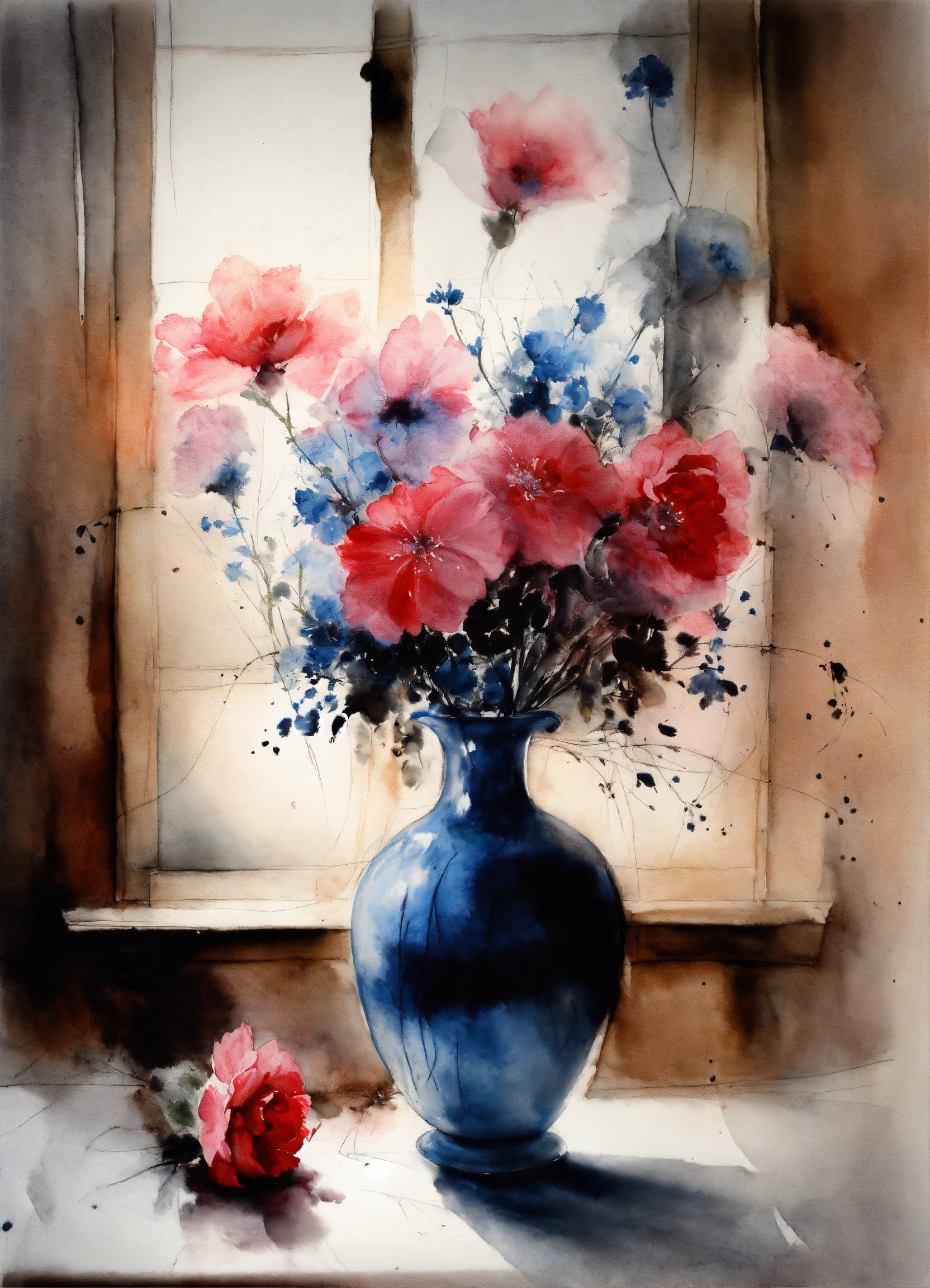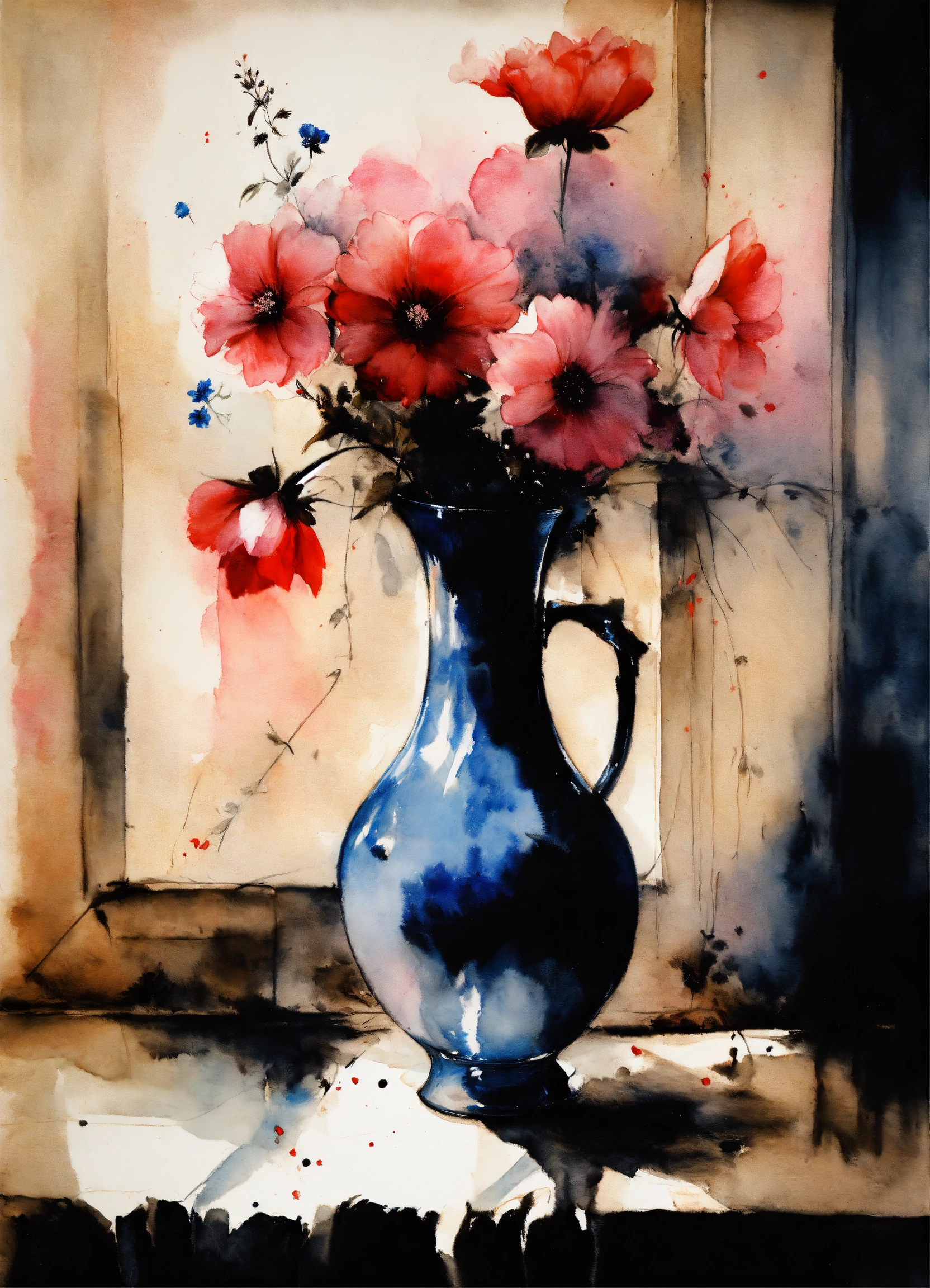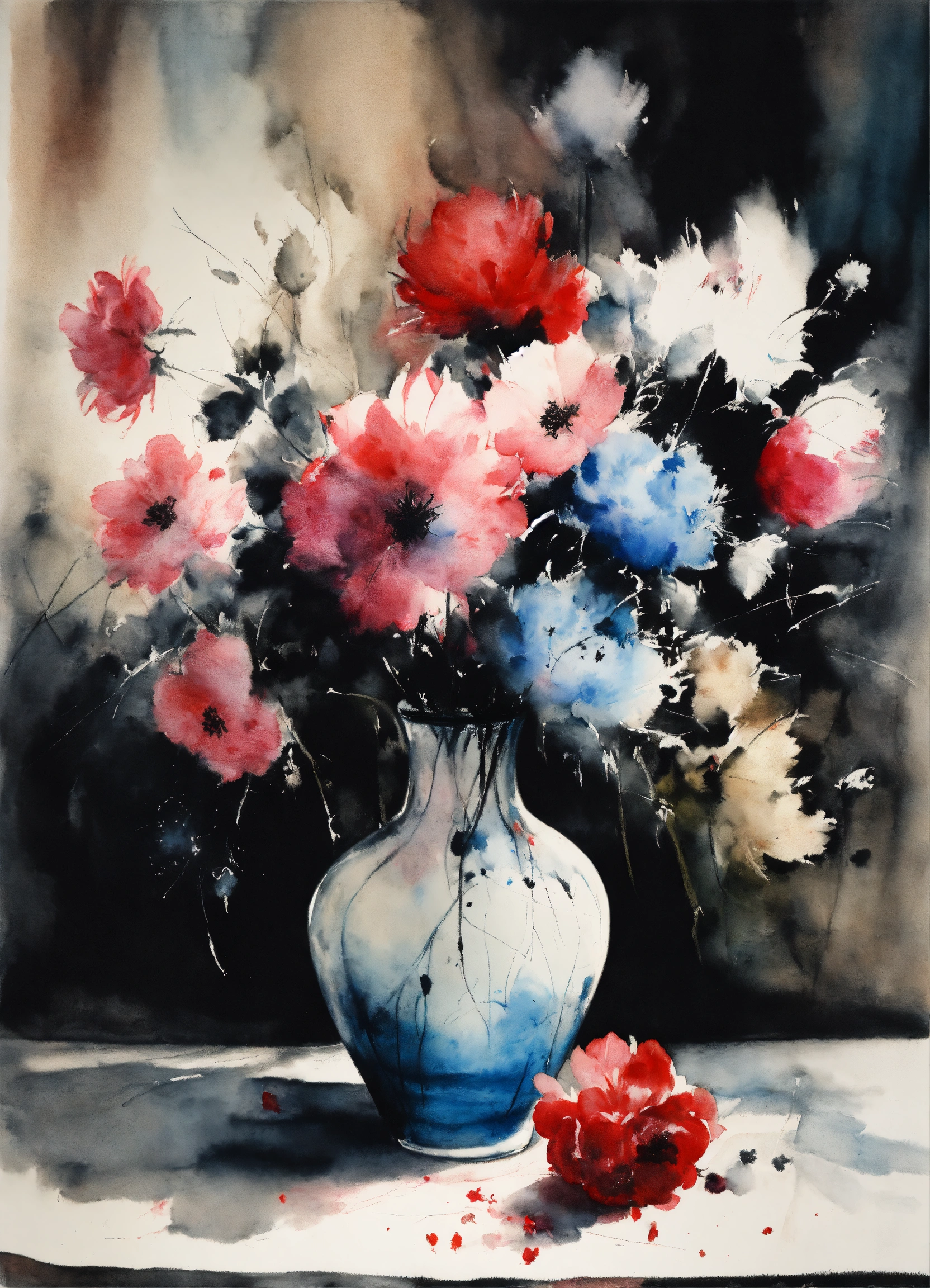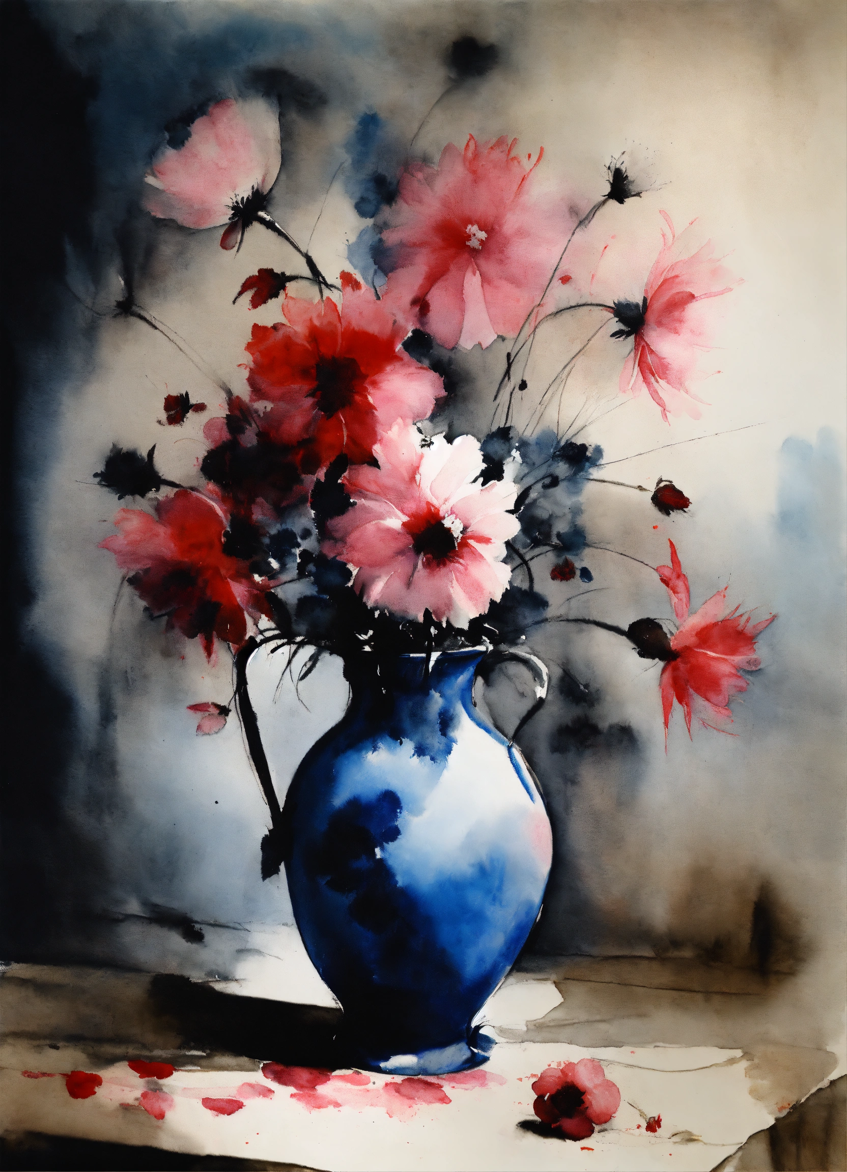 Stephen gammell style, dessin, aquarelle, aquarelles, noir et blanc et rouge, de marais, de sombres créatures, dégoulinant, pink and blue flowers in a vase placed on a table
