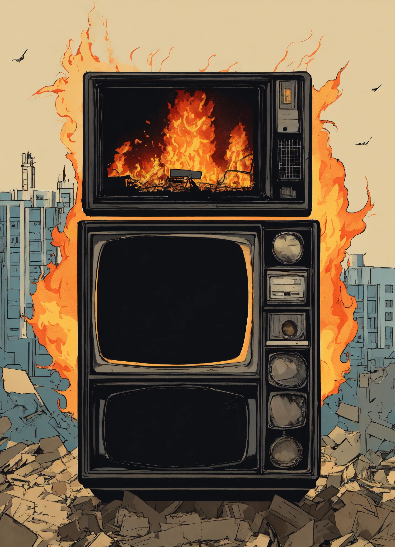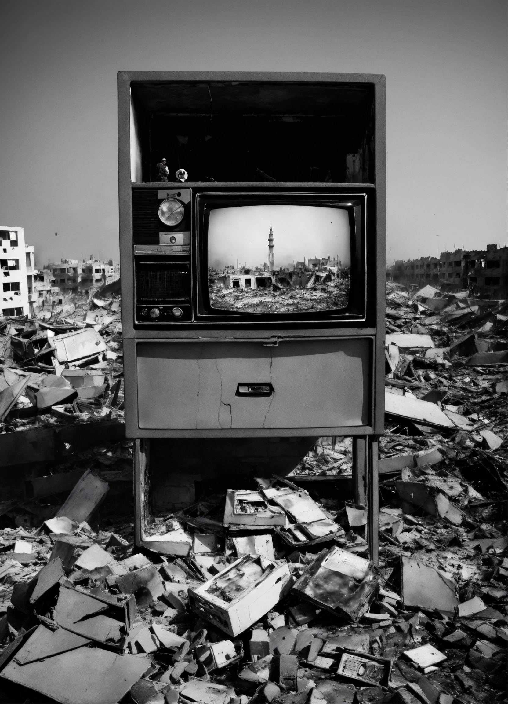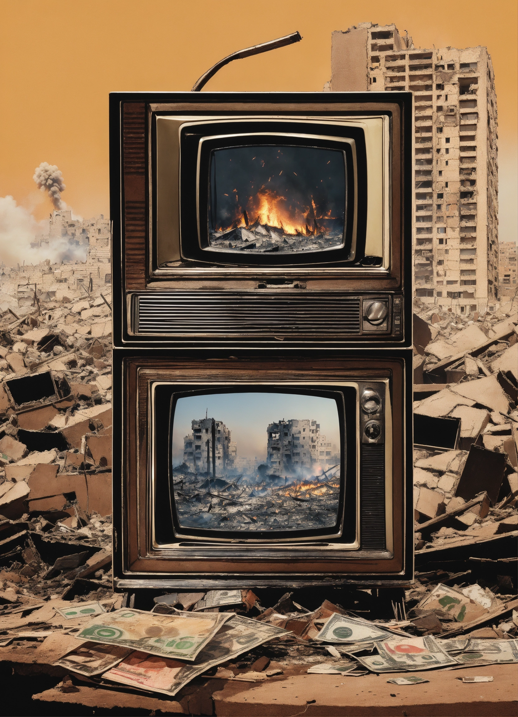"i need a design that includes a picture of a person with indistinct features in an old television with a black screen, buildings destroyed and burning as a result of an israeli air strike in gaza, and also the design includes a lot of money, dollars, in a corner."