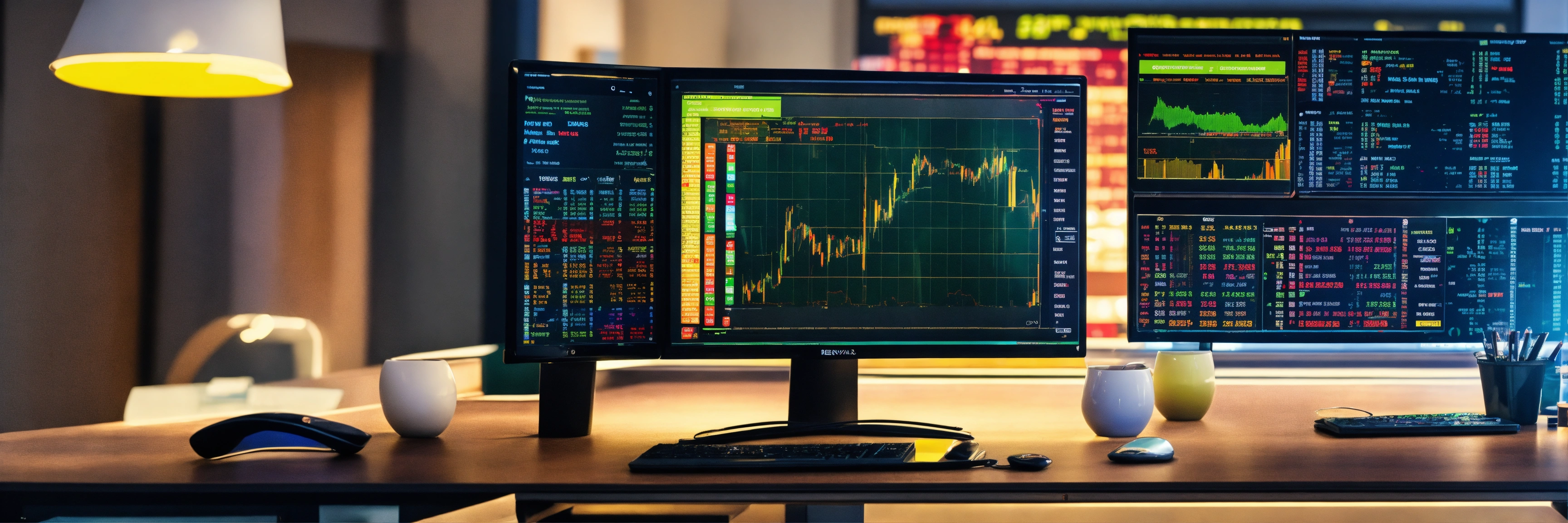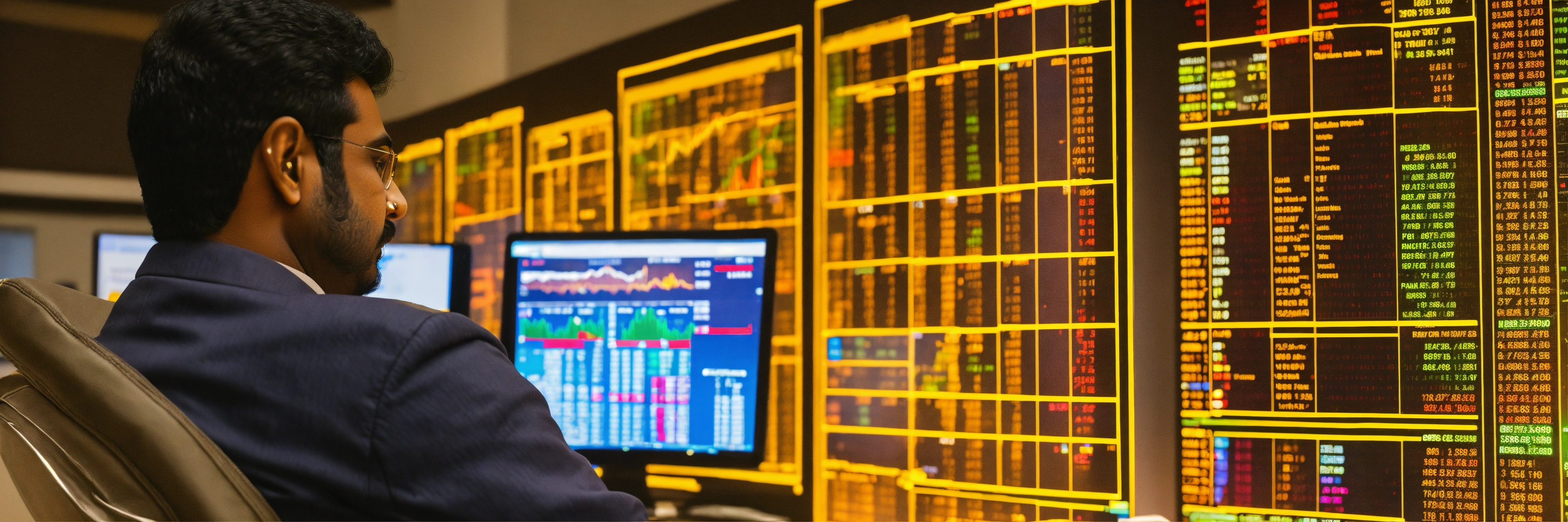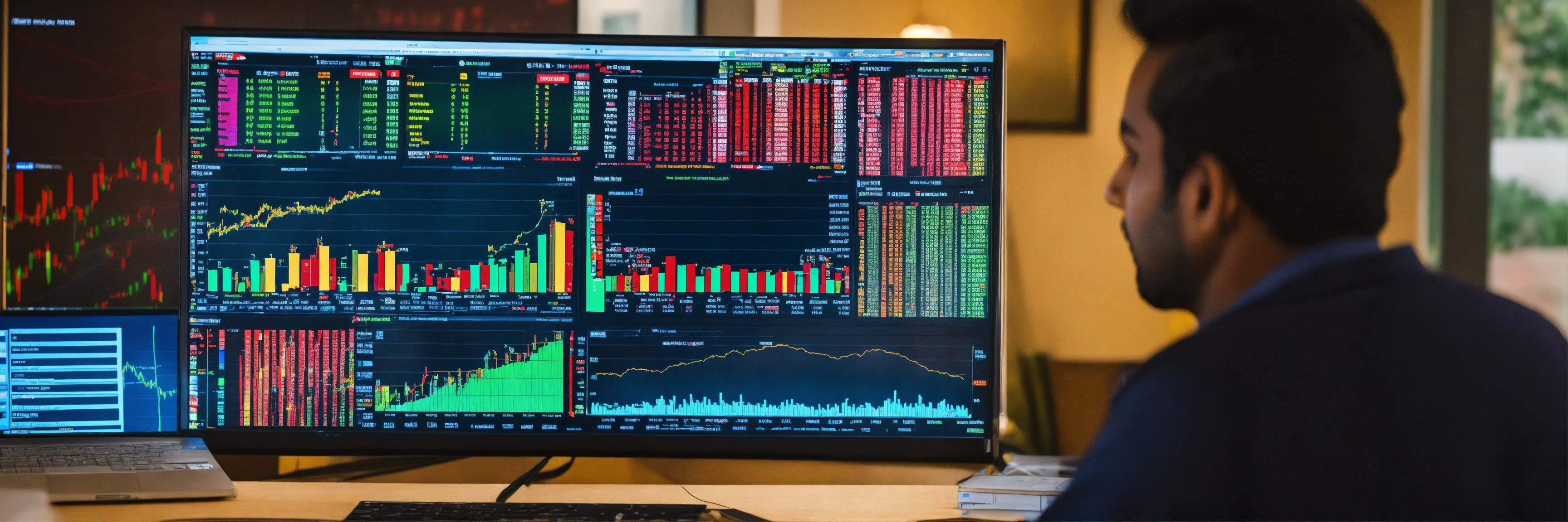 Ravi making investments, with a computer screen displaying stock market data, real estate listings, and mutual funds.