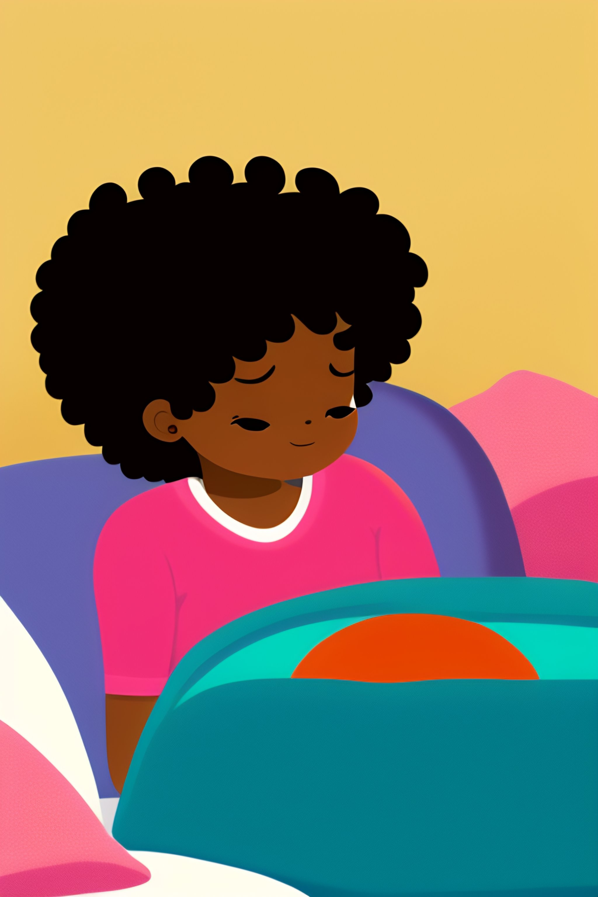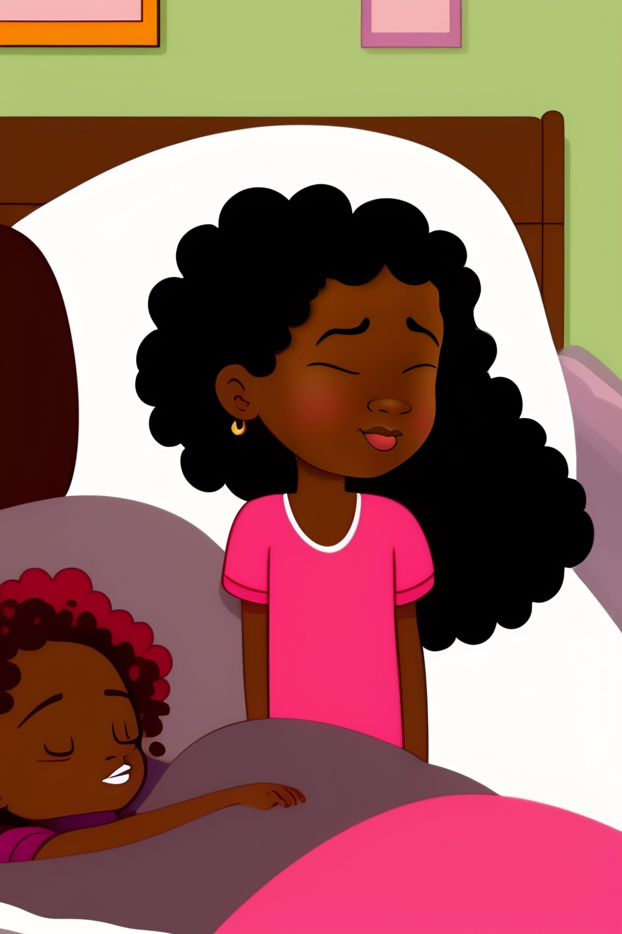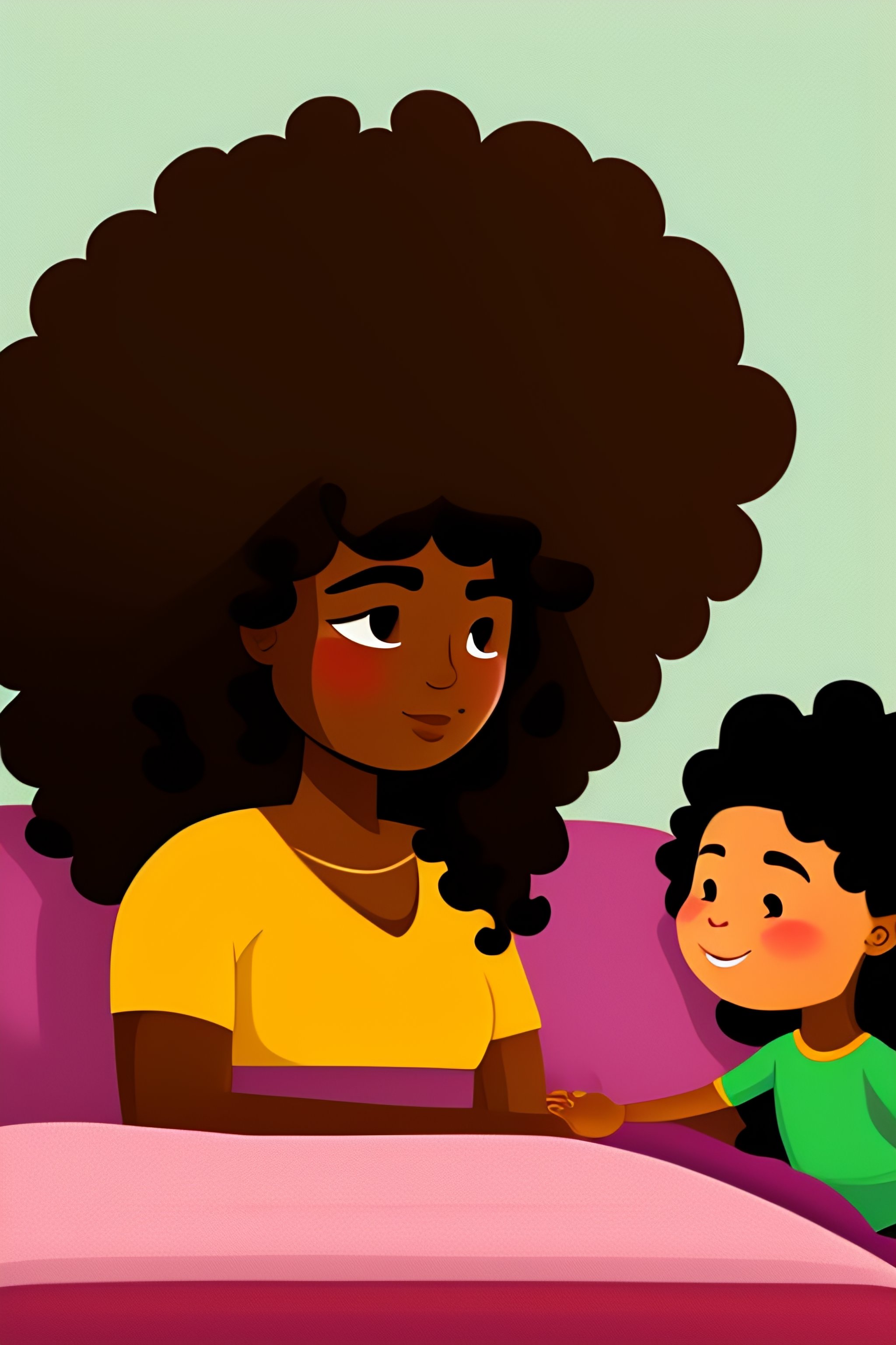 Simple cartoon style of a sleepy brown skinned girl with curly hair in pajamas being woken up in her bed by her curly haired mother
